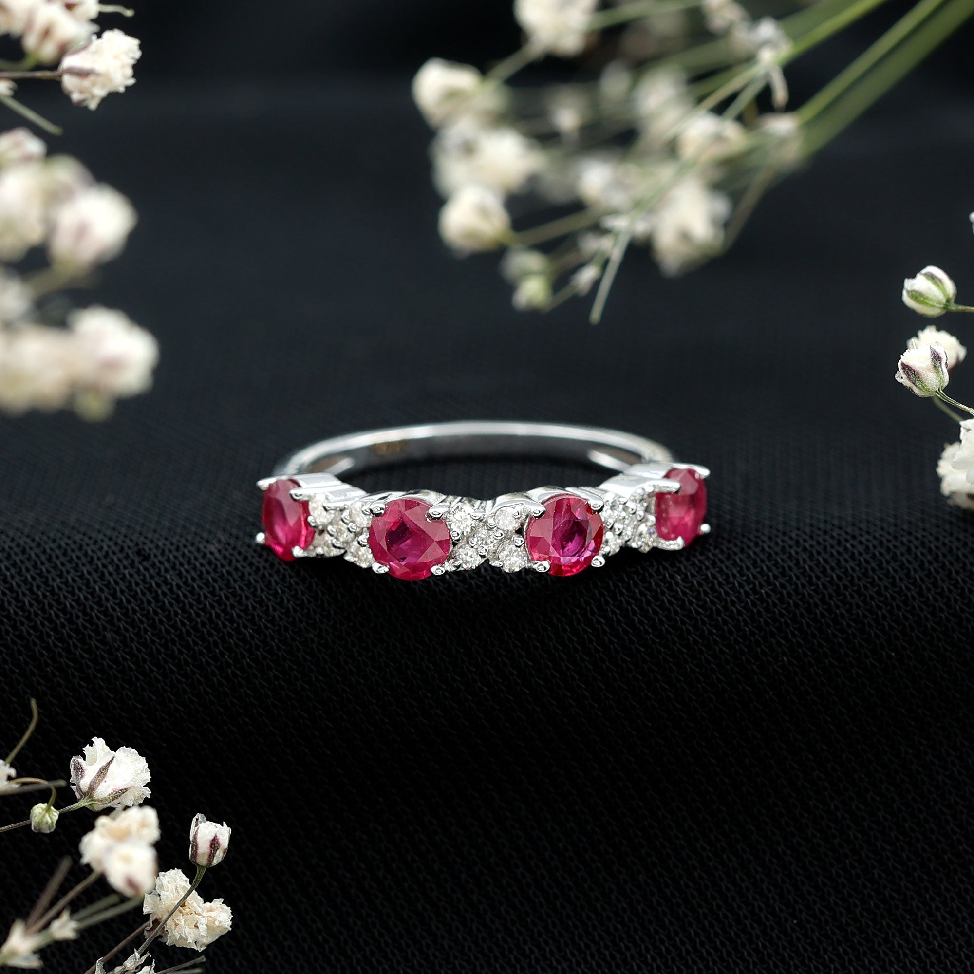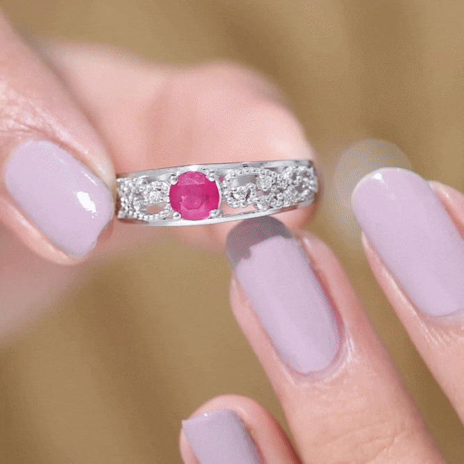 Ruby rings are available in solitaire, halo, three-stone, and vintage-inspired styles. Solitaire designs emphasize the natural depth of the center stone, while halo settings introduce surrounding brilliance for added dimension and protection.