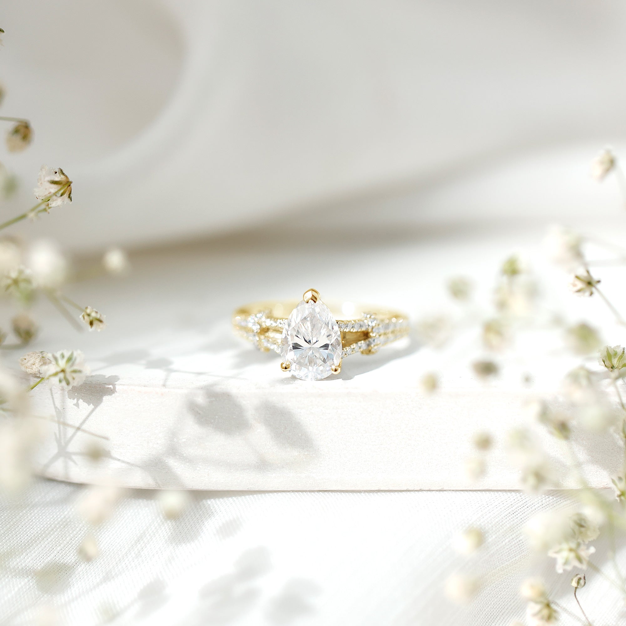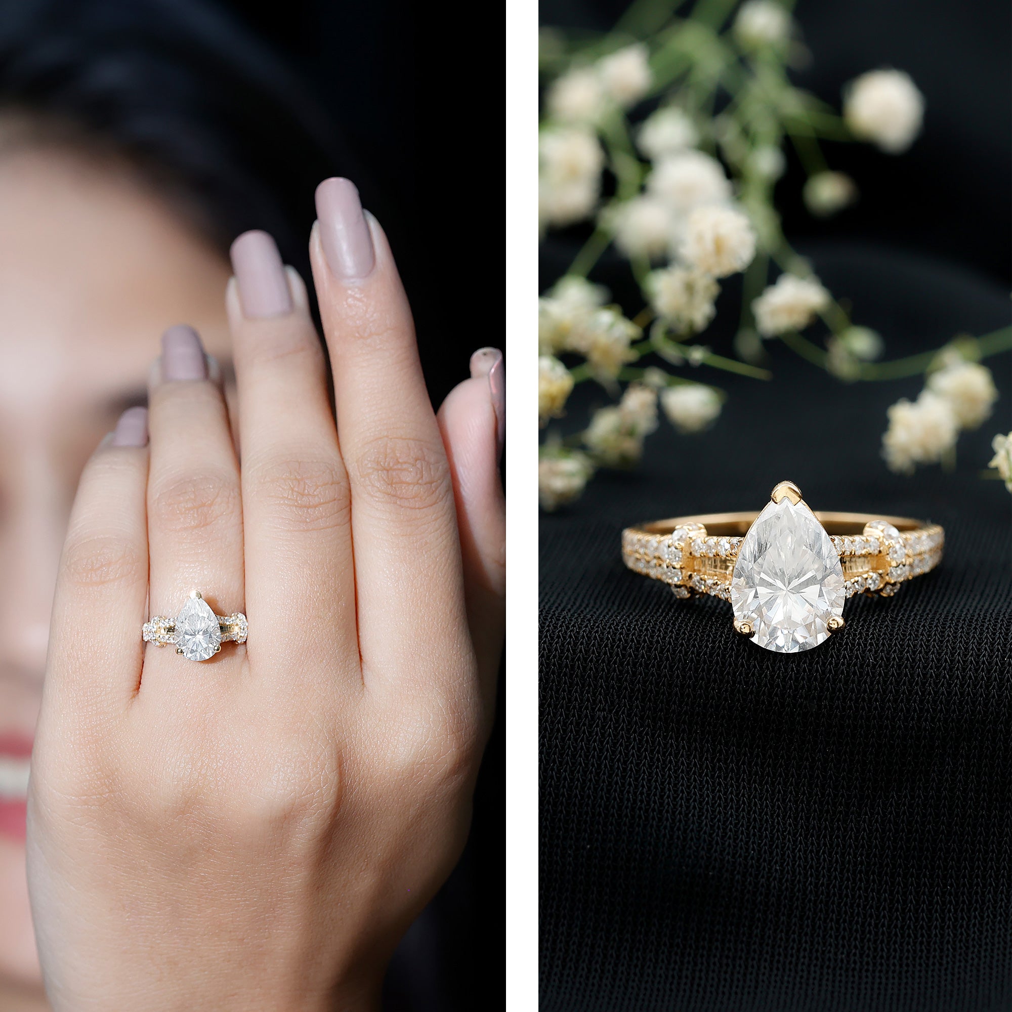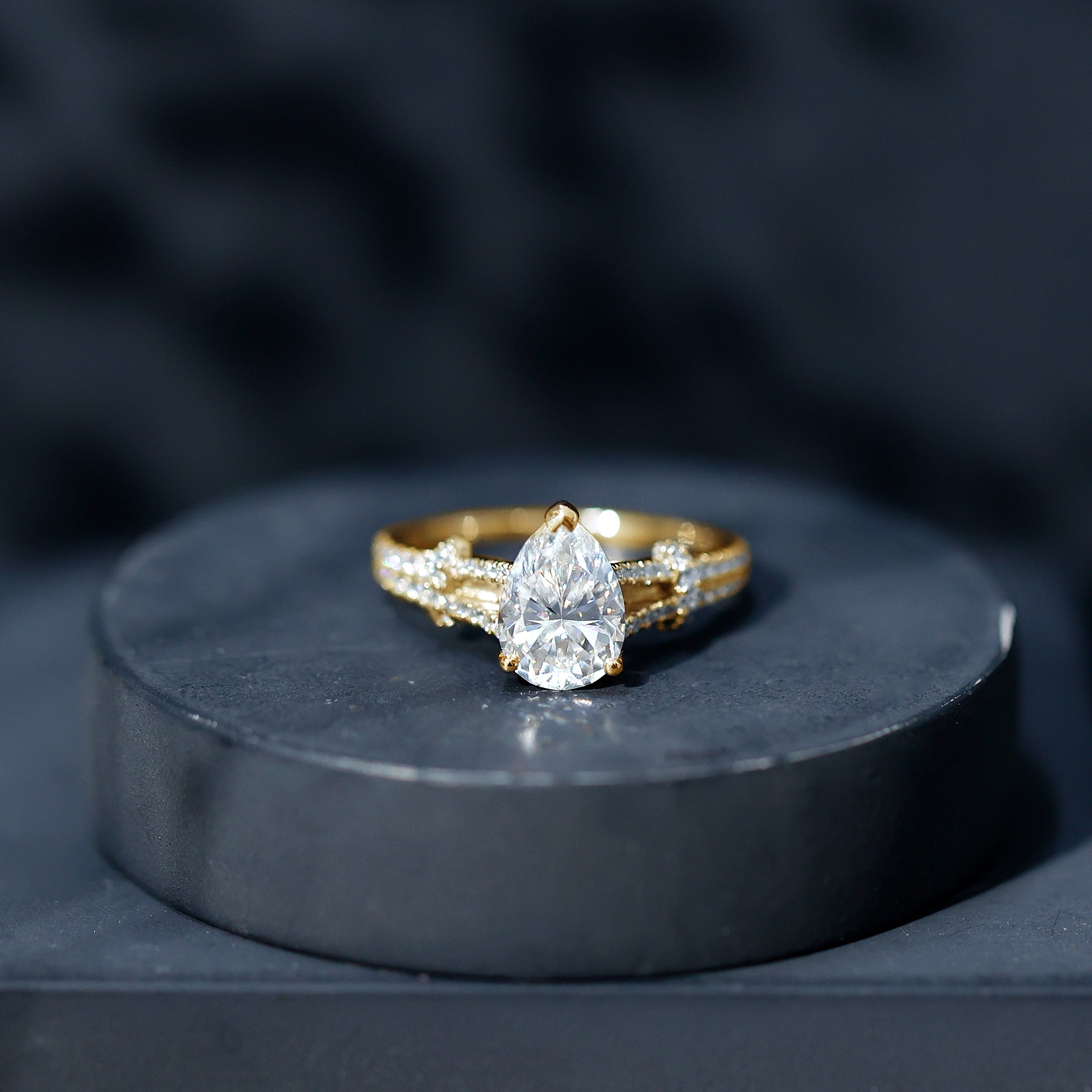 Considered extremely flattering and fancy, a Pear Shaped Solitaire Ring features a Center Stone that is characterized by a pointy end and a rounded edge (often termed as teardrop shape). It makes for one of the most Unique Solitaire Engagement Rings out there, all thanks to the beautiful bow-tie effect that it exudes (as the result of light not reaching the middle of the Center Stone).