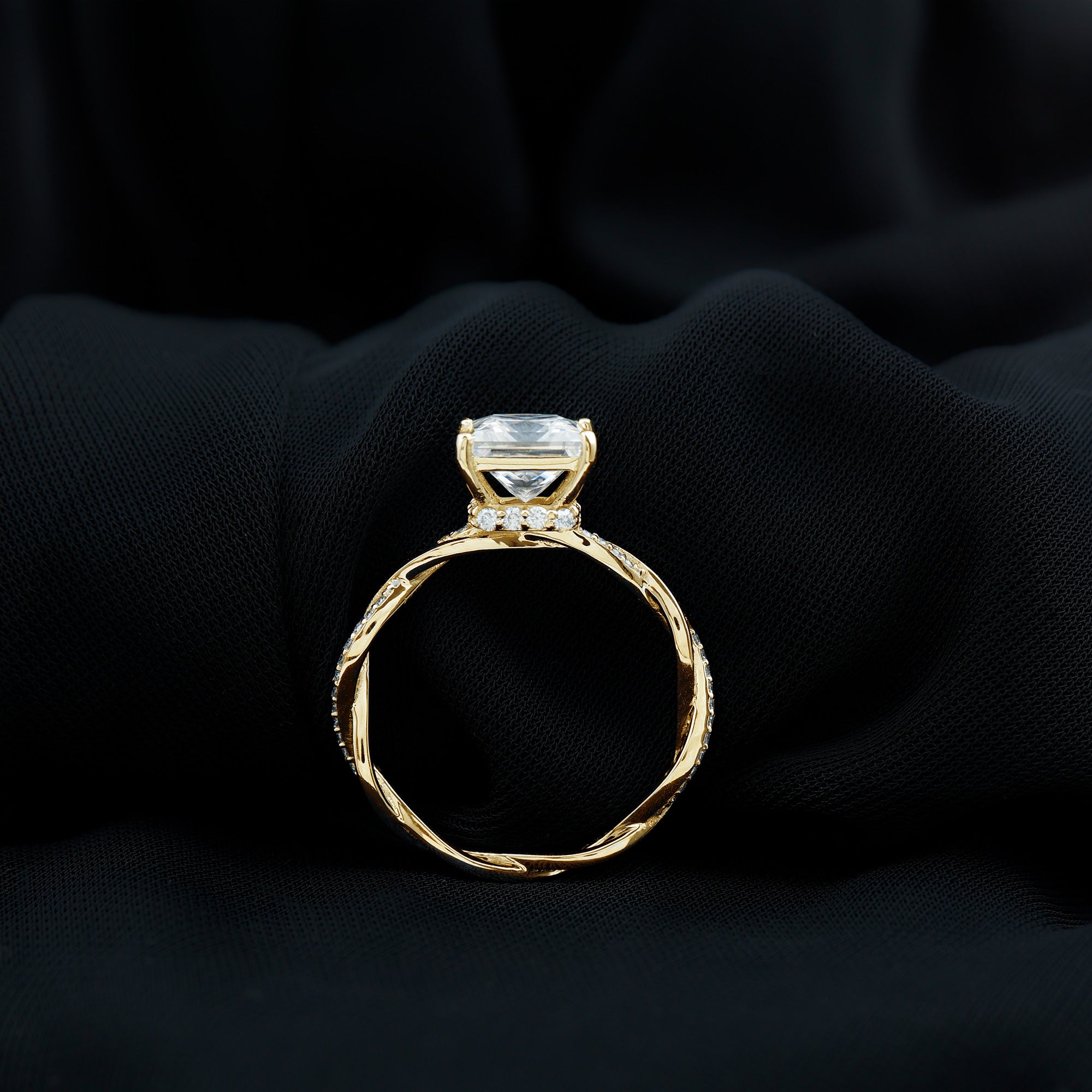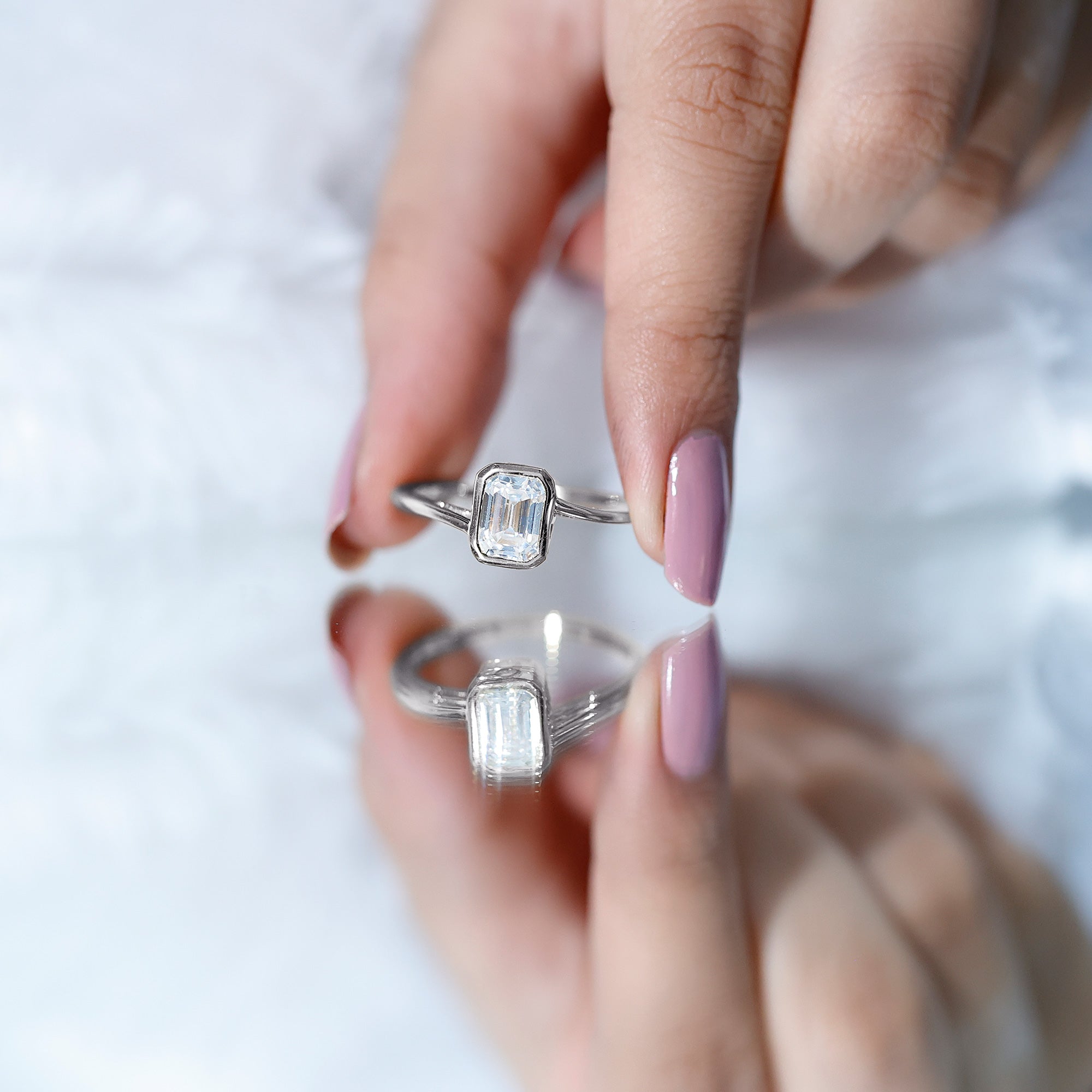 A Single Stone Ring fashioned in Asscher Cut is best defined as a Square Solitaire Engagement Ring that possesses cropped corners, which lends it a more Octagonal Shape. Owing to the strategical arrangement of its 58 facets that showcase a “hall of mirrors’ look, it exudes a vintage Art Deco vibe.