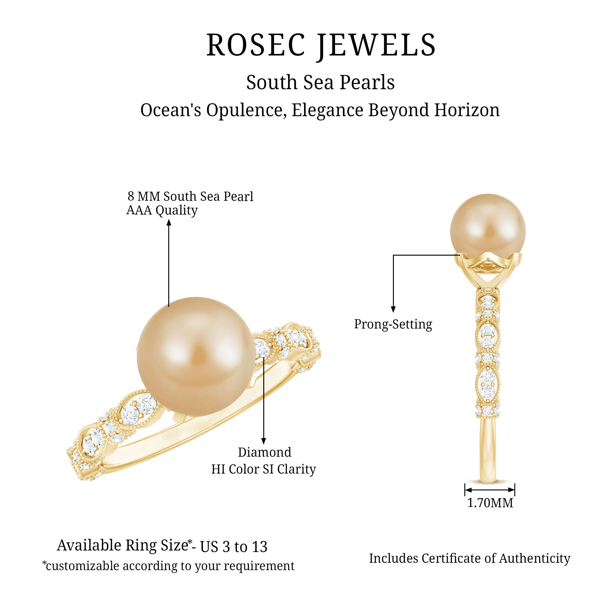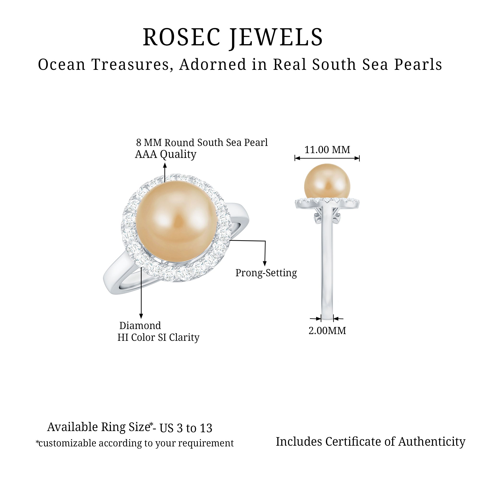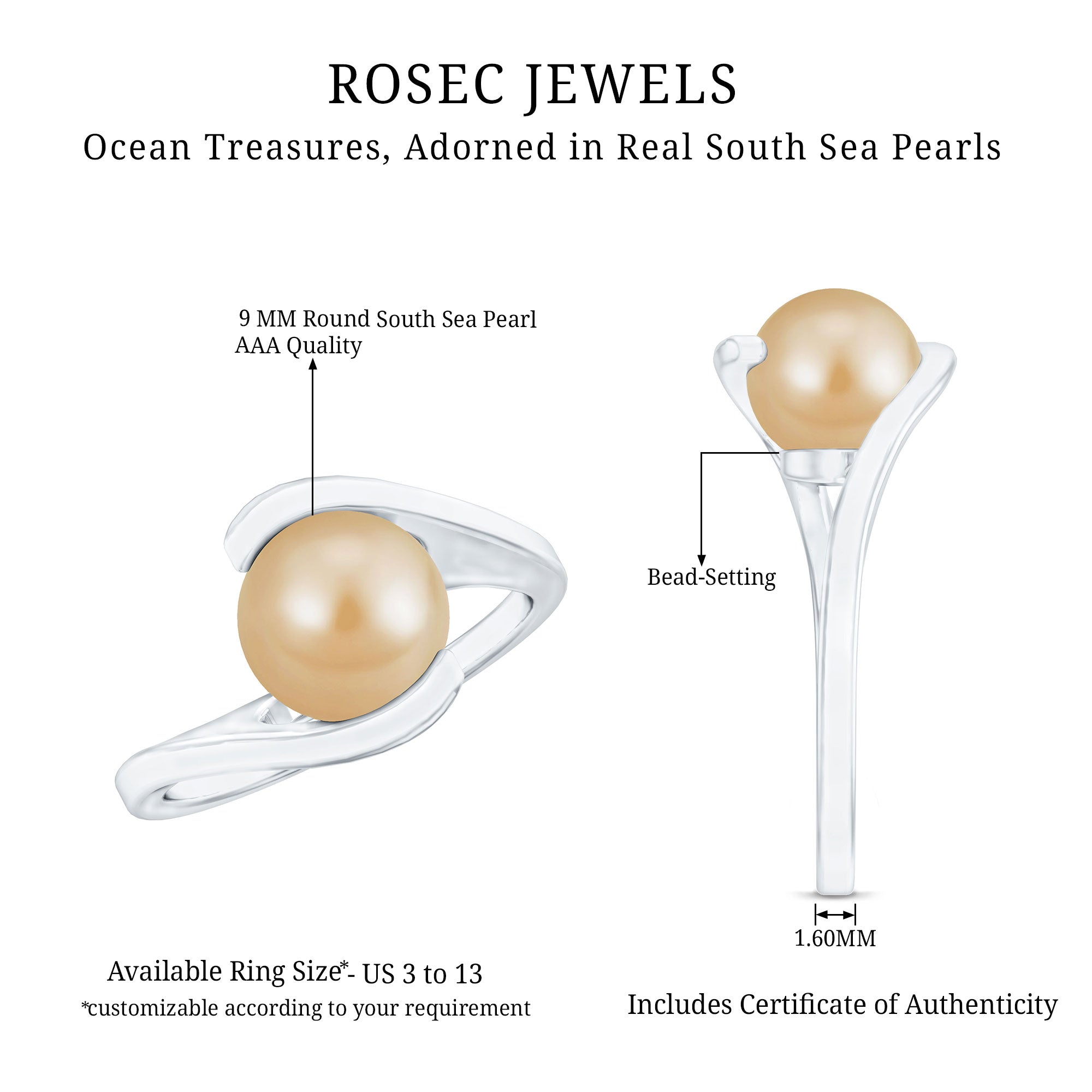 • Carat: The carat weight of South Sea Pearl ring ranges between 0.5 to as much as 5 CT.