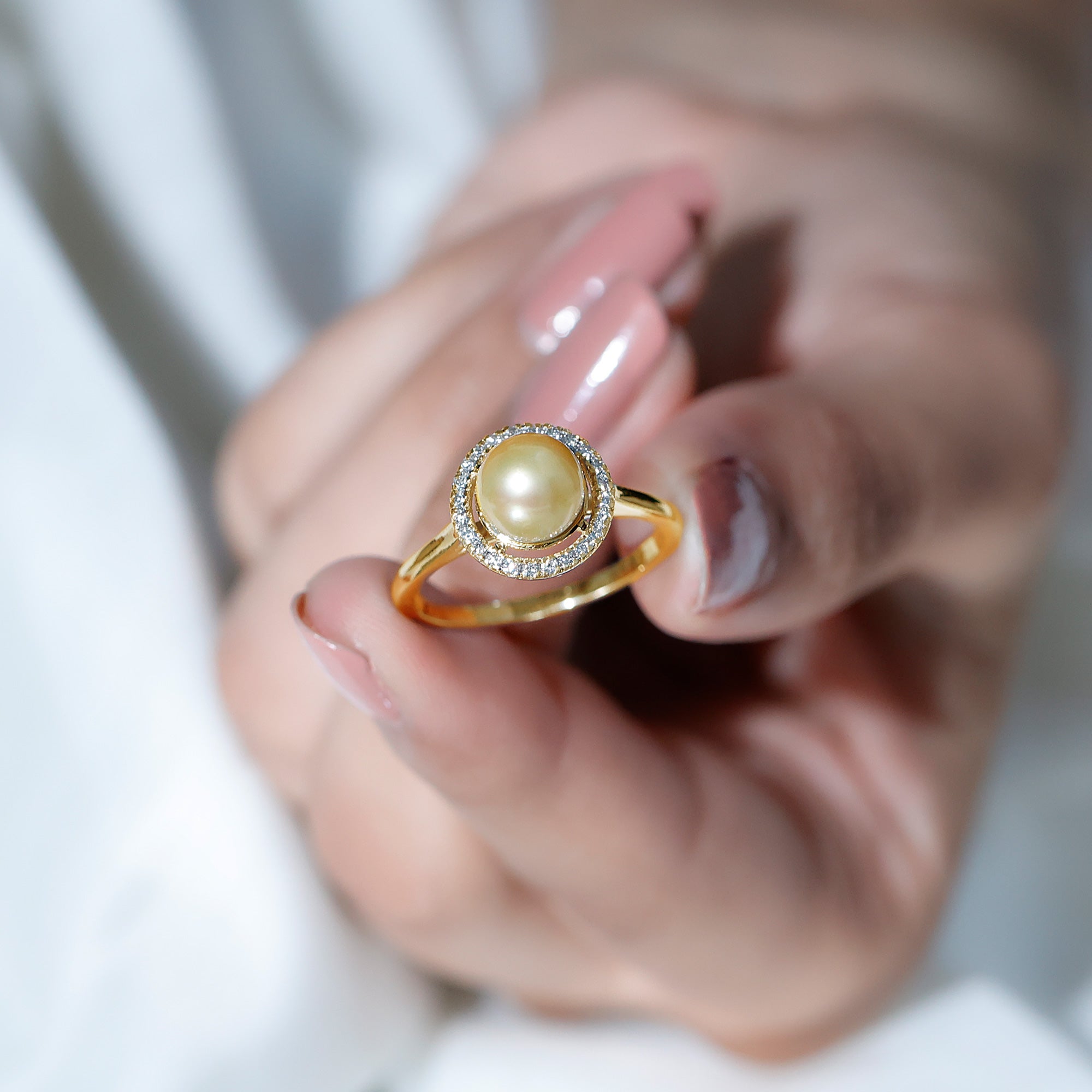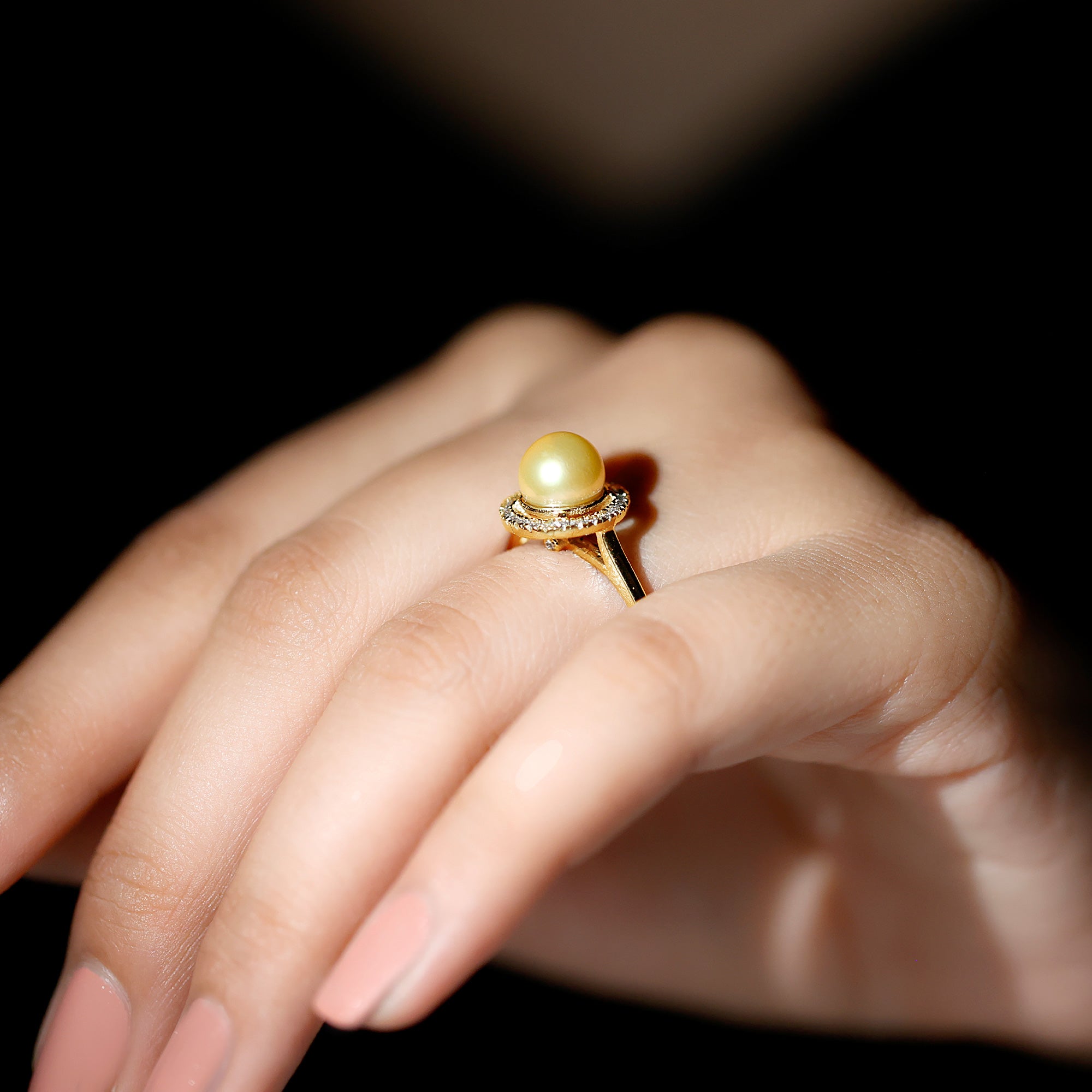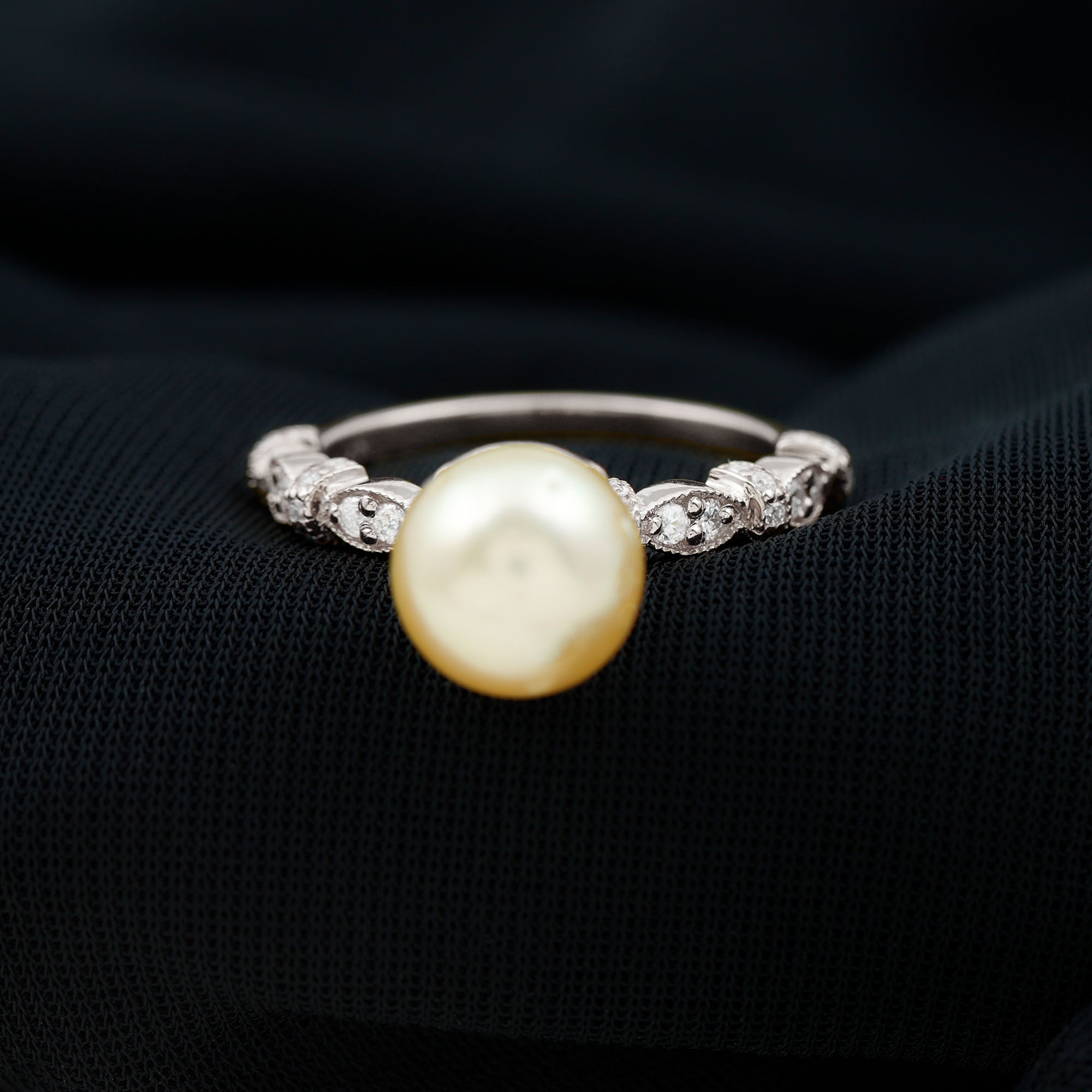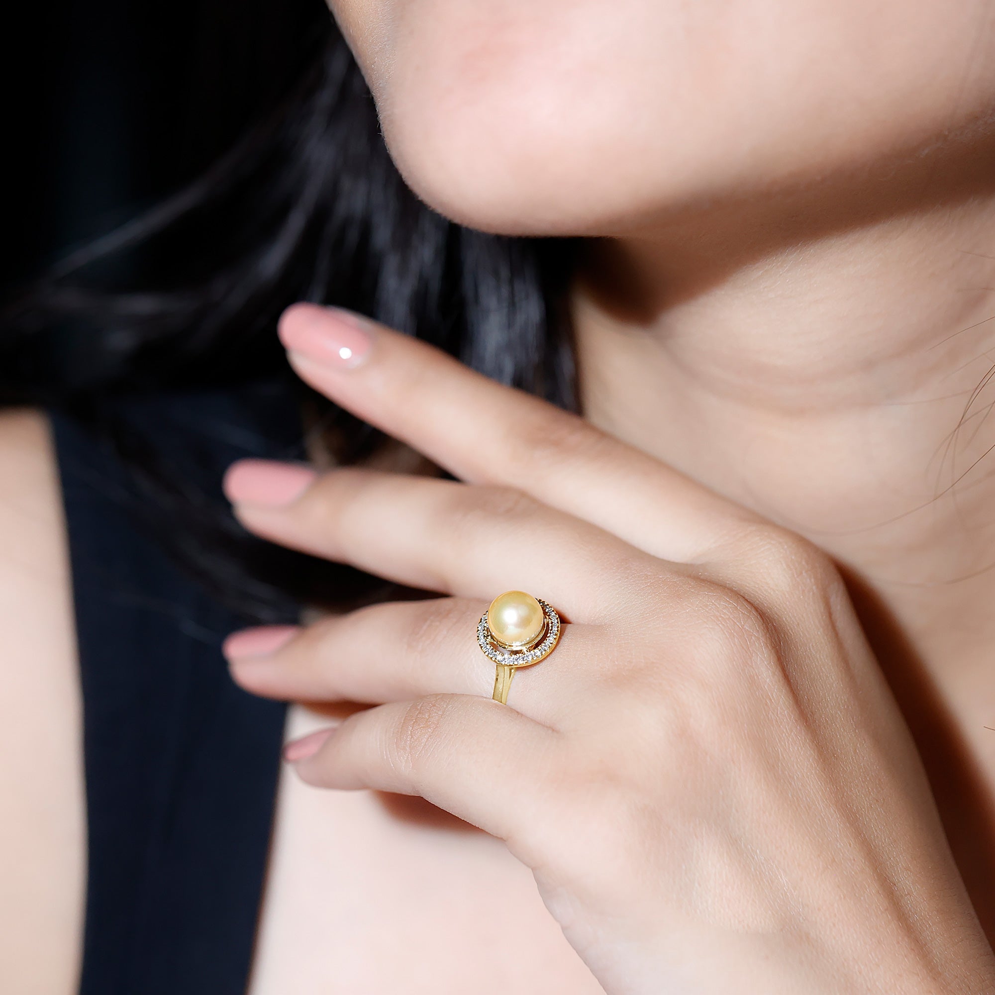 • Halo Ring: Enhanced with a sparkling halo of moissanite/diamonds, South Sea Pearl Halo rings are nothing short of graceful. They make for a fancy party wear accessory you wouldn’t want to take off.