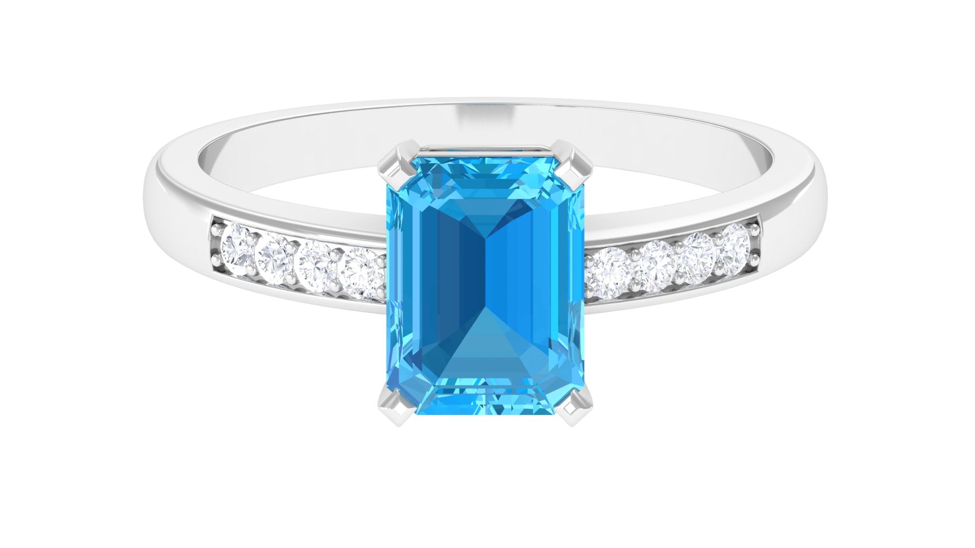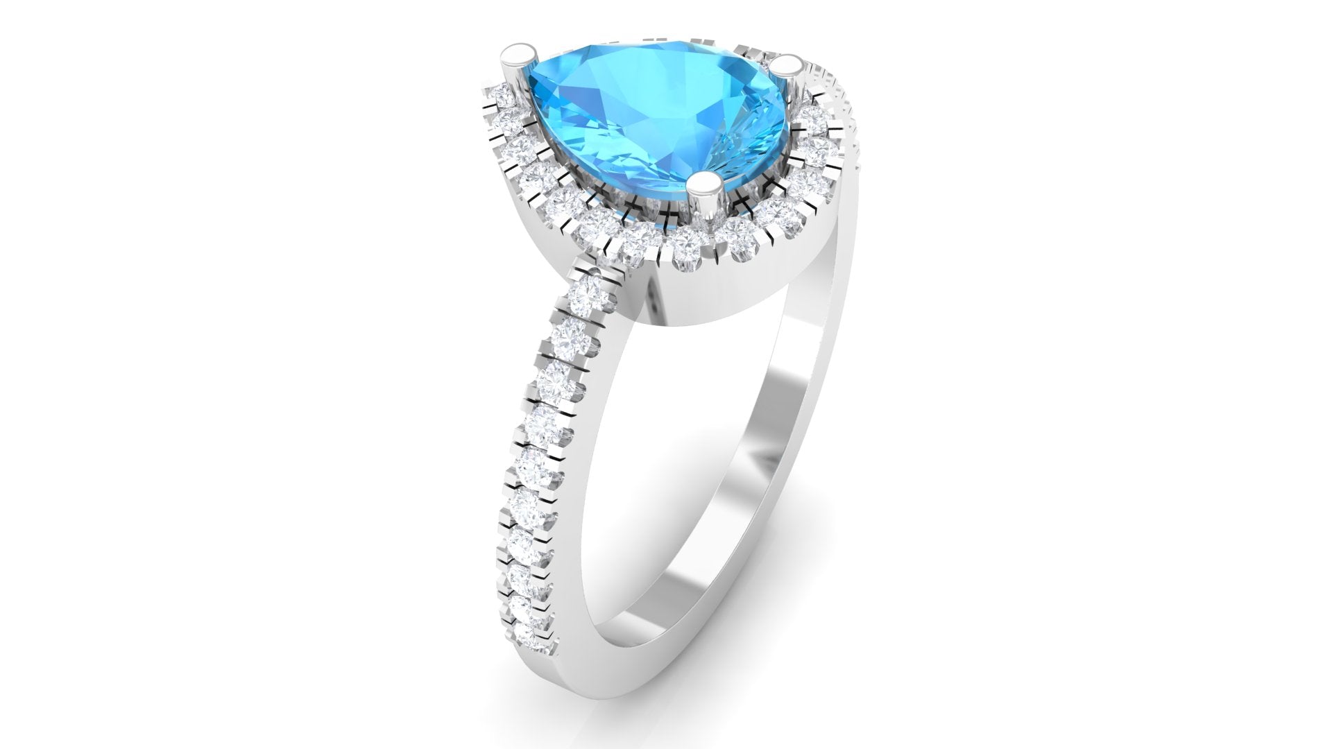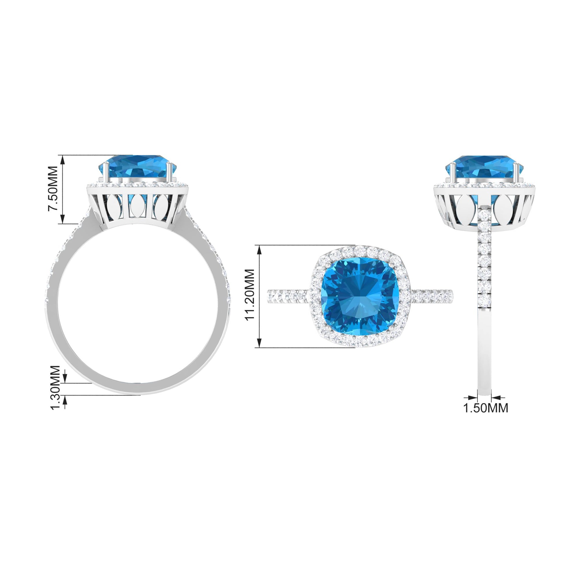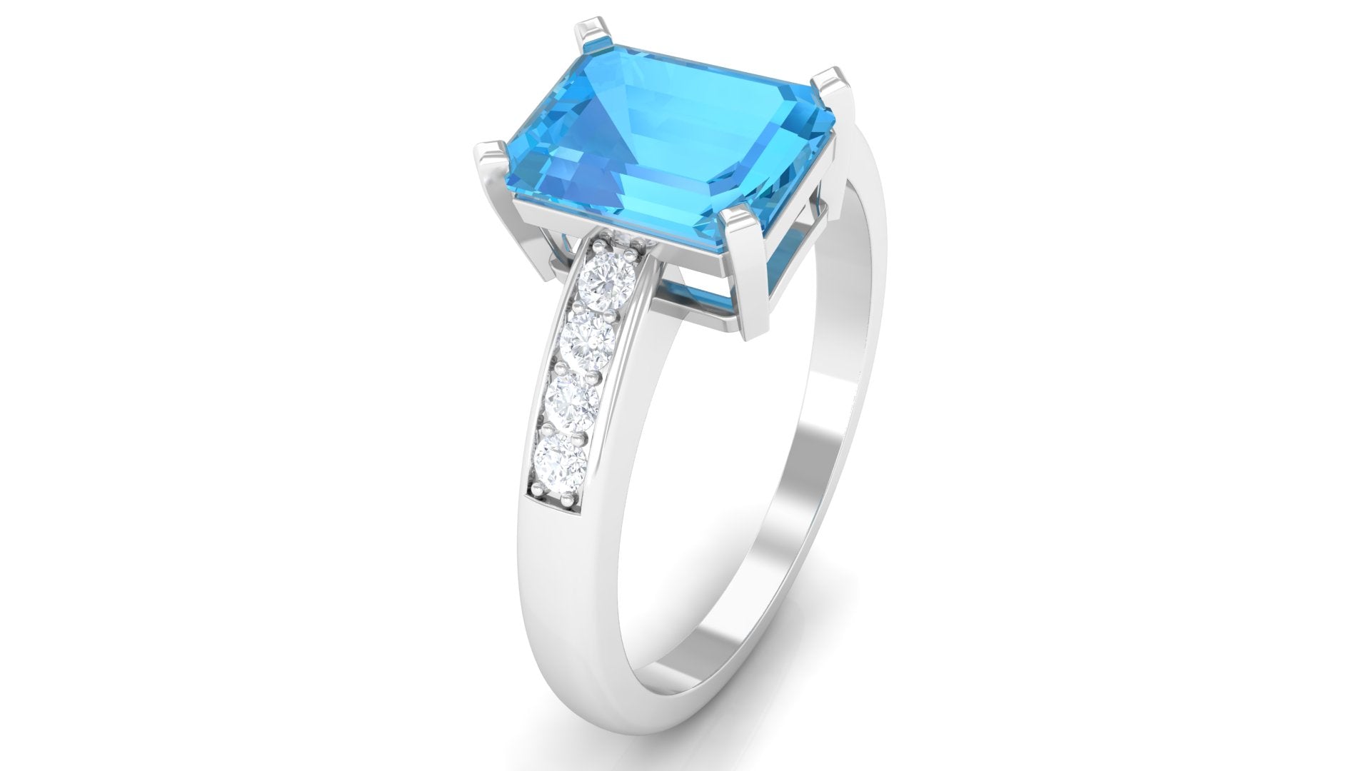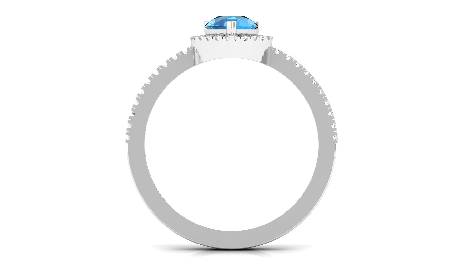 • Color: The color specific to Swiss blue topaz engagement rings is defined by bright and light shades falling in the mid-range of London Blue to Sky Blue Topaz.