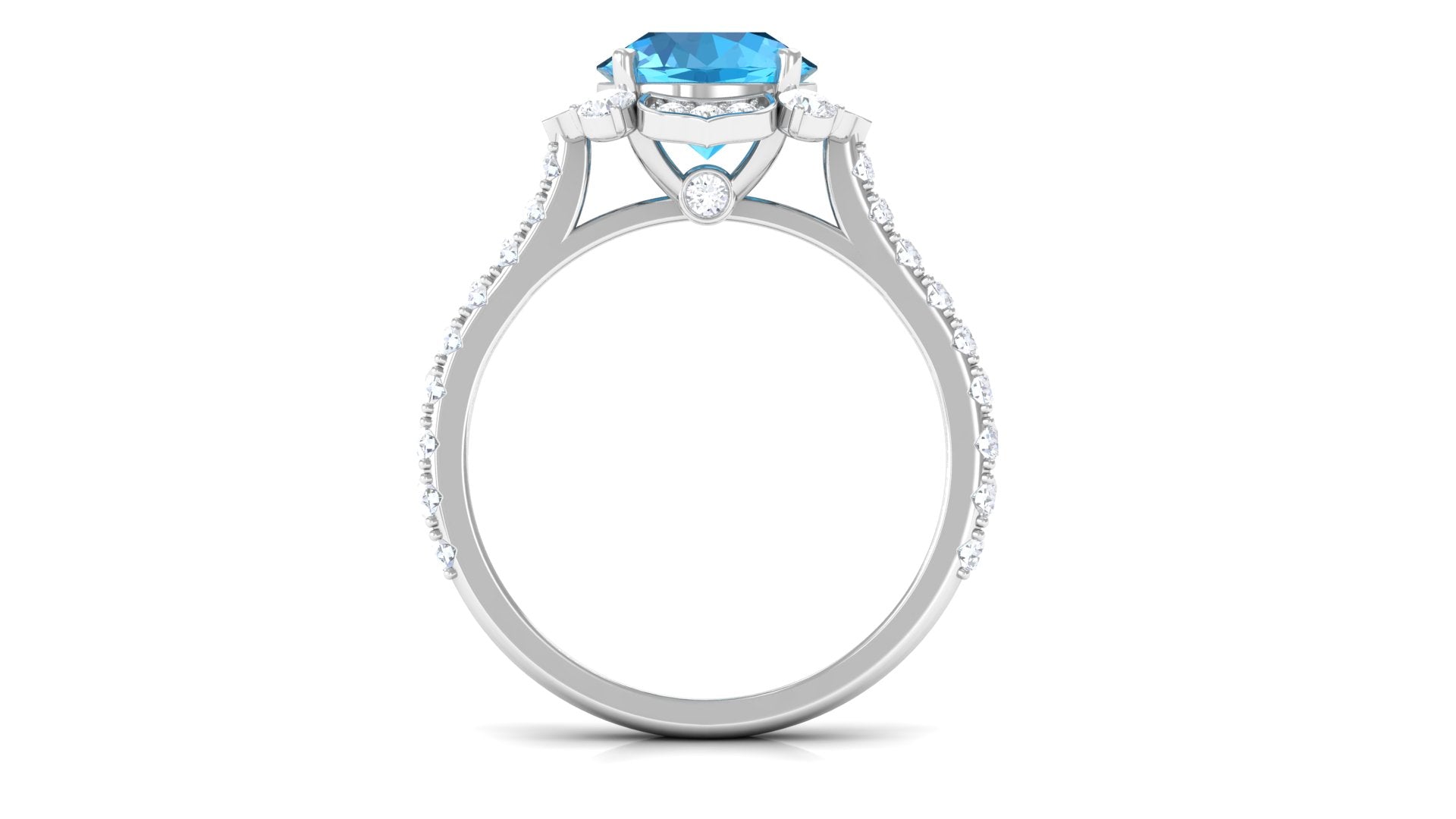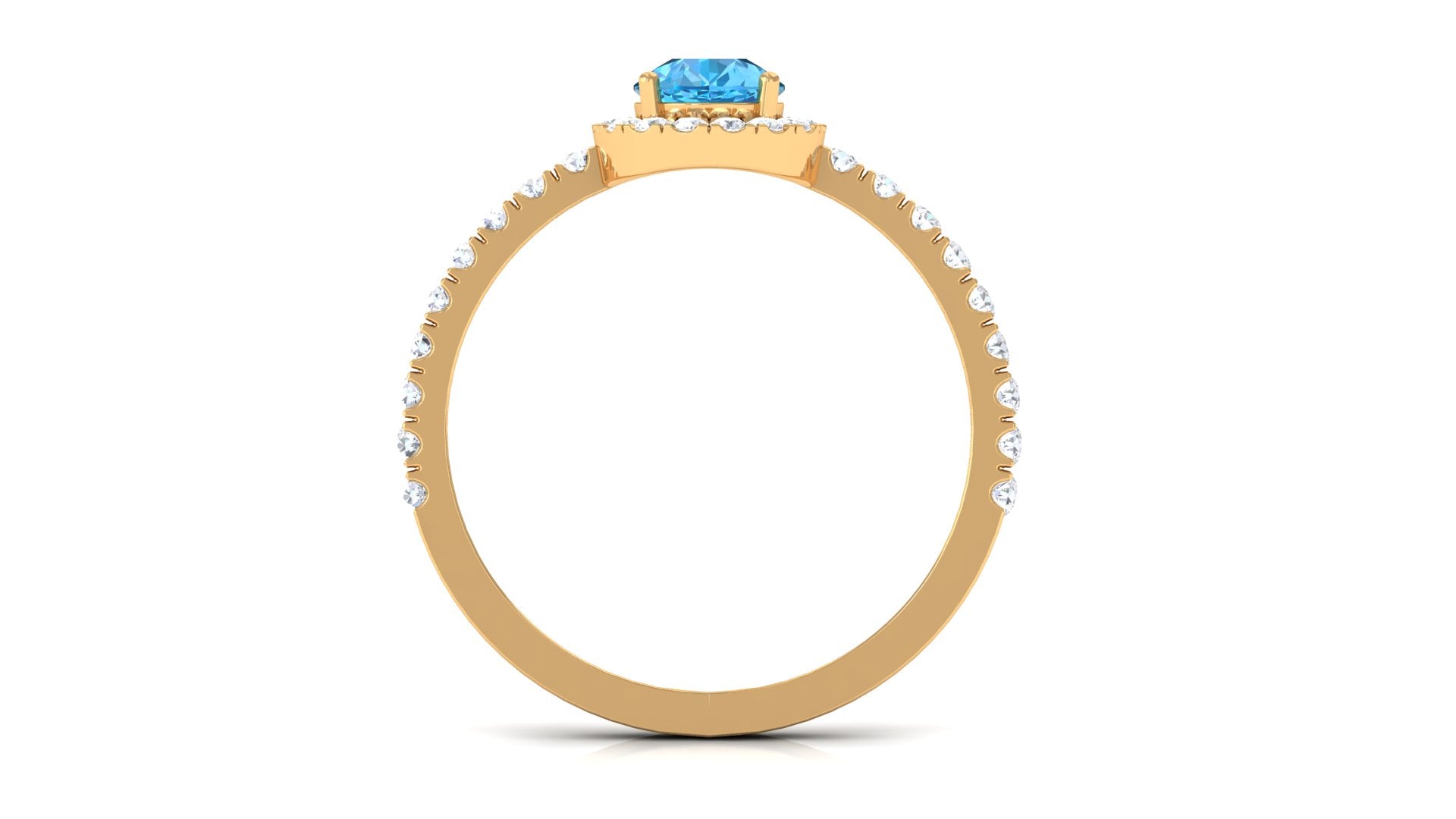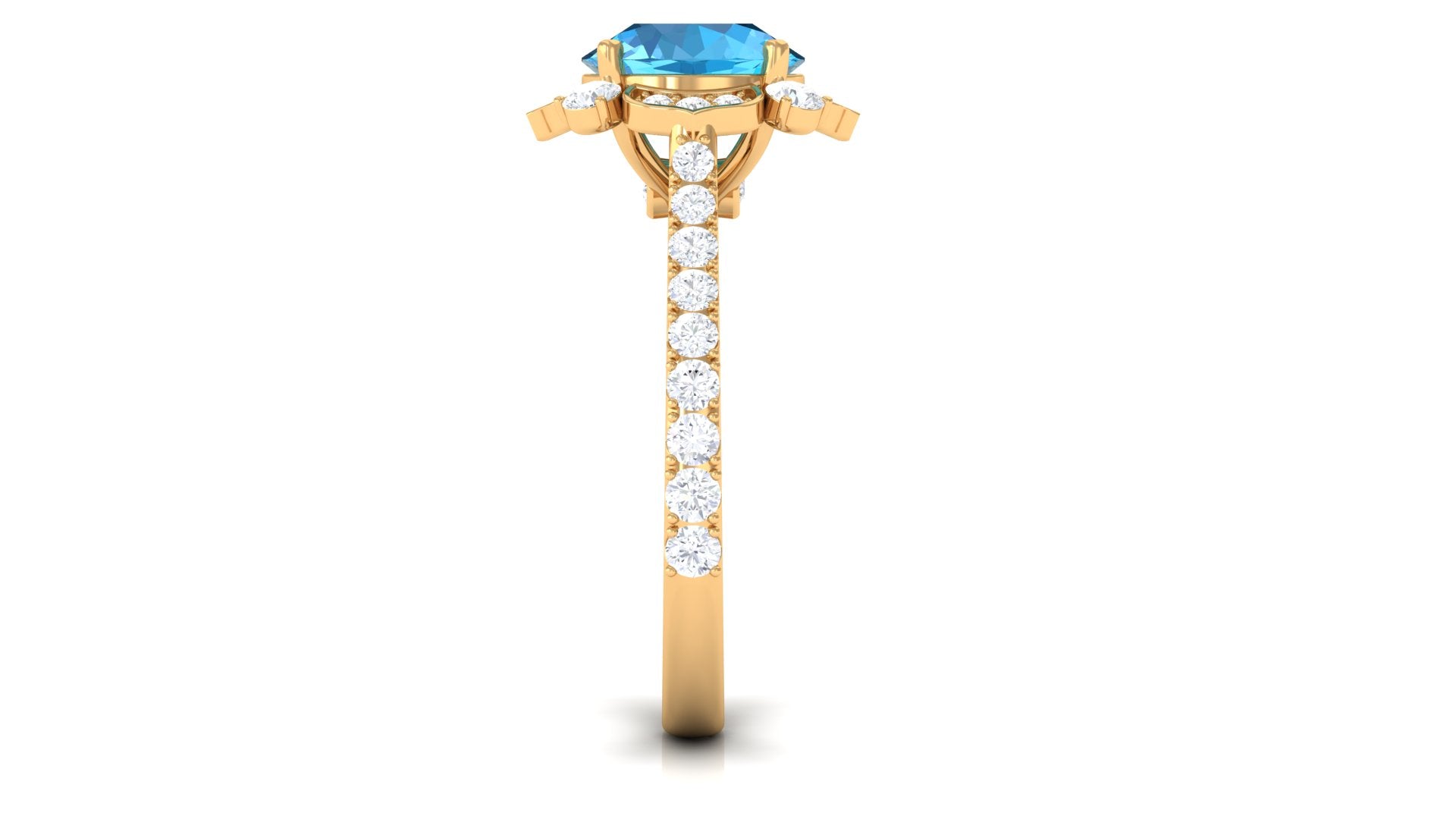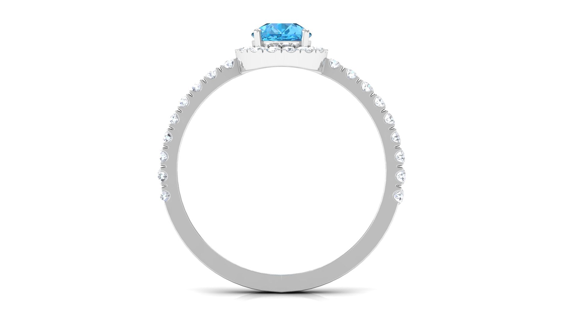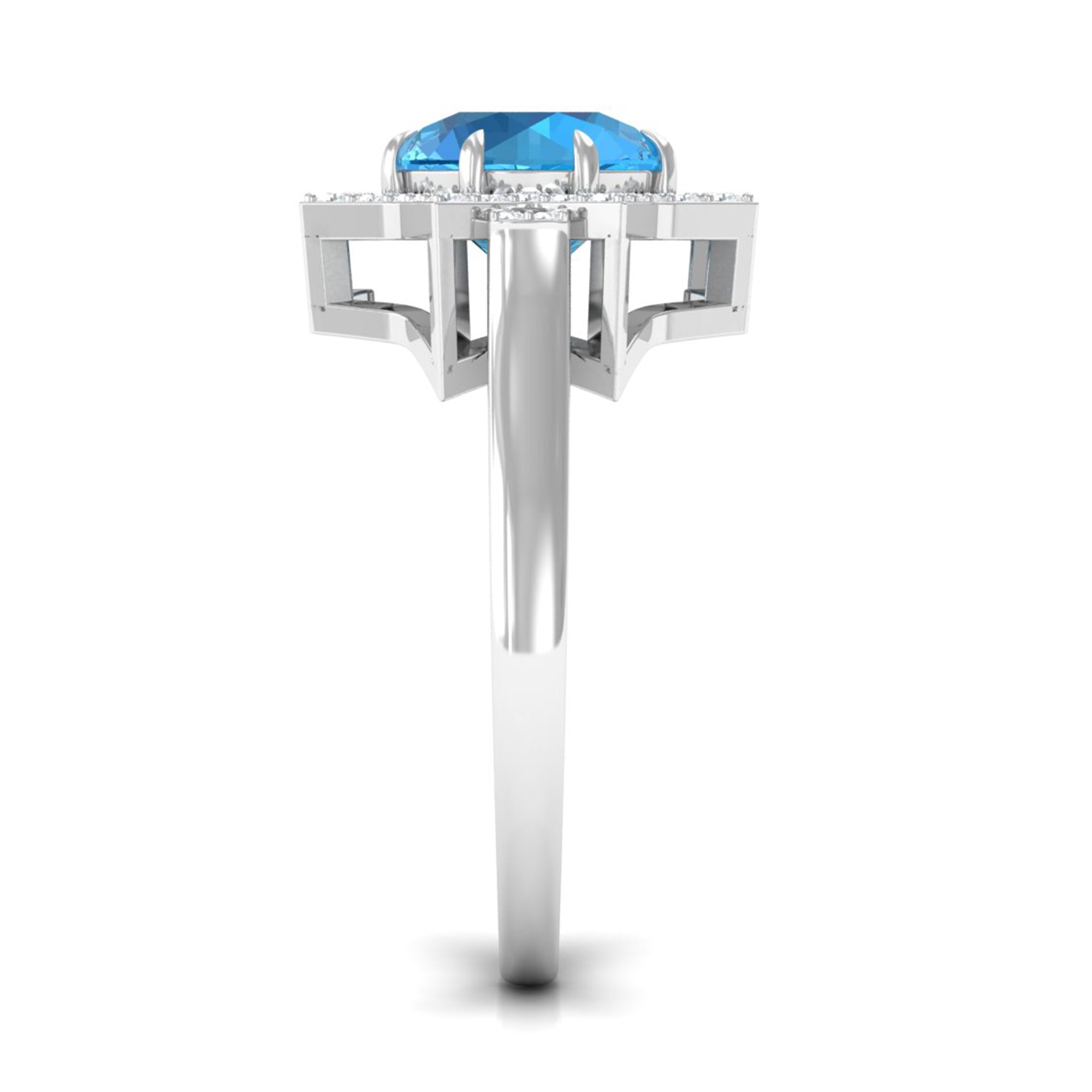 The center-stone of Swiss Blue Topaz here is sparkled up with the encircling of Diamond/Moissanite (that we fondly term ‘Halo’). That makes the Swiss Blue Topaz appear even brighter while highlighting its beauty at its best. Surprisingly, it also gives off the illusion of a bigger Topaz. So, if a Swiss Blue Topaz and Diamond Ring is on your list, this style might turn out to be your best bet.