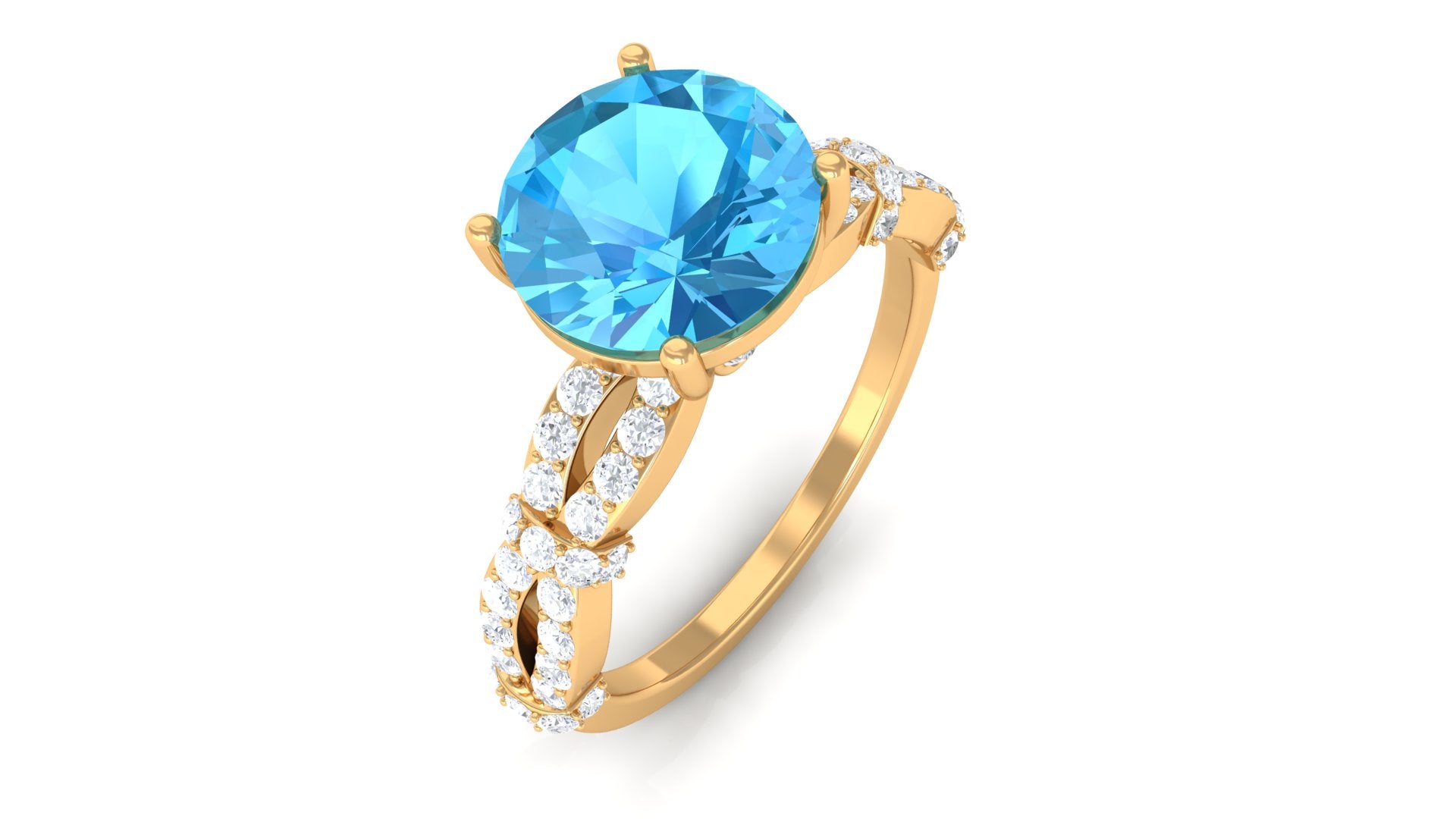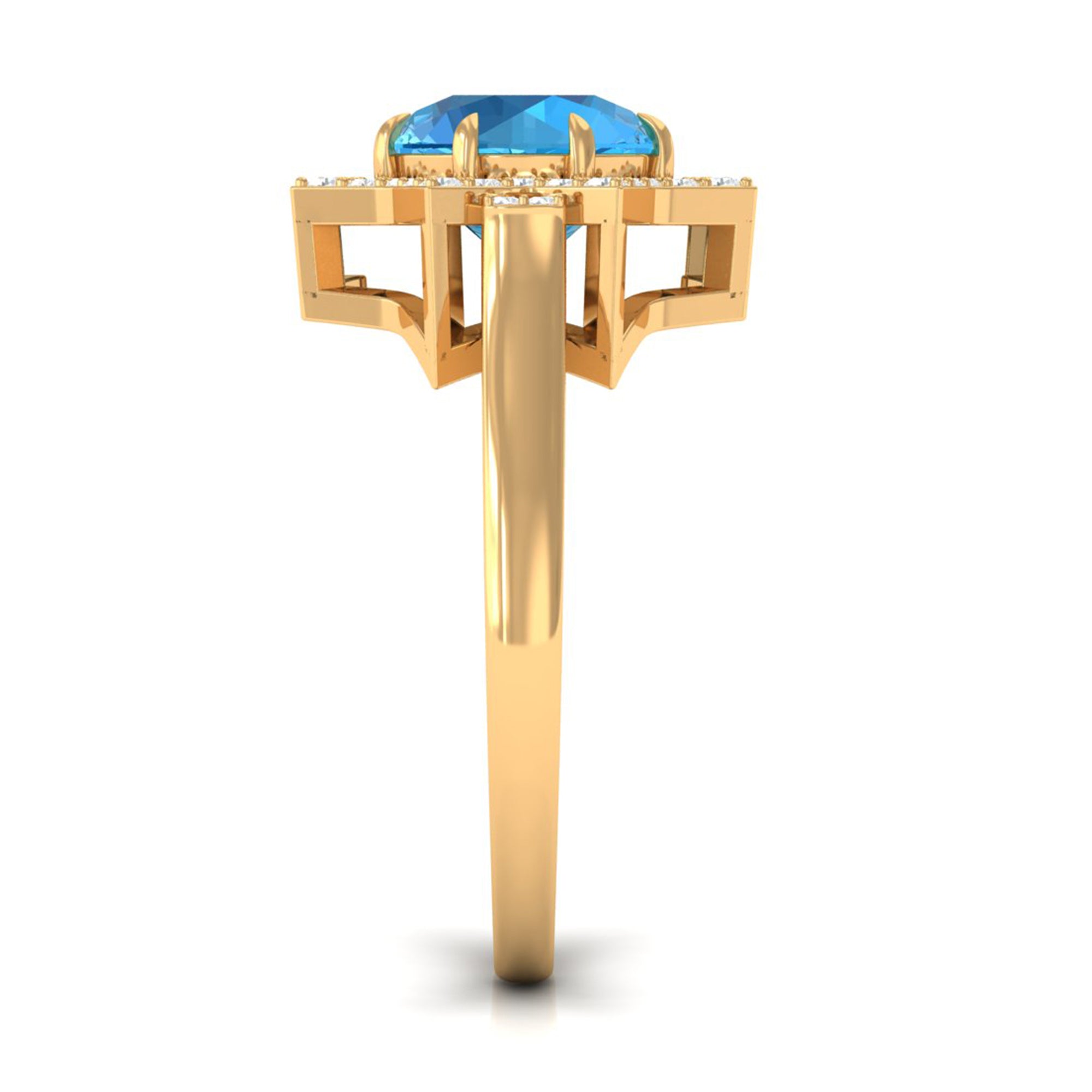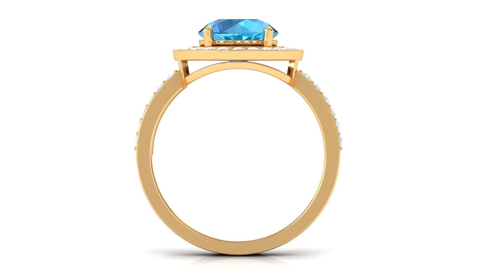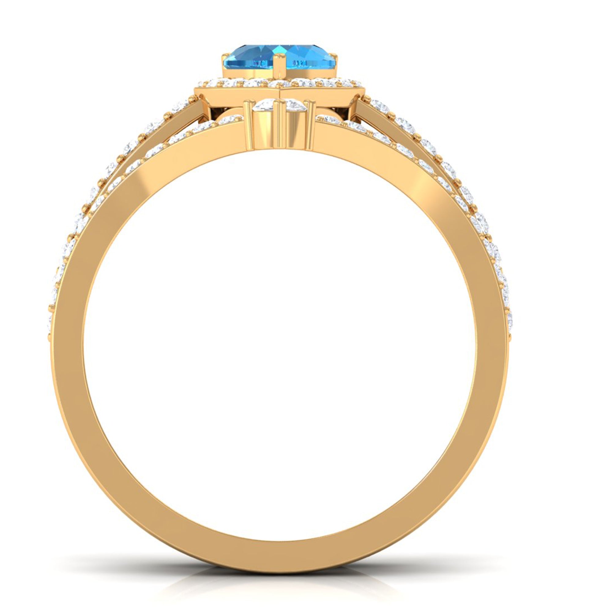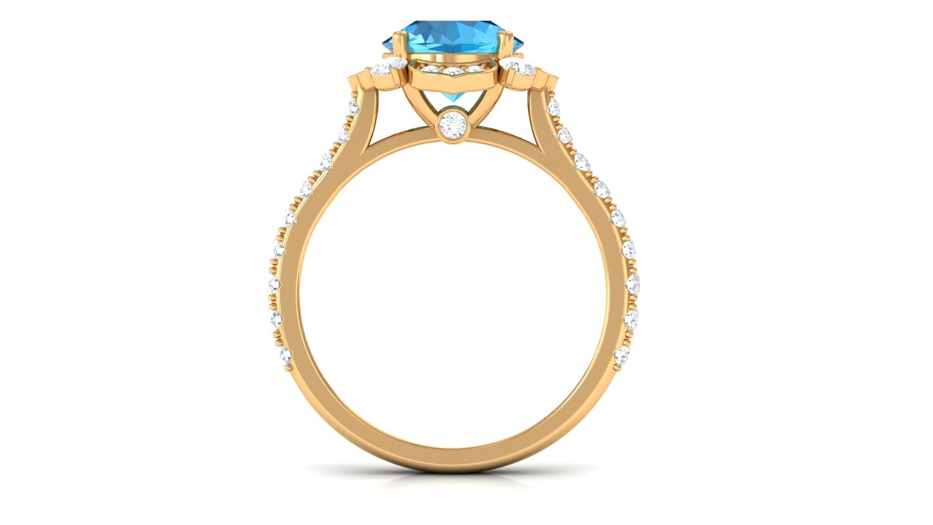 The center-stone of Swiss Blue Topaz here is sparkled up with the encircling of Diamond/Moissanite (that we fondly term ‘Halo’). That makes the Swiss Blue Topaz appear even brighter while highlighting its beauty at its best. Surprisingly, it also gives off the illusion of a bigger Topaz. So, if a Swiss Blue Topaz and Diamond Ring is on your list, this style might turn out to be your best bet.