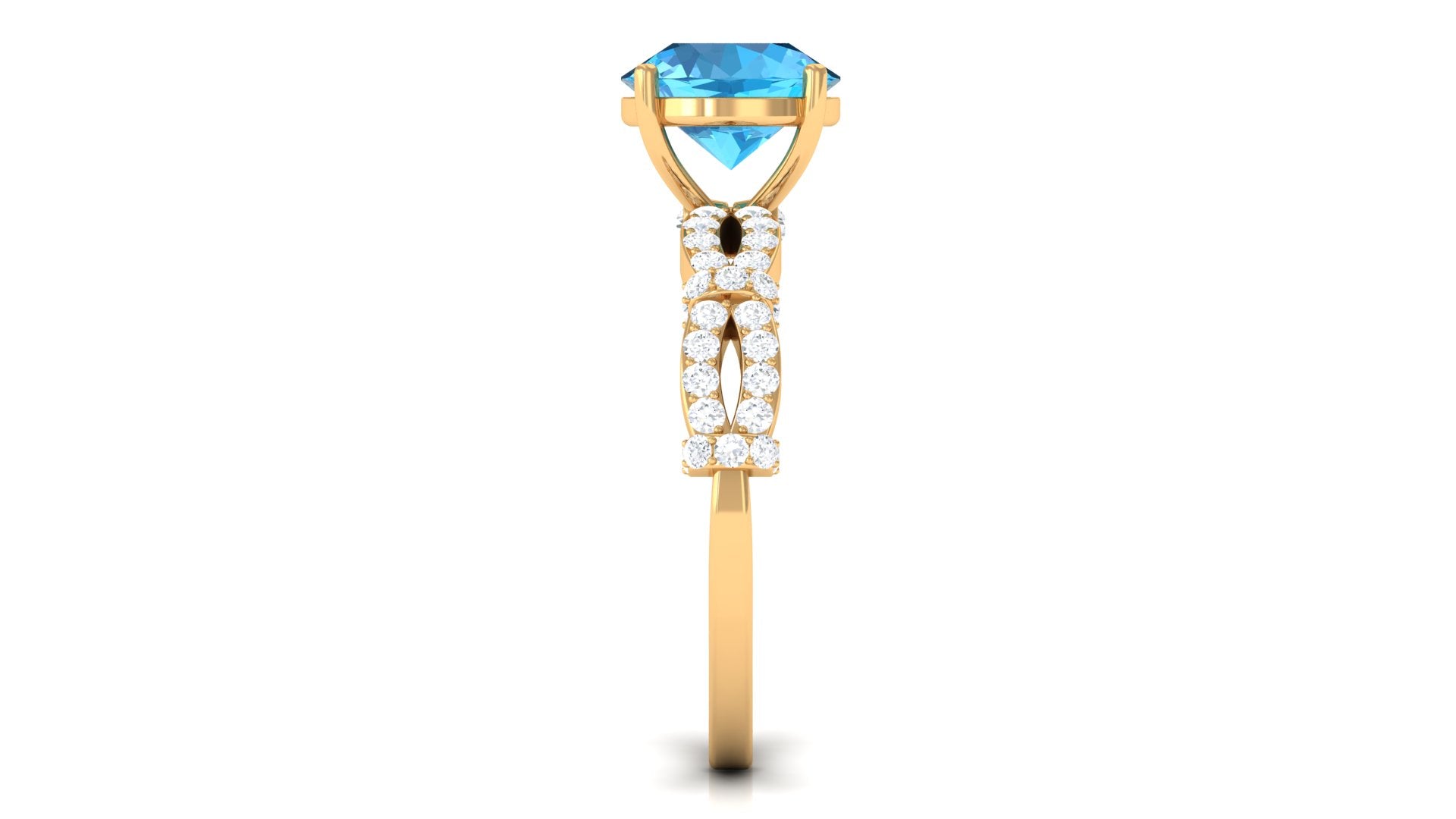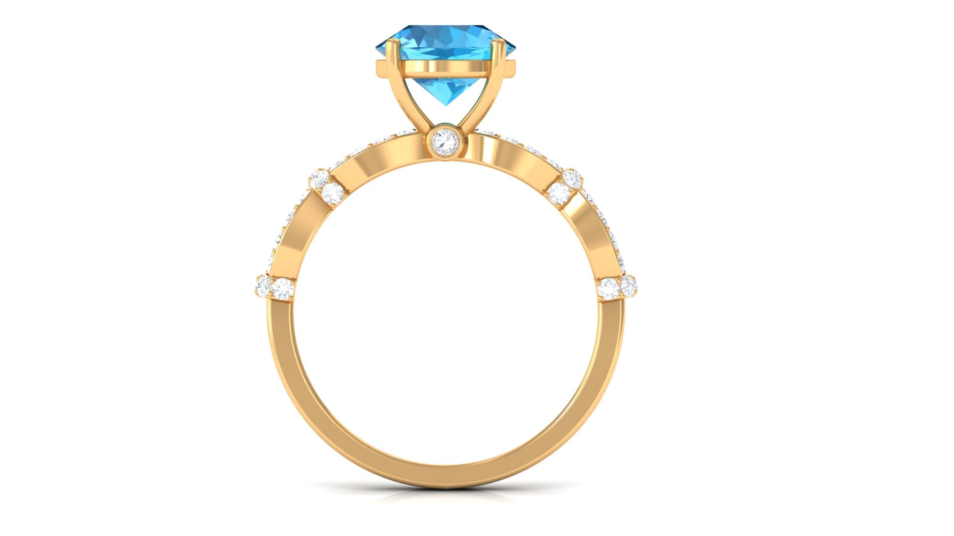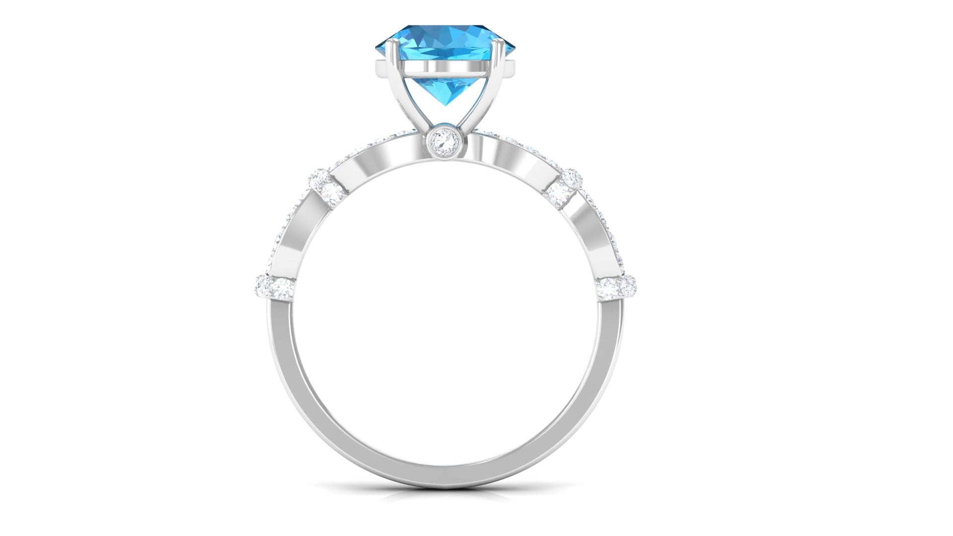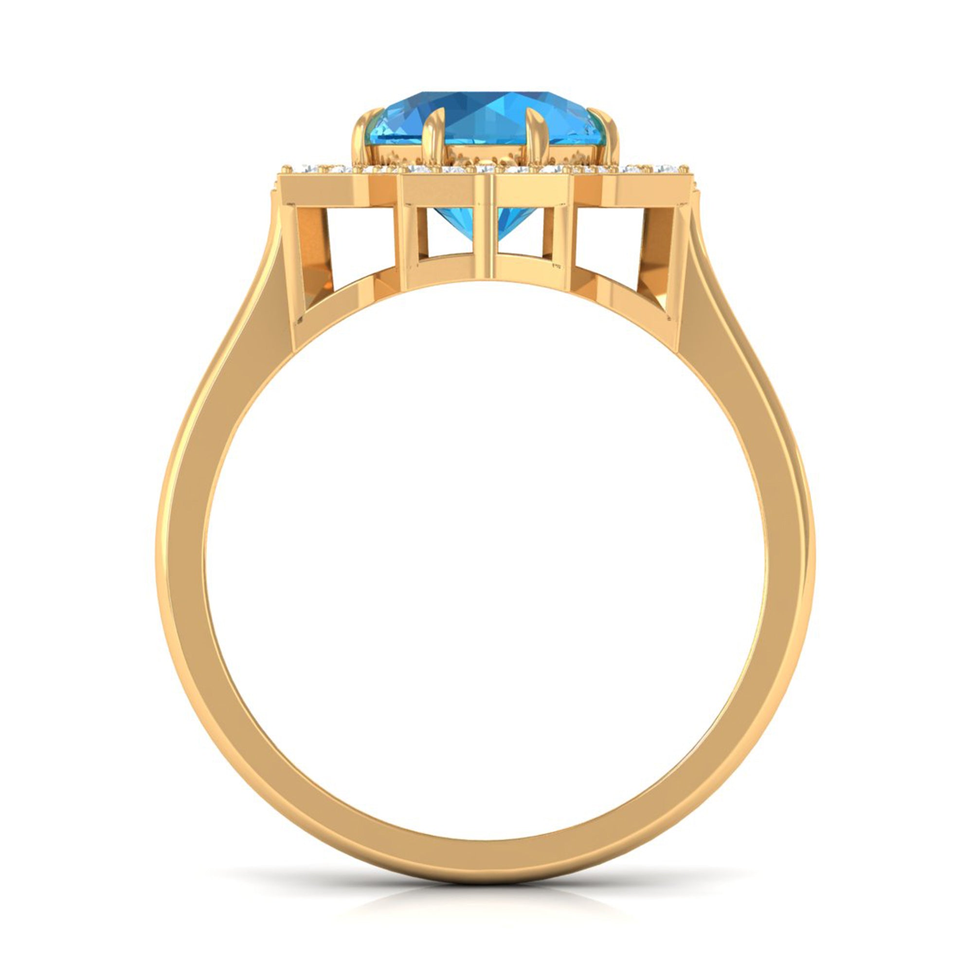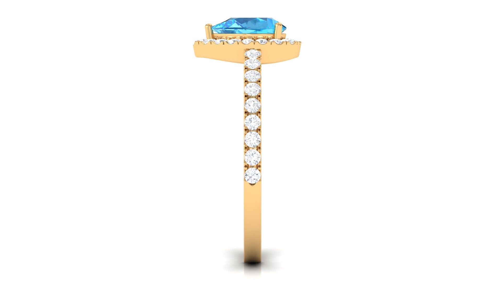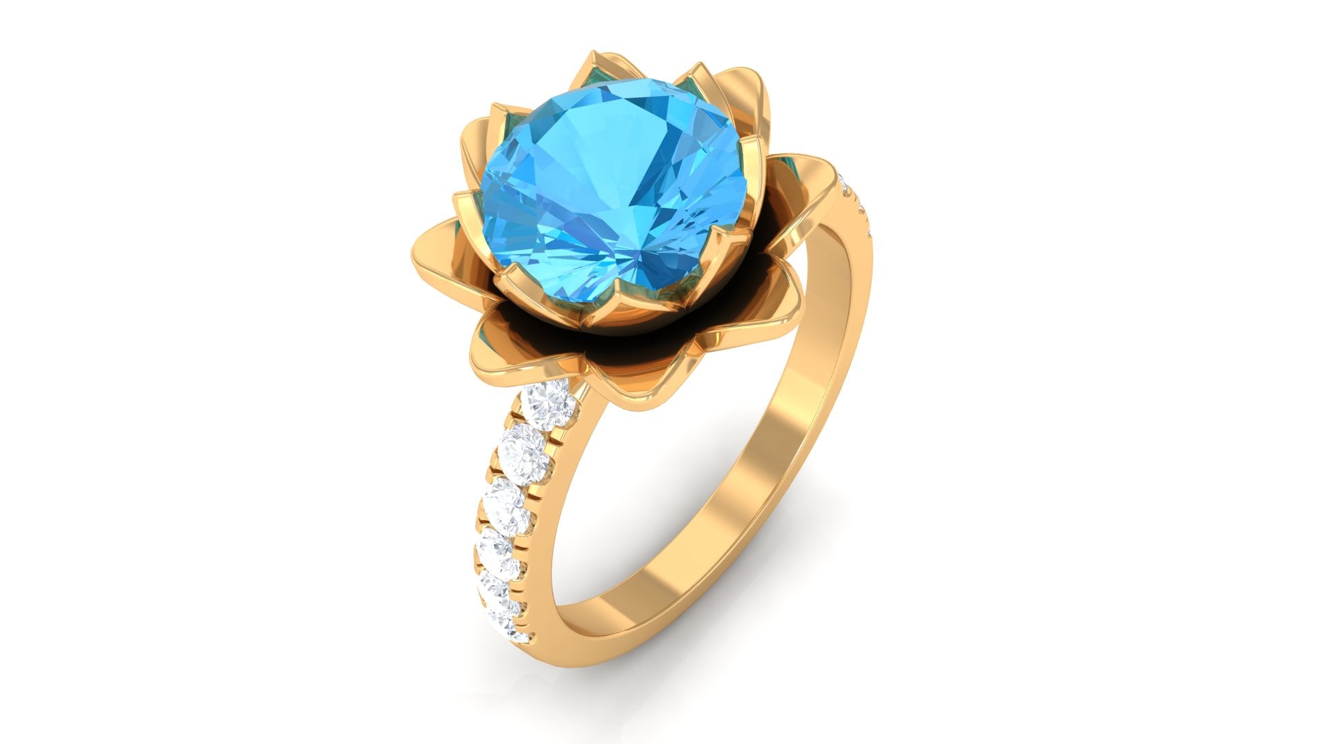 The center-stone of Swiss Blue Topaz here is sparkled up with the encircling of Diamond/Moissanite (that we fondly term ‘Halo’). That makes the Swiss Blue Topaz appear even brighter while highlighting its beauty at its best. Surprisingly, it also gives off the illusion of a bigger Topaz. So, if a Swiss Blue Topaz and Diamond Ring is on your list, this style might turn out to be your best bet.