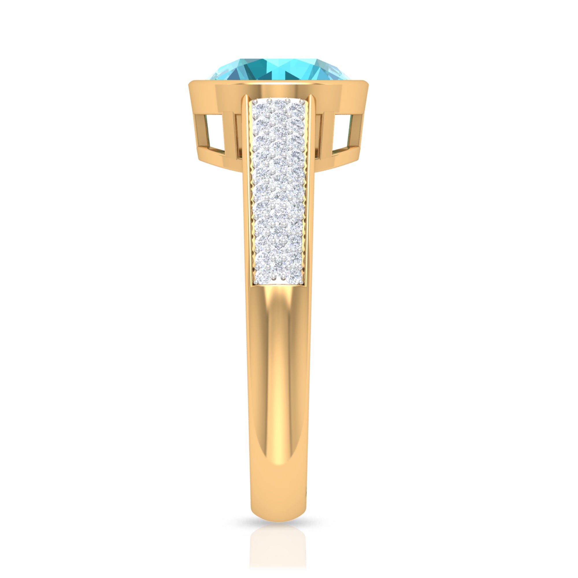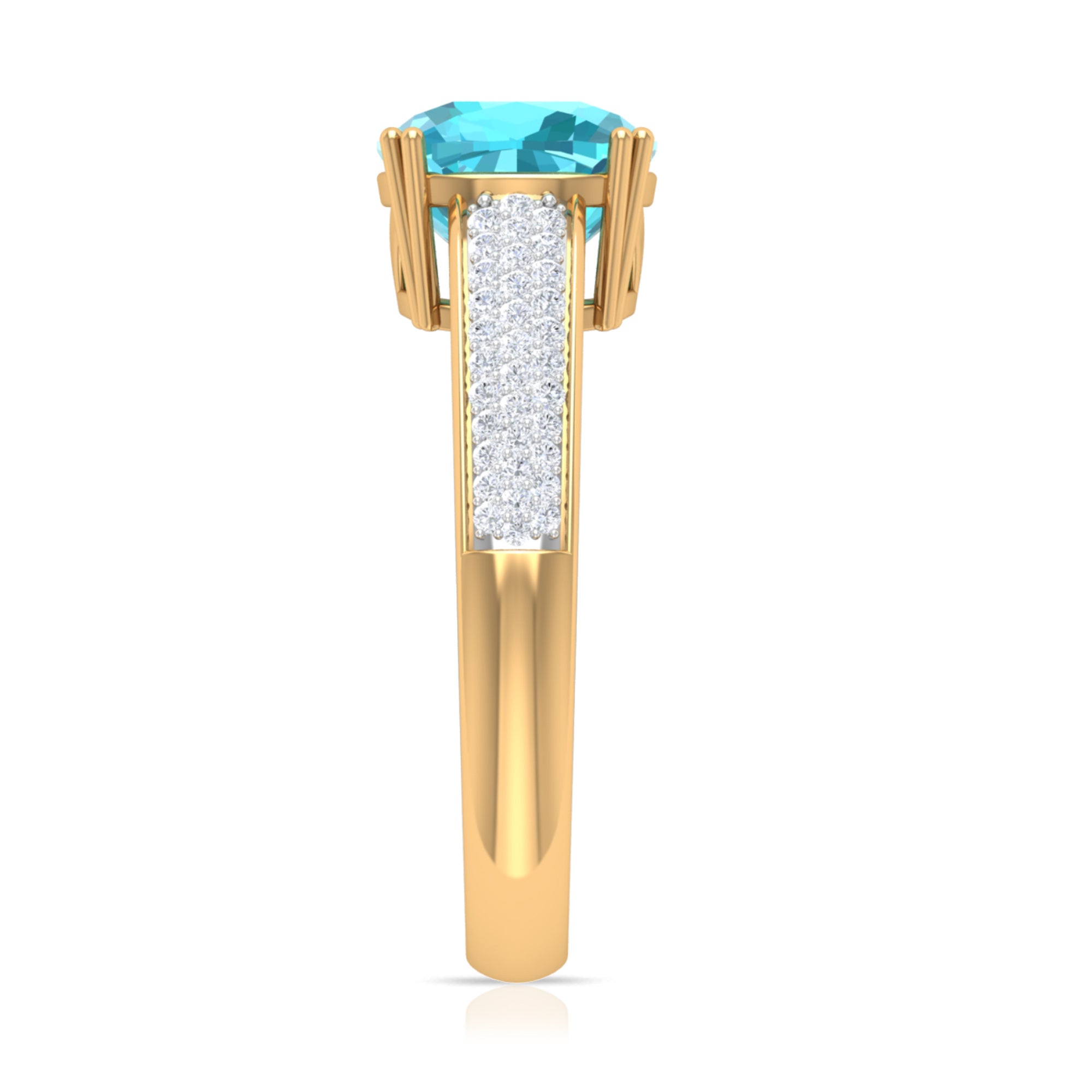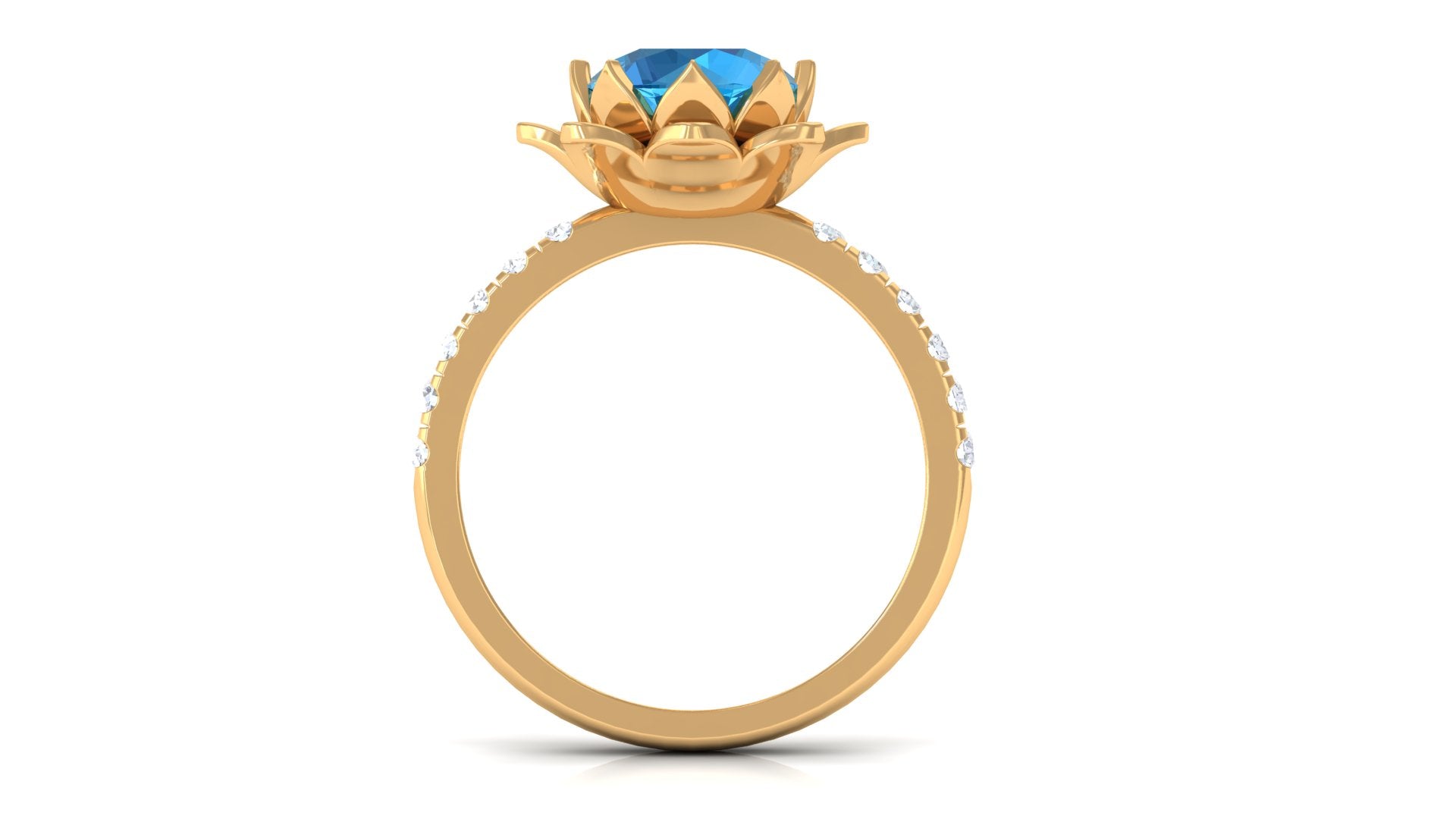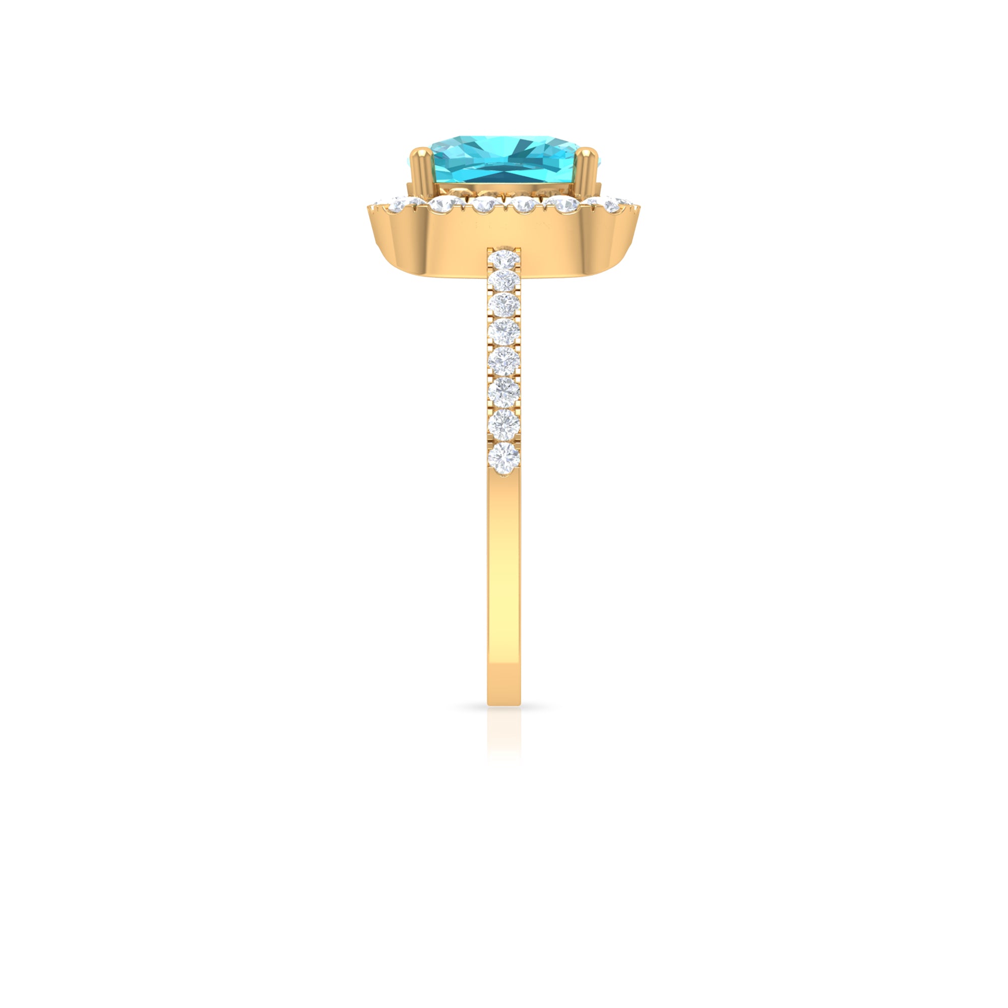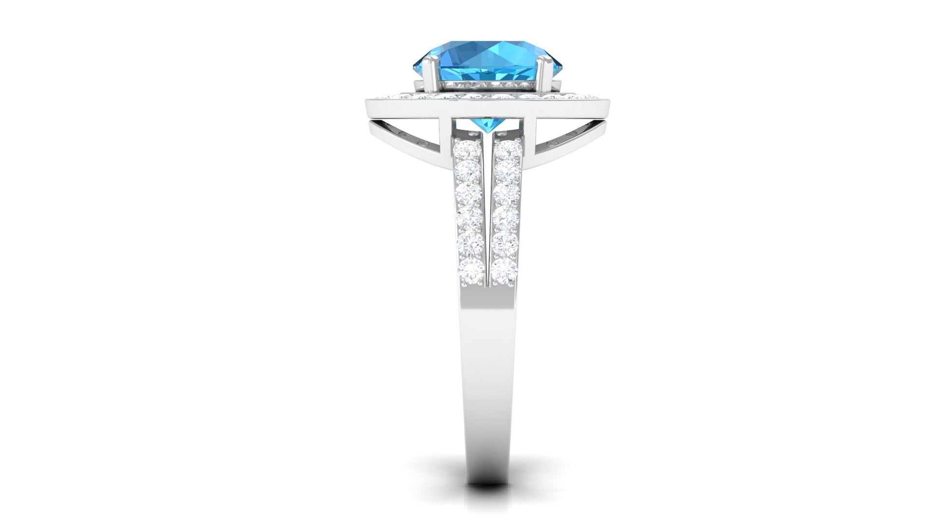 The center-stone of Swiss Blue Topaz here is sparkled up with the encircling of Diamond/Moissanite (that we fondly term ‘Halo’). That makes the Swiss Blue Topaz appear even brighter while highlighting its beauty at its best. Surprisingly, it also gives off the illusion of a bigger Topaz. So, if a Swiss Blue Topaz and Diamond Ring is on your list, this style might turn out to be your best bet.