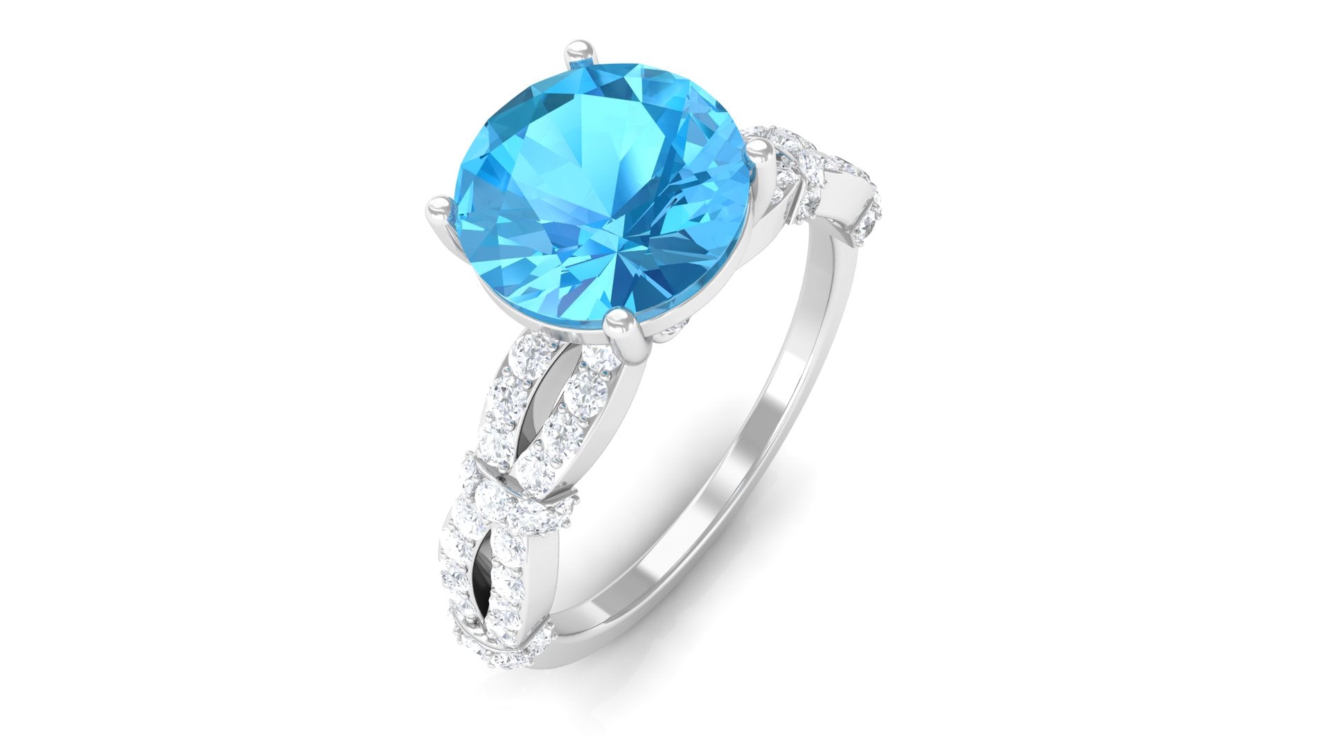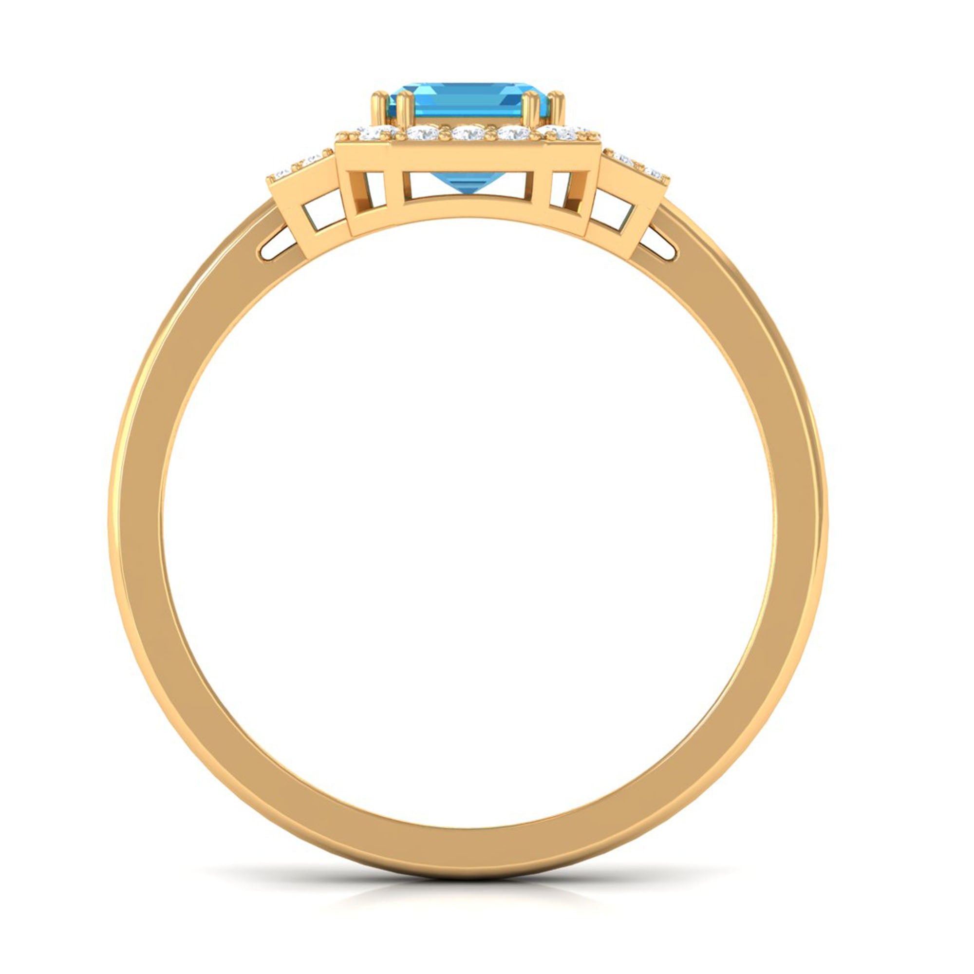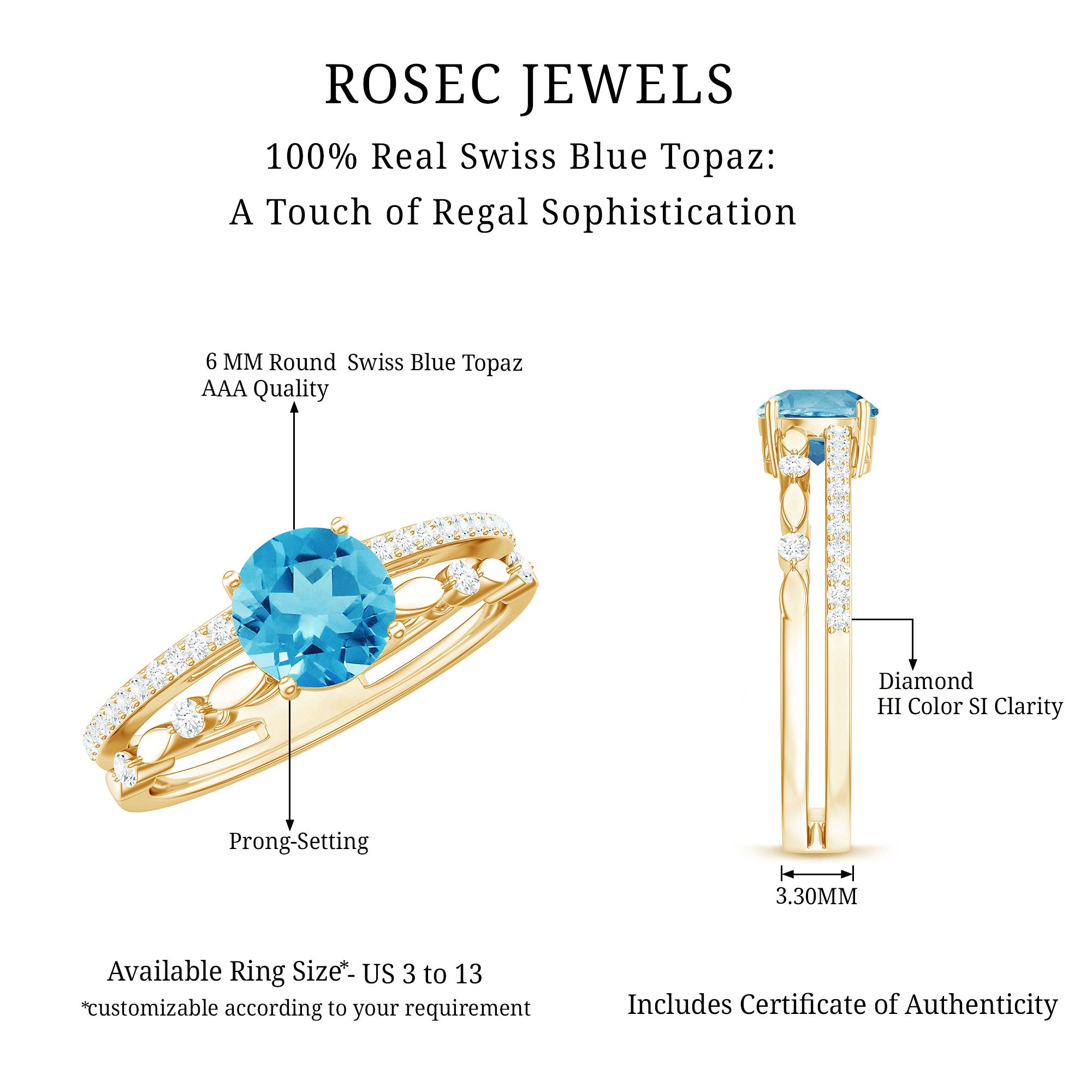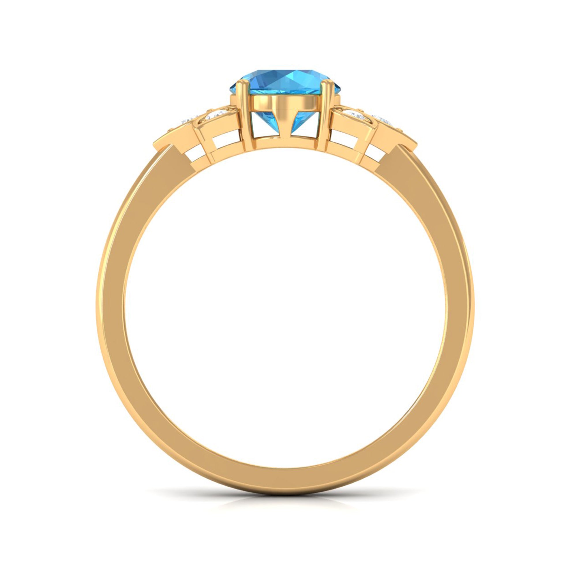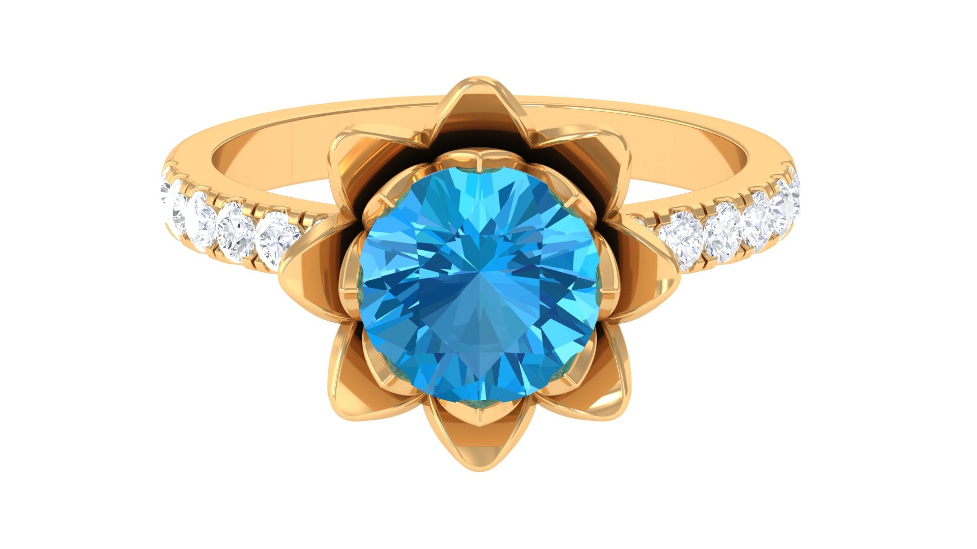 The center-stone of Swiss Blue Topaz here is sparkled up with the encircling of Diamond/Moissanite (that we fondly term ‘Halo’). That makes the Swiss Blue Topaz appear even brighter while highlighting its beauty at its best. Surprisingly, it also gives off the illusion of a bigger Topaz. So, if a Swiss Blue Topaz and Diamond Ring is on your list, this style might turn out to be your best bet.