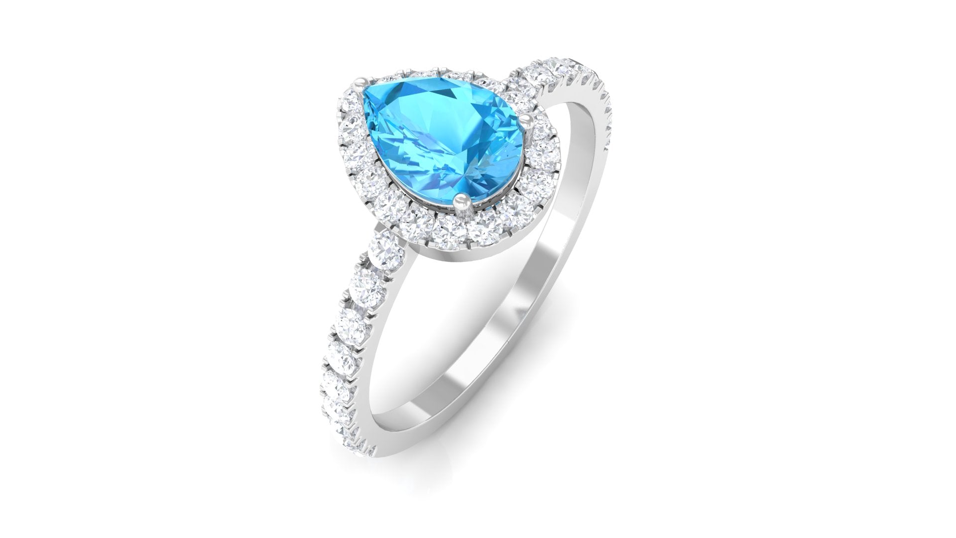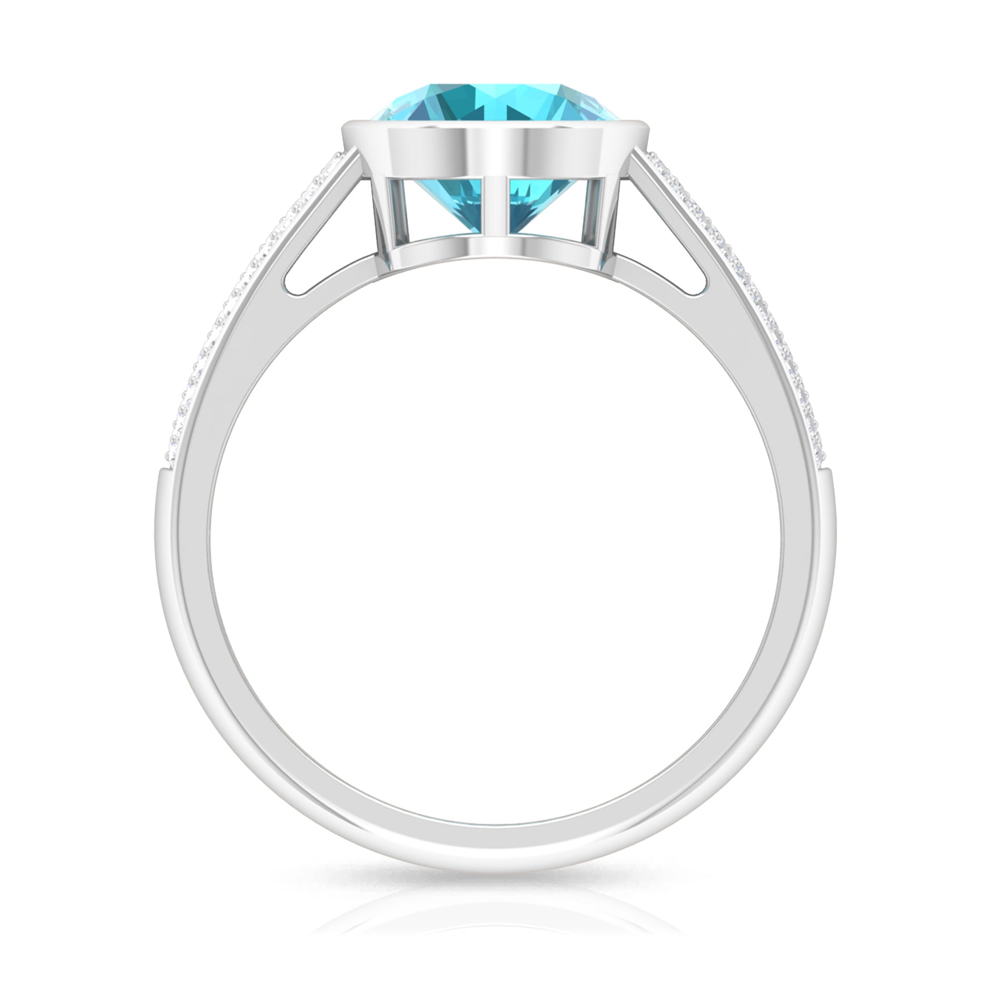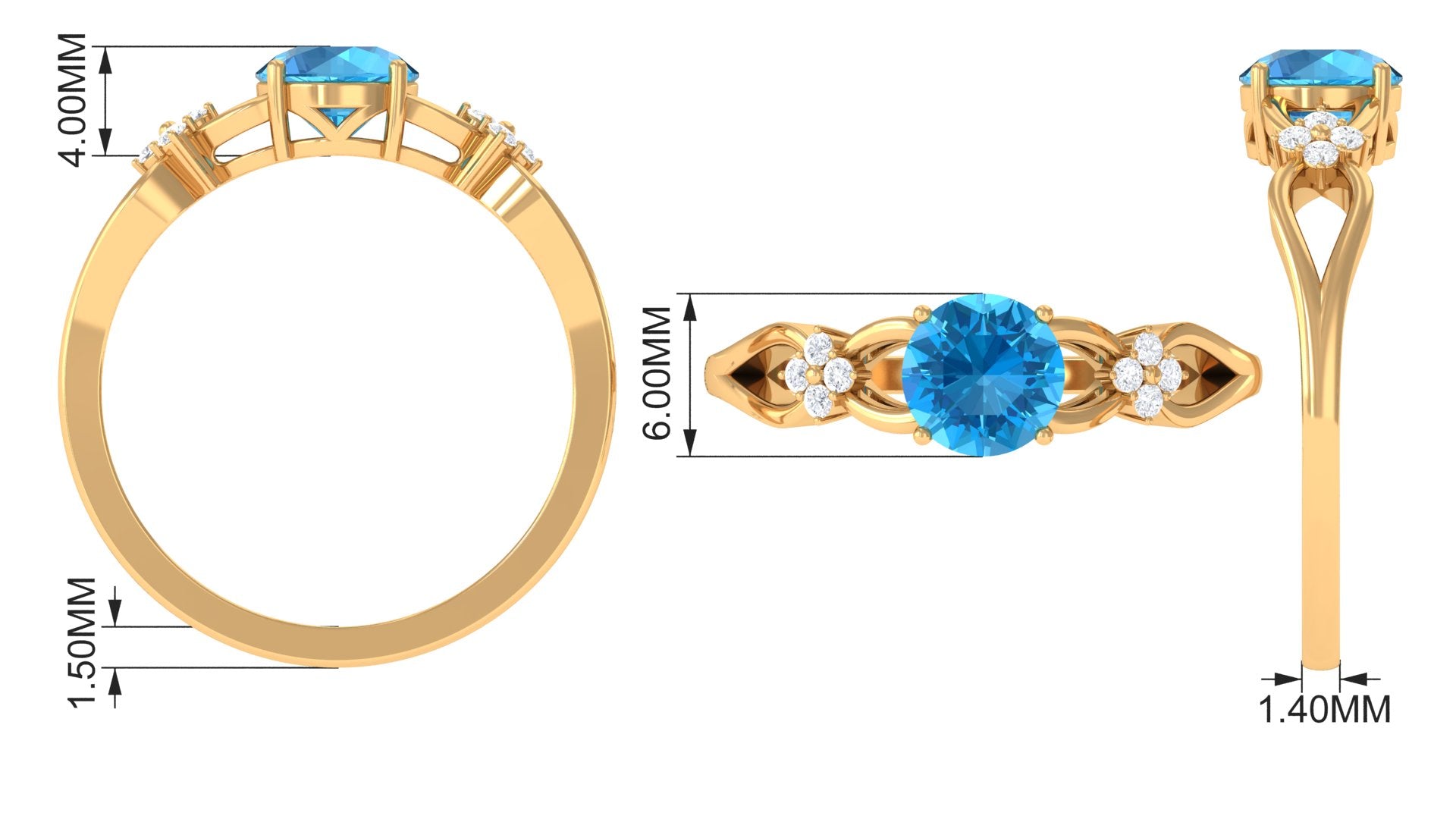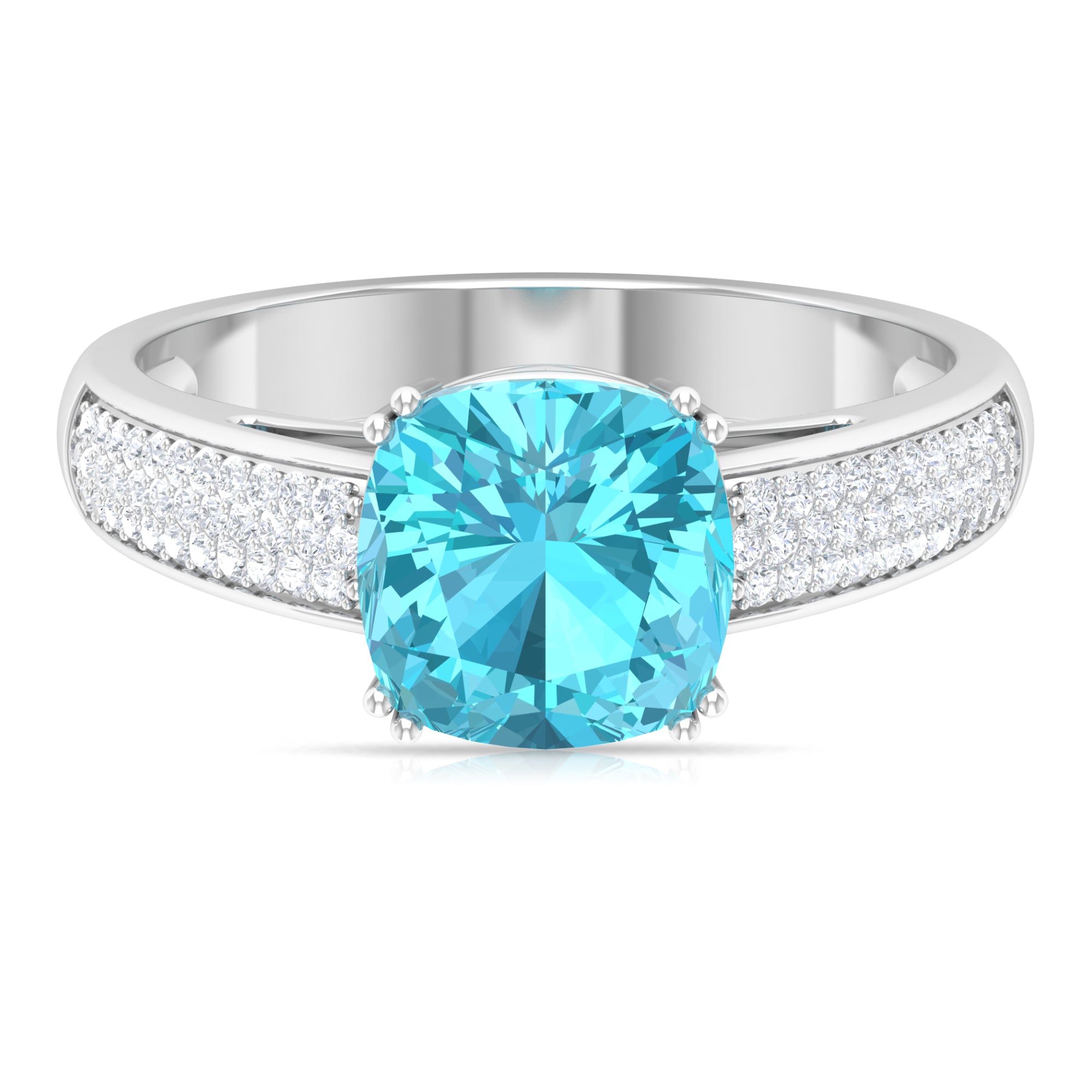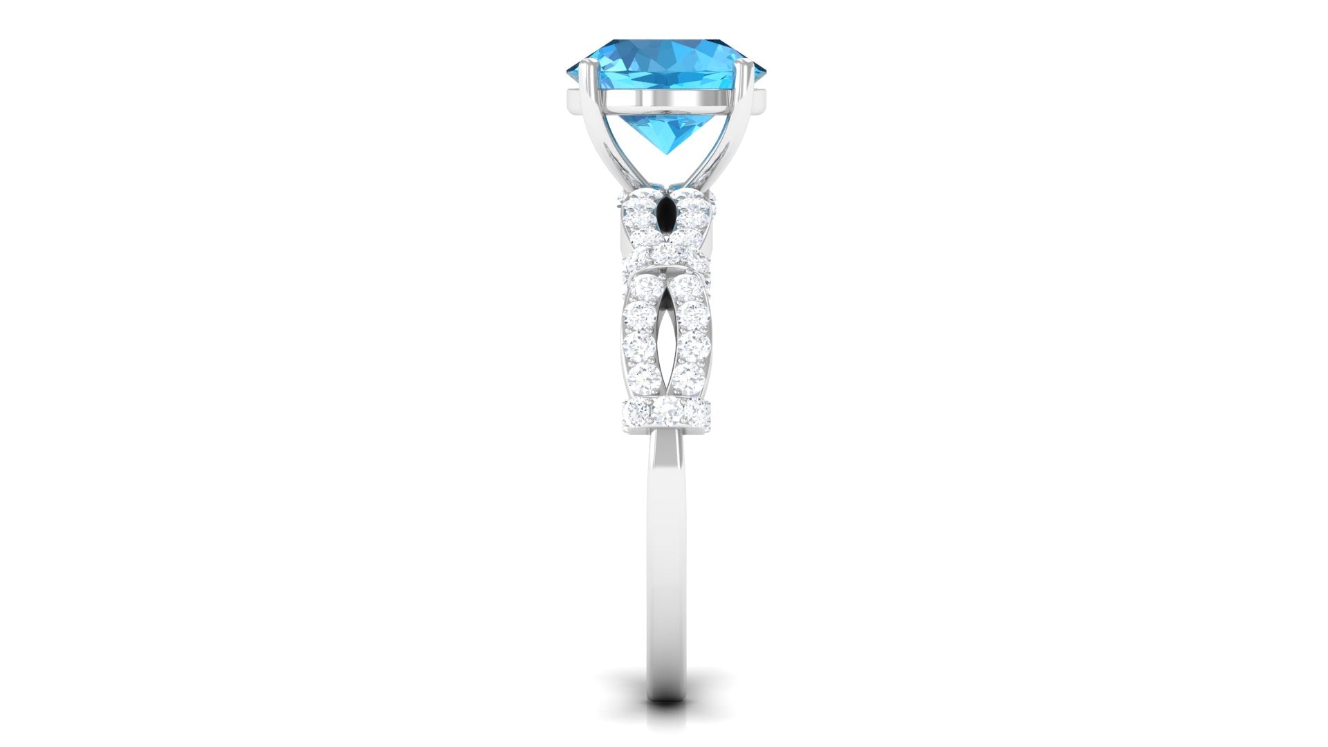 The center-stone of Swiss Blue Topaz here is sparkled up with the encircling of Diamond/Moissanite (that we fondly term ‘Halo’). That makes the Swiss Blue Topaz appear even brighter while highlighting its beauty at its best. Surprisingly, it also gives off the illusion of a bigger Topaz. So, if a Swiss Blue Topaz and Diamond Ring is on your list, this style might turn out to be your best bet.