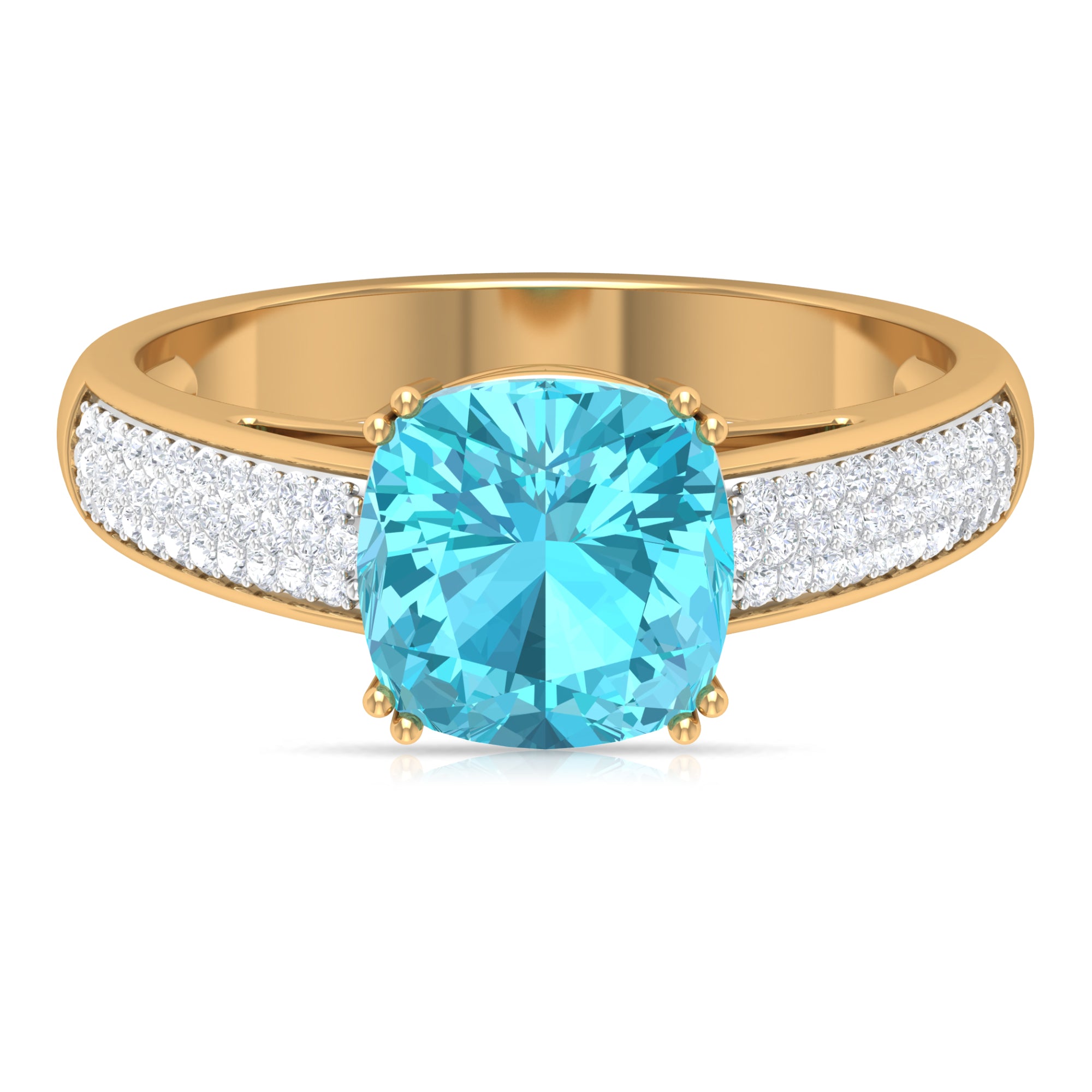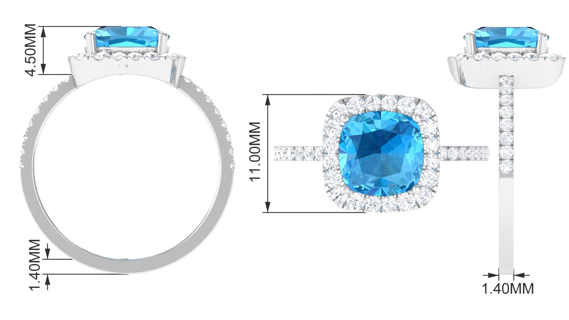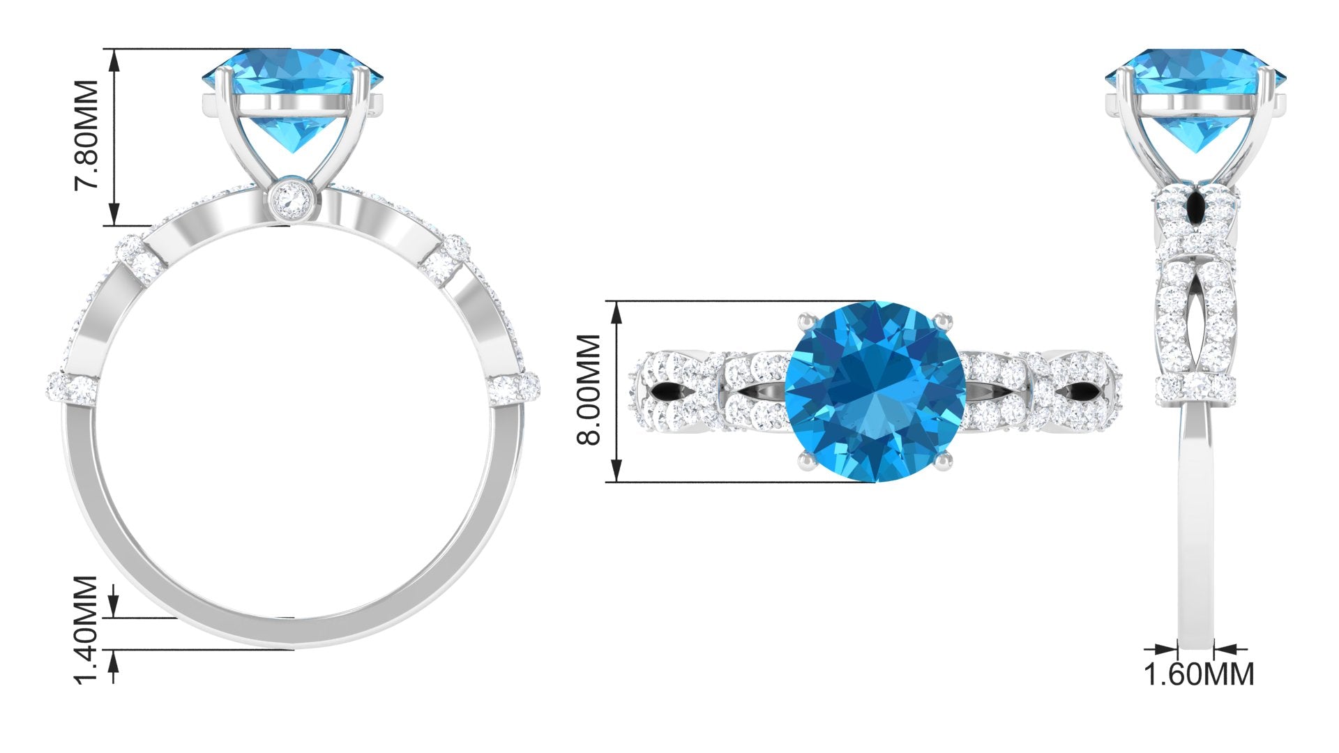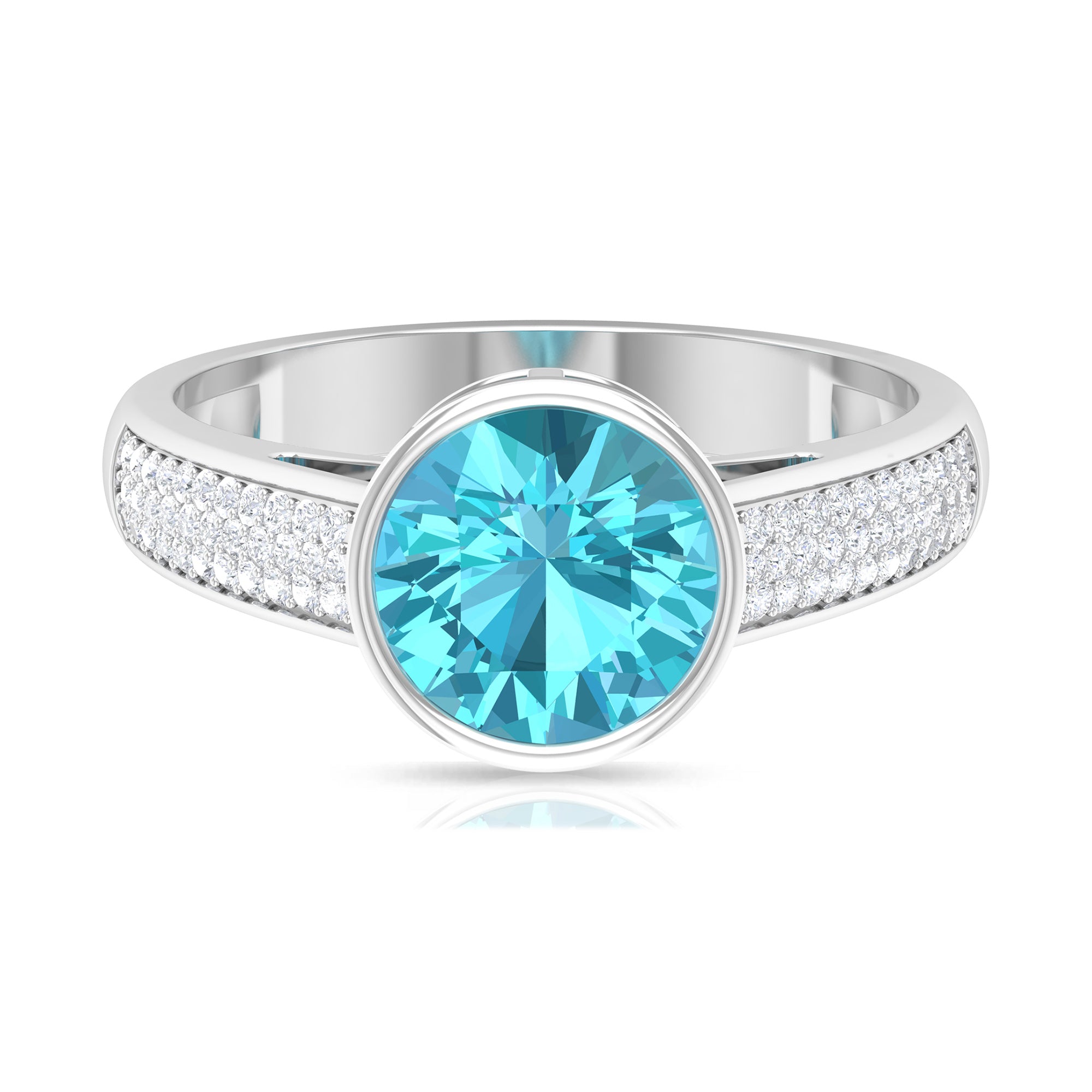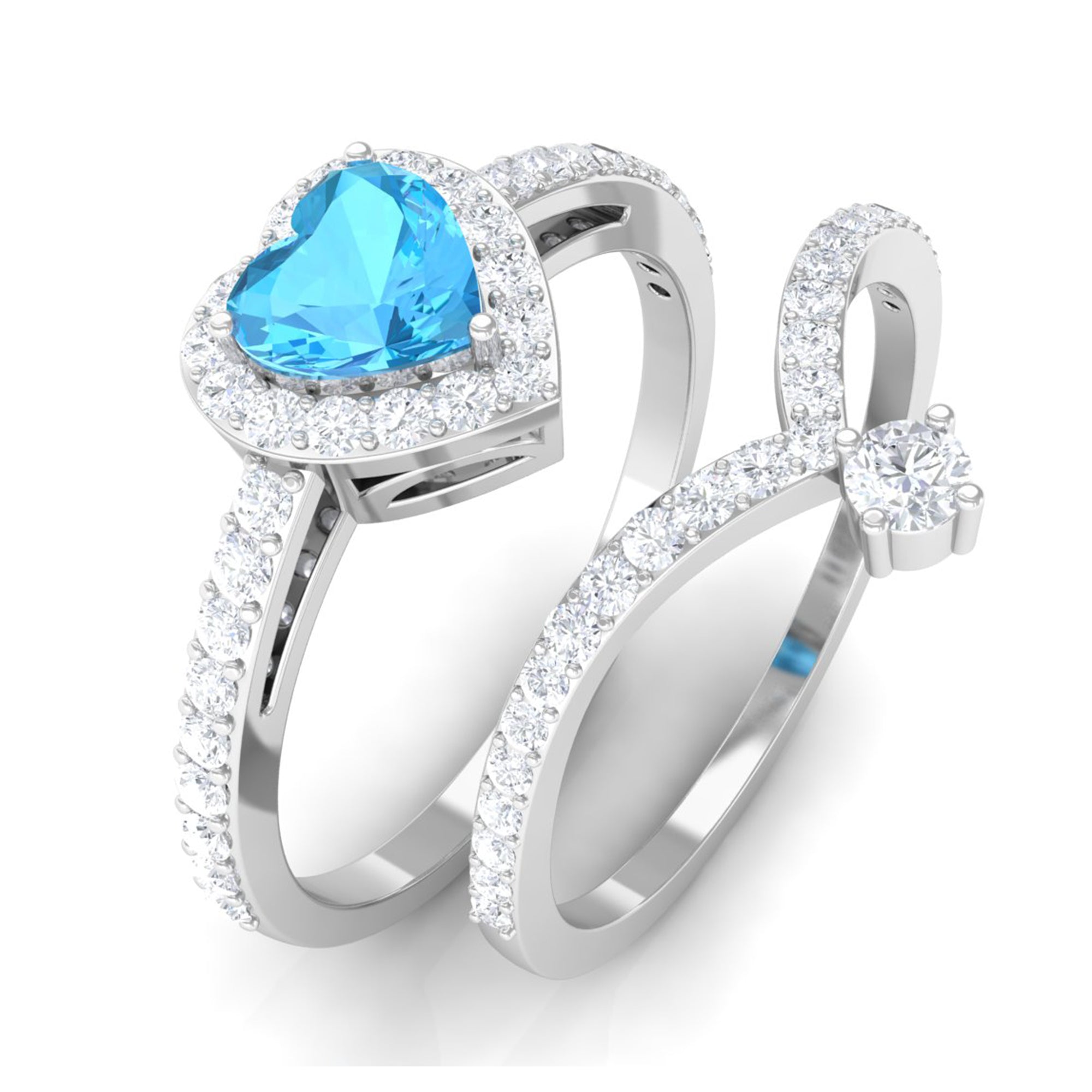 The center-stone of Swiss Blue Topaz here is sparkled up with the encircling of Diamond/Moissanite (that we fondly term ‘Halo’). That makes the Swiss Blue Topaz appear even brighter while highlighting its beauty at its best. Surprisingly, it also gives off the illusion of a bigger Topaz. So, if a Swiss Blue Topaz and Diamond Ring is on your list, this style might turn out to be your best bet.