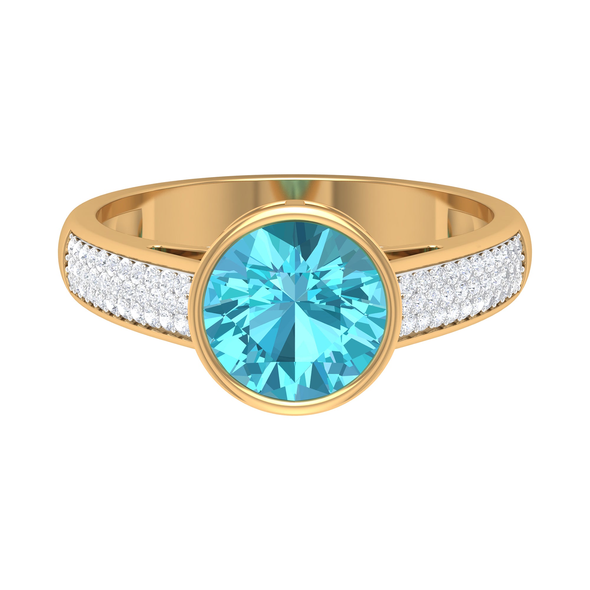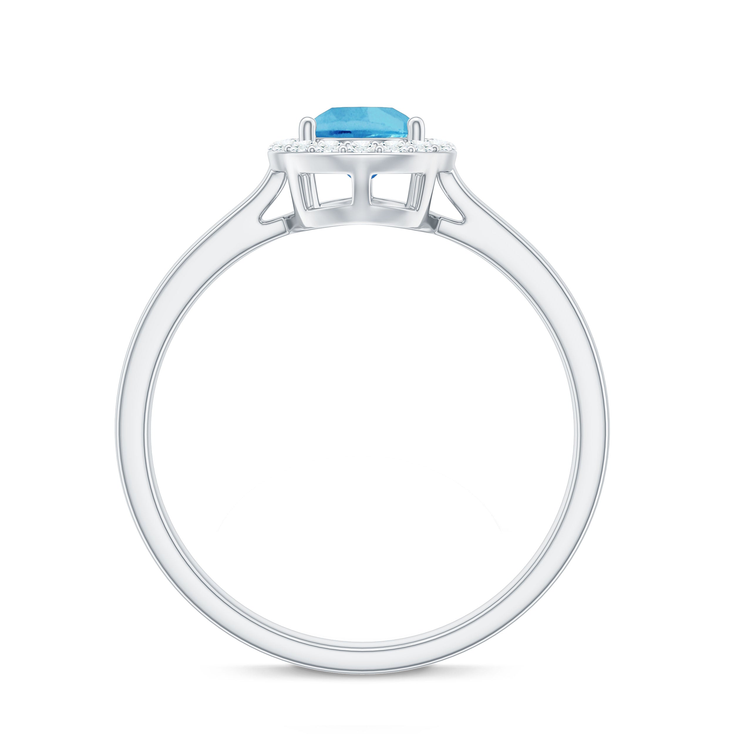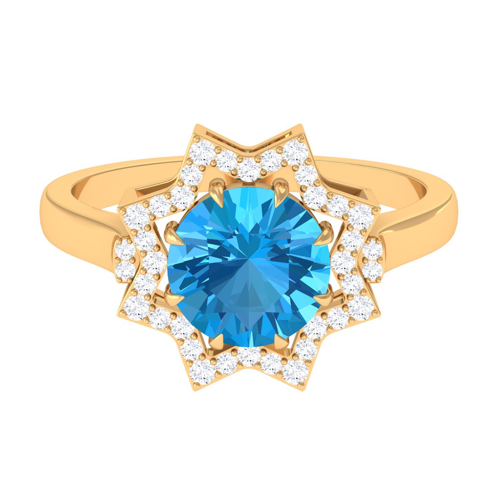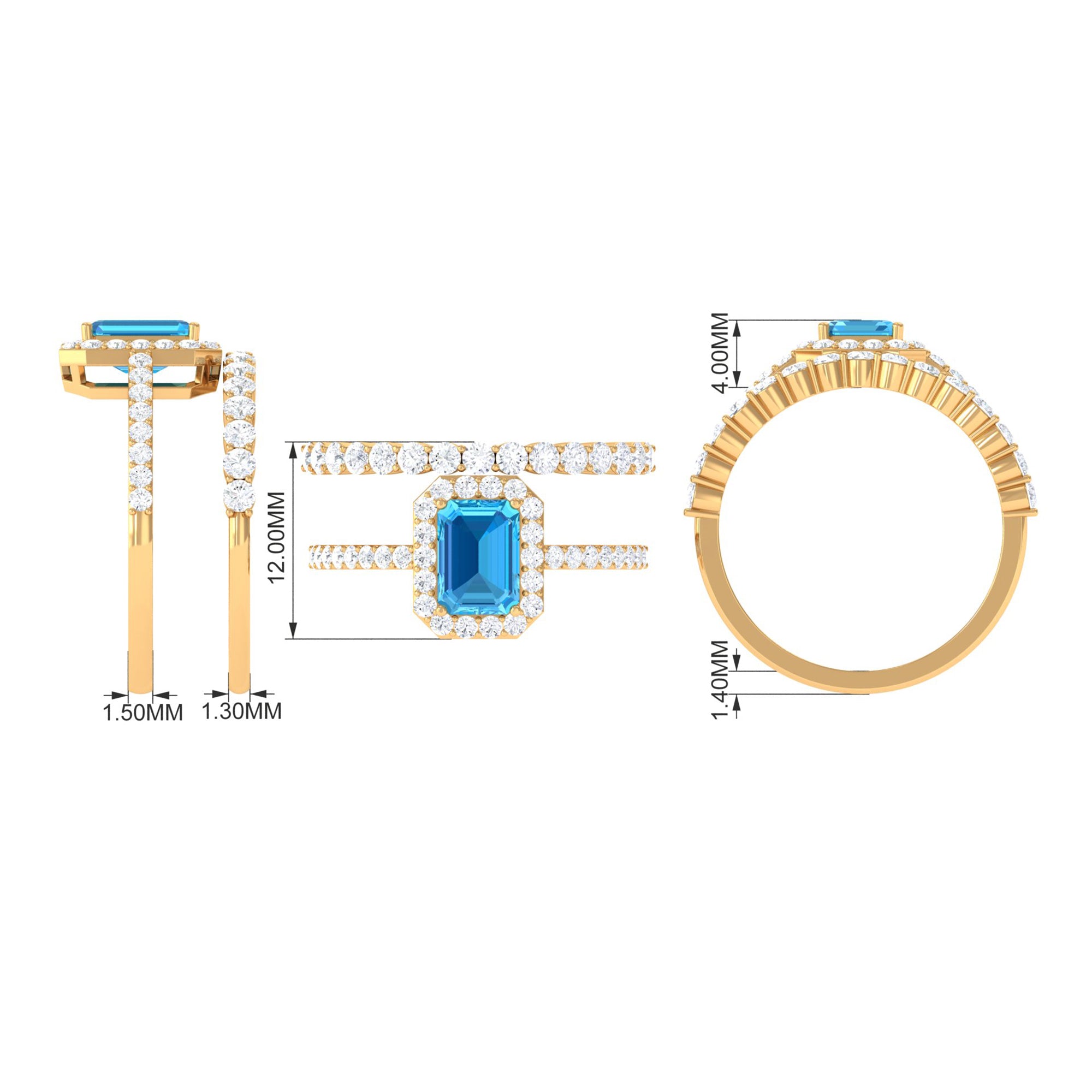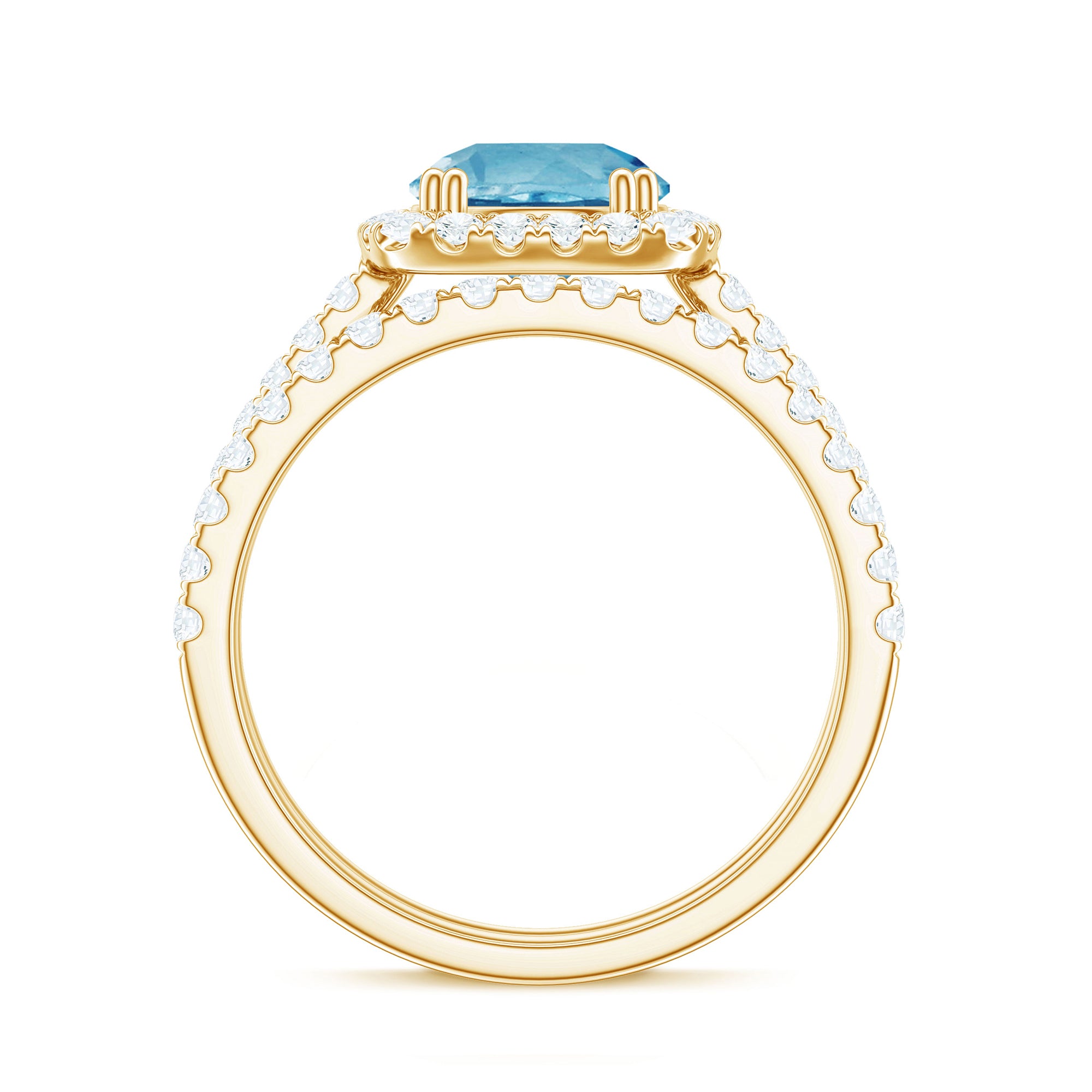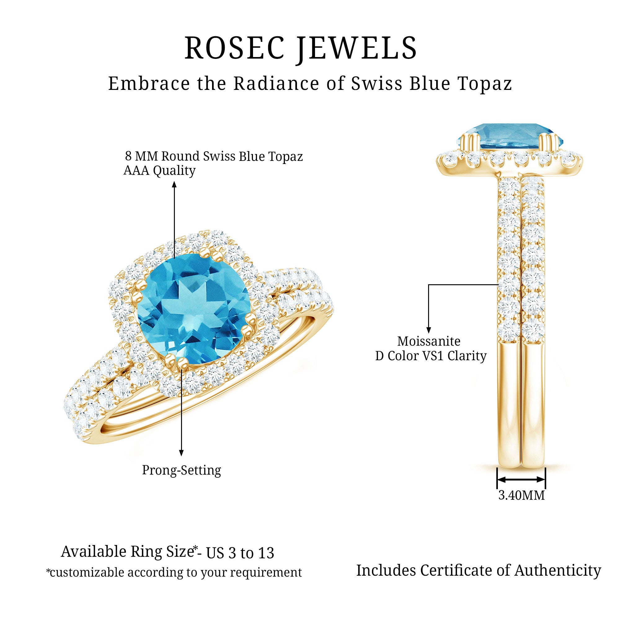 The center-stone of Swiss Blue Topaz here is sparkled up with the encircling of Diamond/Moissanite (that we fondly term ‘Halo’). That makes the Swiss Blue Topaz appear even brighter while highlighting its beauty at its best. Surprisingly, it also gives off the illusion of a bigger Topaz. So, if a Swiss Blue Topaz and Diamond Ring is on your list, this style might turn out to be your best bet.