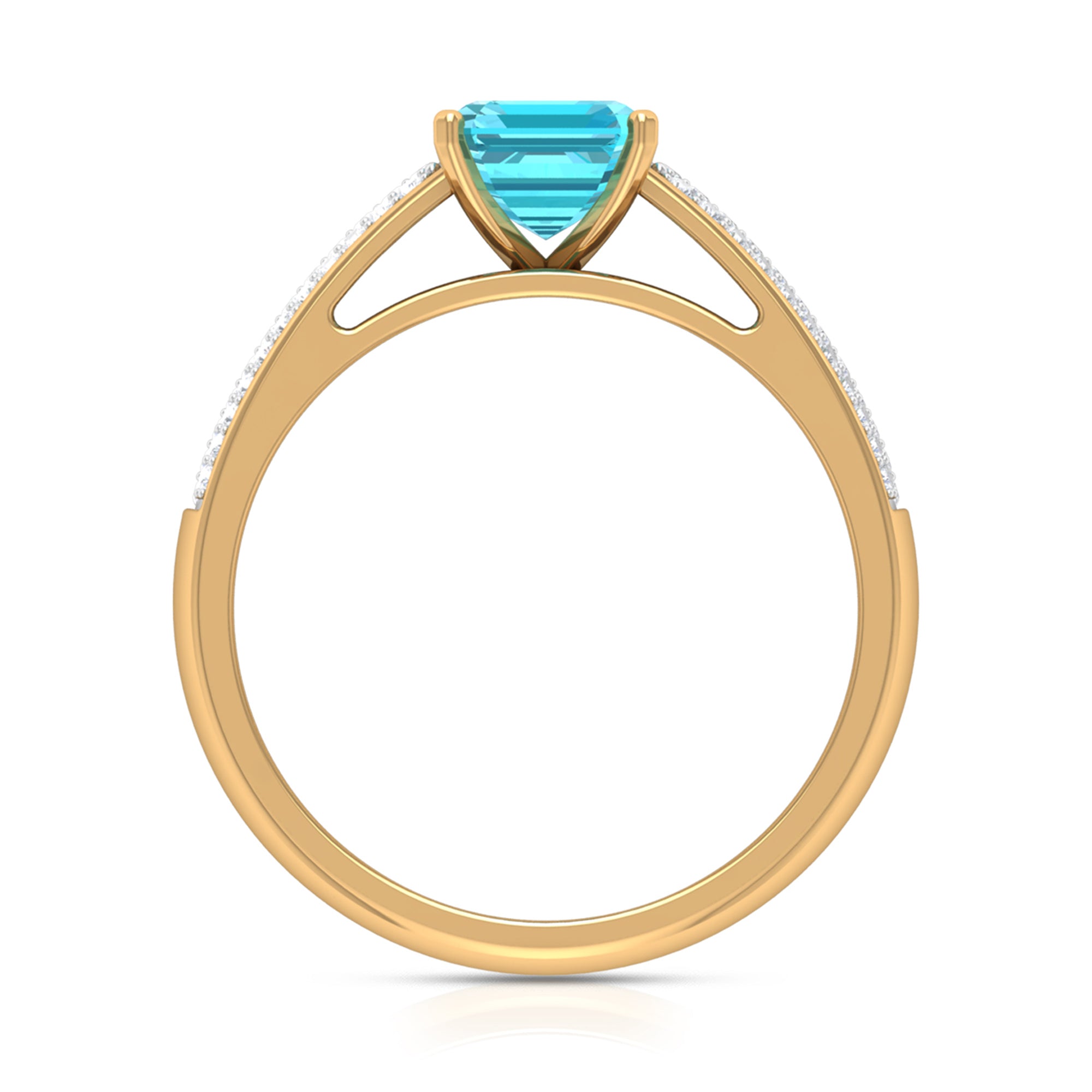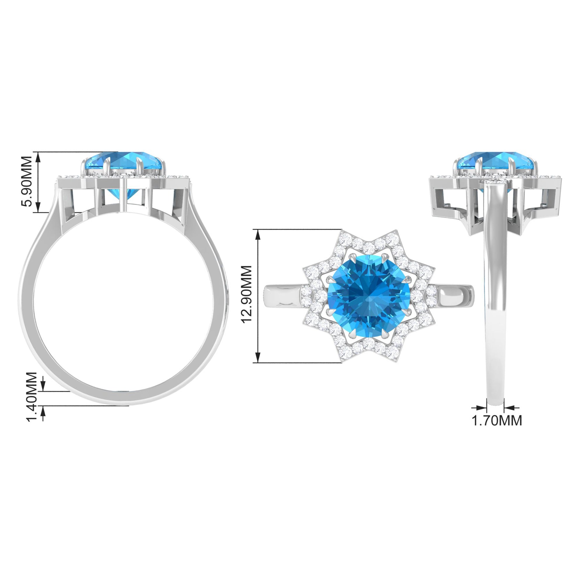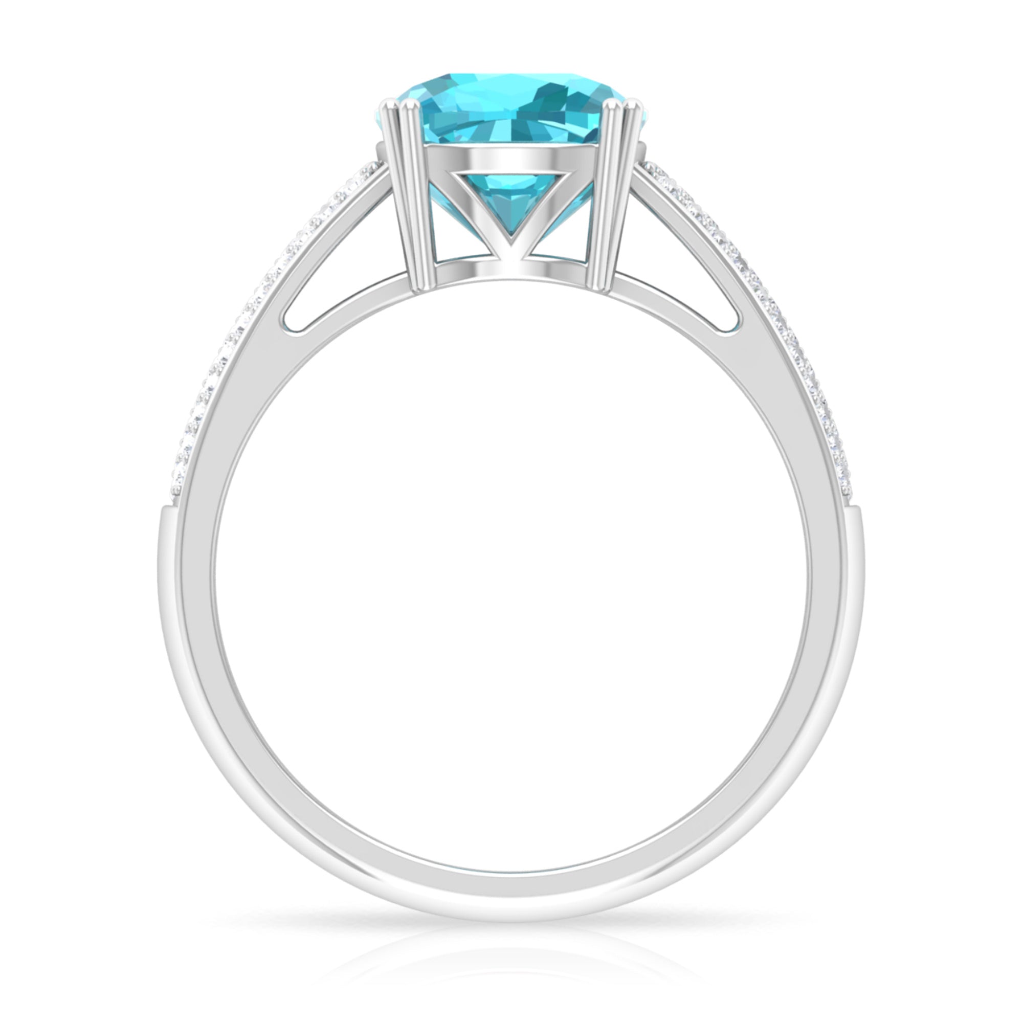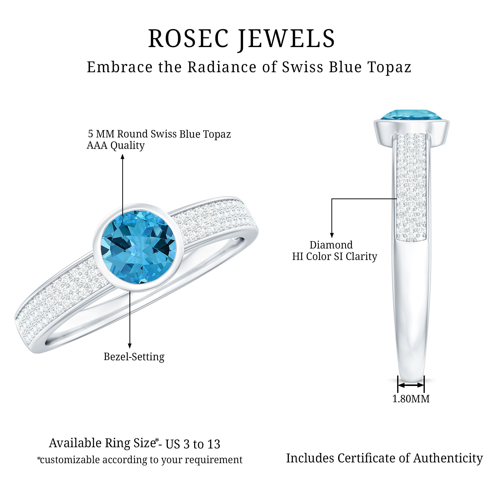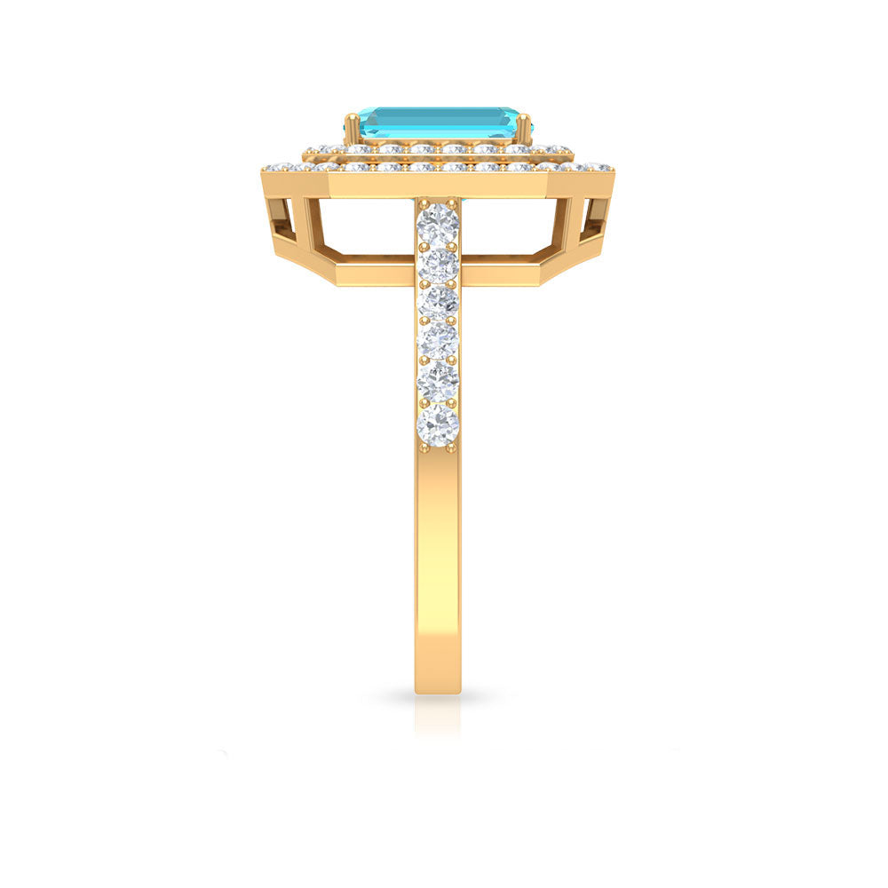 The center-stone of Swiss Blue Topaz here is sparkled up with the encircling of Diamond/Moissanite (that we fondly term ‘Halo’). That makes the Swiss Blue Topaz appear even brighter while highlighting its beauty at its best. Surprisingly, it also gives off the illusion of a bigger Topaz. So, if a Swiss Blue Topaz and Diamond Ring is on your list, this style might turn out to be your best bet.