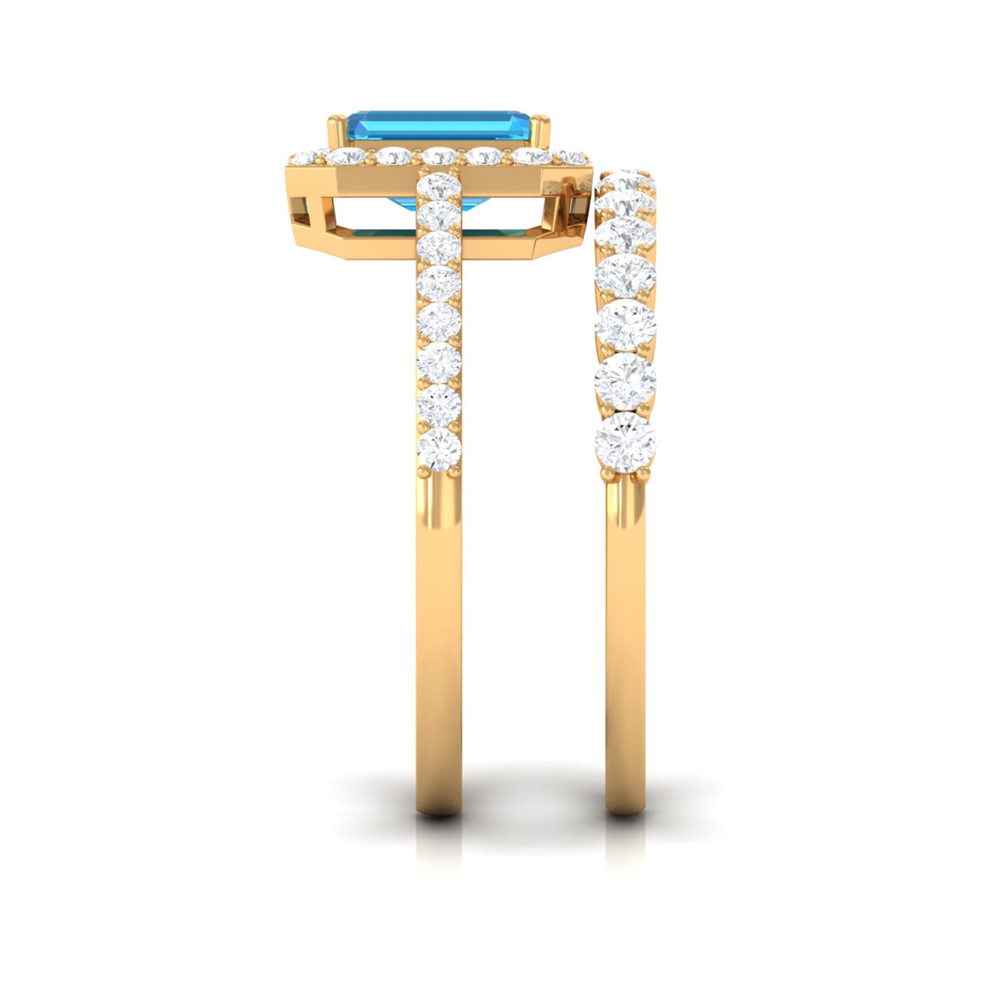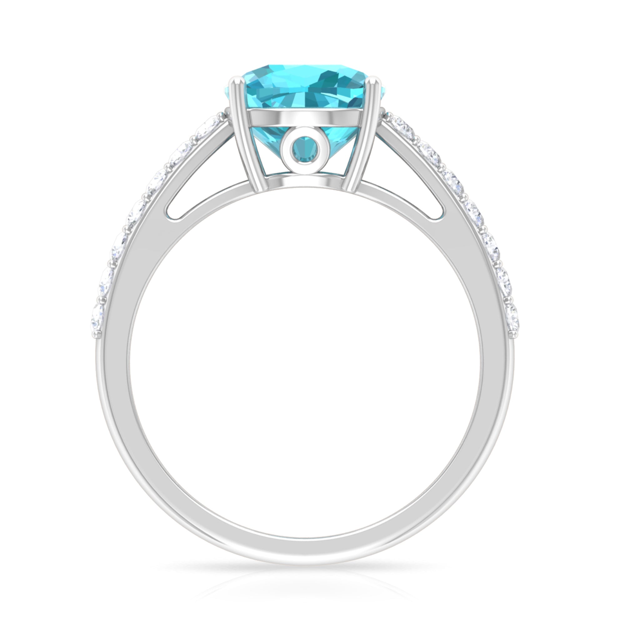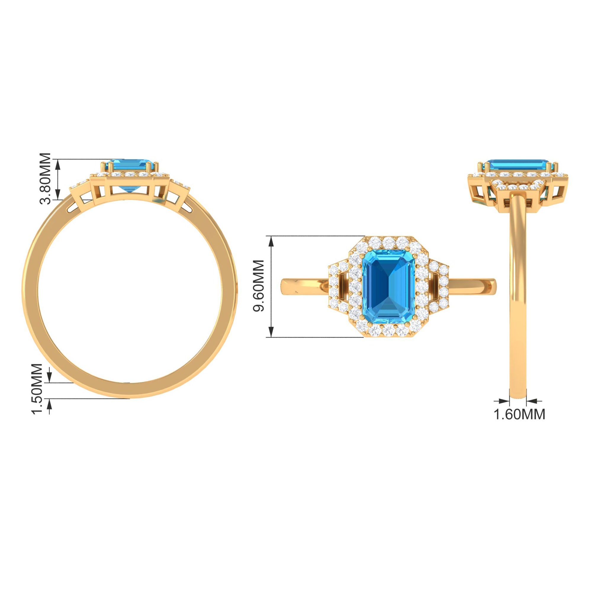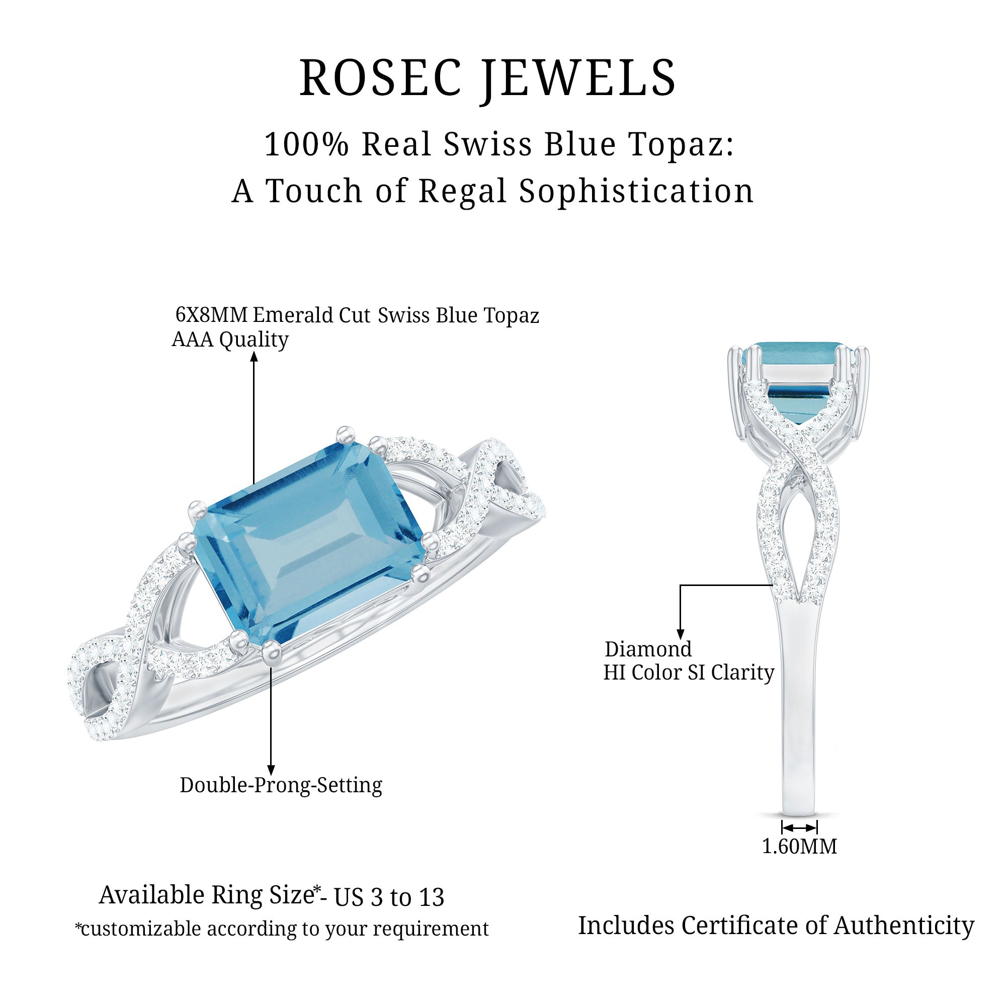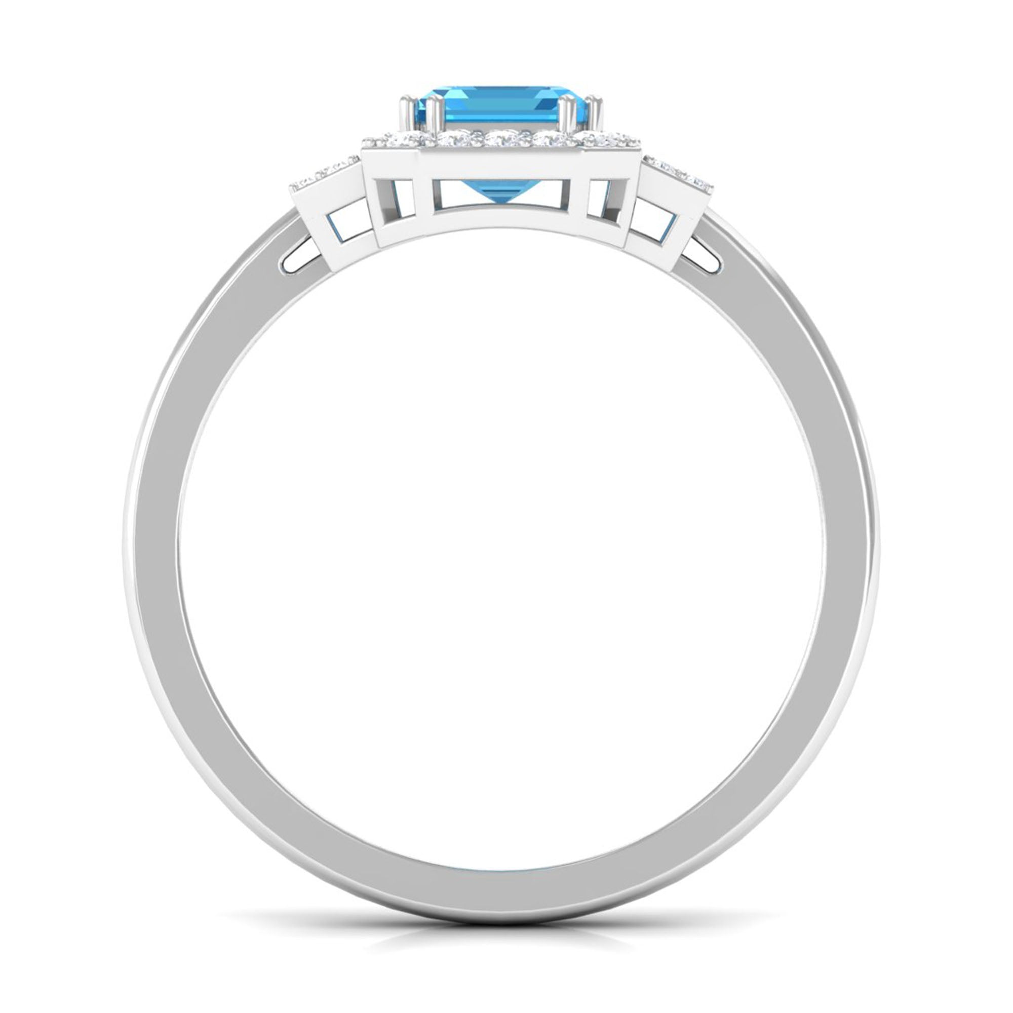 The center-stone of Swiss Blue Topaz here is sparkled up with the encircling of Diamond/Moissanite (that we fondly term ‘Halo’). That makes the Swiss Blue Topaz appear even brighter while highlighting its beauty at its best. Surprisingly, it also gives off the illusion of a bigger Topaz. So, if a Swiss Blue Topaz and Diamond Ring is on your list, this style might turn out to be your best bet.