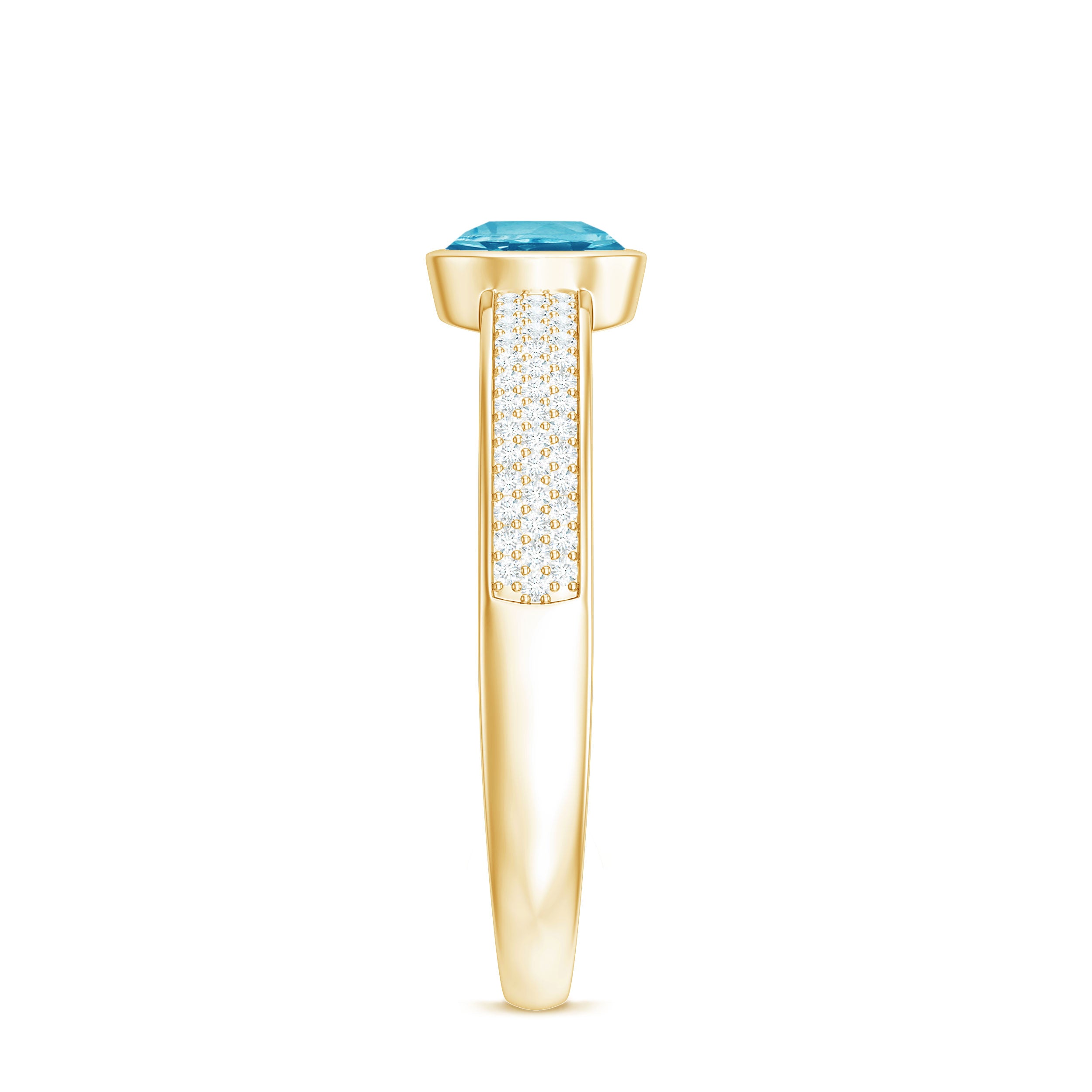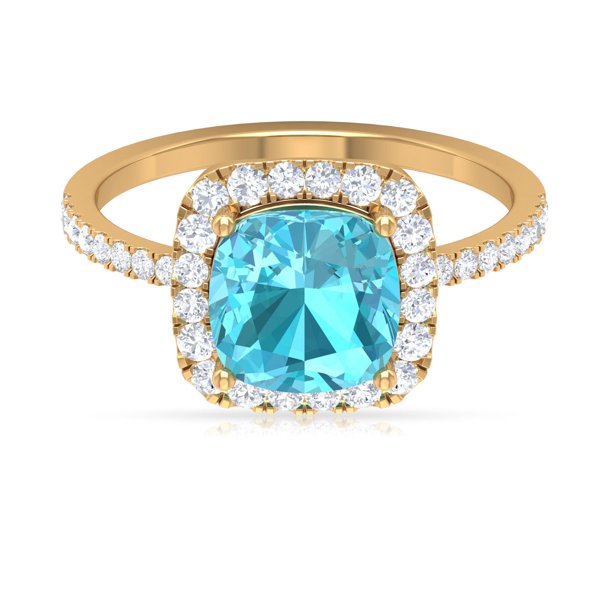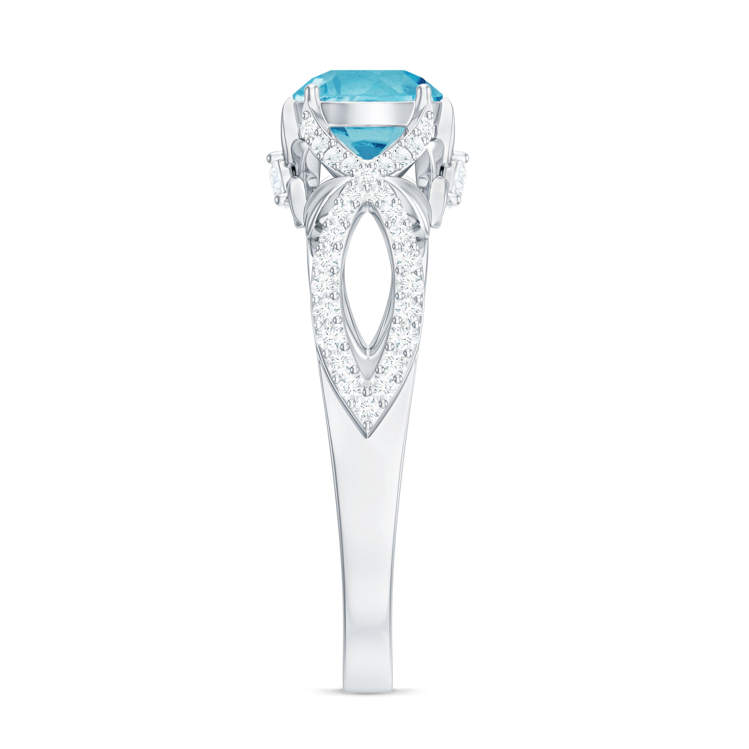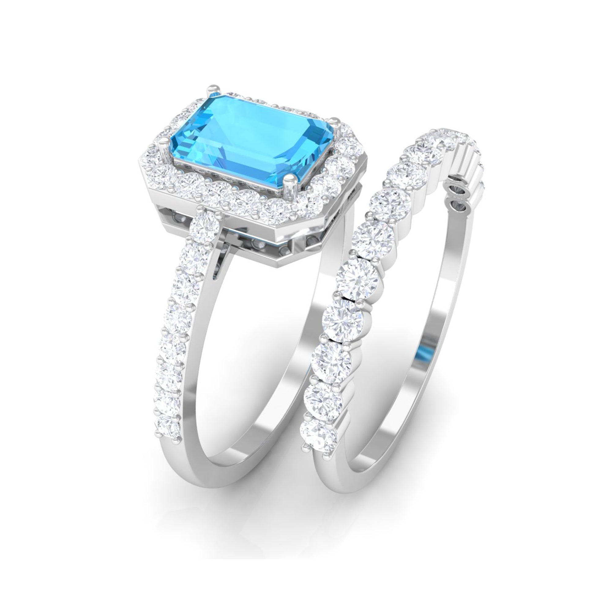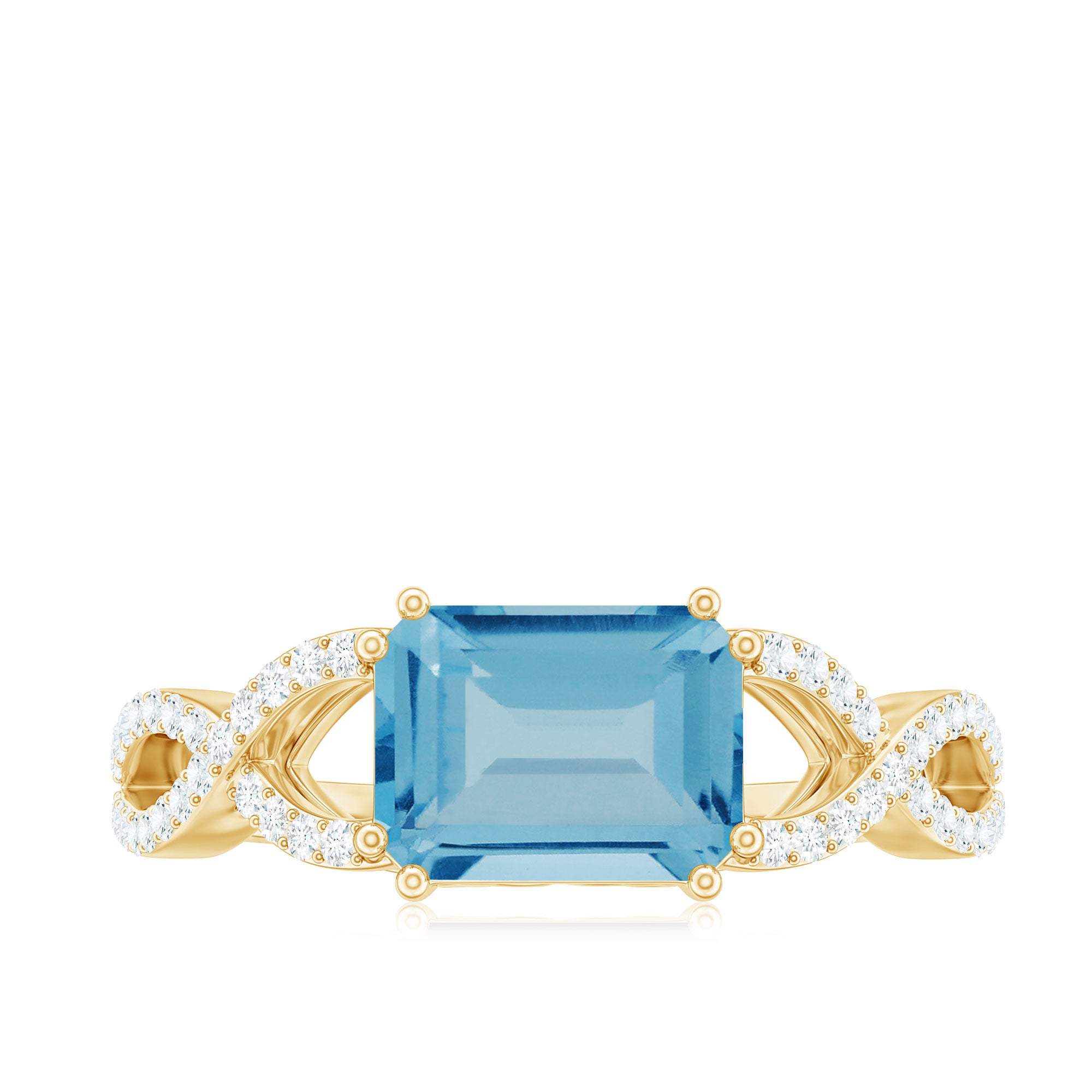 The center-stone of Swiss Blue Topaz here is sparkled up with the encircling of Diamond/Moissanite (that we fondly term ‘Halo’). That makes the Swiss Blue Topaz appear even brighter while highlighting its beauty at its best. Surprisingly, it also gives off the illusion of a bigger Topaz. So, if a Swiss Blue Topaz and Diamond Ring is on your list, this style might turn out to be your best bet.