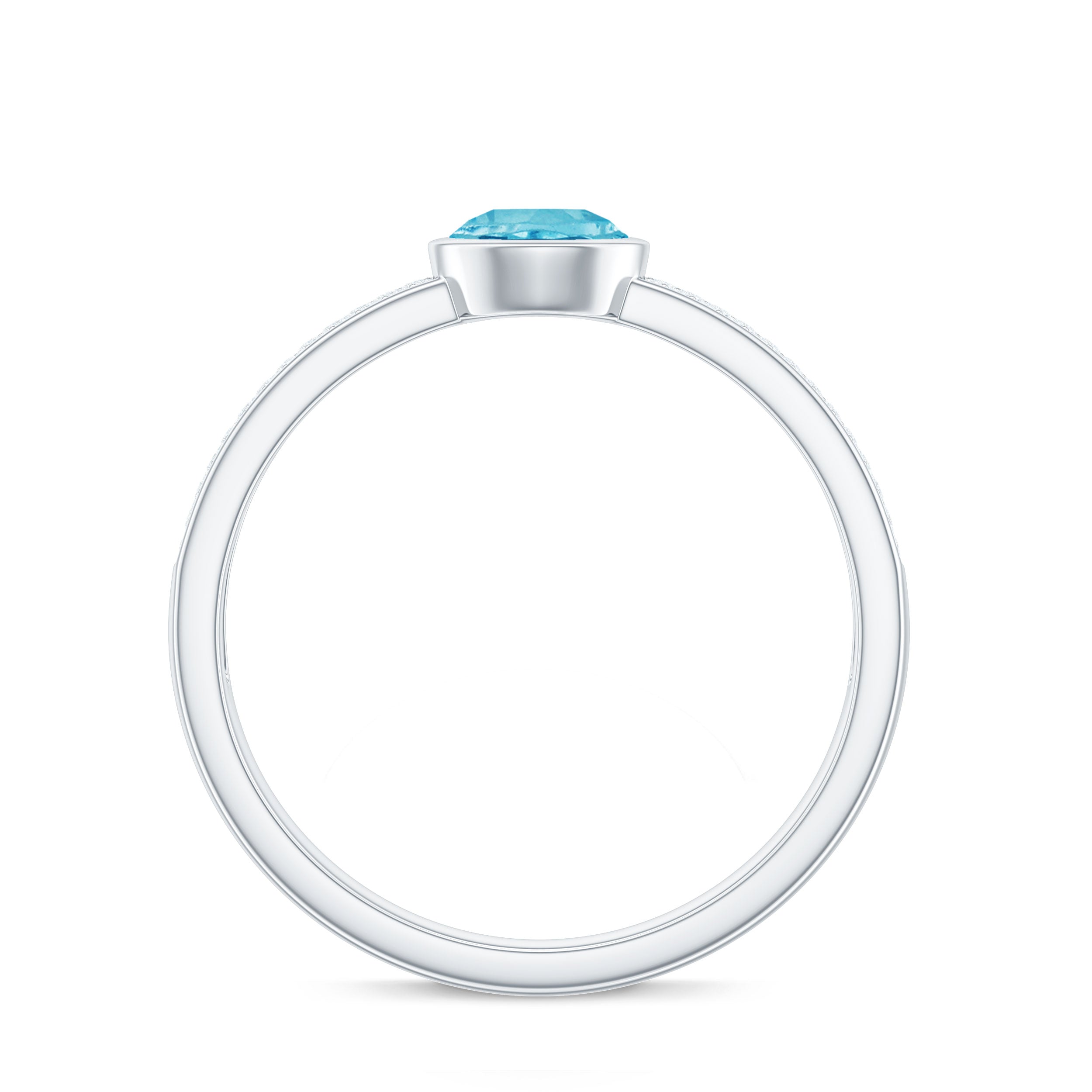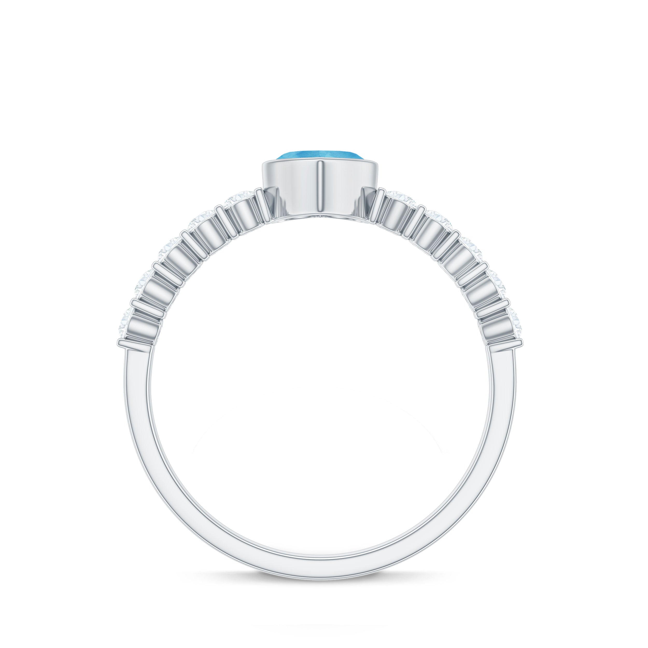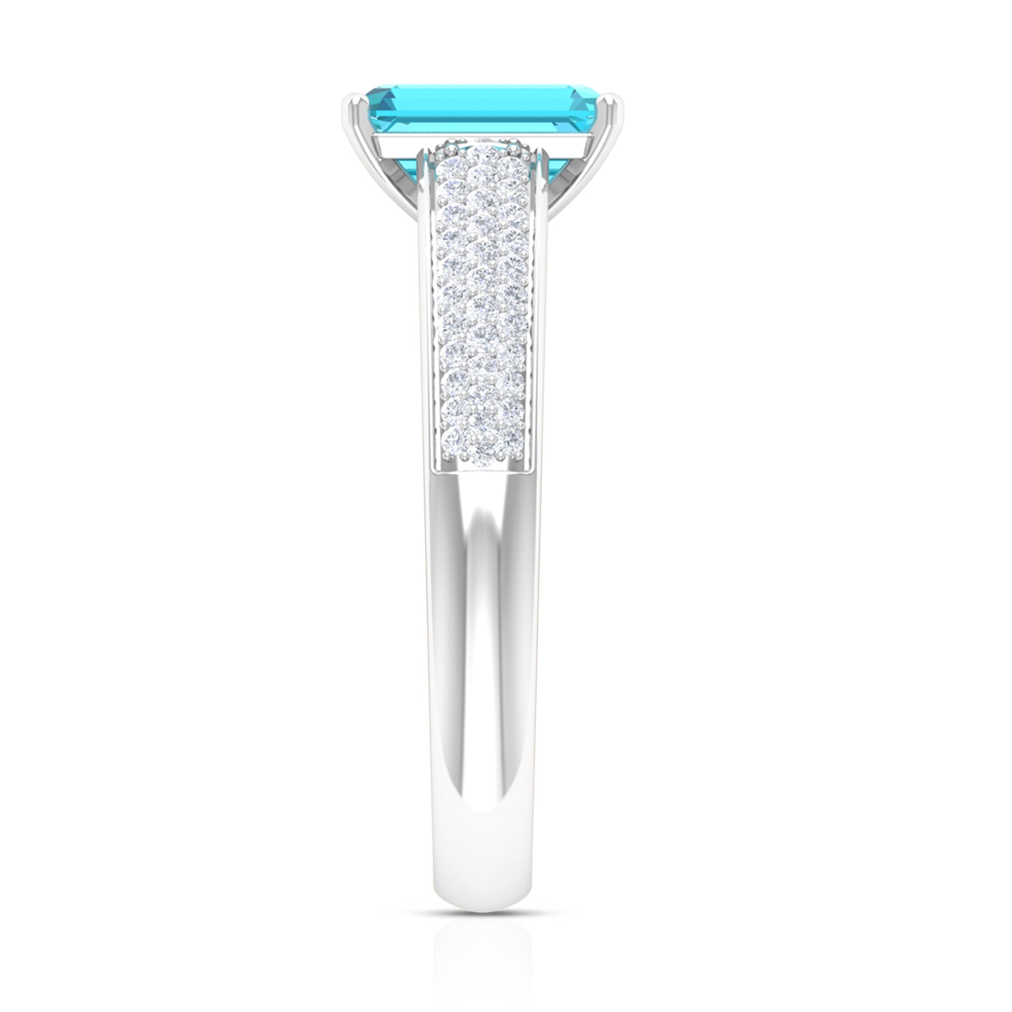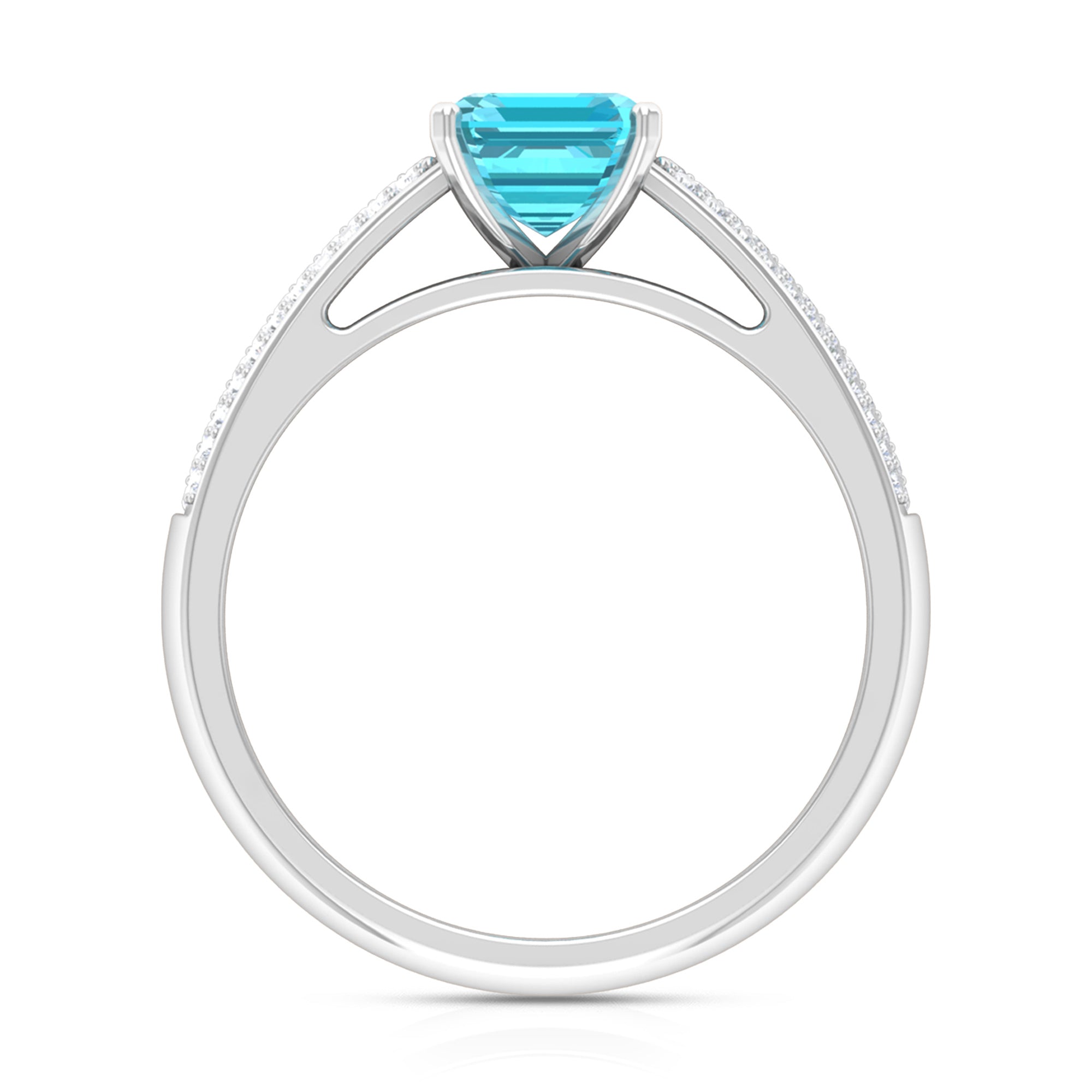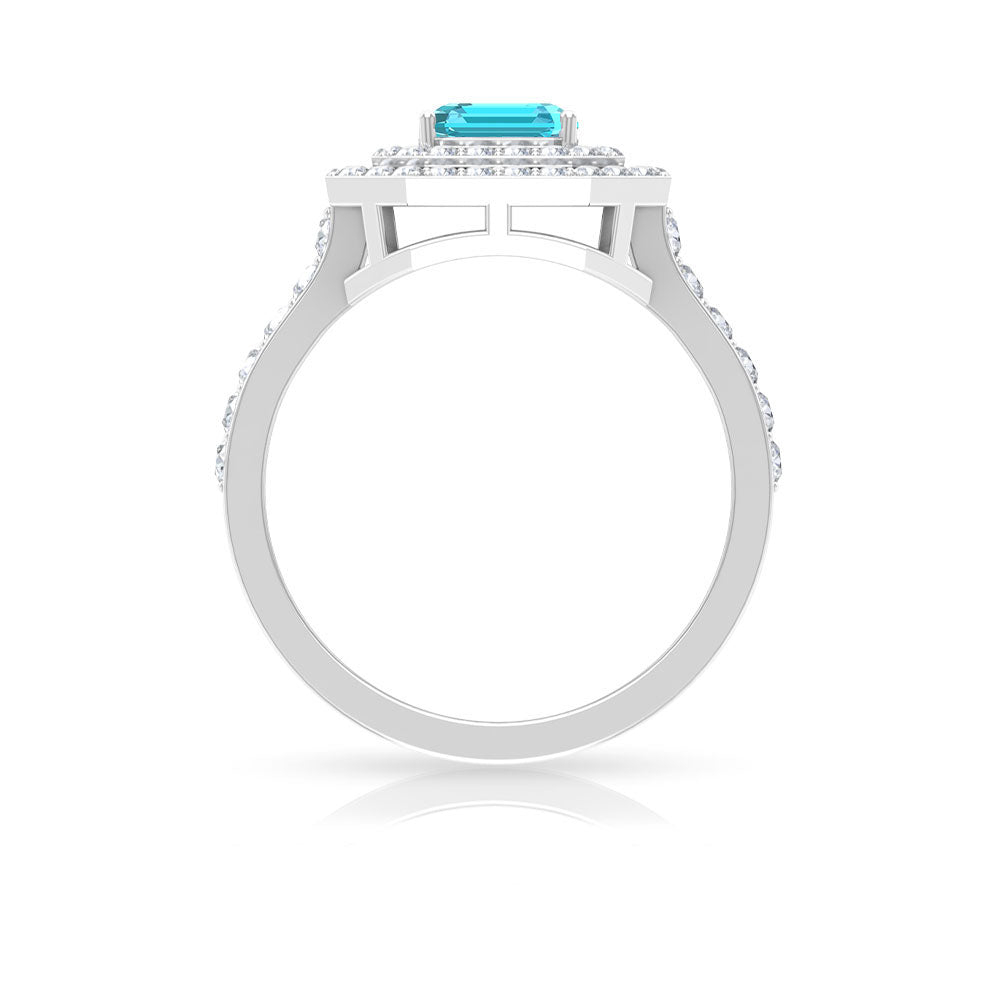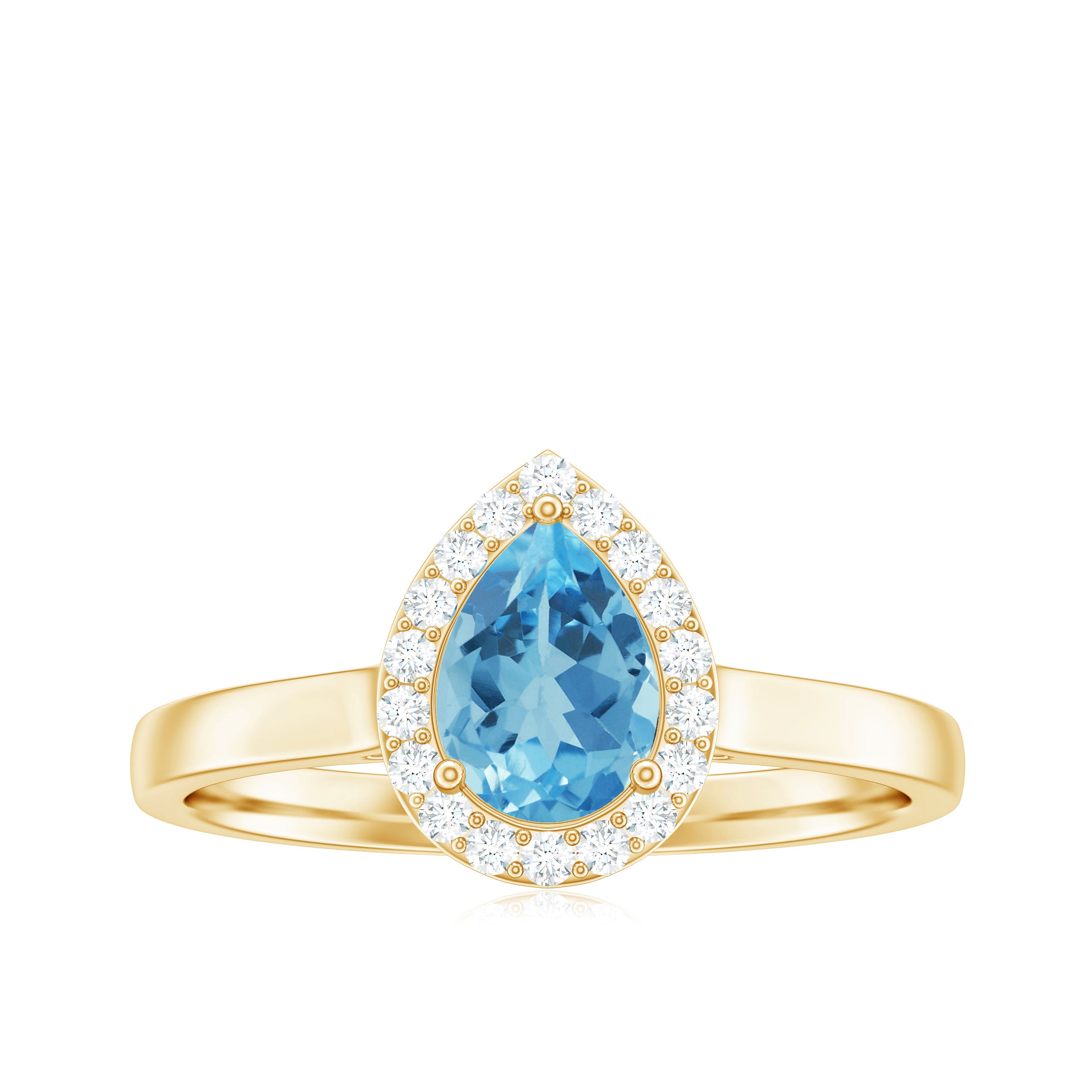 The center-stone of Swiss Blue Topaz here is sparkled up with the encircling of Diamond/Moissanite (that we fondly term ‘Halo’). That makes the Swiss Blue Topaz appear even brighter while highlighting its beauty at its best. Surprisingly, it also gives off the illusion of a bigger Topaz. So, if a Swiss Blue Topaz and Diamond Ring is on your list, this style might turn out to be your best bet.
