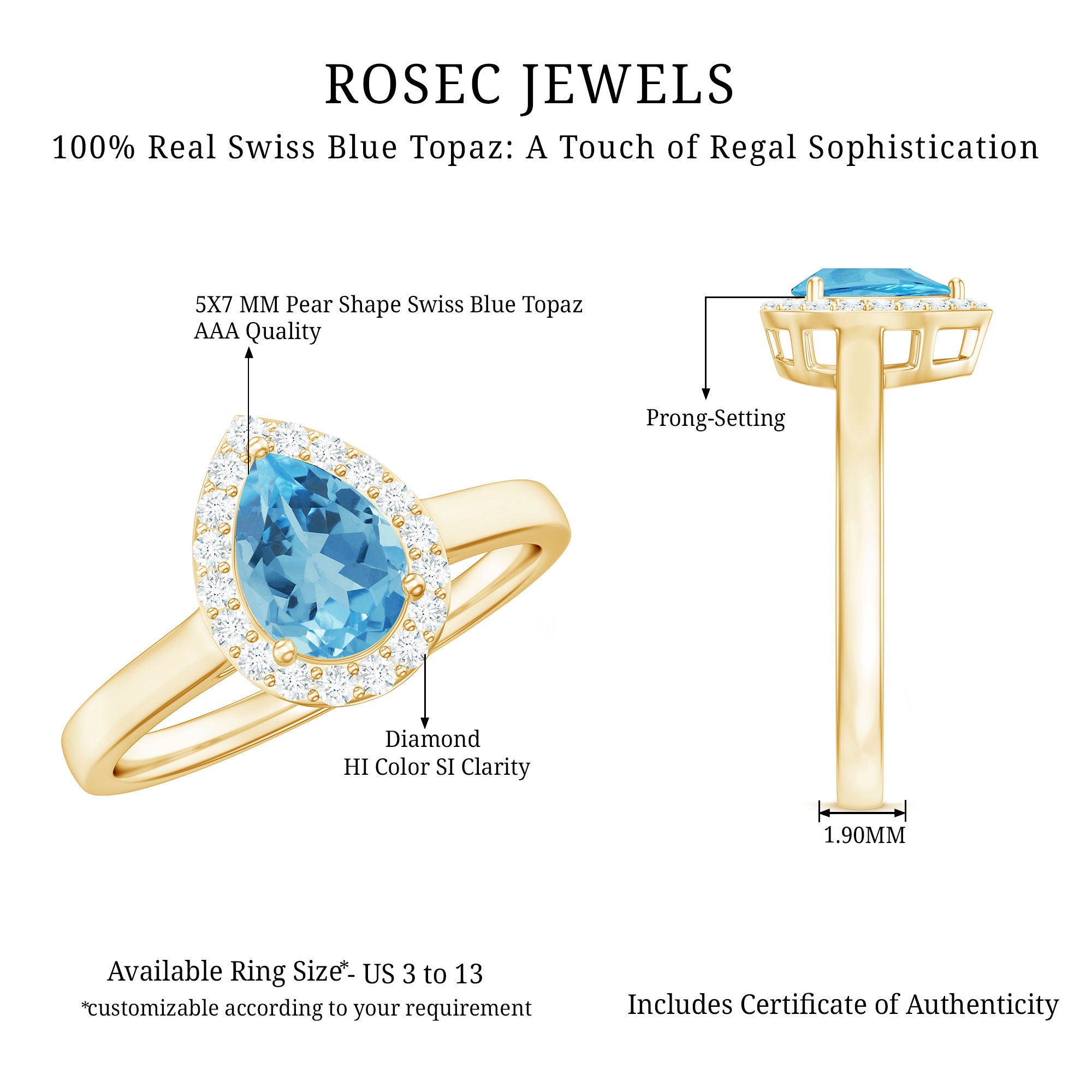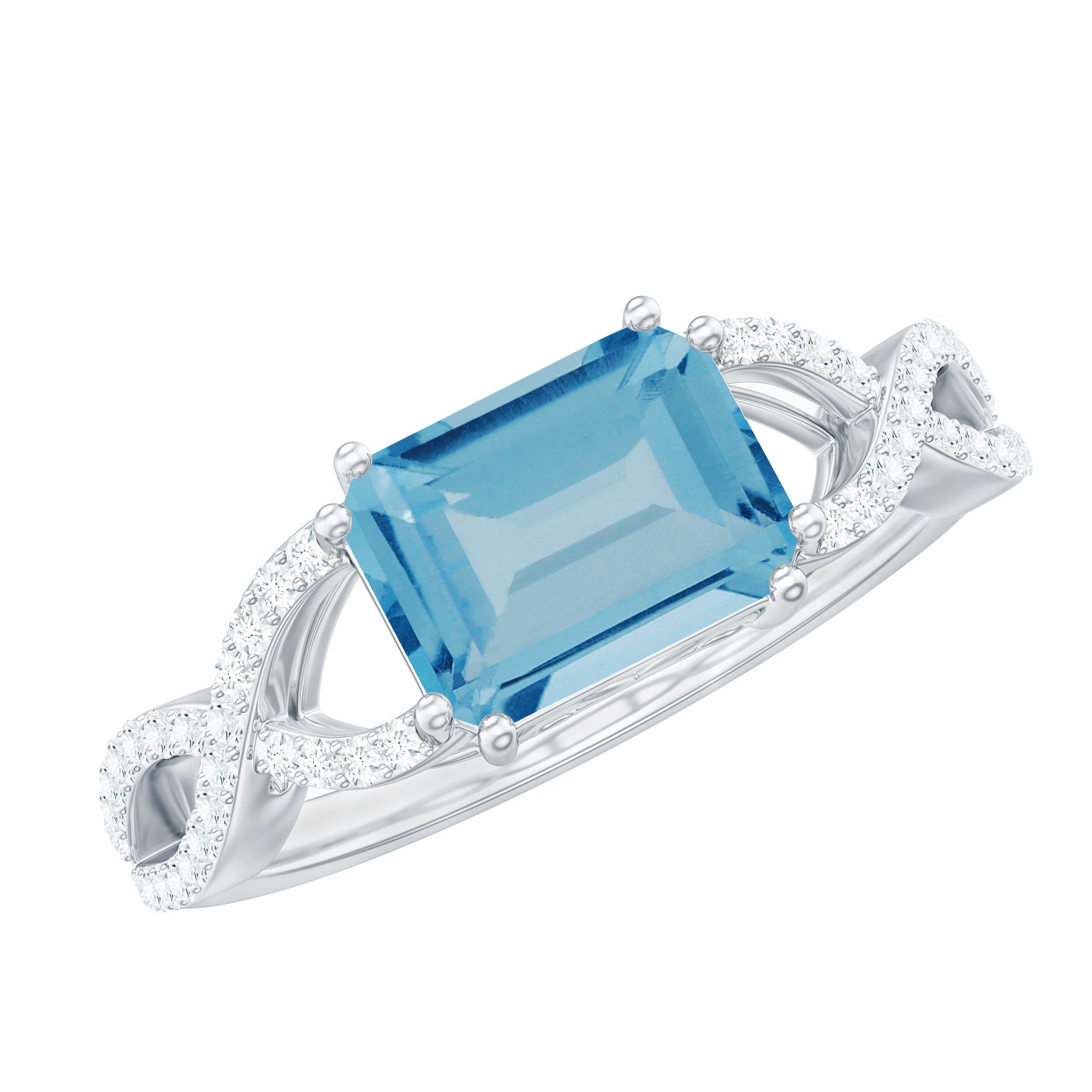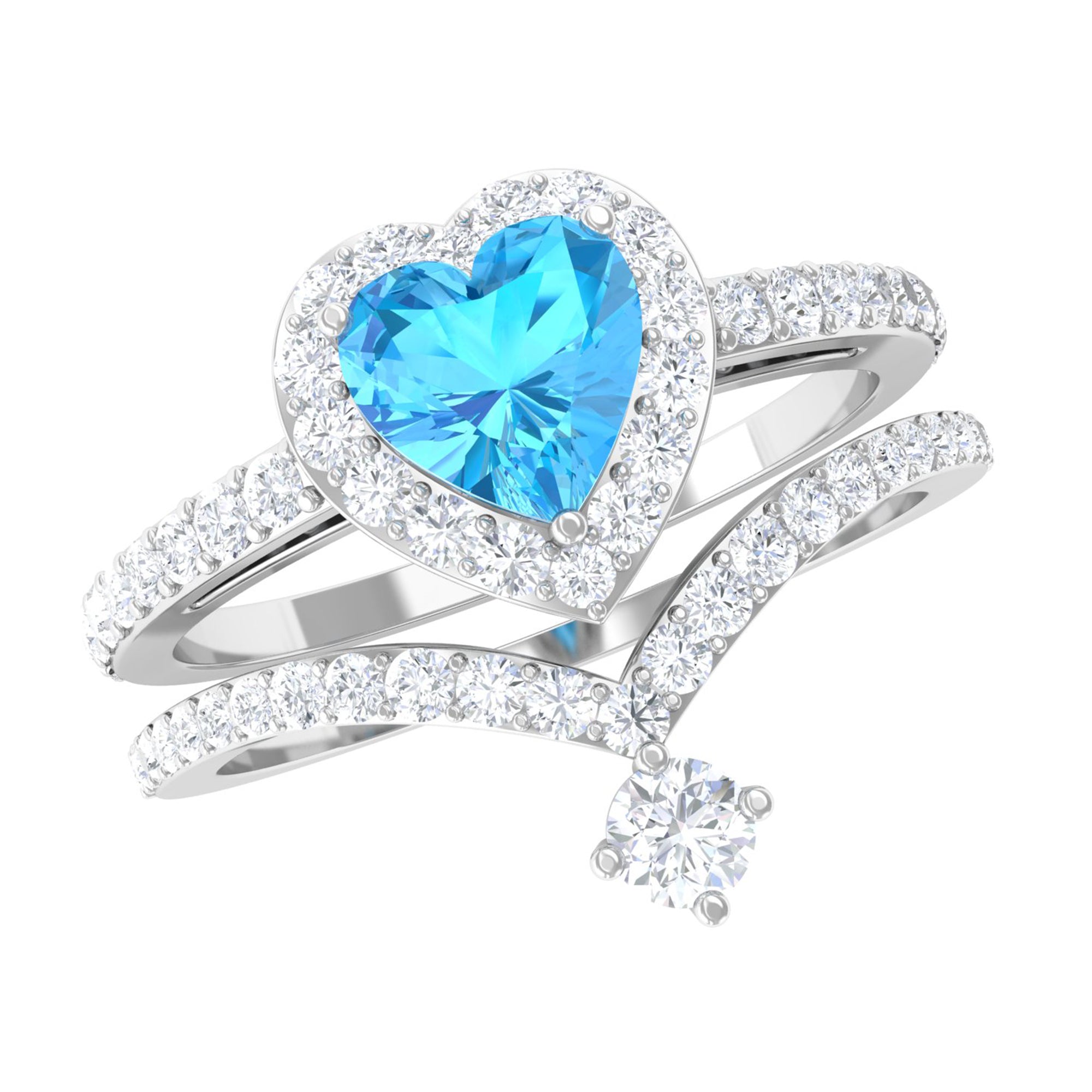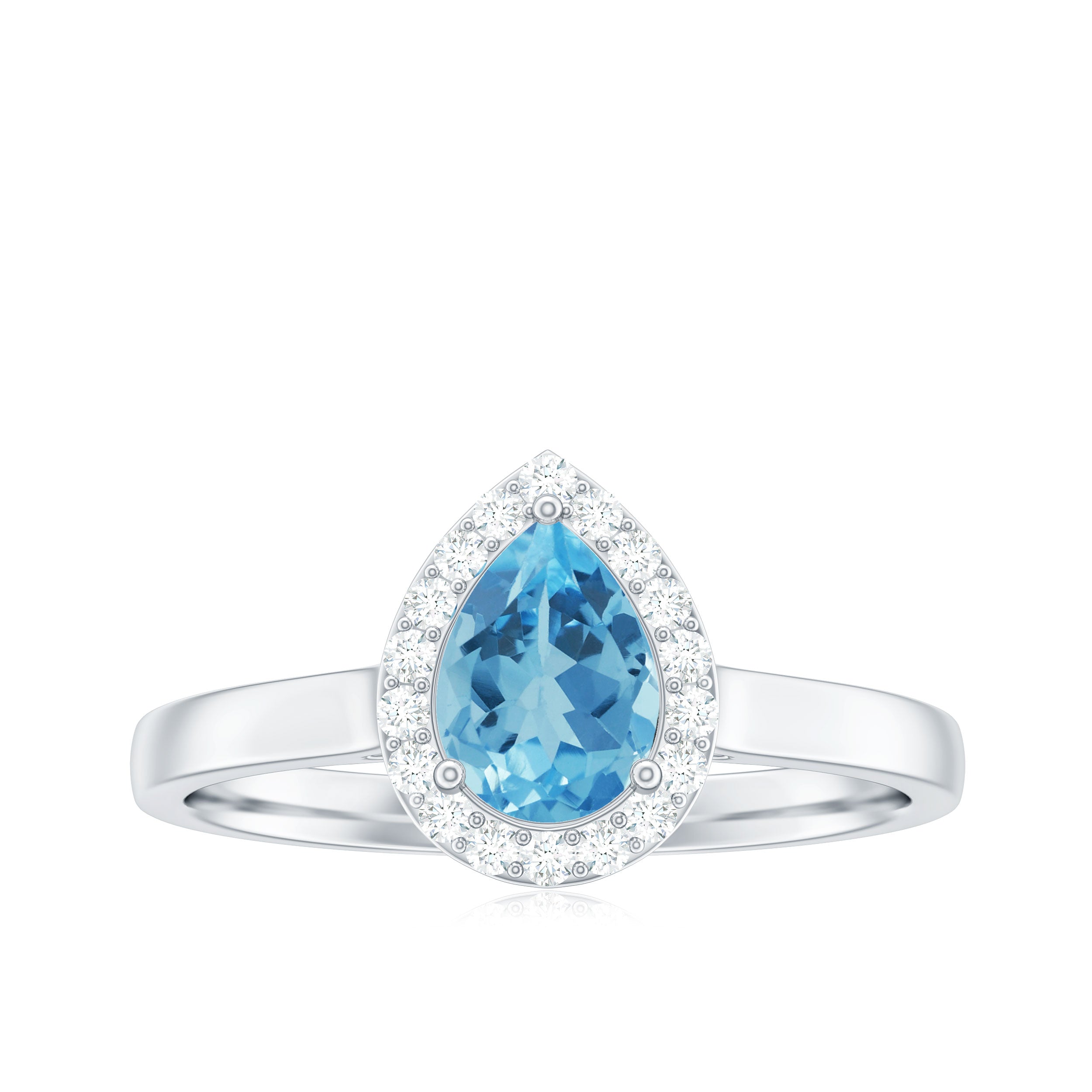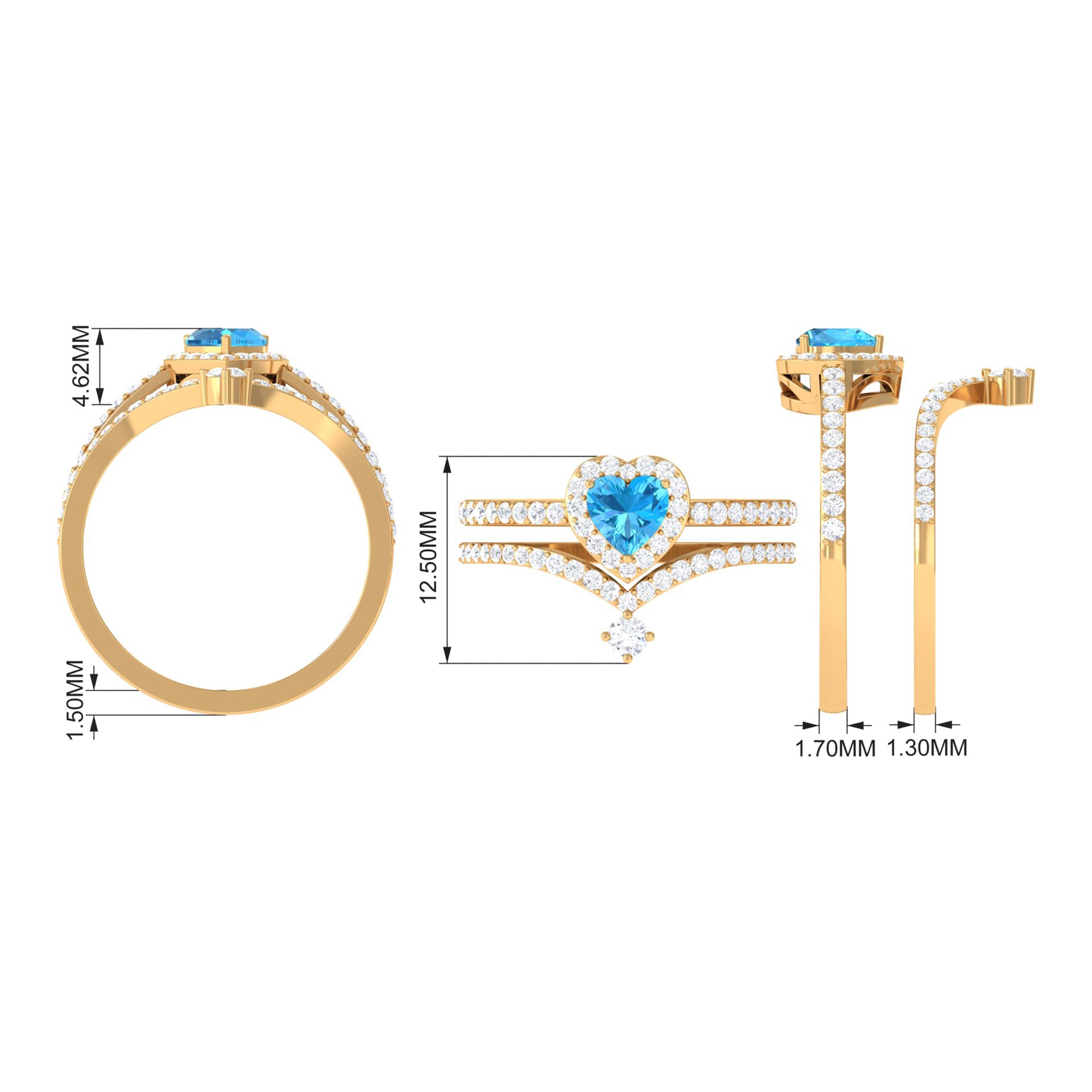 The center-stone of Swiss Blue Topaz here is sparkled up with the encircling of Diamond/Moissanite (that we fondly term ‘Halo’). That makes the Swiss Blue Topaz appear even brighter while highlighting its beauty at its best. Surprisingly, it also gives off the illusion of a bigger Topaz. So, if a Swiss Blue Topaz and Diamond Ring is on your list, this style might turn out to be your best bet.