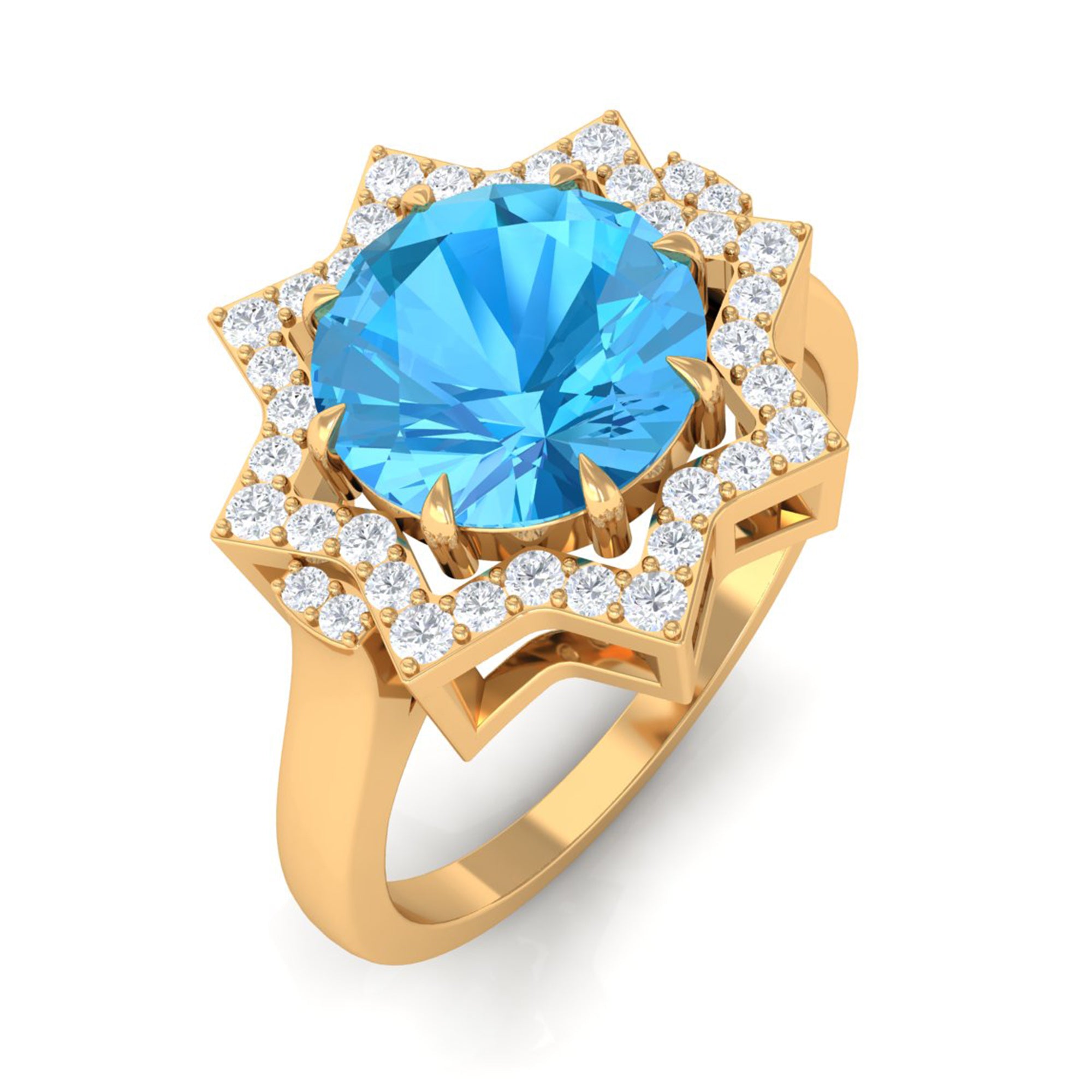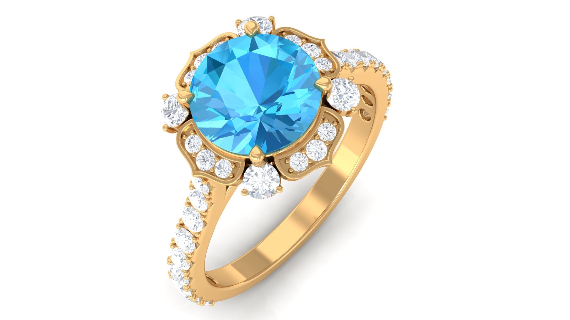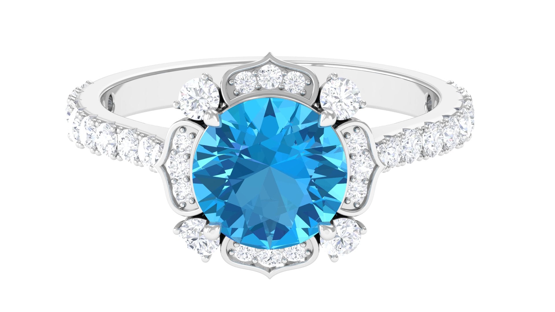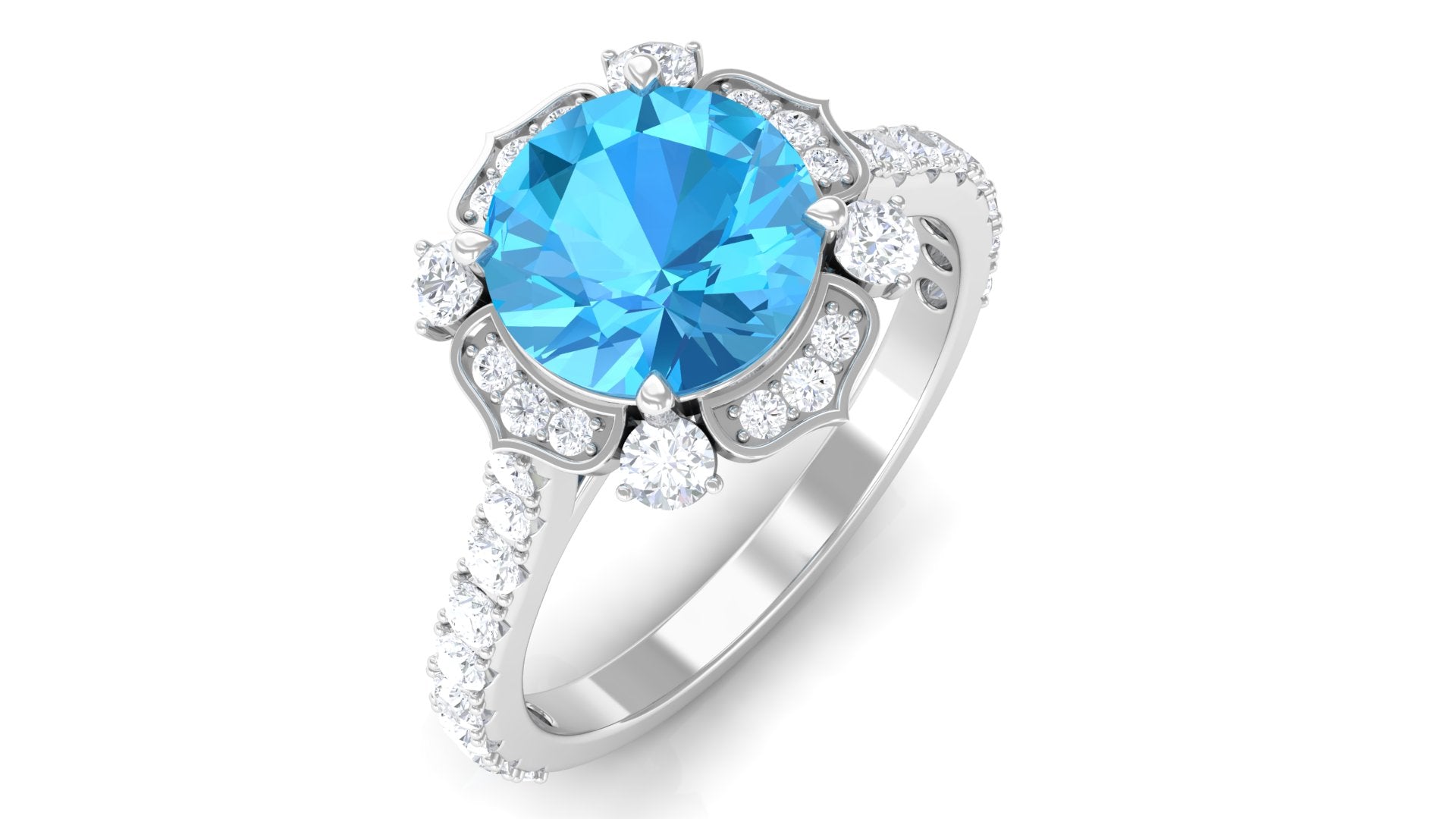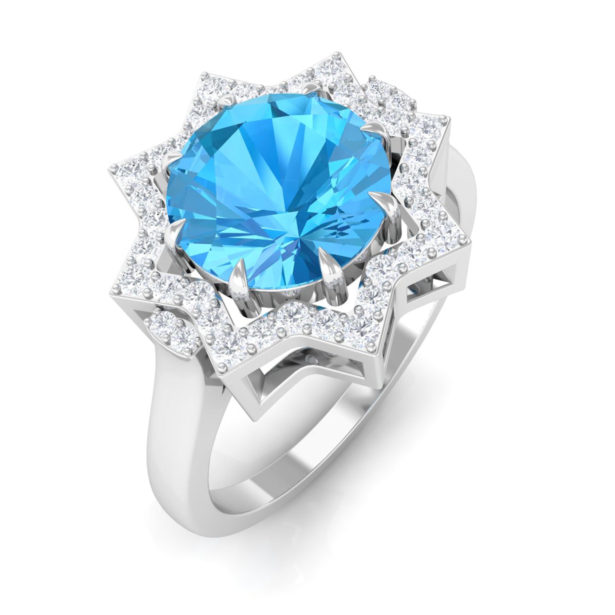 Treasured as one of the most flashy and flamboyant ring styles out there, a Swiss Blue Topaz Cocktail Ring is adorned by an enormous center stone of Swiss Blue Topaz. It is further beautified by eye-striking patterns of side-stones of Diamond/Moissanite under floral, antique, or any other statement-making design.