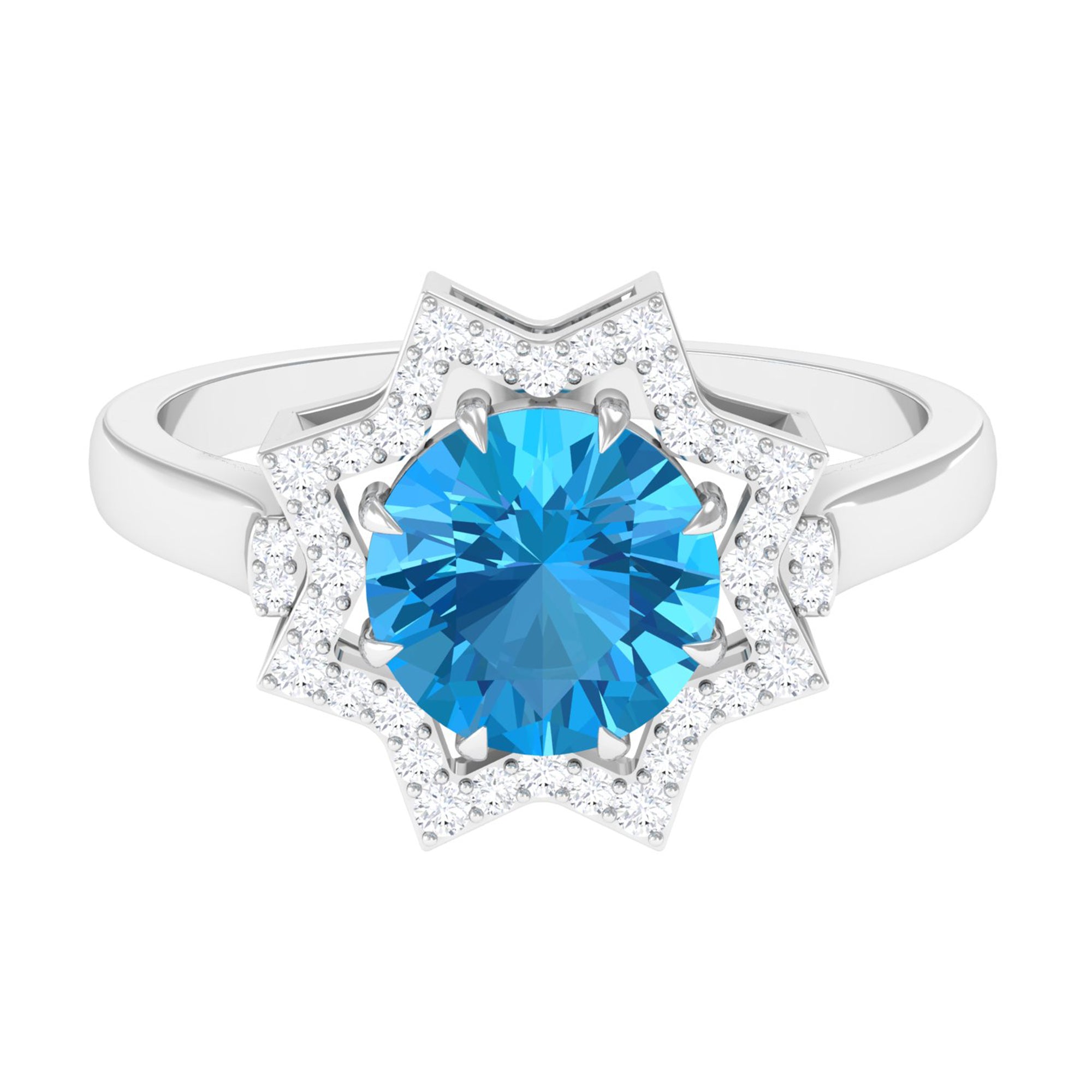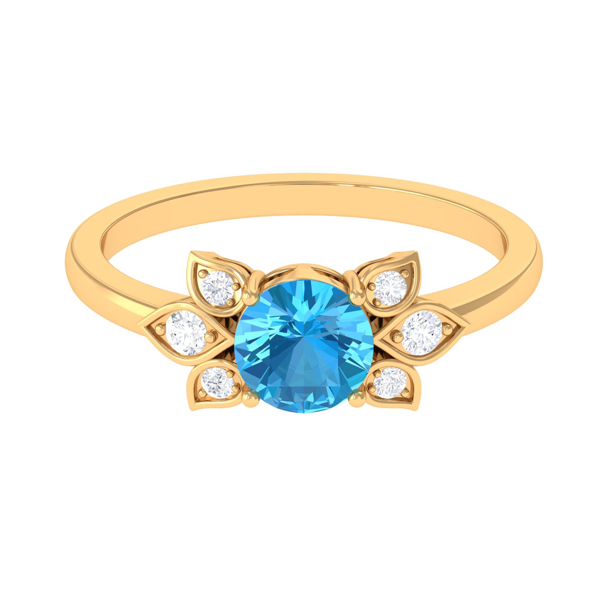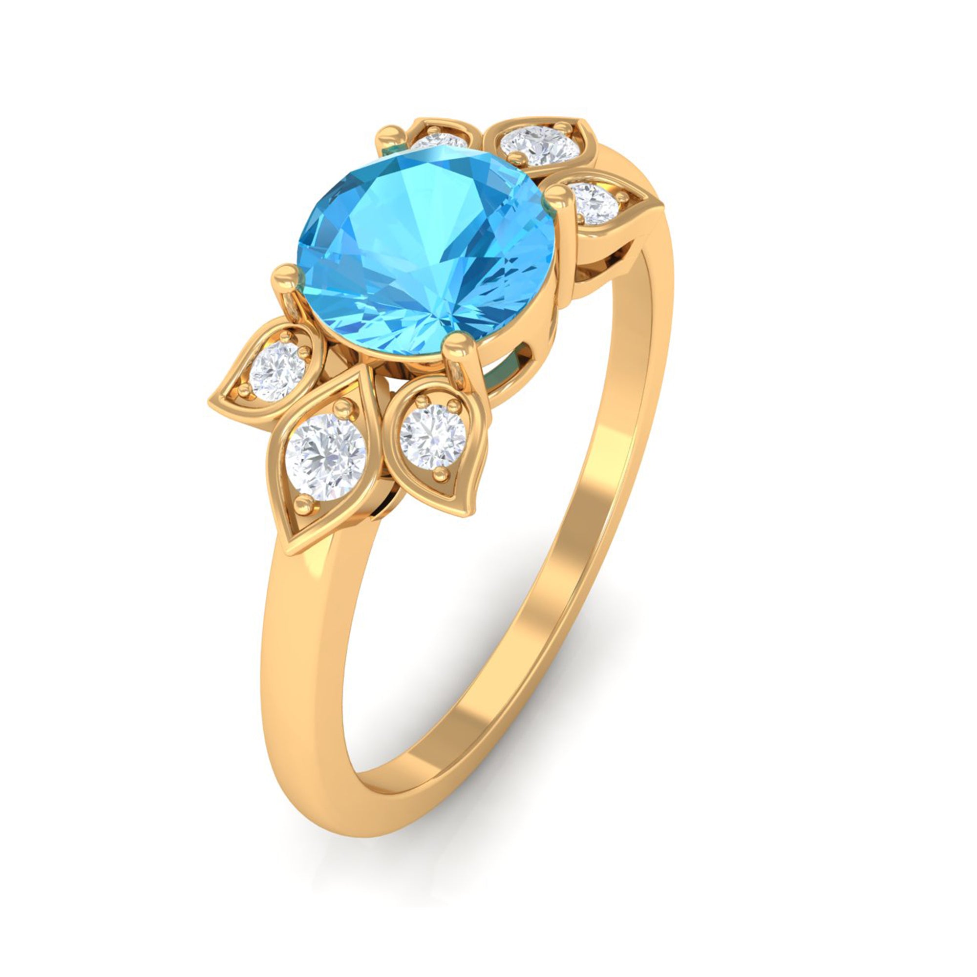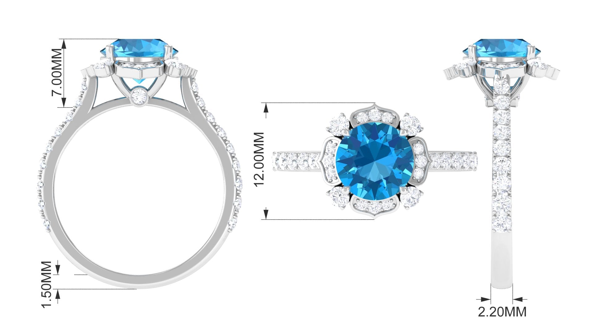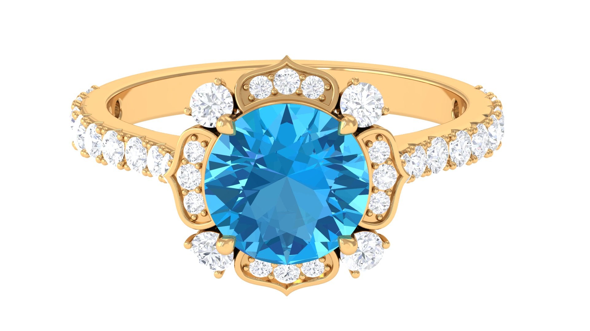Treasured as one of the most flashy and flamboyant ring styles out there, a Swiss Blue Topaz Cocktail Ring is adorned by an enormous center stone of Swiss Blue Topaz. It is further beautified by eye-striking patterns of side-stones of Diamond/Moissanite under floral, antique, or any other statement-making design.