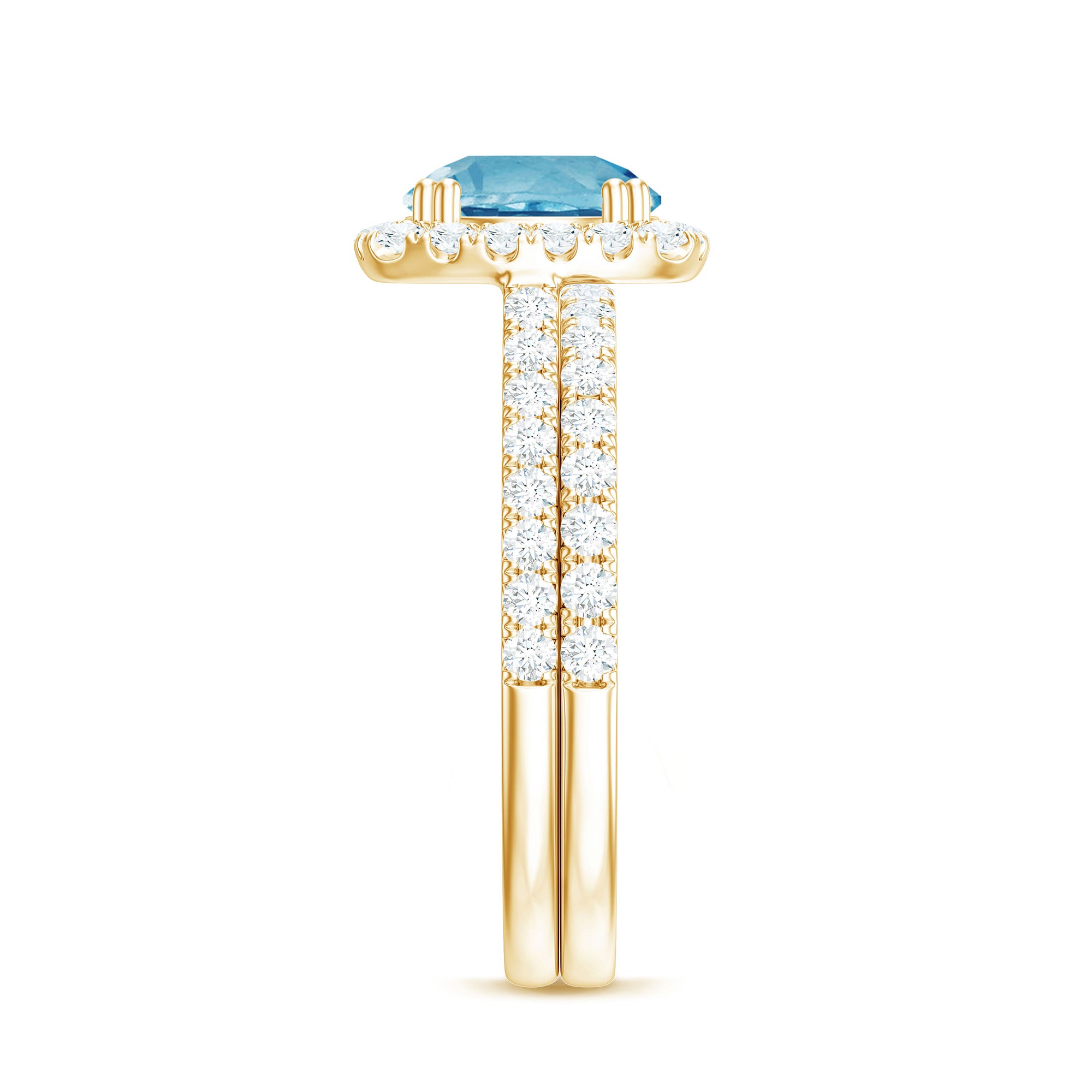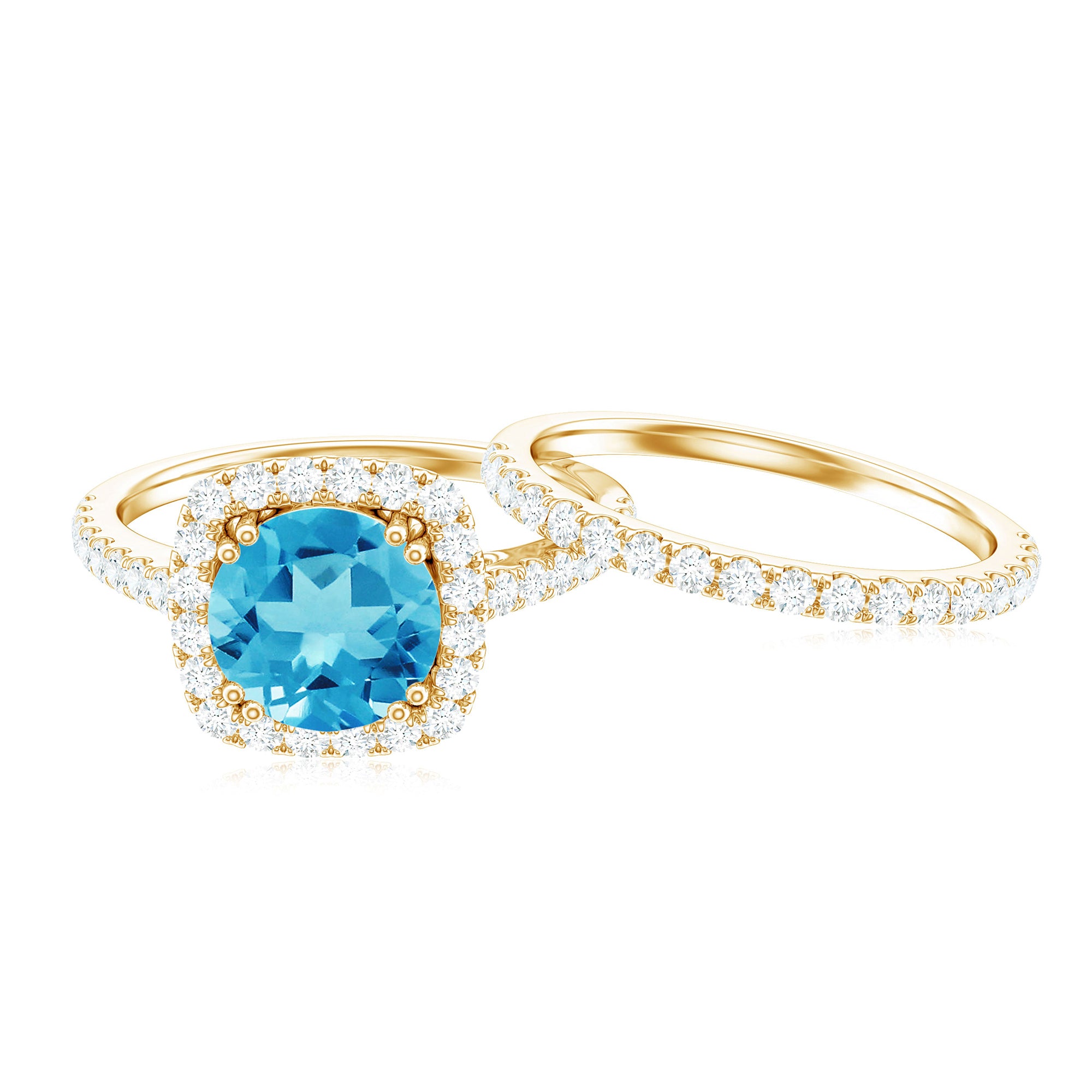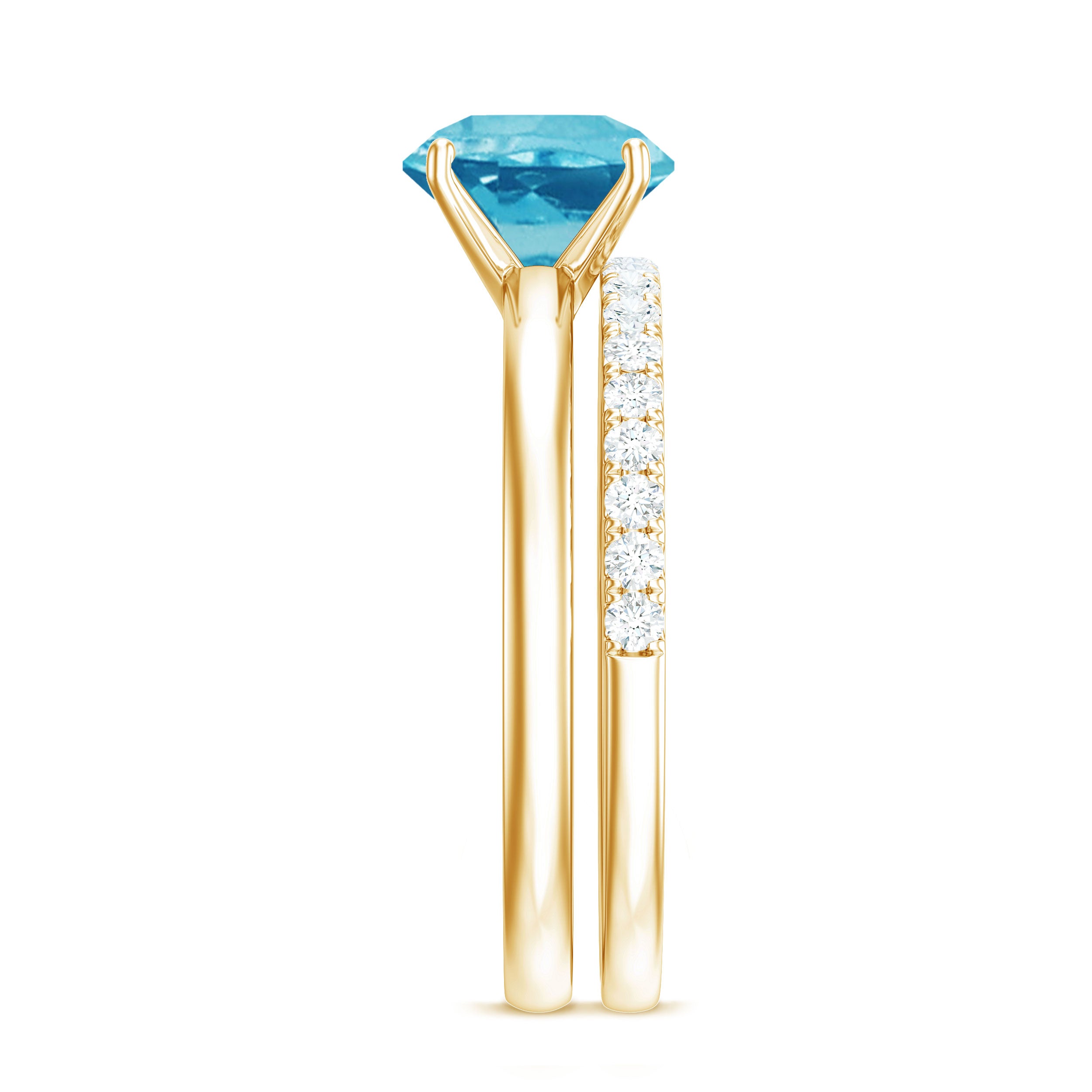 This Wedding Ring is bejeweled by Swiss Blue Topaz all over the band. It could be a classic band that is meant to fit with your Swiss Blue Topaz Engagement Ring or be more ornate by featuring a floating halo, old-world designs, or even a triple-row band. Thanks to its conventional aesthetics, a Yellow Gold Swiss Blue Topaz Ring is considered most appealing in this category. Symbolically, it commemorates the lifelong union of two souls as one and is thus, exchanged along with the wedding vows.