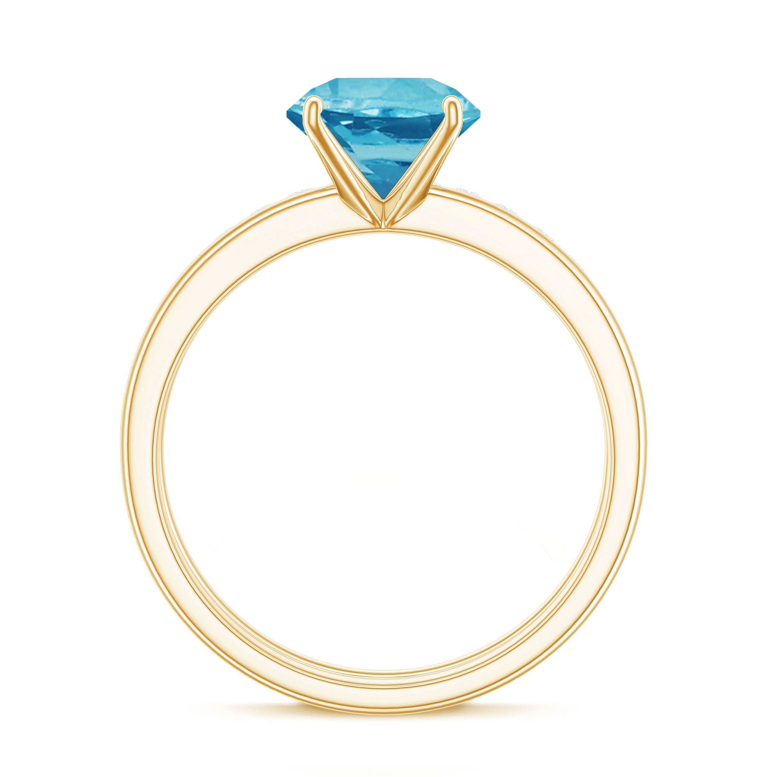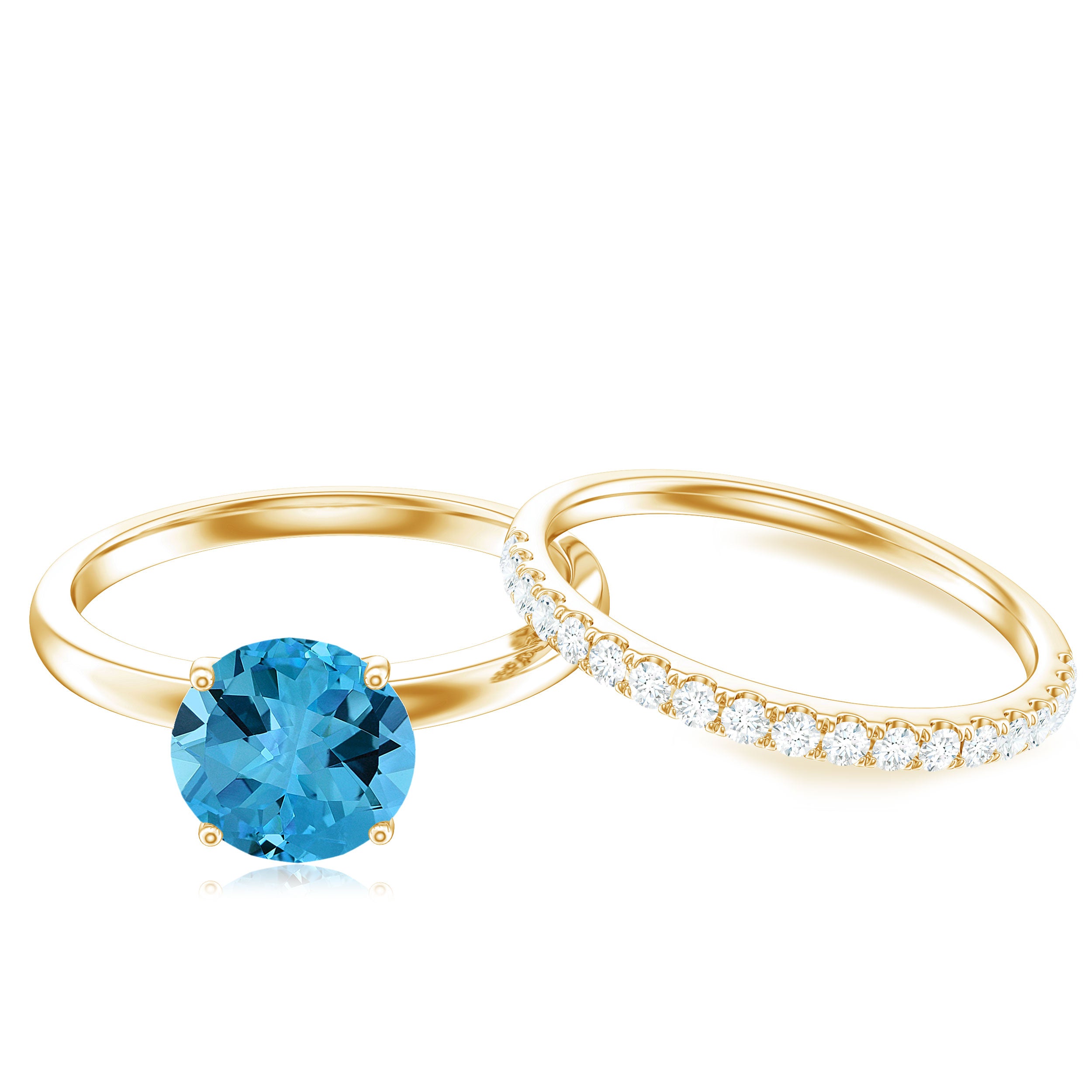 This Wedding Ring is bejeweled by Swiss Blue Topaz all over the band. It could be a classic band that is meant to fit with your Swiss Blue Topaz Engagement Ring or be more ornate by featuring a floating halo, old-world designs, or even a triple-row band. Thanks to its conventional aesthetics, a Yellow Gold Swiss Blue Topaz Ring is considered most appealing in this category. Symbolically, it commemorates the lifelong union of two souls as one and is thus, exchanged along with the wedding vows.