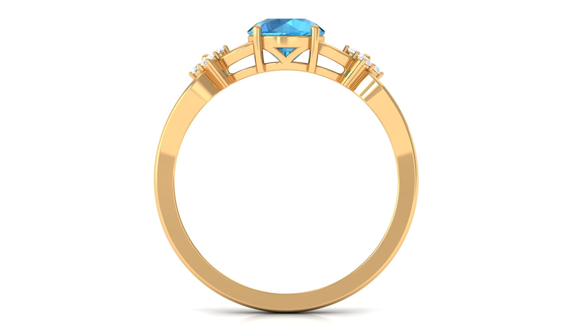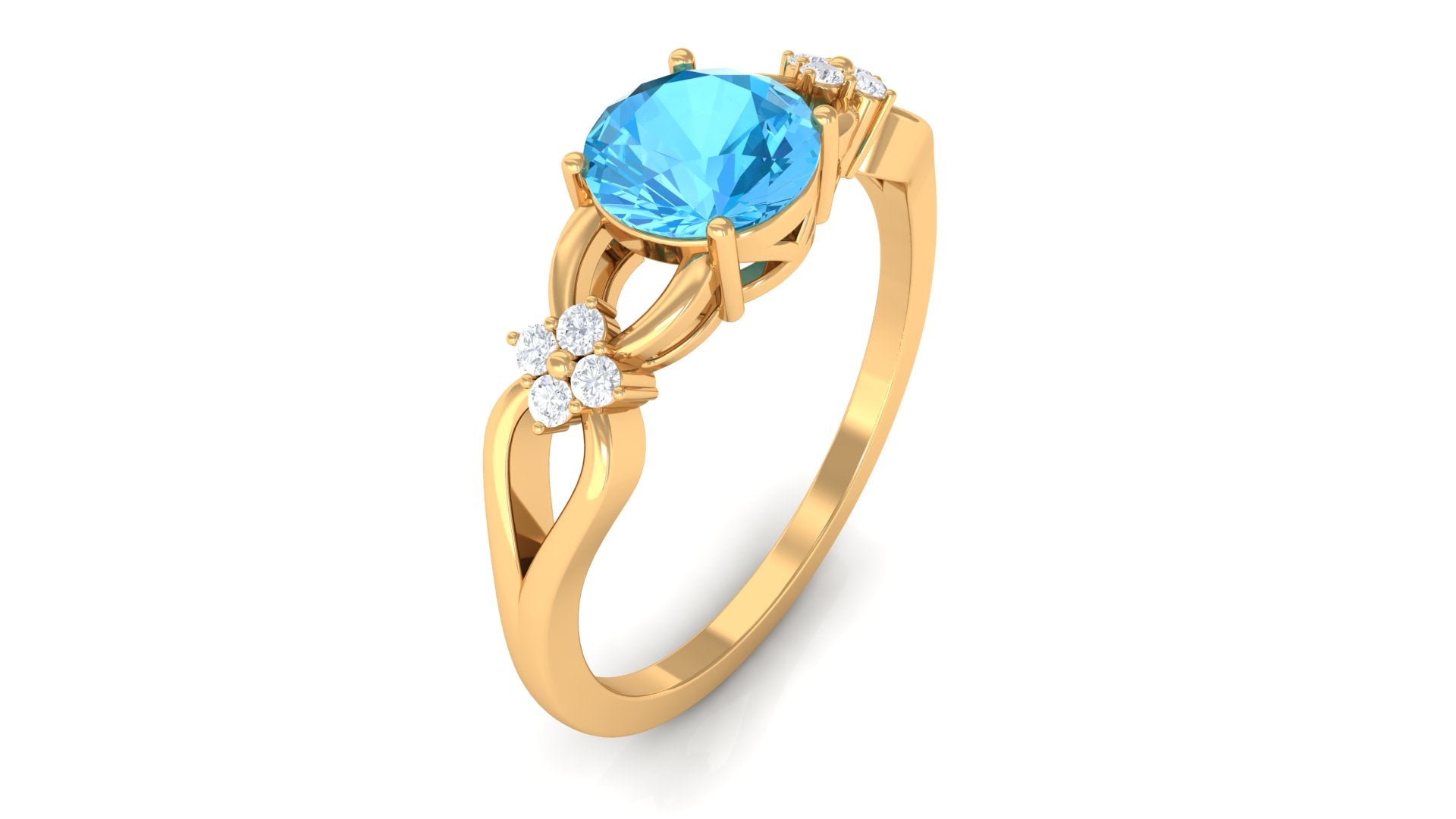 The center-stone of Swiss Blue Topaz here is sparkled up with the encircling of Diamond/Moissanite (that we fondly term ‘Halo’). That makes the Swiss Blue Topaz appear even brighter while highlighting its beauty at its best. Surprisingly, it also gives off the illusion of a bigger Topaz. So, if a Swiss Blue Topaz and Diamond Ring is on your list, this style might turn out to be your best bet.