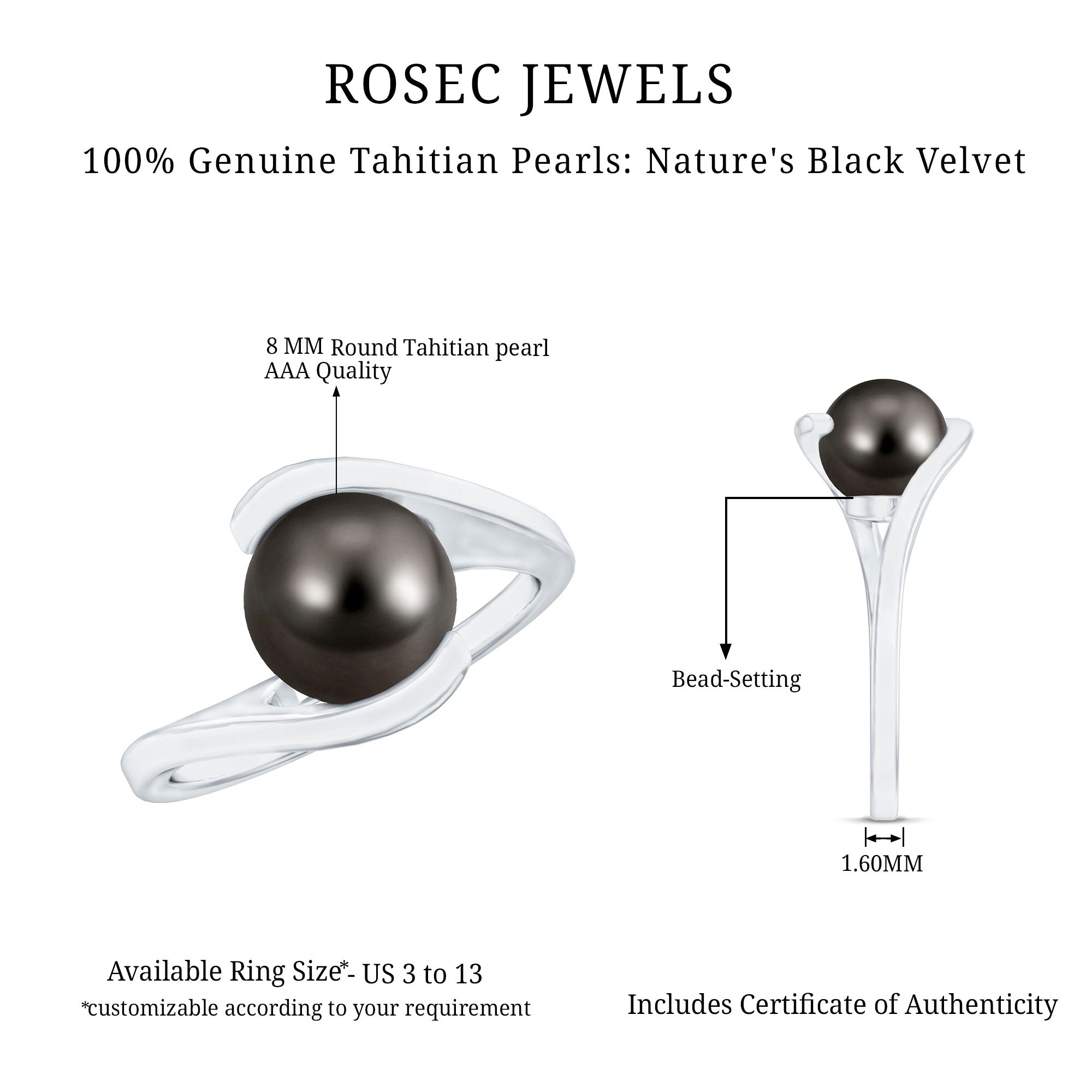 These are sophisticated accessories showcasing a center of attraction Tahitian pearl as a focal point. The black pearls are renowned for their dark hues, and smooth appearance. The solitaire rings display the natural beauty of black pearl. Crafted from premium metals like white gold, white gold, and silver, these rings bring classic touch to your personality. Their elegance and simplicity make this ring perfect for casual outfits and special occasions.