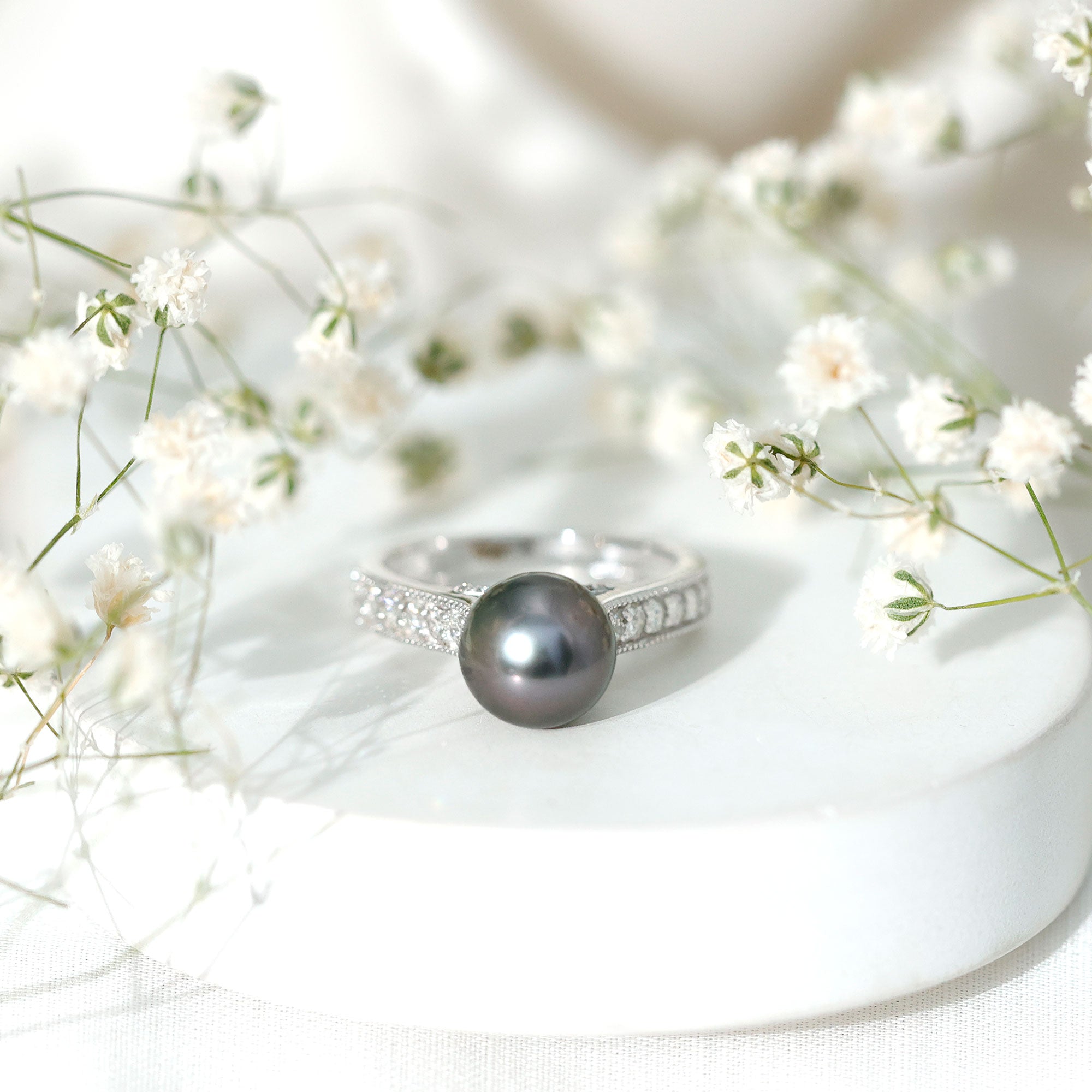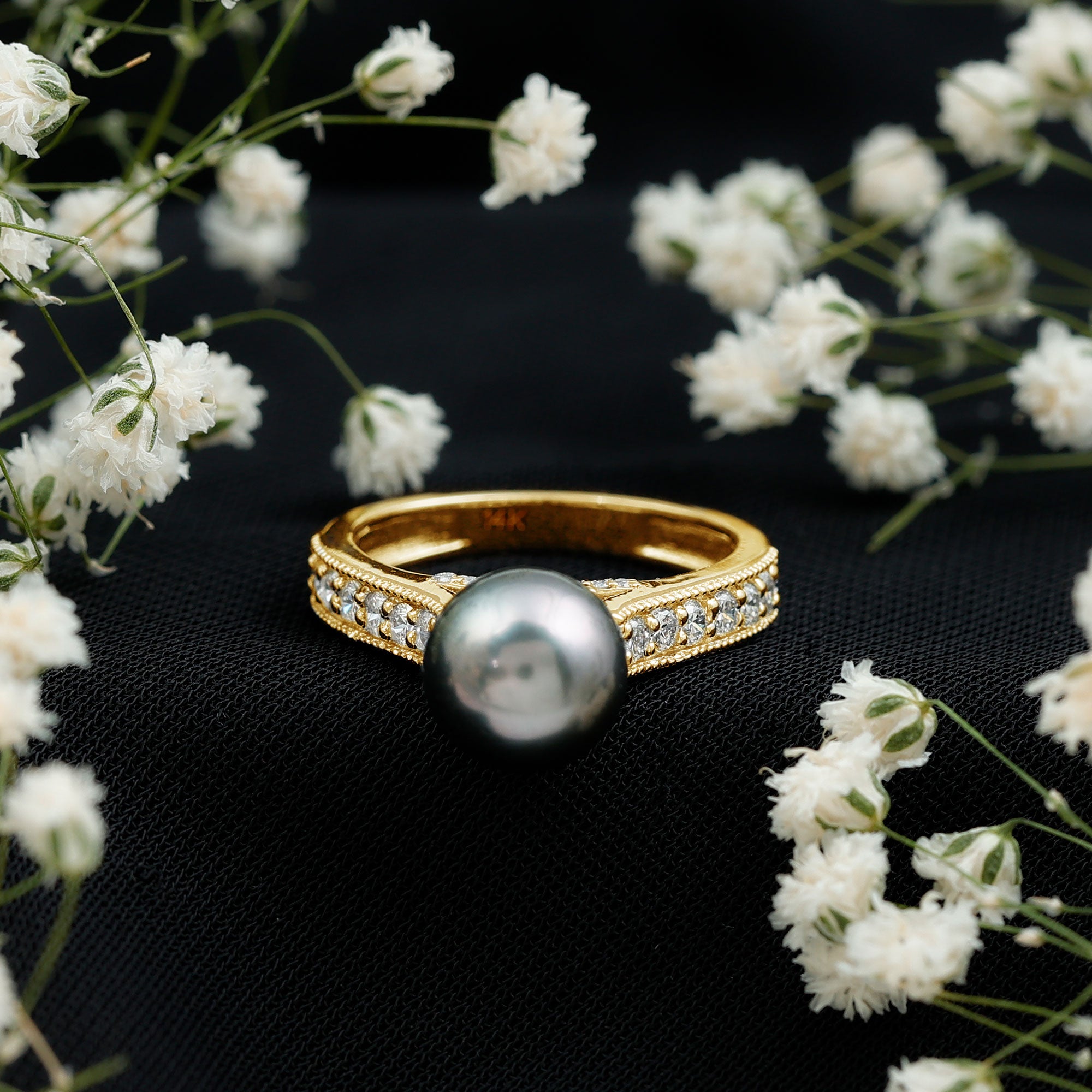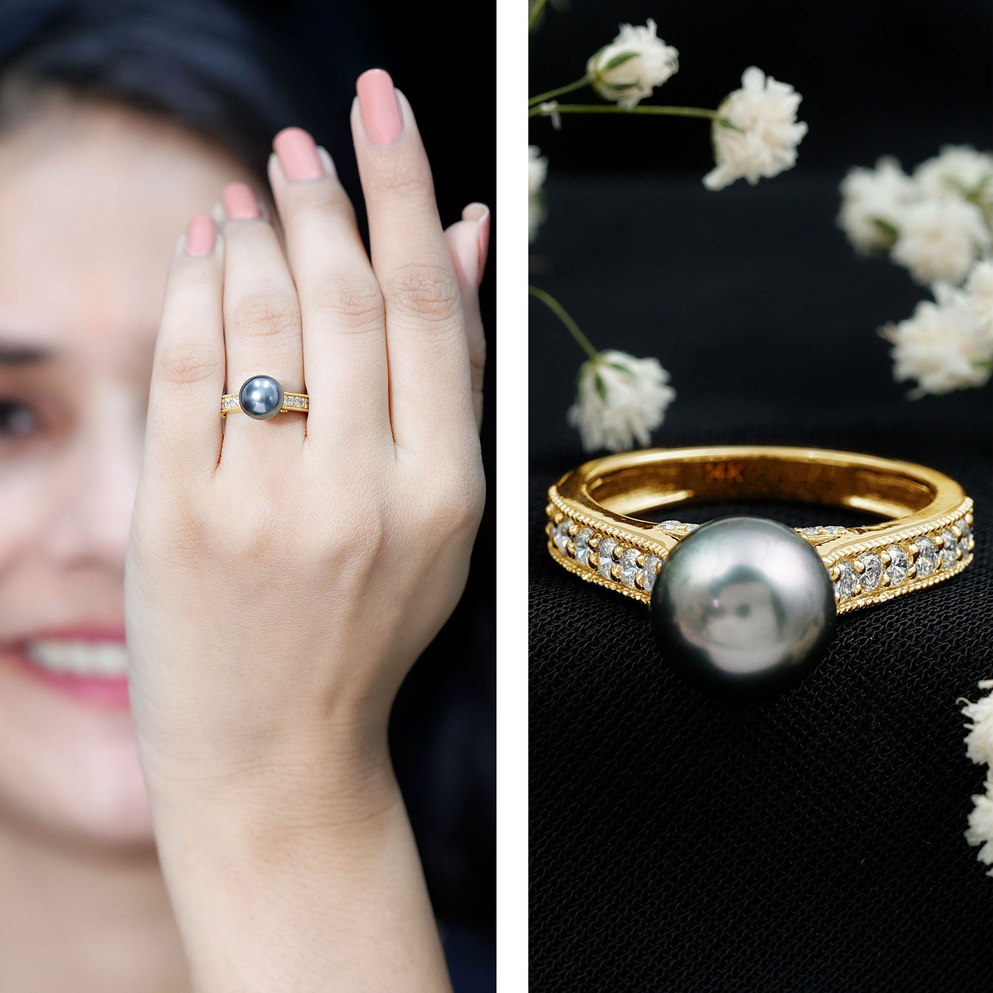 These rings often set in a prong or bezel setting that ensures the black pearl's safety as well. Our Tahitian pearl halo rings are best suitable for those who appreciate the blend of contemporary and elaborate design.