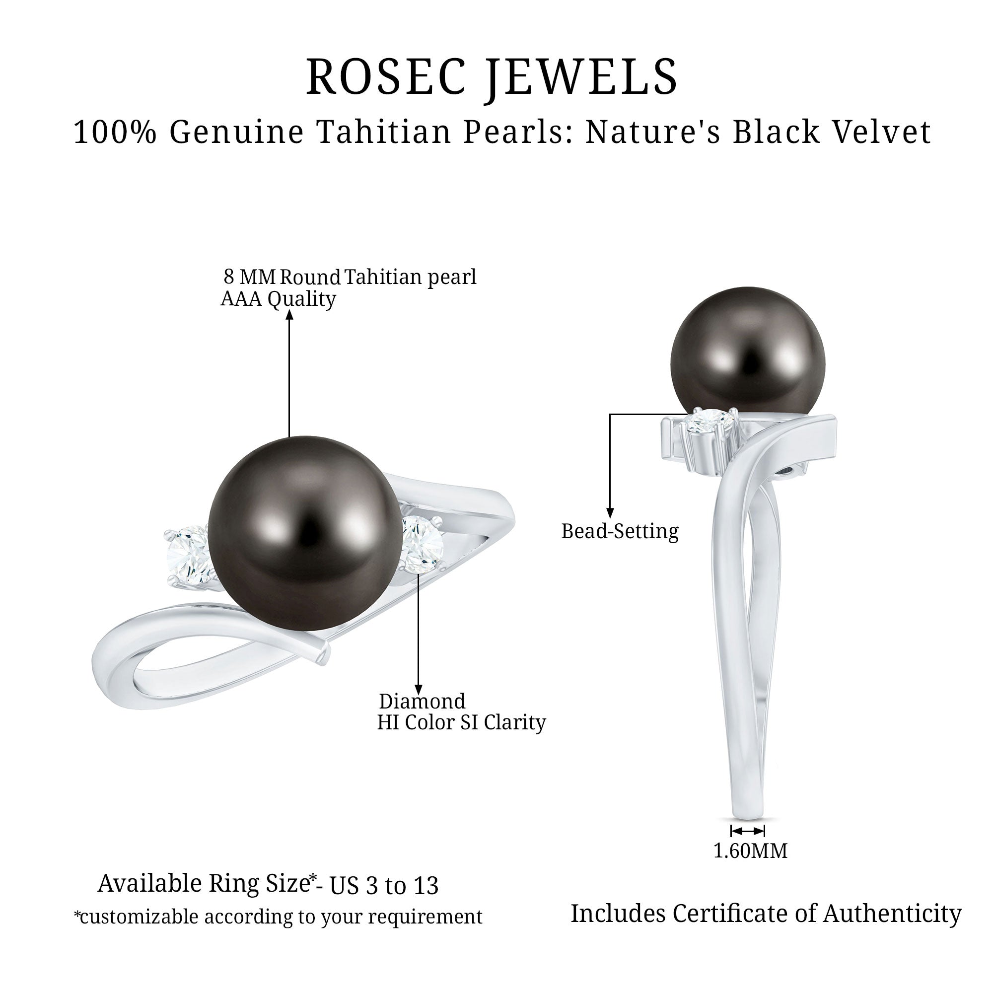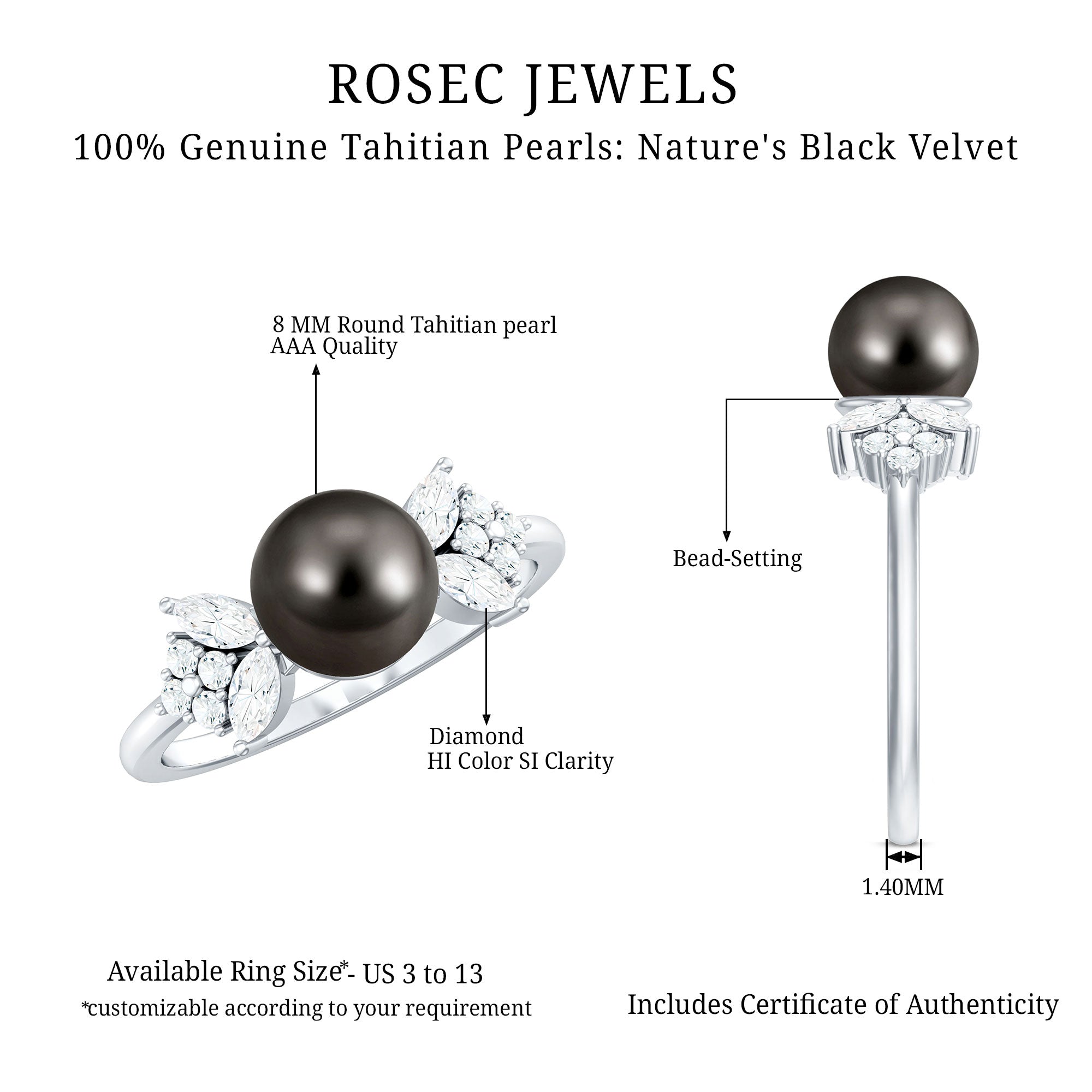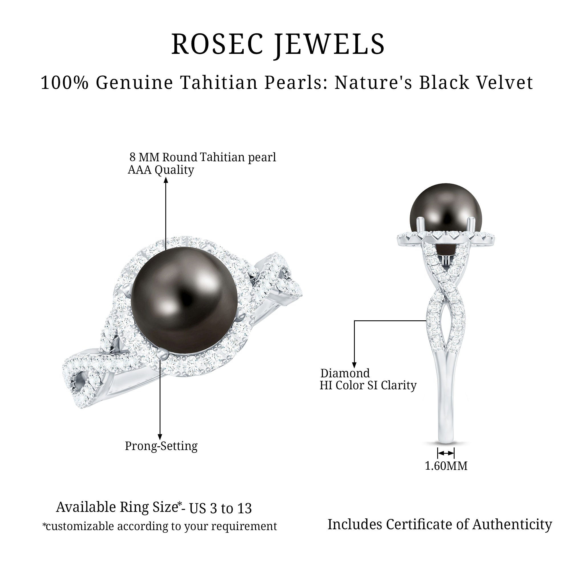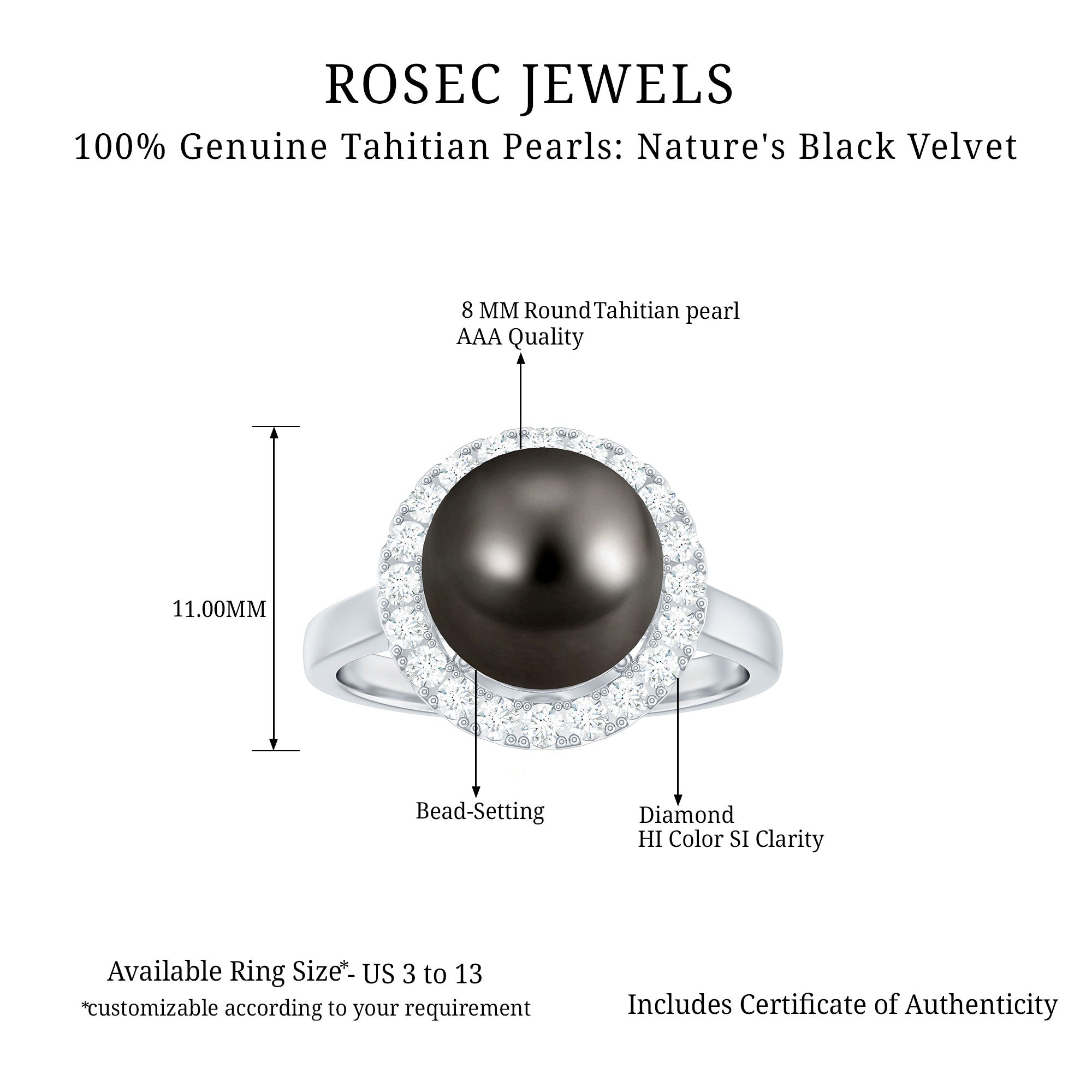 These rings often set in a prong or bezel setting that ensures the black pearl's safety as well. Our Tahitian pearl halo rings are best suitable for those who appreciate the blend of contemporary and elaborate design.