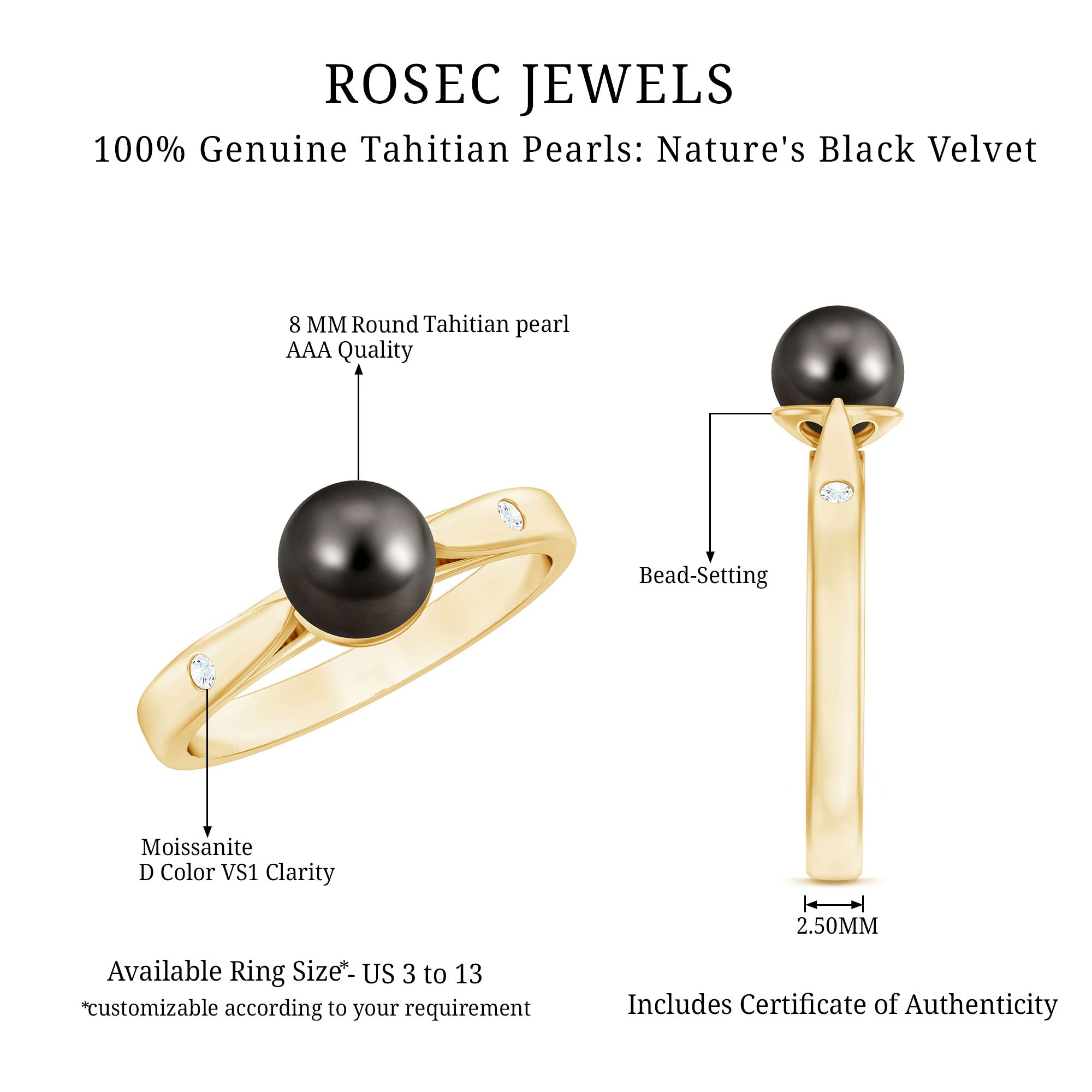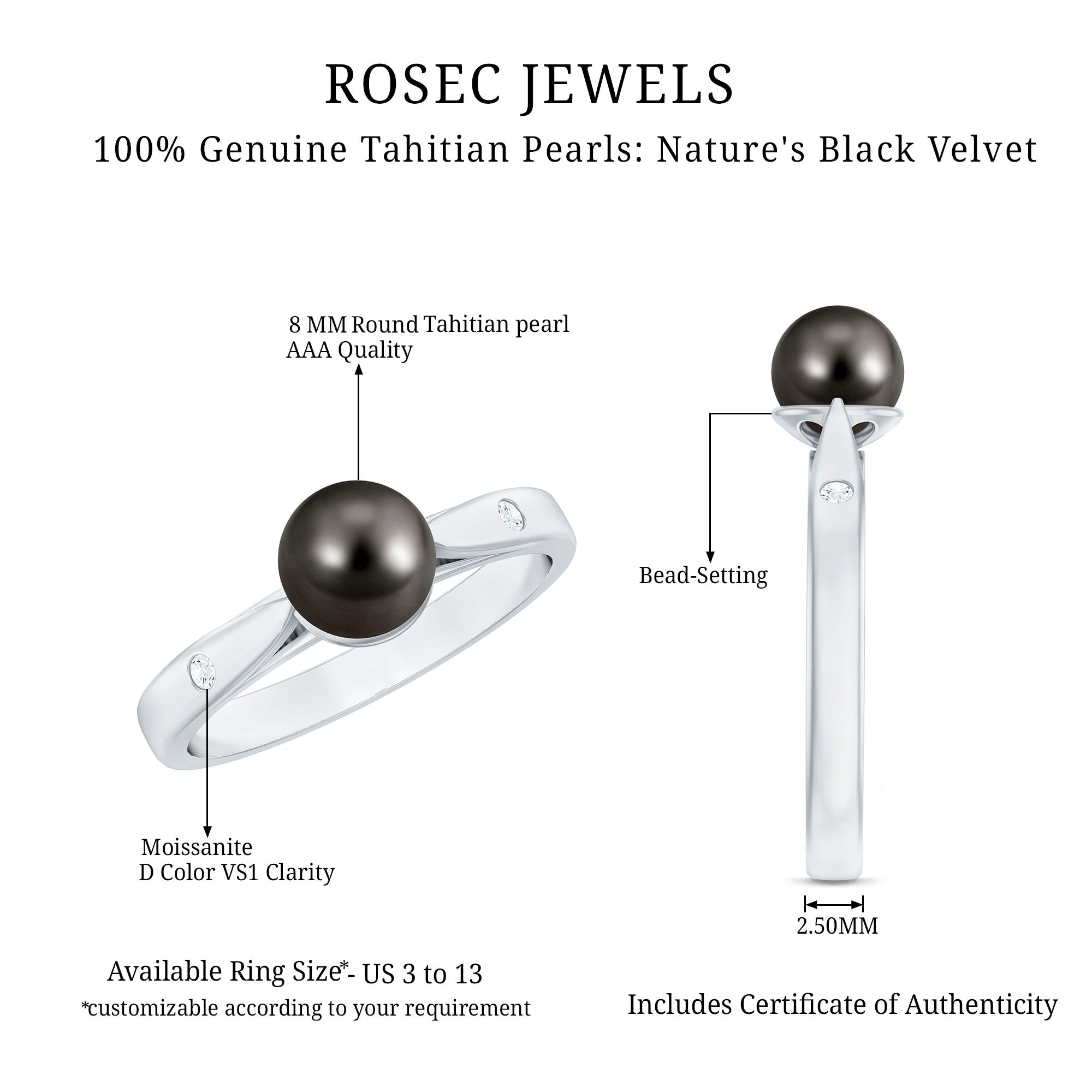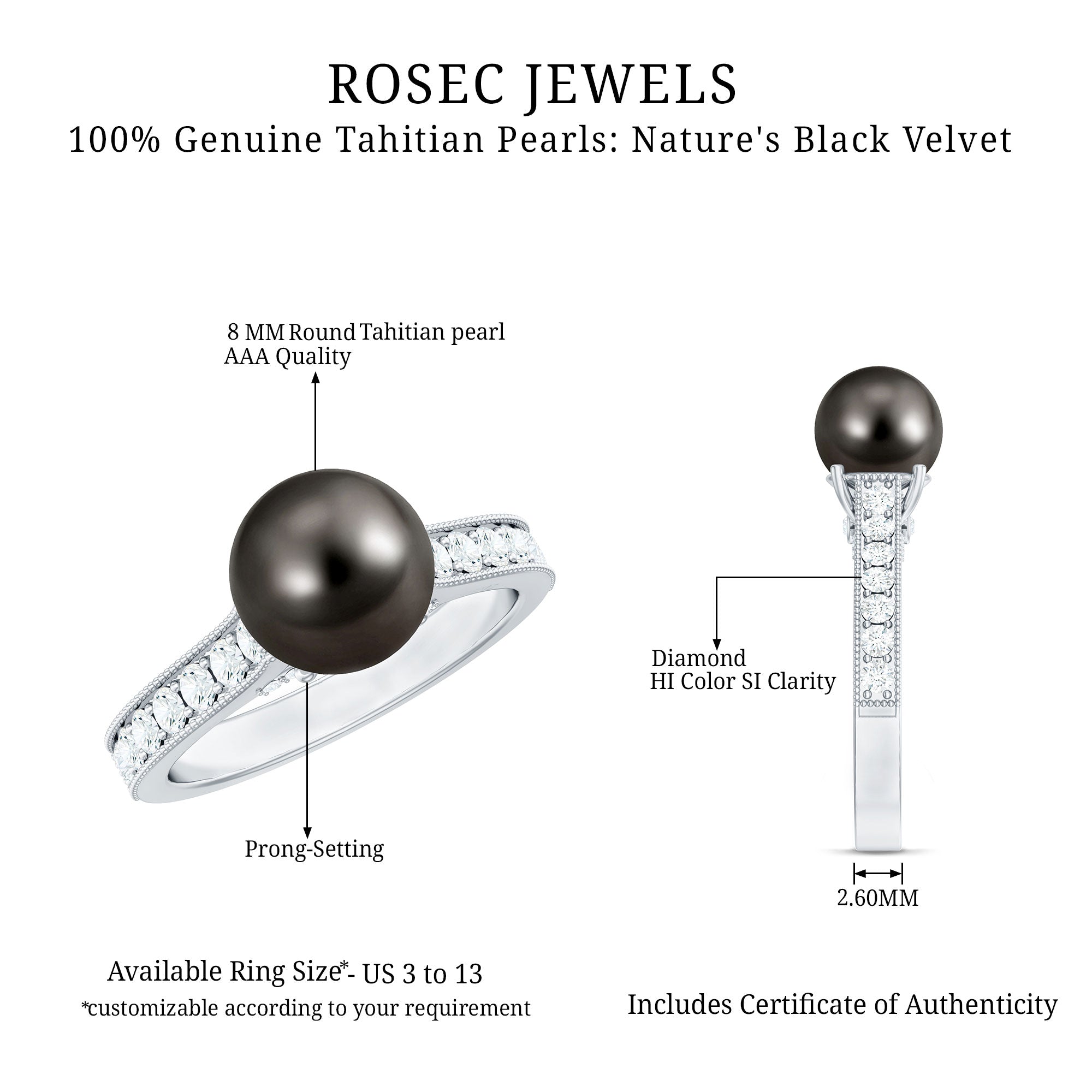These Tahitian pearl rings often called "Black Pearls", were worn by royalty and the elite. Women choose this variety of pearls for their beauty and the significant meaning they hold. The black pearls are produces in black-lipped oyster, Pinctada Margaritifer.