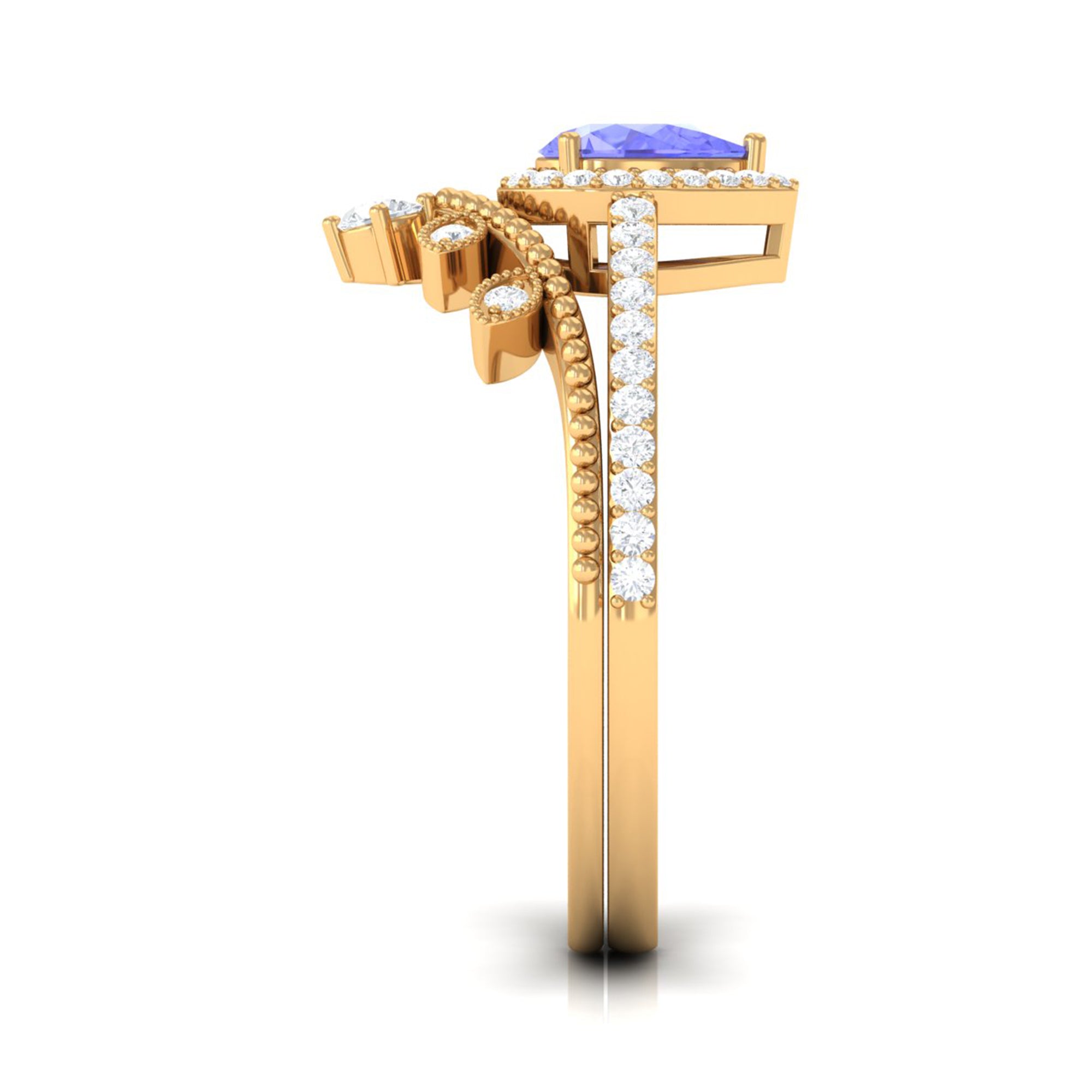 While designing wedding bands for women our artisans combine traditional designs with latest fashion trends. Our lapidarist craft beautiful tanzanite bands with a variety of tanzanite shapes ranging from round, oval, cushion, emerald, princess and many more to bring about a great diversity in tanzanite rings for wedding. Furthermore, the selection of different gold hues with different purity bring further assortment to tanzanite rings.