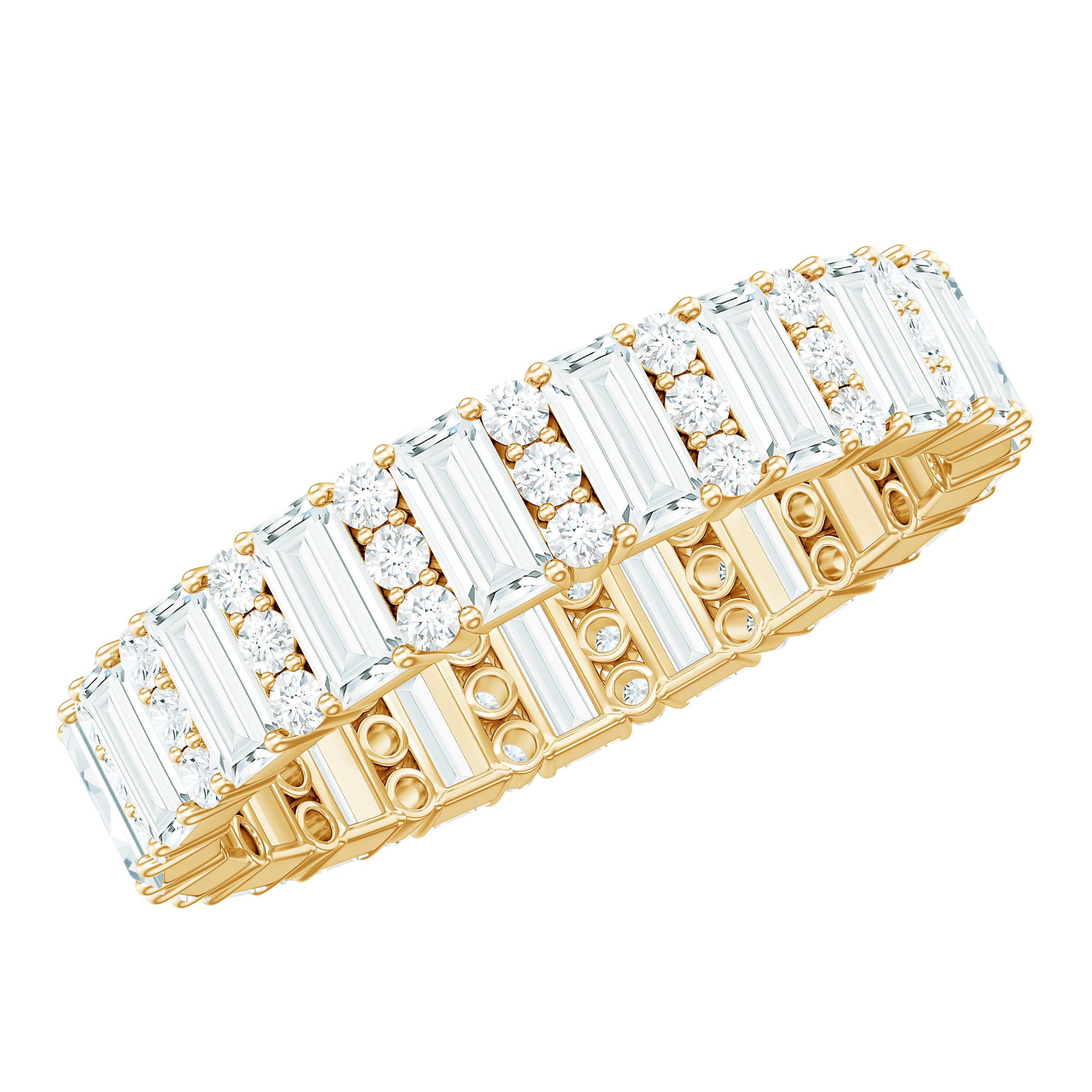 Baguette Wedding Rings: Baguette wedding bands are known for their larger gemstone illusion, vintage glam, and distinctive yet understated elegance. Tilted baguette sapphires, straight baguette moissanites, or any other colored or sparkling gemstone wedding bands can add a touch of sparkle to your engagement ring.