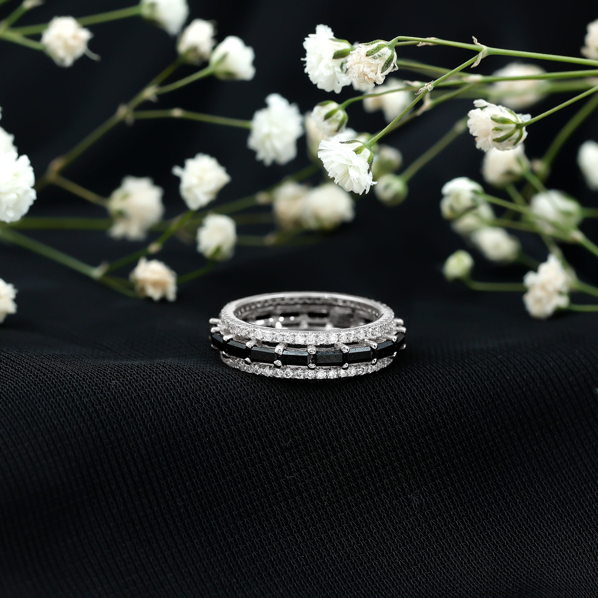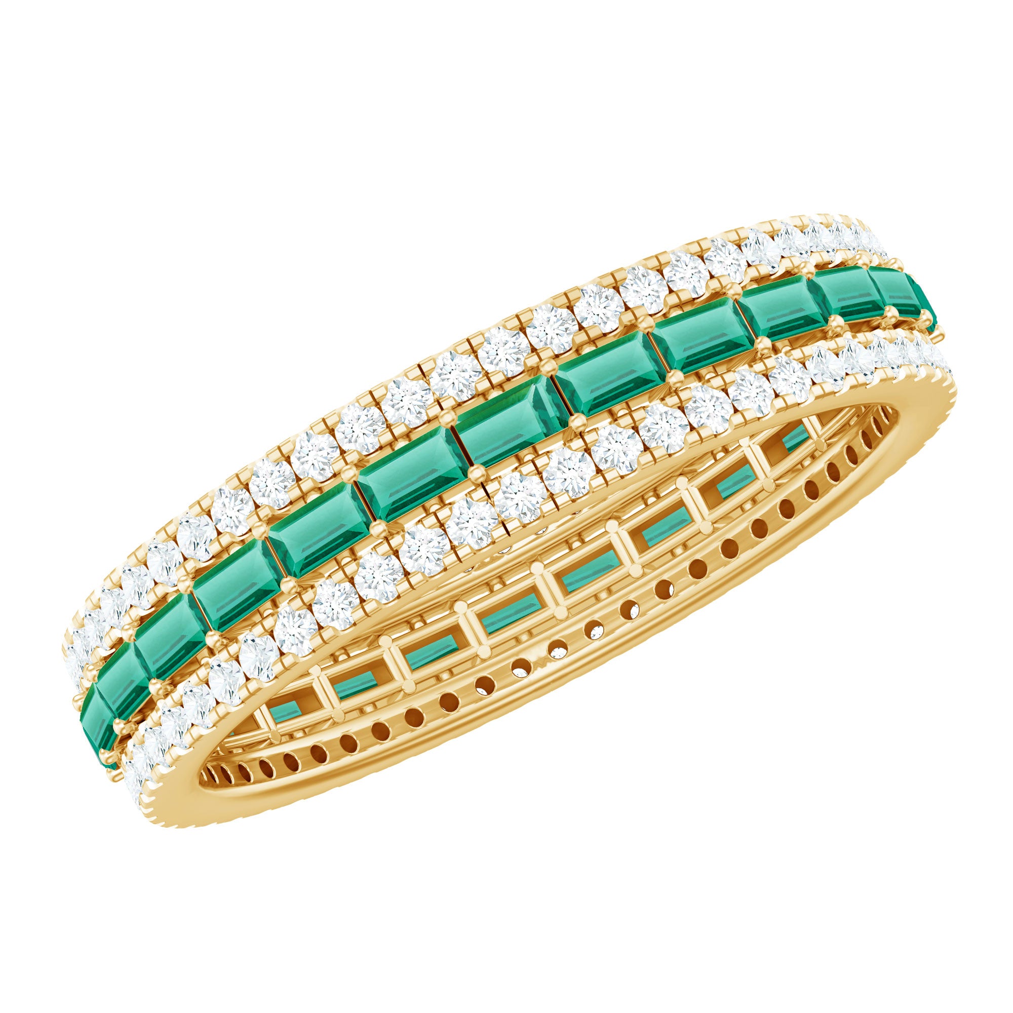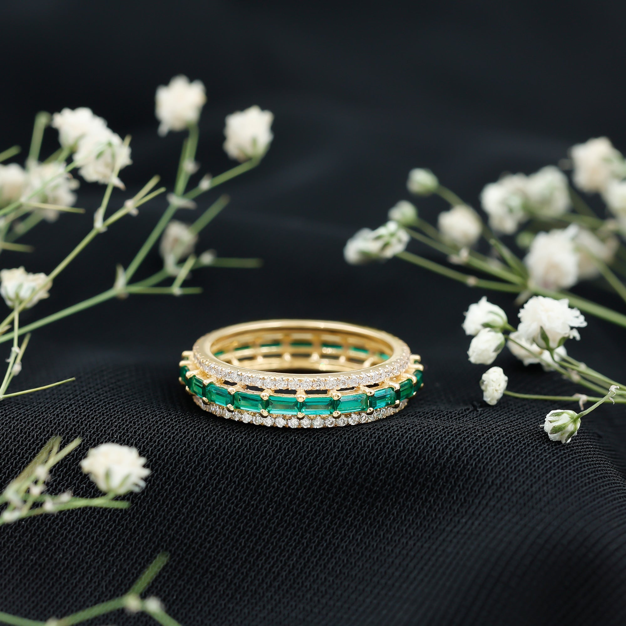 Baguette Wedding Rings: Baguette wedding bands are known for their larger gemstone illusion, vintage glam, and distinctive yet understated elegance. Tilted baguette sapphires, straight baguette moissanites, or any other colored or sparkling gemstone wedding bands can add a touch of sparkle to your engagement ring.