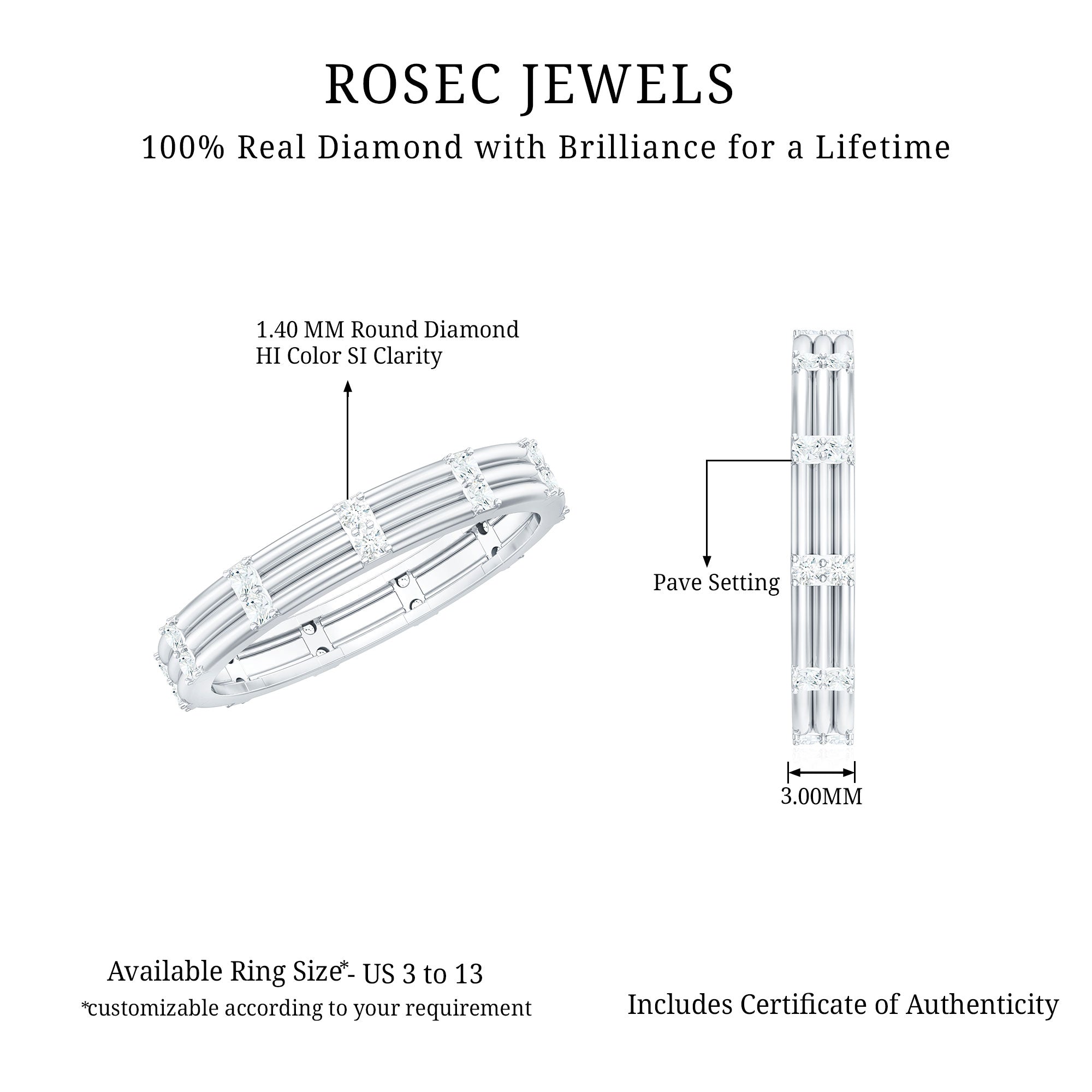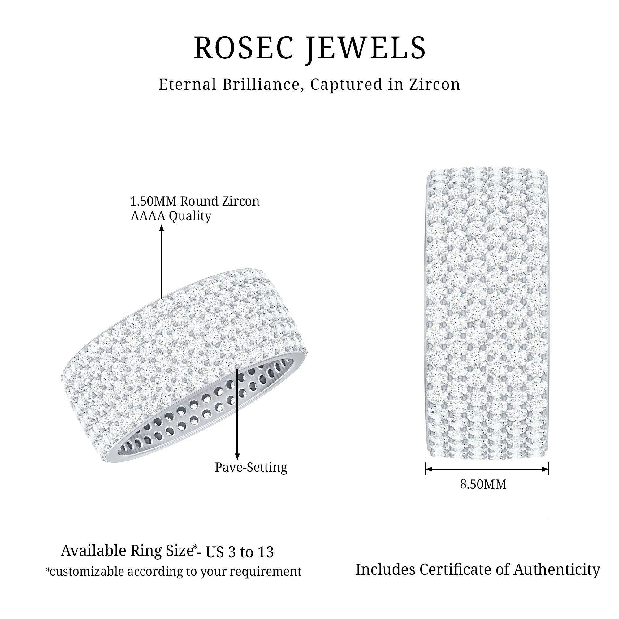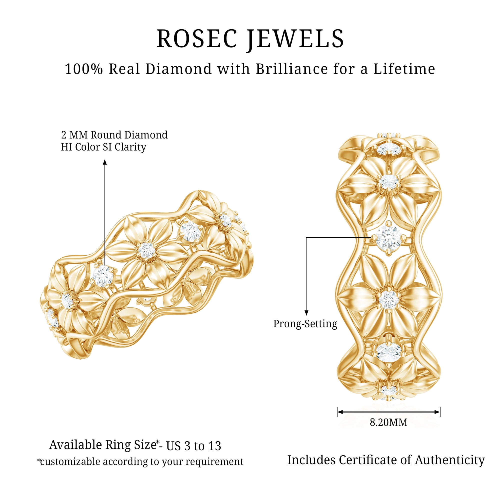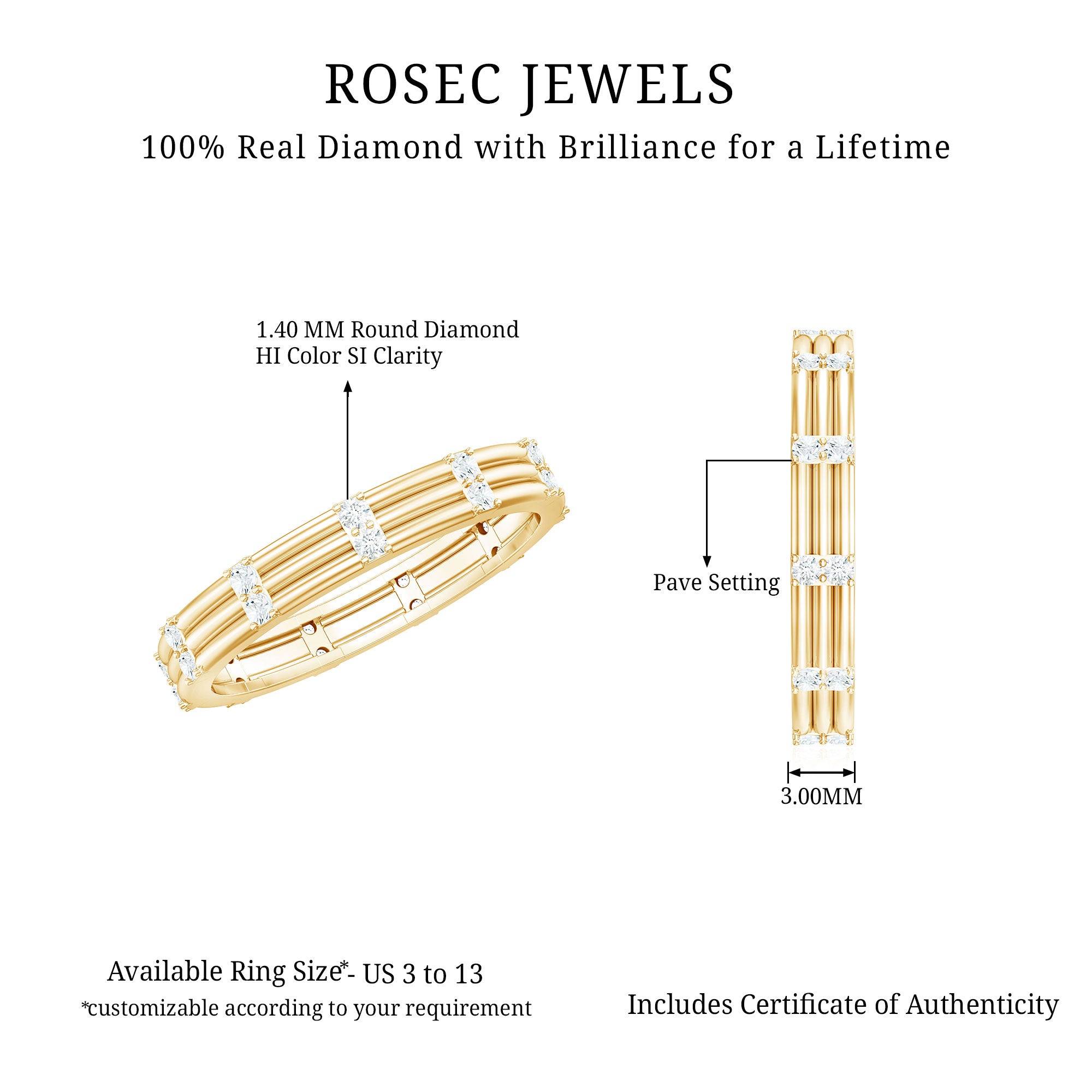 We at Rosec Jewels are the jewelers behind an assorted collection of eternity rings to mark the wedding ceremony. The available hues of gold namely, yellow gold, white gold and rose have motivated us to bring versatility in the process of crafting jewelry while creating a diversity in the range of gold eternity bands. We are in debt to our gemologists and lapidarist responsible for assuring the gemstone quality.