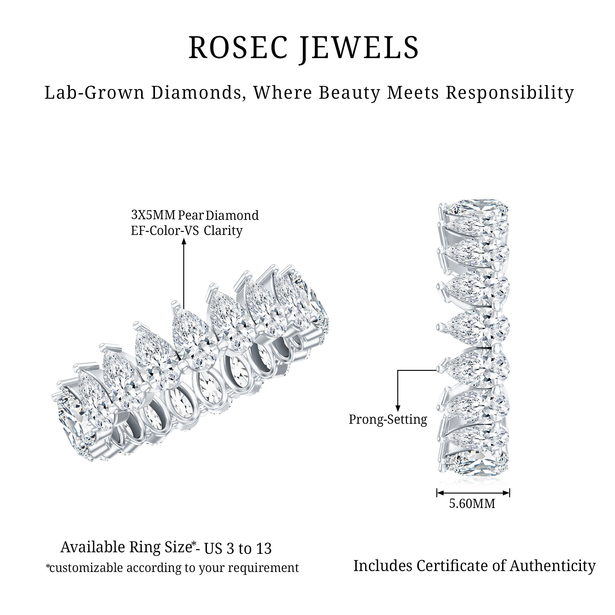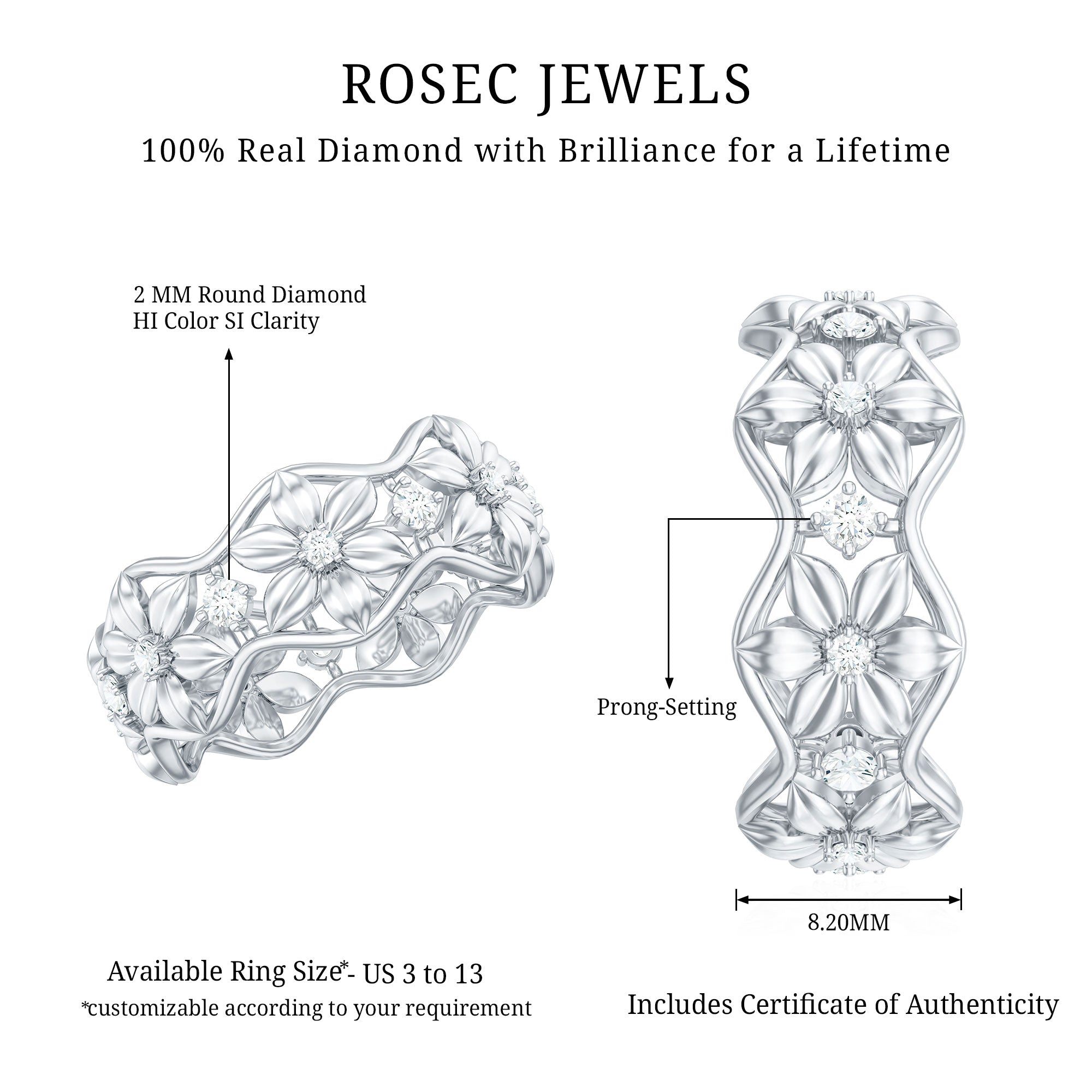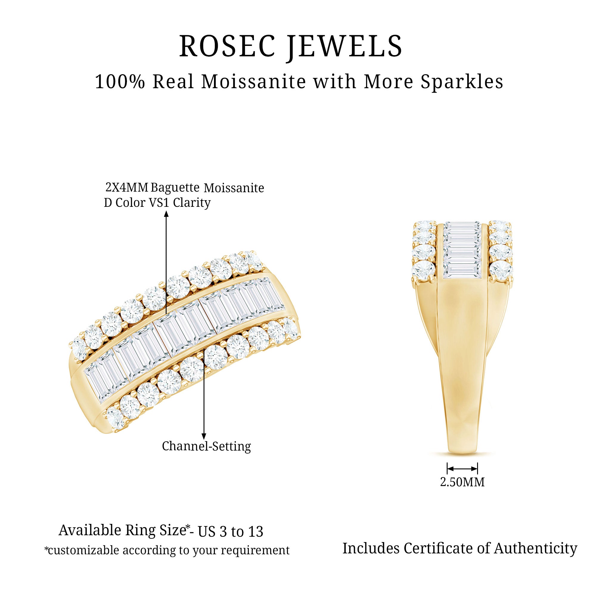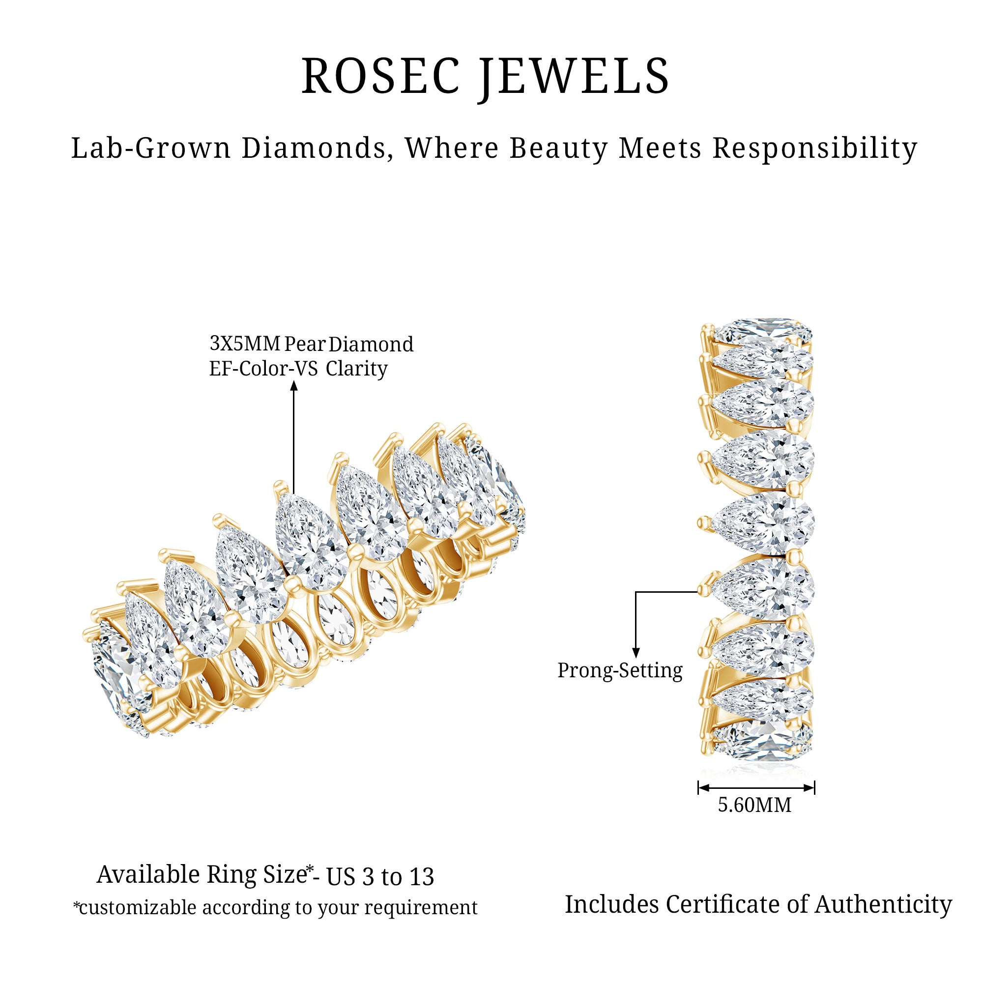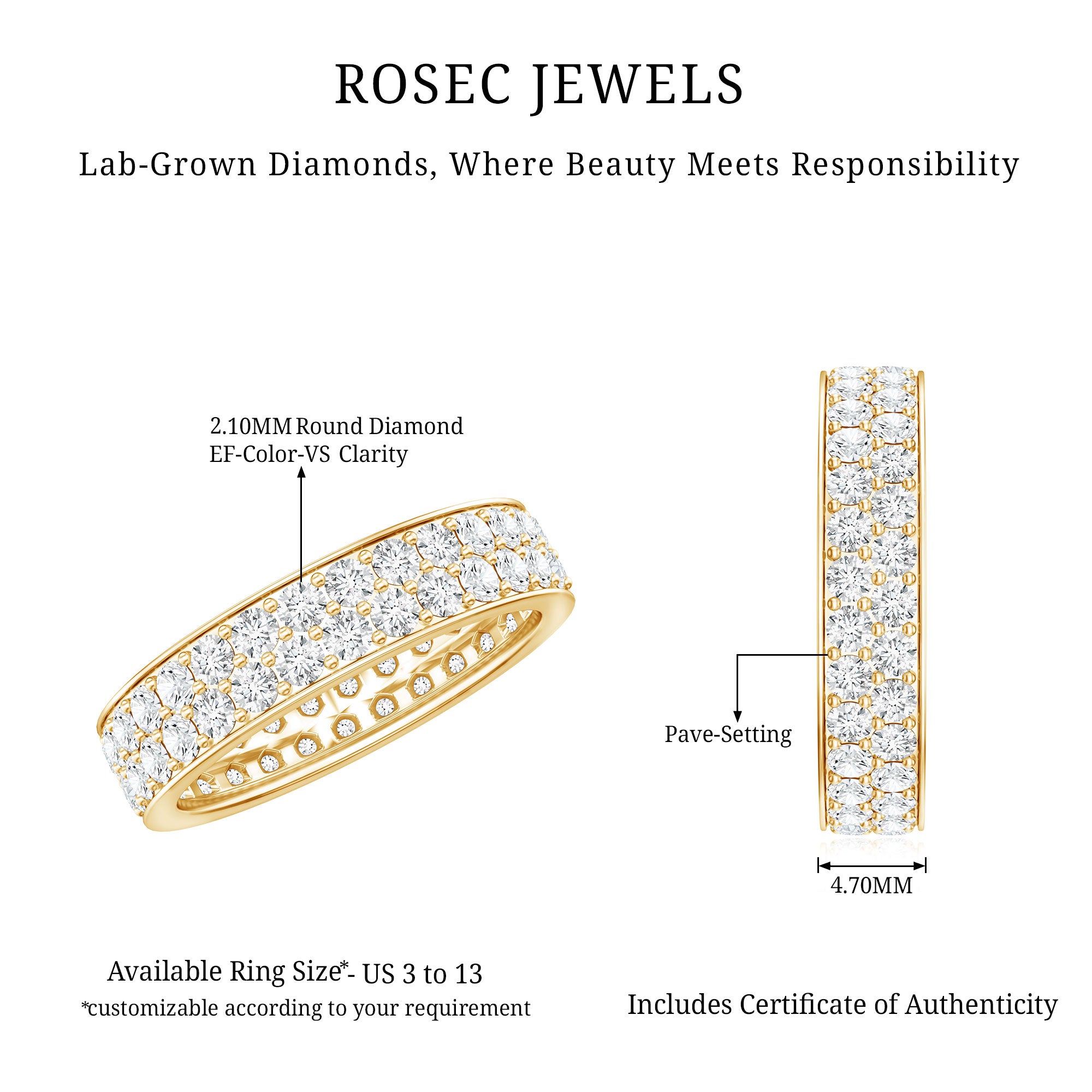 We at Rosec Jewels are the jewelers behind an assorted collection of eternity rings to mark the wedding ceremony. The available hues of gold namely, yellow gold, white gold and rose have motivated us to bring versatility in the process of crafting jewelry while creating a diversity in the range of gold eternity bands. We are in debt to our gemologists and lapidarist responsible for assuring the gemstone quality.