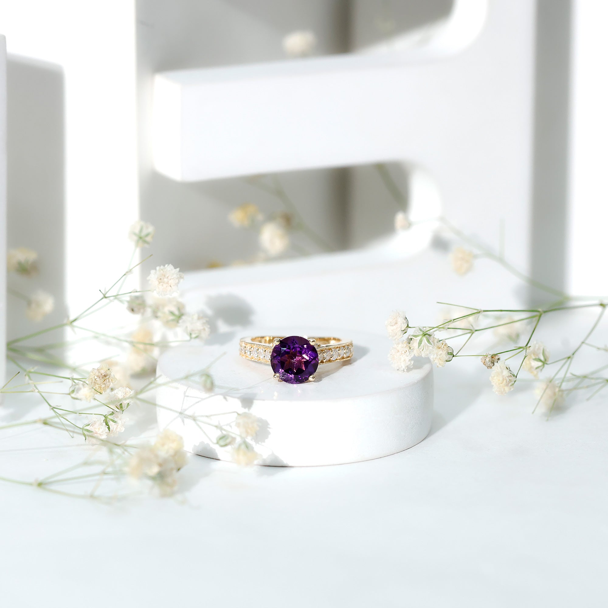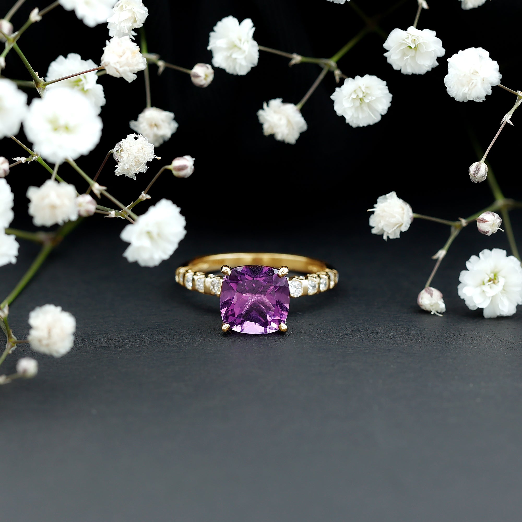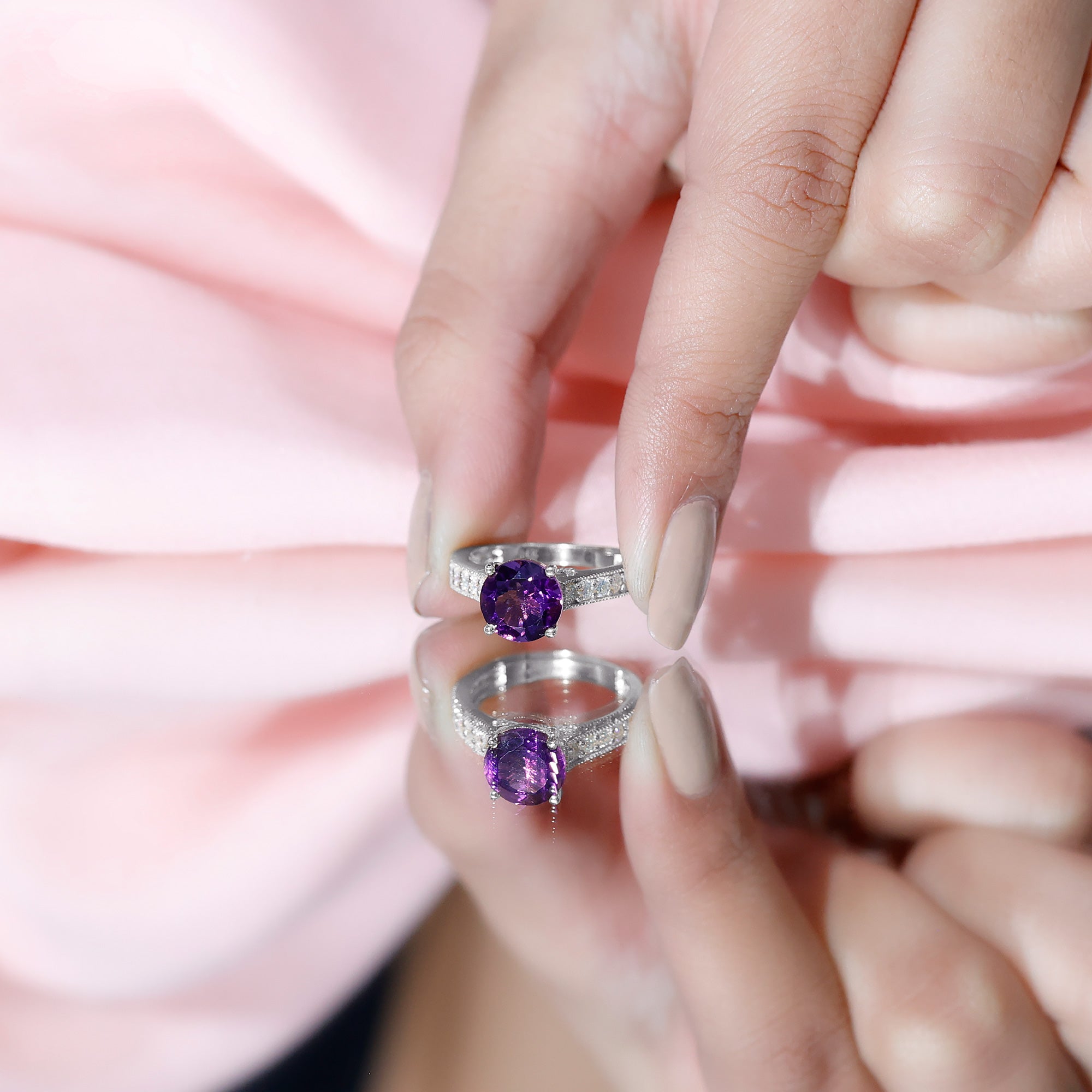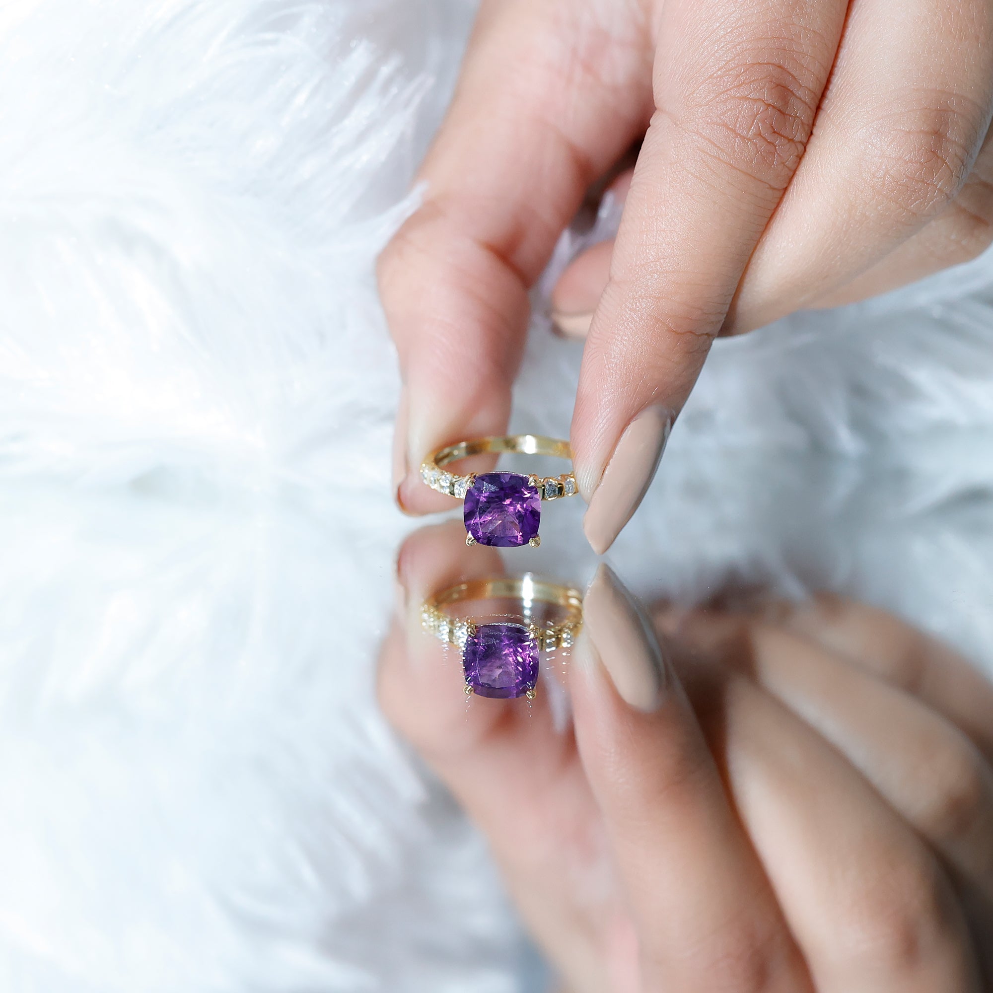 La bague de fiançailles en améthyste se distingue des autres par sa teinte violette vibrante. Les bagues de fiançailles en améthyste violette deviennent un choix idéal pour les mariées des temps modernes. La teinte violet foncé de l'améthyste ressort et donne une touche vintage aux bijoux. Étant une pierre de naissance du mois de février, elle n'est pas nécessairement portée uniquement par les personnes nées en février.