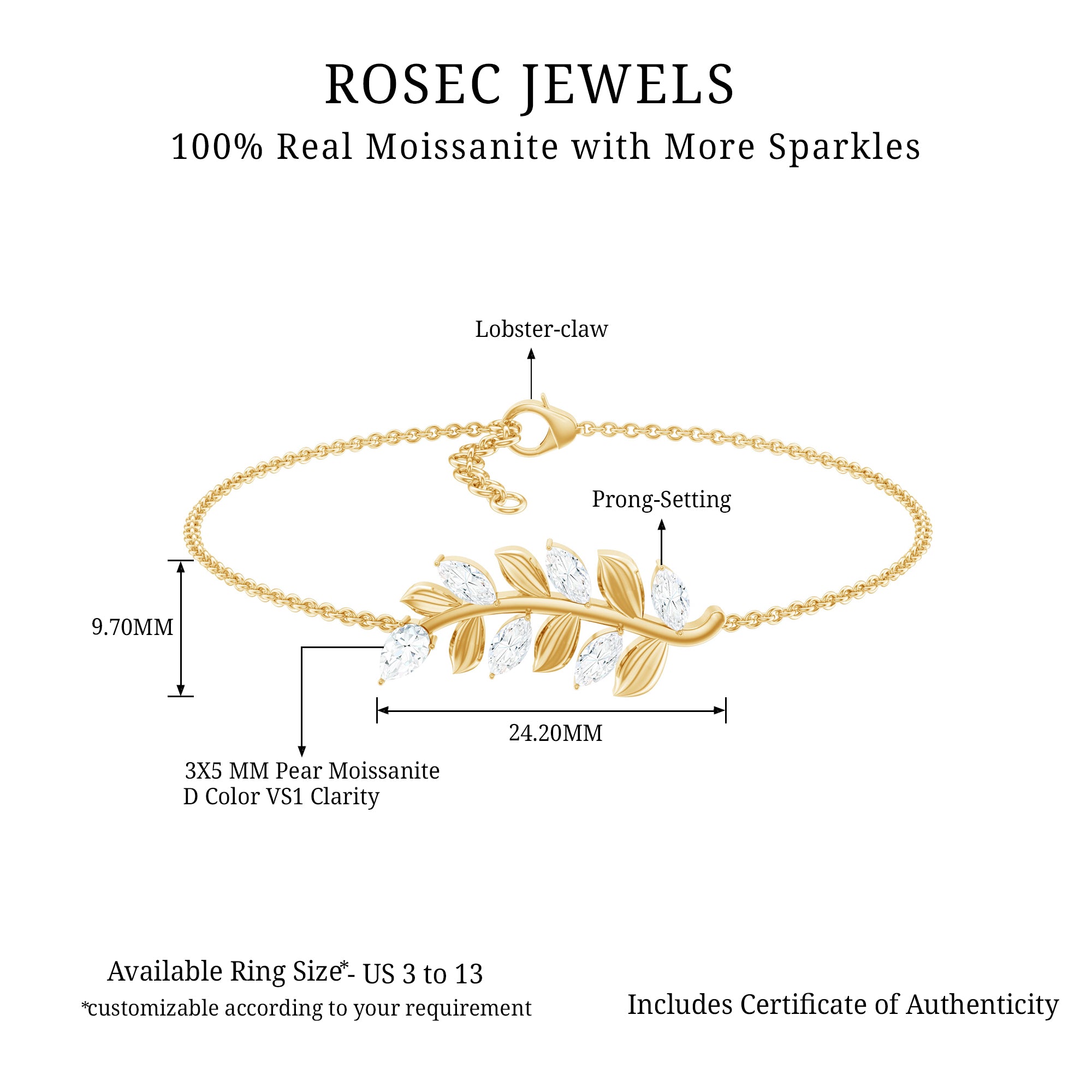 Les bracelets Moissanite sont parfaits à porter lors d'occasions spéciales, car qui n'aime pas éblouir ou peut être une parfaite expression d'affection pour votre amoureuse. Les options que vous obtenez avec Rosec Jewels sont nombreuses car nous avons créé différents styles de bracelets comme le tennis, la chaîne de station, le bolo avec différents motifs comme l'infini, l'inspiration de la nature, le motif de cœur et de fleur.