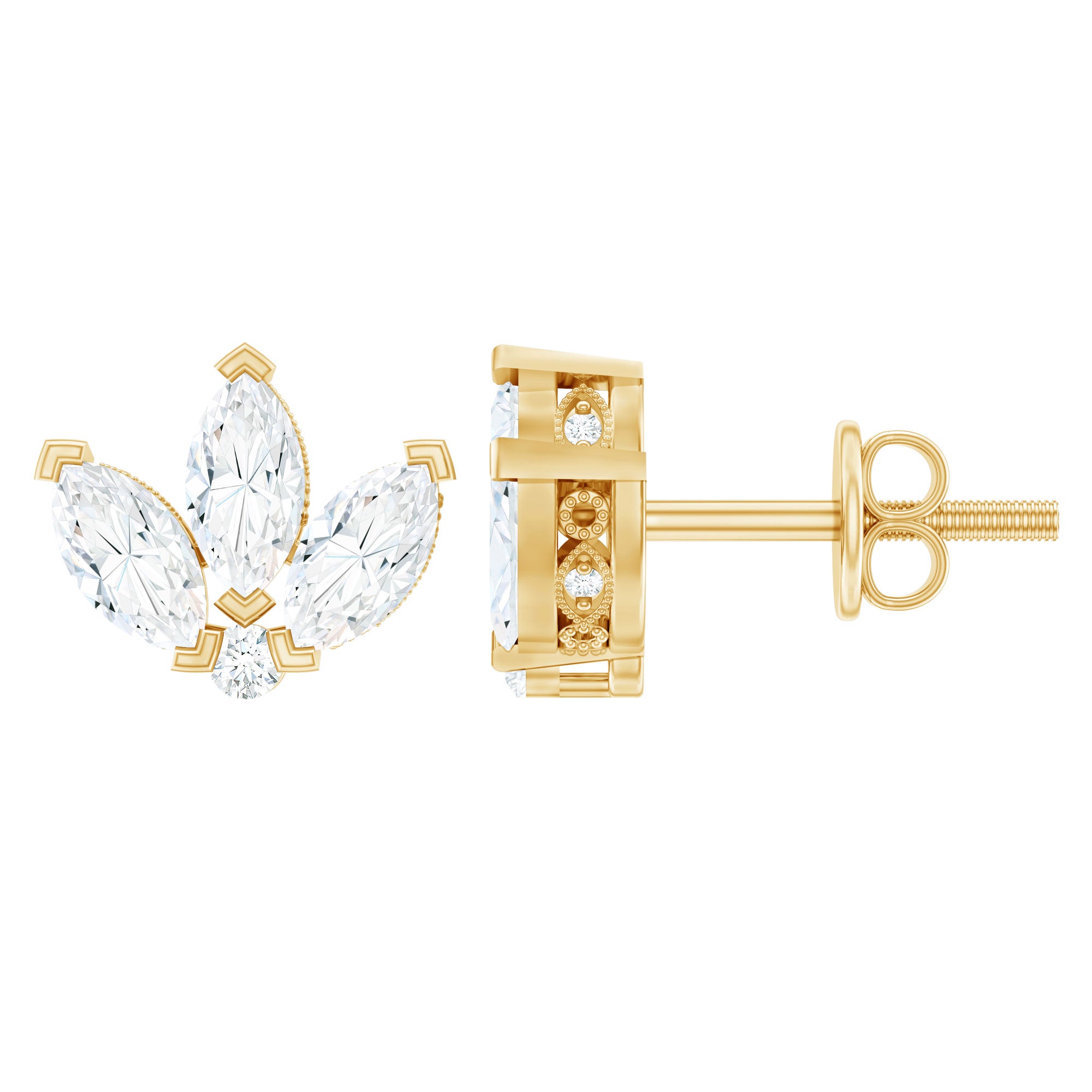 Un incontournable du quotidien, les boucles d'oreilles à tige en moissanite se portent directement à travers le lobe de l'oreille tout en étant généralement fixées par un fermoir à vis, un loquet ou une tige papillon. Pour compléter l'attrait classique de ce style avec une touche intemporelle, ils sont ornés d'une pierre centrale étincelante de moissanite. Que vous optiez pour la boucle d'oreille classique en moissanite de 1 ct ou que vous en choisissiez une de 2 ct pour plus de bling, chaque paire ici constitue une déclaration minimaliste et sans effort. De plus, il plaît à de nombreuses esthétiques grâce aux nombreuses formes dans lesquelles il est fabriqué à la main. Alors que celles façonnées en coupe ronde sont un classique intemporel, les boucles d'oreilles Asscher, Cushion ou Emerald Cut Moissanite se distinguent par leur charme d'antan. Tandis que si vous avez envie d'une touche contemporaine, optez pour celles aux coupes plus raffinées comme Marquise, Poire ou Princesse.