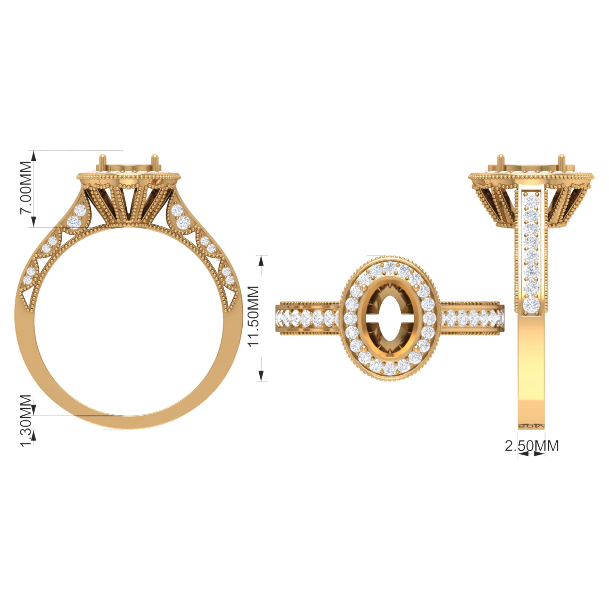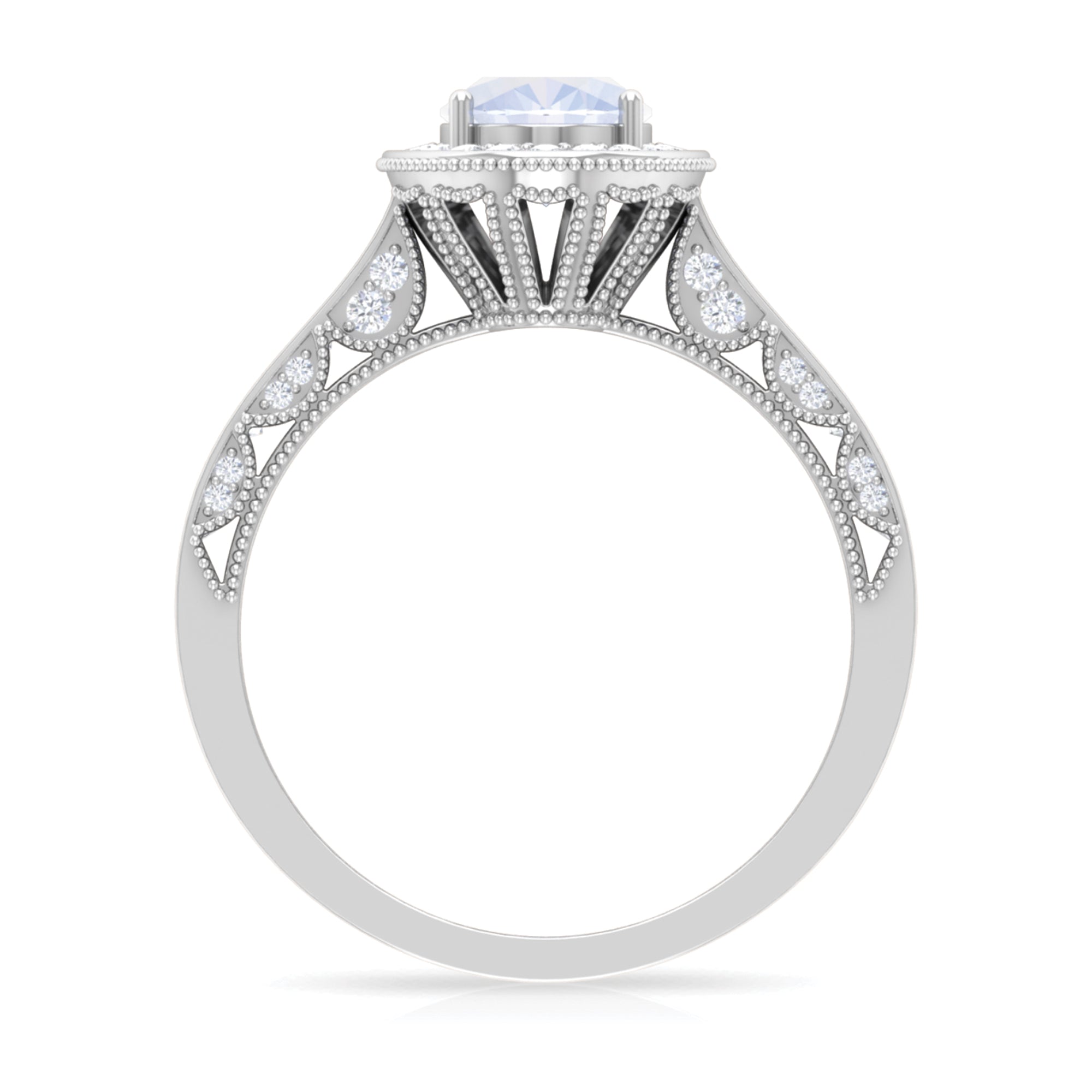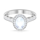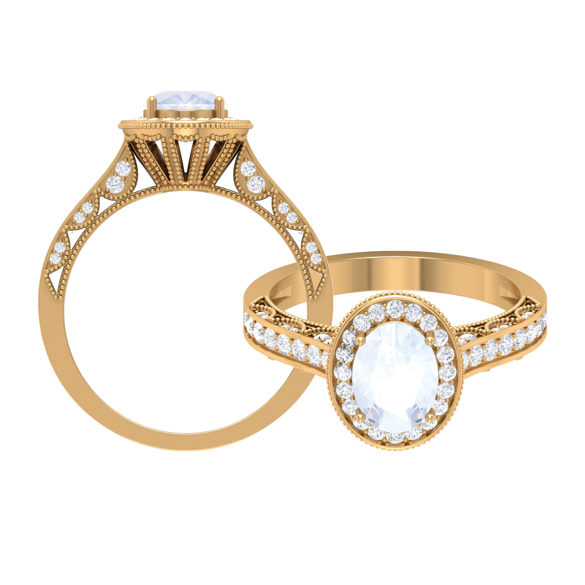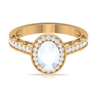 Brillez votre tenue avec cette bague pierre de lune. Il comporte une pierre de lune de taille ovale entourée d'un diamant de forme ronde avec des détails milgrain et fabriqué en or massif. Proposez-lui cette éblouissante bague de fiançailles en pierre de lune.