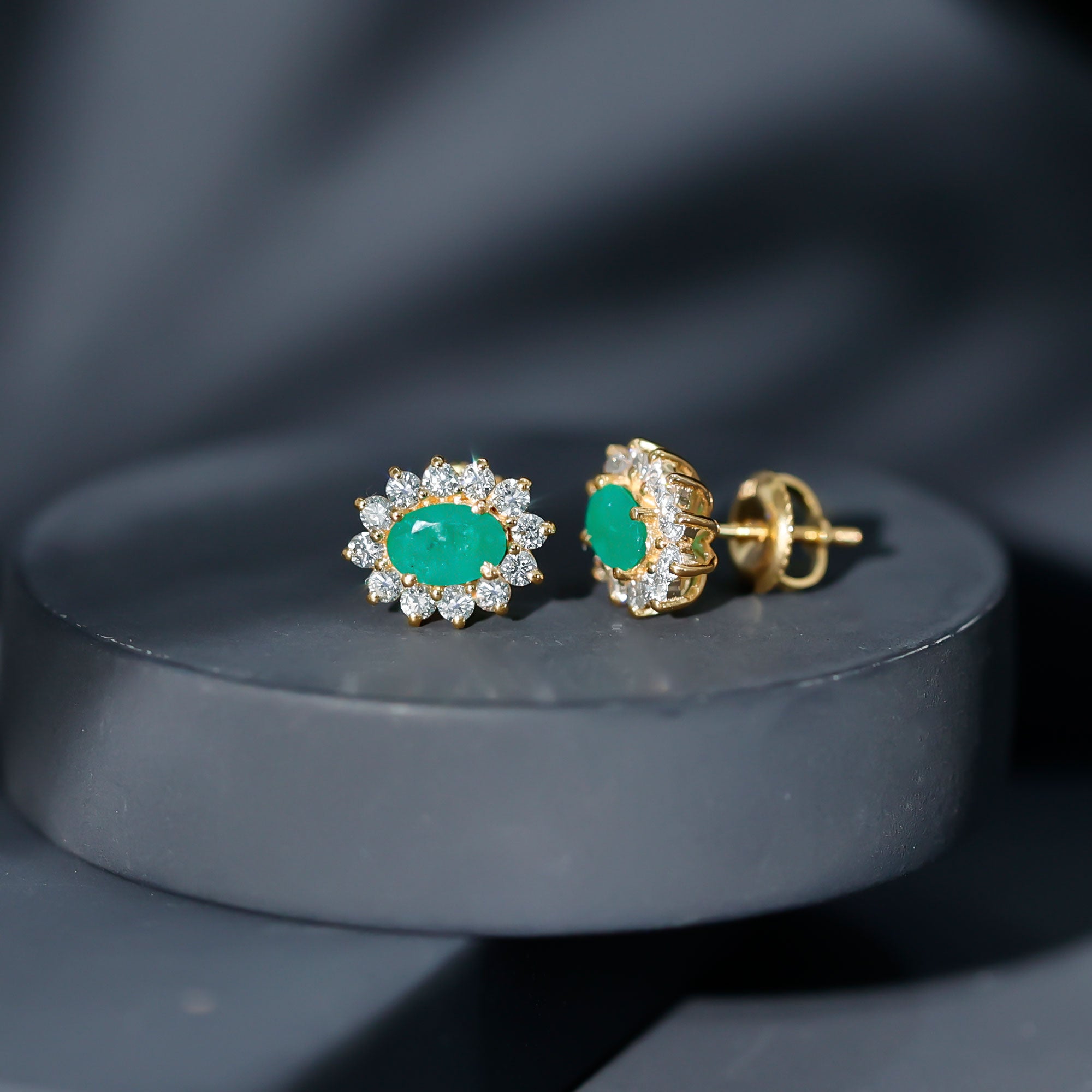 Ces boucles d'oreilles à tige de style halo classique ornées d'une pierre précieuse émeraude de taille ovale sont serties comme un solitaire dans un serti à griffes entouré de petites pierres de diamant de forme ronde, fabriquées dans un métal en or massif.
