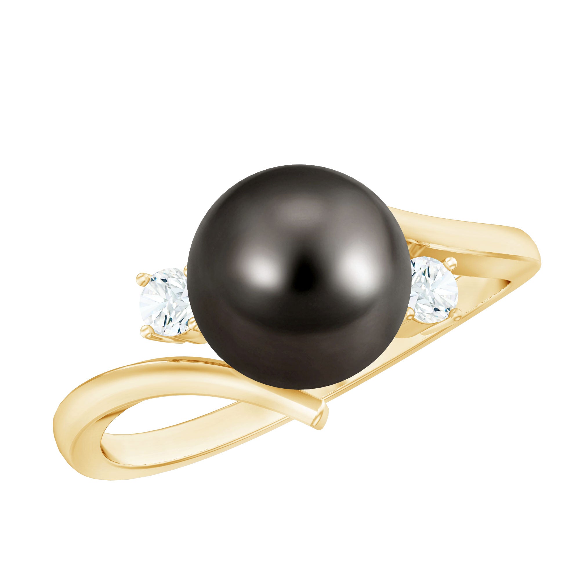 Cette bague solitaire en perles est ornée d'une perle de Tahiti de forme ronde sertie au centre tandis qu'un solitaire avec deux diamants de forme ronde sont sertis à griffes. Cette bague à tige de contournement est ornée d’or massif.
