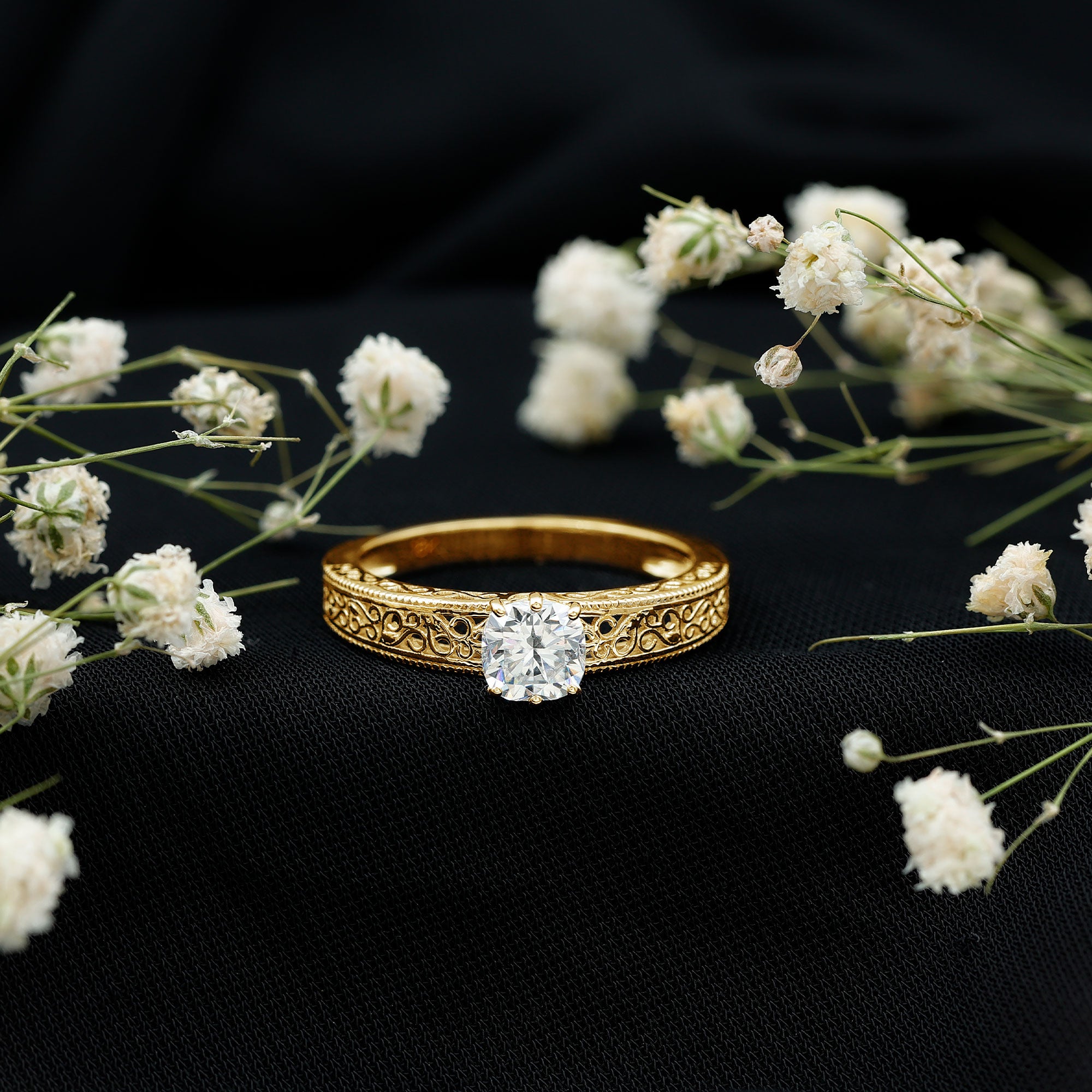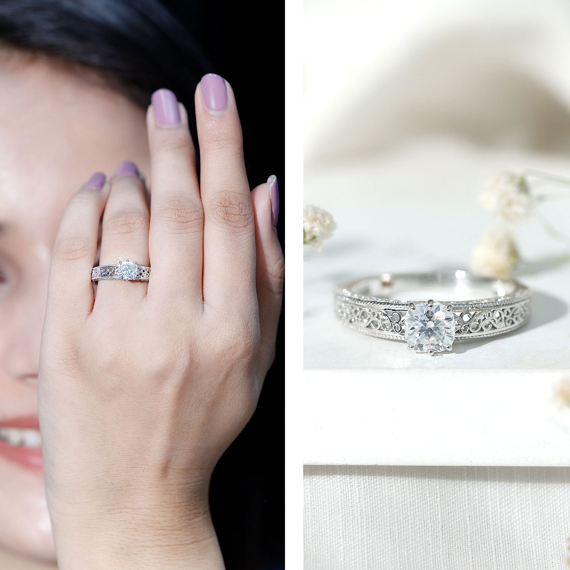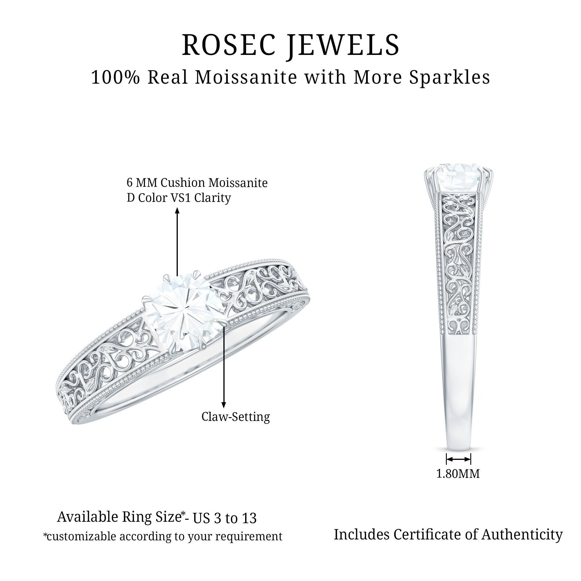Célébrez votre amour et votre engagement avec cette bague en filigrane de moissanite. La bague présente une moissanite taille coussin de 5 mm sertie dans une monture à six griffes, avec de délicats détails en filigrane de chaque côté. Cette élégante bague de promesse est un cadeau parfait pour votre moitié. Il a un poids total de 1,25 carats, avec une couleur D et une pureté VS1, garantissant des pierres précieuses de haute qualité. Toutes les pierres sont certifiées et soumises à un contrôle qualité strict.
