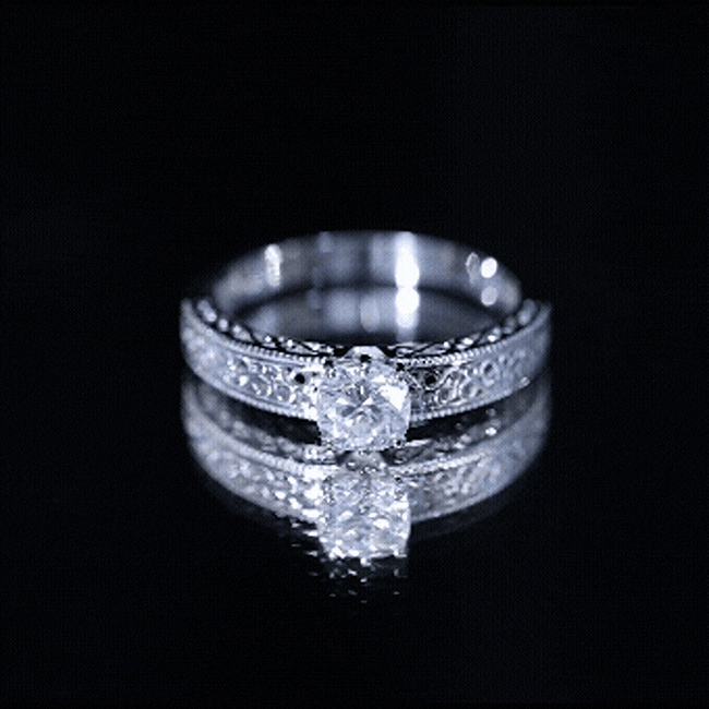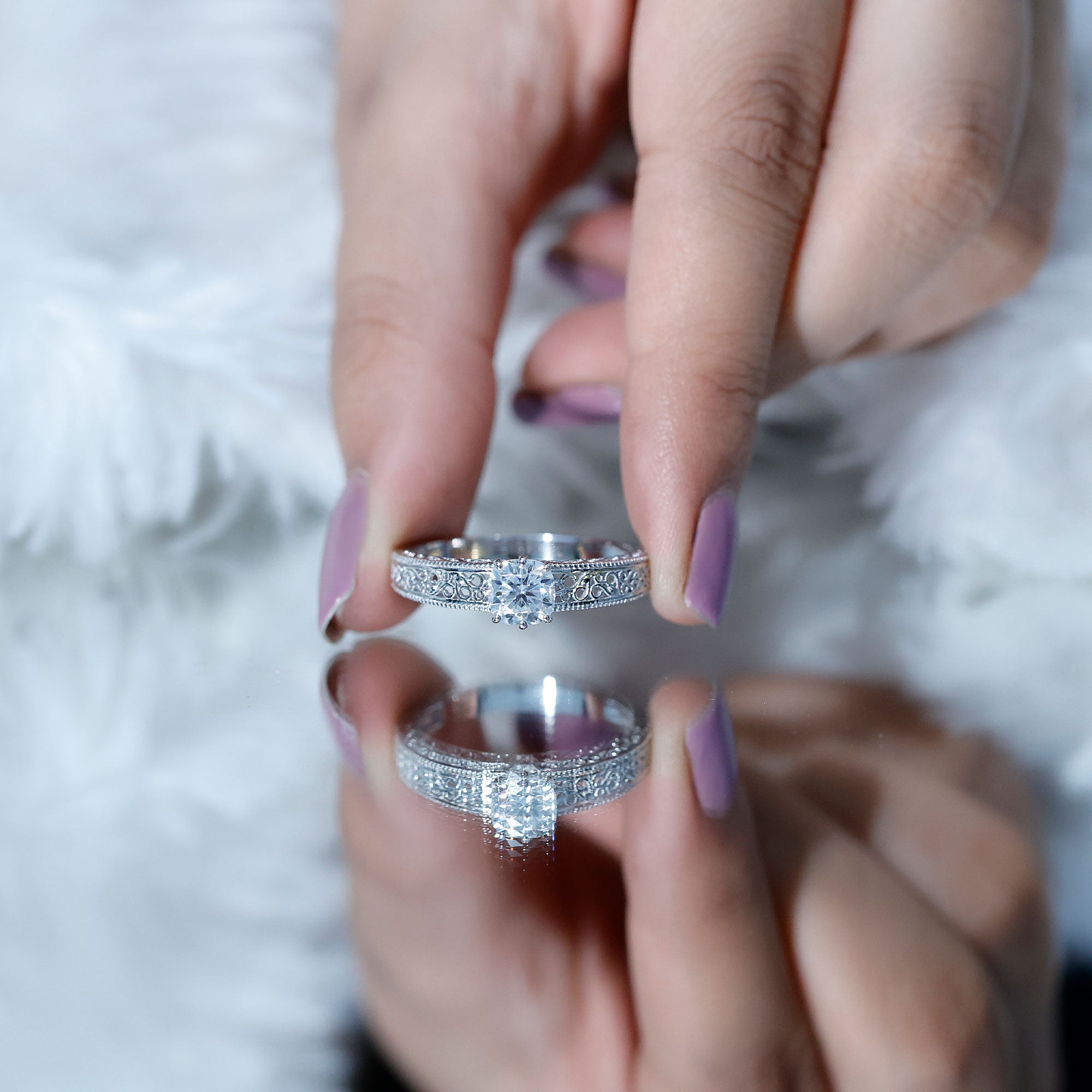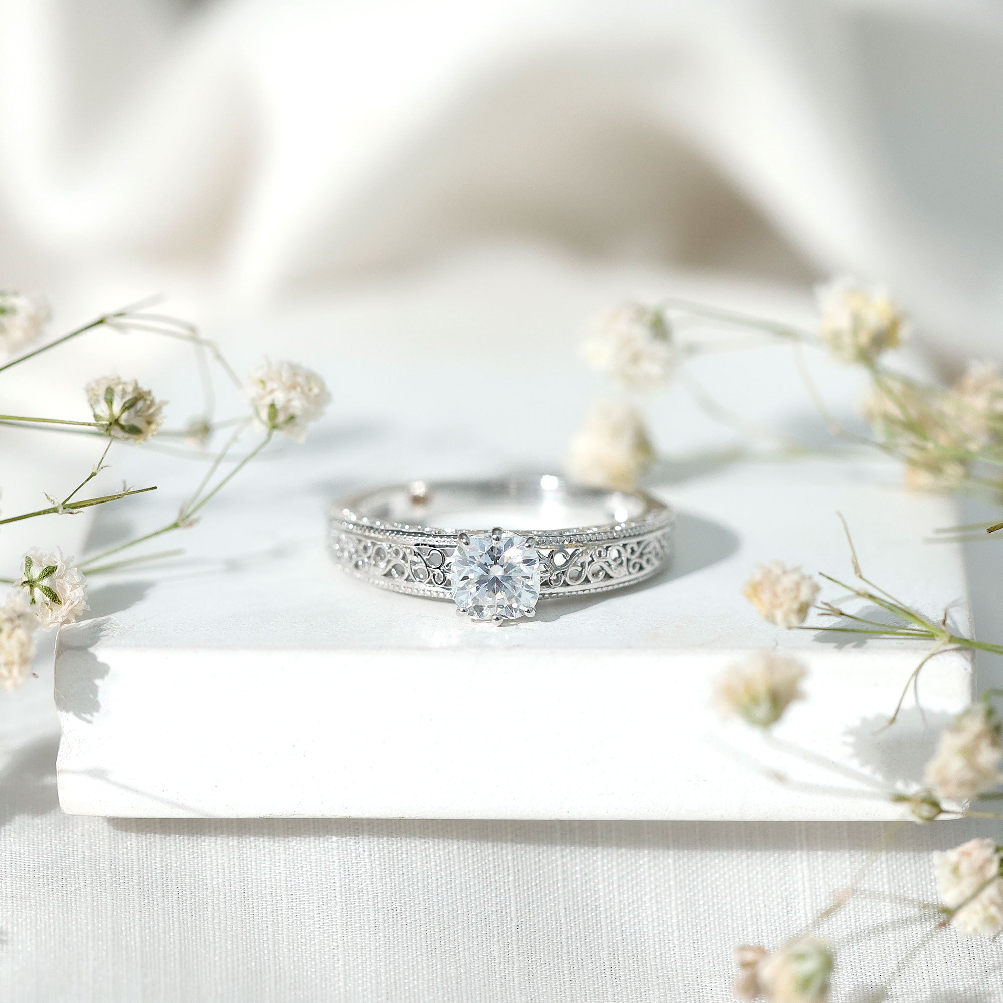 Célébrez votre amour et votre engagement avec cette bague en filigrane de moissanite. La bague présente une moissanite taille coussin de 5 mm sertie dans une monture à six griffes, avec de délicats détails en filigrane de chaque côté. Cette élégante bague de promesse est un cadeau parfait pour votre moitié. Il a un poids total de 1,25 carats, avec une couleur D et une pureté VS1, garantissant des pierres précieuses de haute qualité. Toutes les pierres sont certifiées et soumises à un contrôle qualité strict.