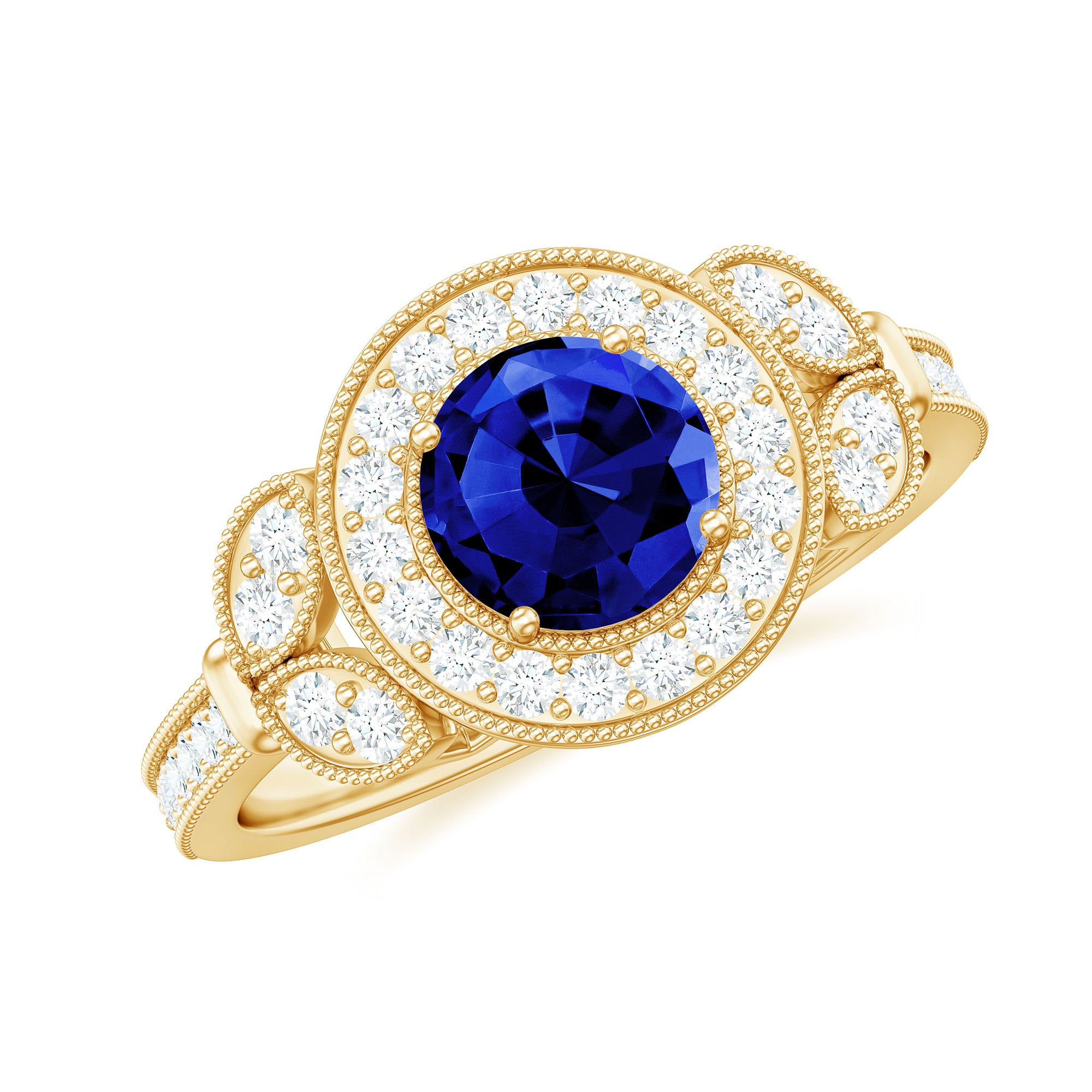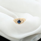 Le feu et l'éclat de la bague de fiançailles en saphir bleu créé brilleront à jamais dans tous les sens. Notre bague de fiançailles vintage vous donne une sensation extraordinaire lors de votre grand jour. Cette bague de fiançailles vintage en saphir bleu créé est ornée d'un saphir bleu créé de forme ronde serti sur griffes avec des accents de diamants et des détails en perles d'or.