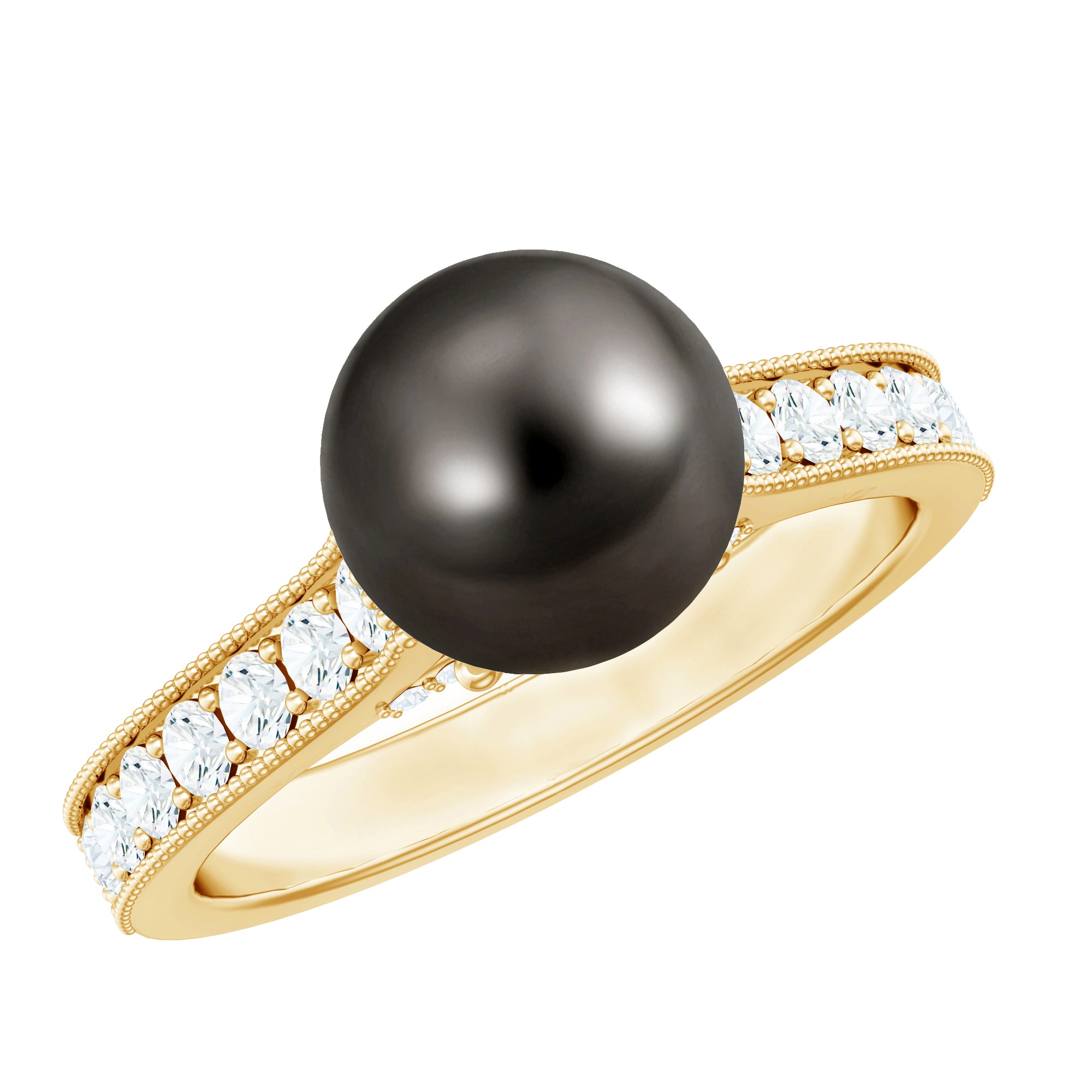Embrassez l'élégance avec notre bague solitaire magnifiquement conçue, dotée d'une perle de Tahiti de forme ronde dans un sertissage de perles proéminent. La fascinante bague en perles de Tahiti est accentuée par des diamants ronds et des détails milgrain complexes, créant une pièce exotique et unique qui rendra sans aucun doute la journée de toute femme vraiment extraordinaire.