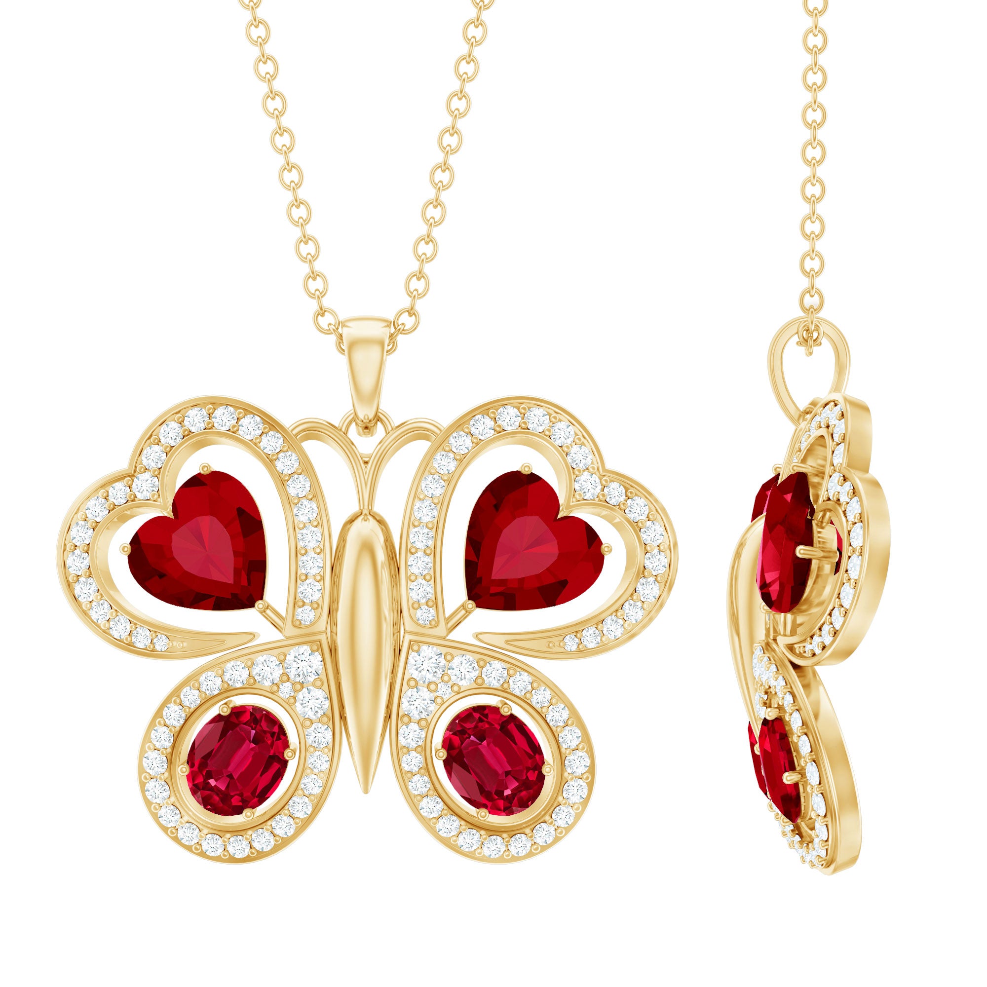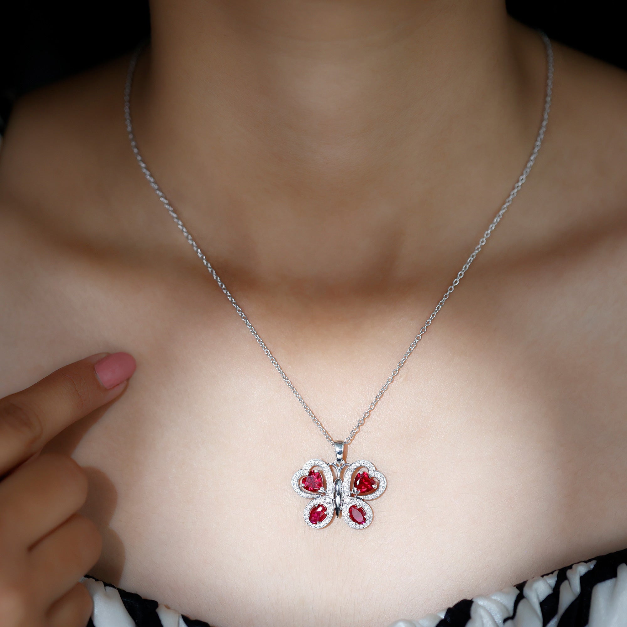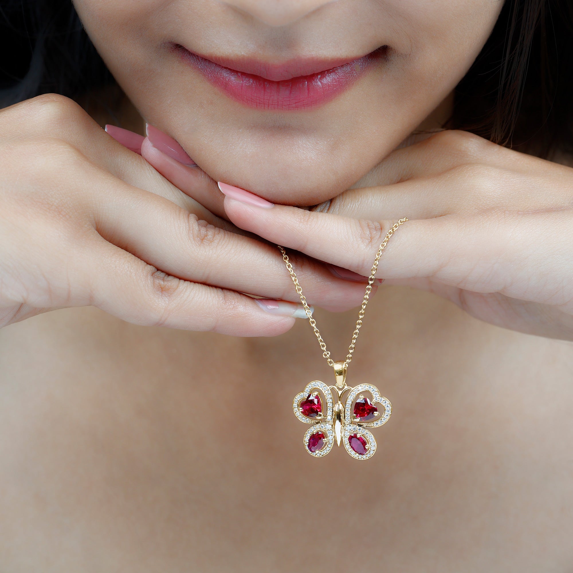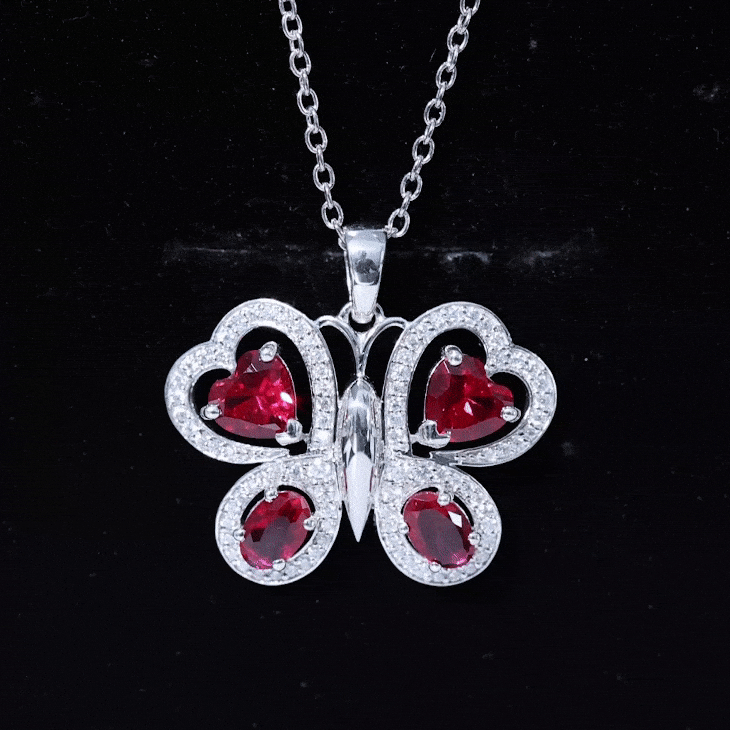 Parez-vous de la beauté époustouflante de notre collier à pendentif papillon. Cette pièce exquise présente un rubis créé ovale et en forme de cœur serti sur les ailes d'un papillon, avec des accents ronds de moissanite rehaussant son éclat. Ce pendentif animal en pierres précieuses est un complément parfait à votre collection de bijoux de tous les jours et constitue un cadeau mémorable pour la Saint-Valentin.