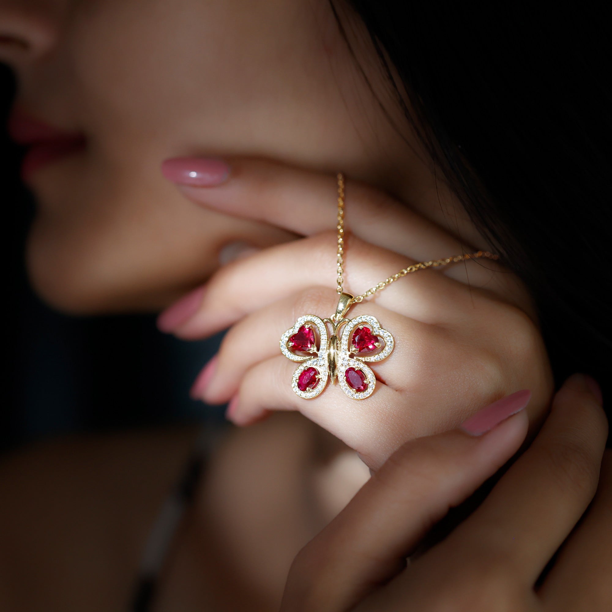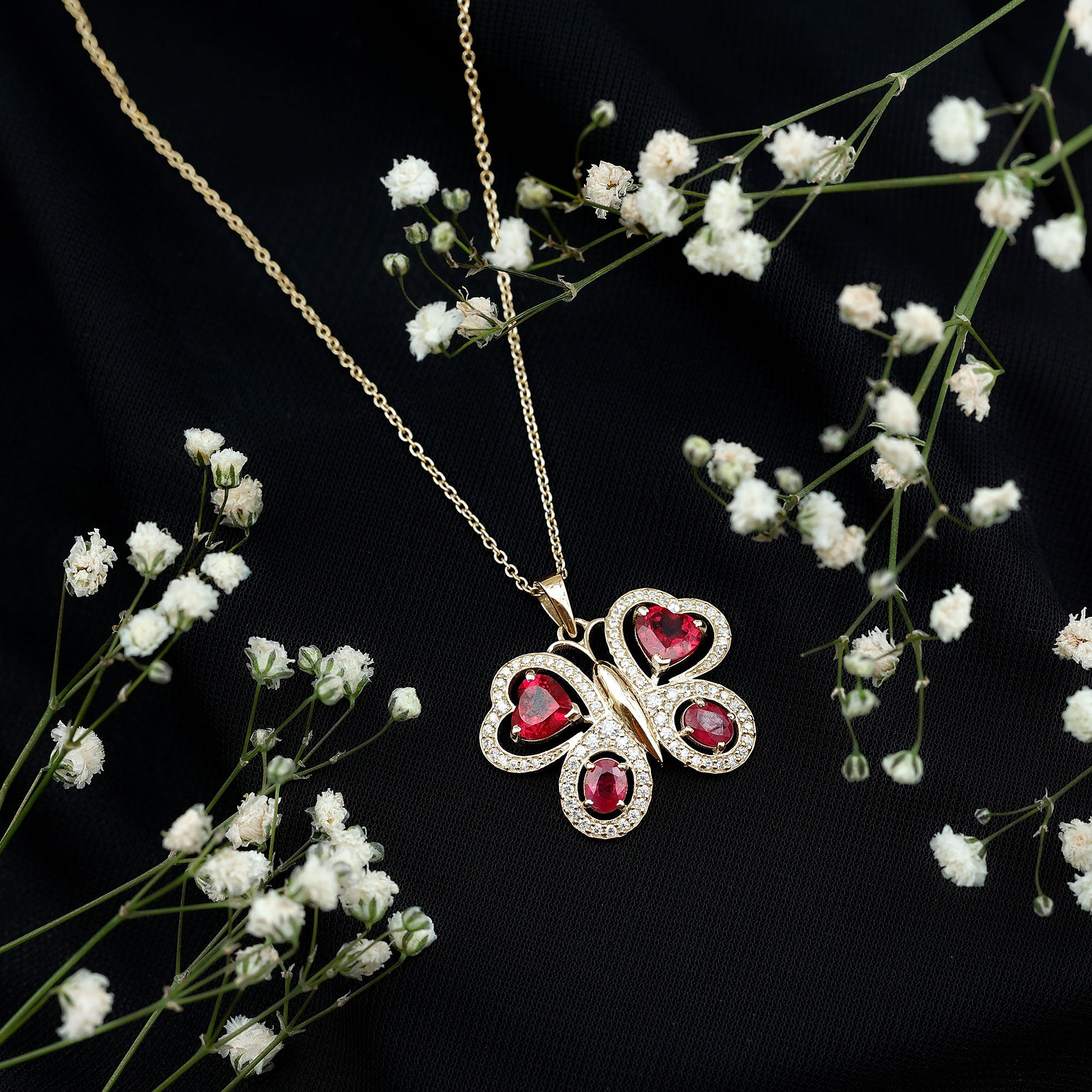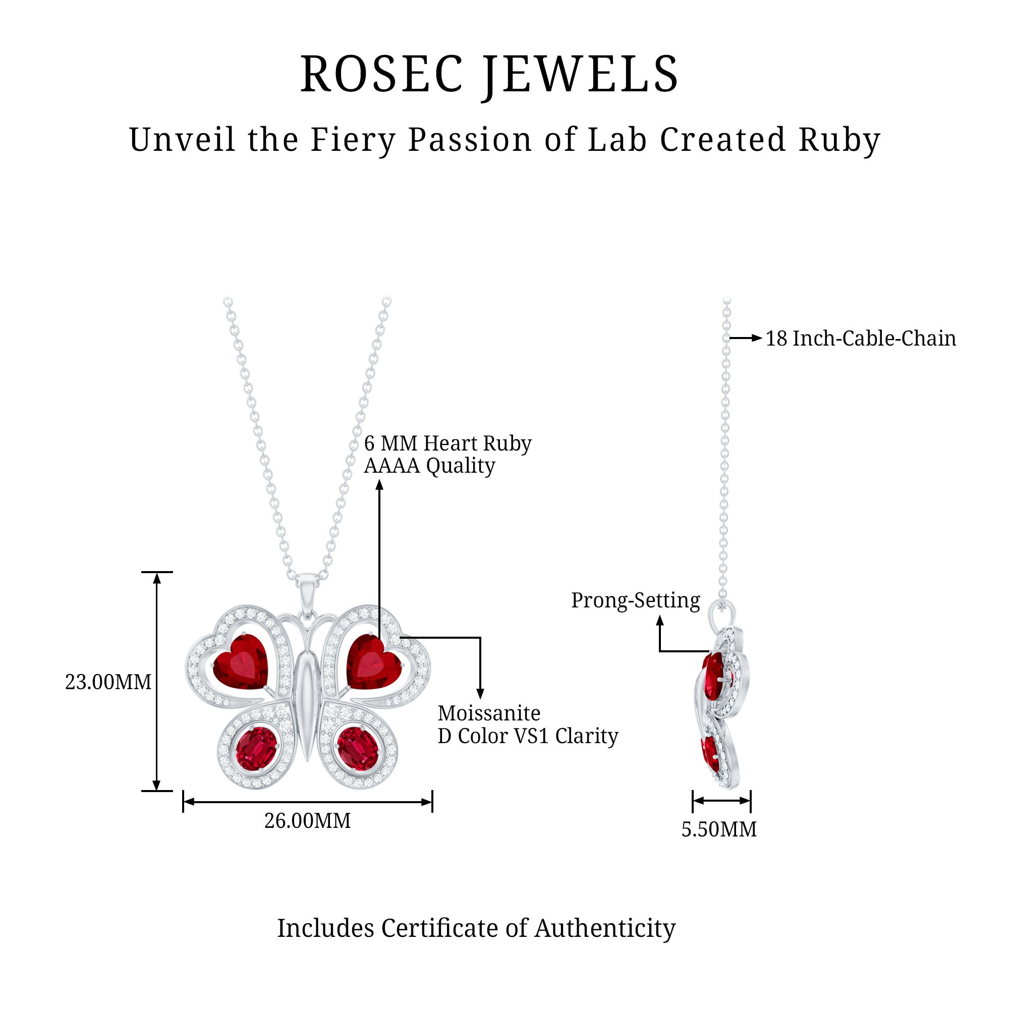 Parez-vous de la beauté époustouflante de notre collier à pendentif papillon. Cette pièce exquise présente un rubis créé ovale et en forme de cœur serti sur les ailes d'un papillon, avec des accents ronds de moissanite rehaussant son éclat. Ce pendentif animal en pierres précieuses est un complément parfait à votre collection de bijoux de tous les jours et constitue un cadeau mémorable pour la Saint-Valentin.