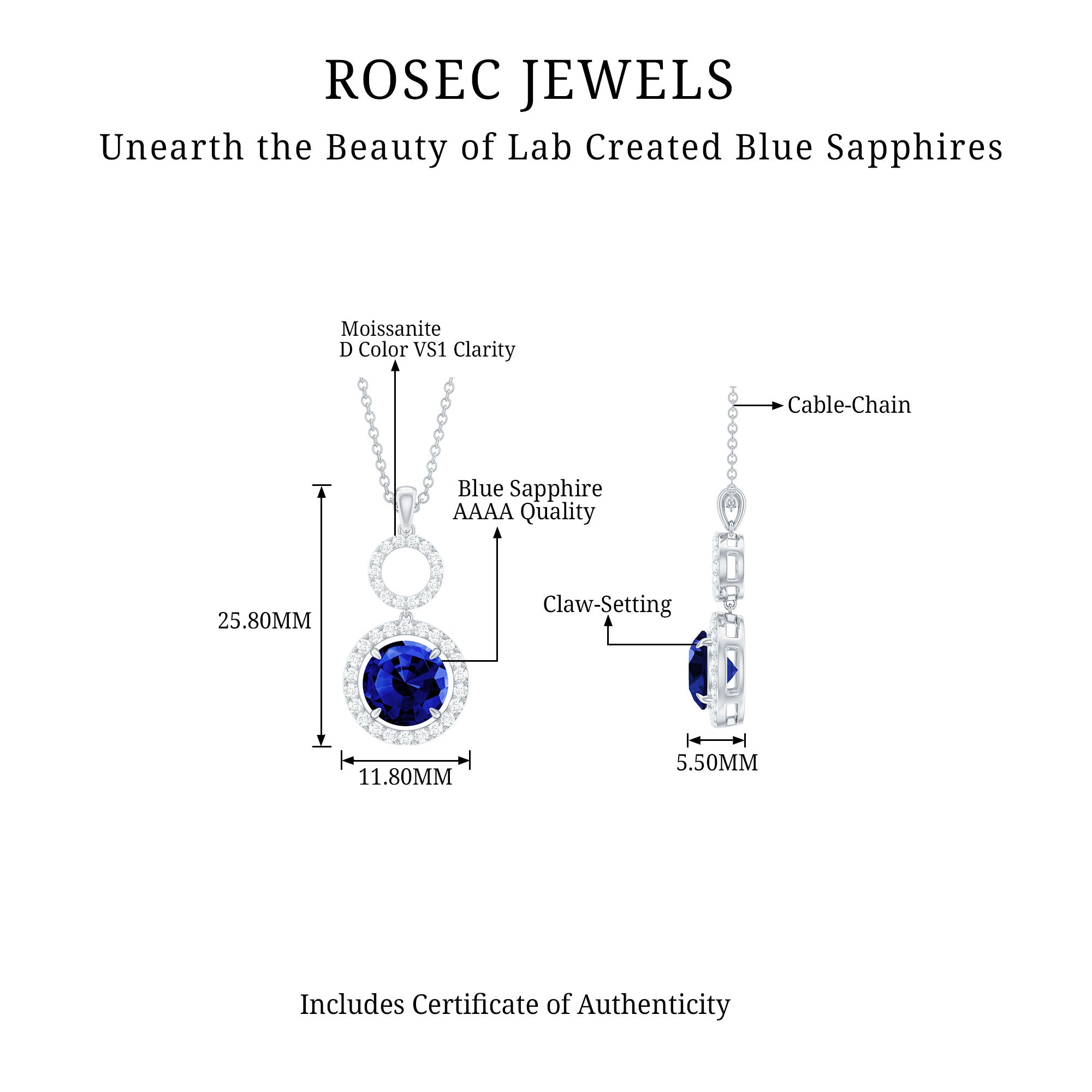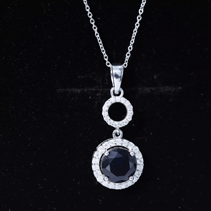 Embrassez la beauté de notre superbe collier à pendentif doté d'un saphir bleu rond niché dans un halo de moissanite radieux. Le serti griffes lui confère un aspect moderne et distinctif. Pour ajouter à son attrait, un cadre circulaire parsemé de moissanite ronde est placé au sommet du saphir bleu créé. Le pendentif est élégamment relié à une balle de métal brillant, créant un aspect homogène et poli. Il est accompagné d'une chaîne simple mais robuste, ce qui le rend facile à enfiler et à porter facilement. Admirez l'élégance et la sophistication de ce magnifique collier qui ne manquera pas de faire tourner les têtes.