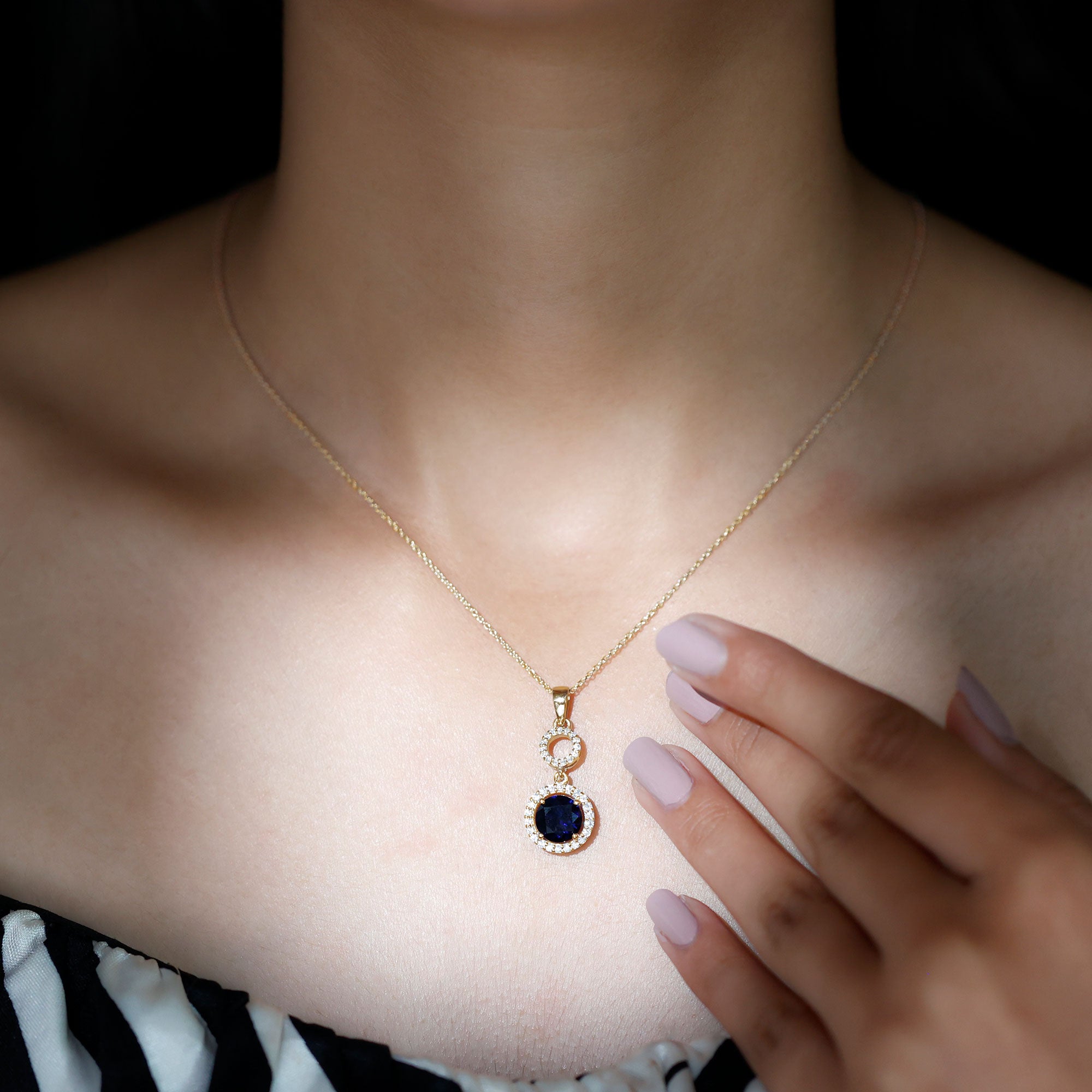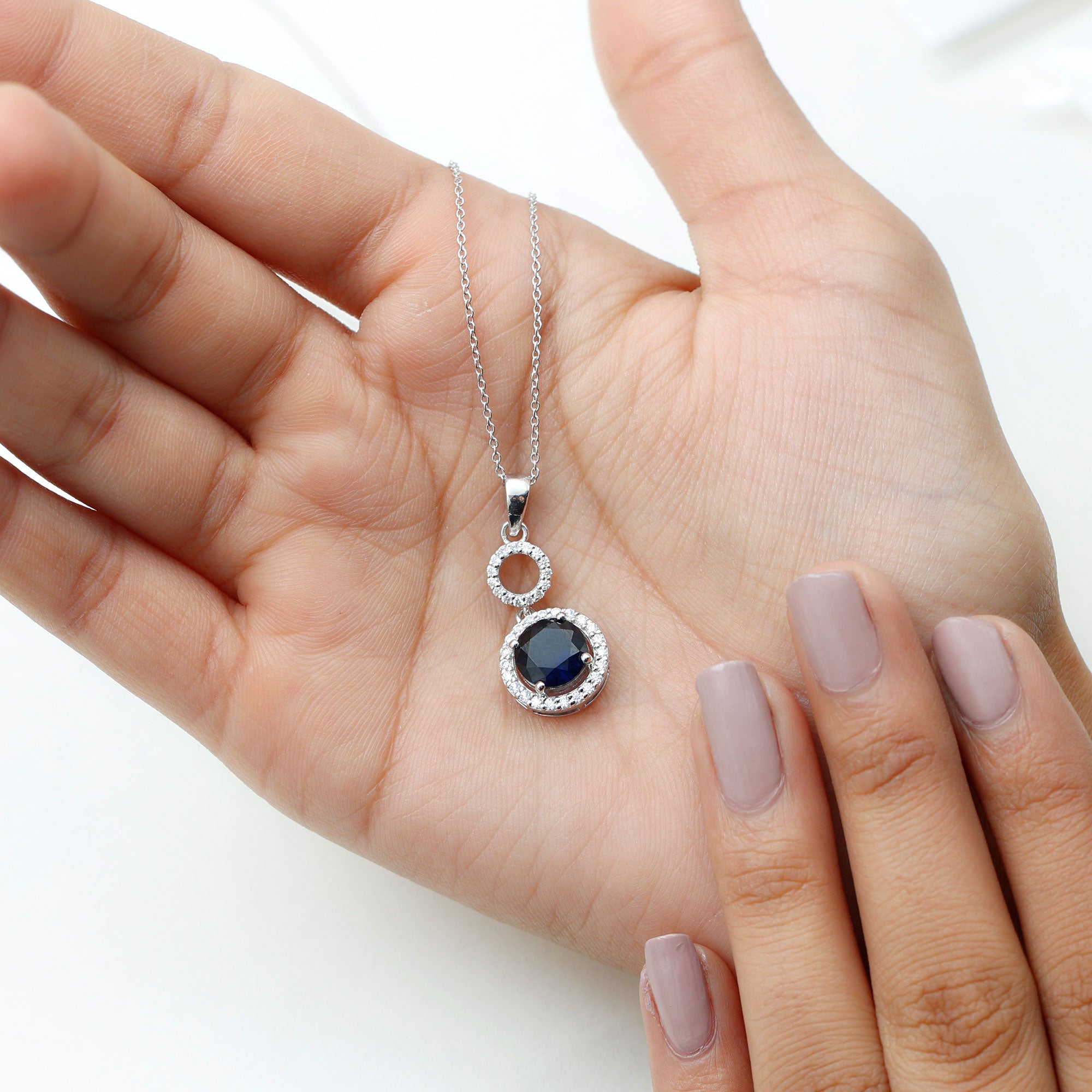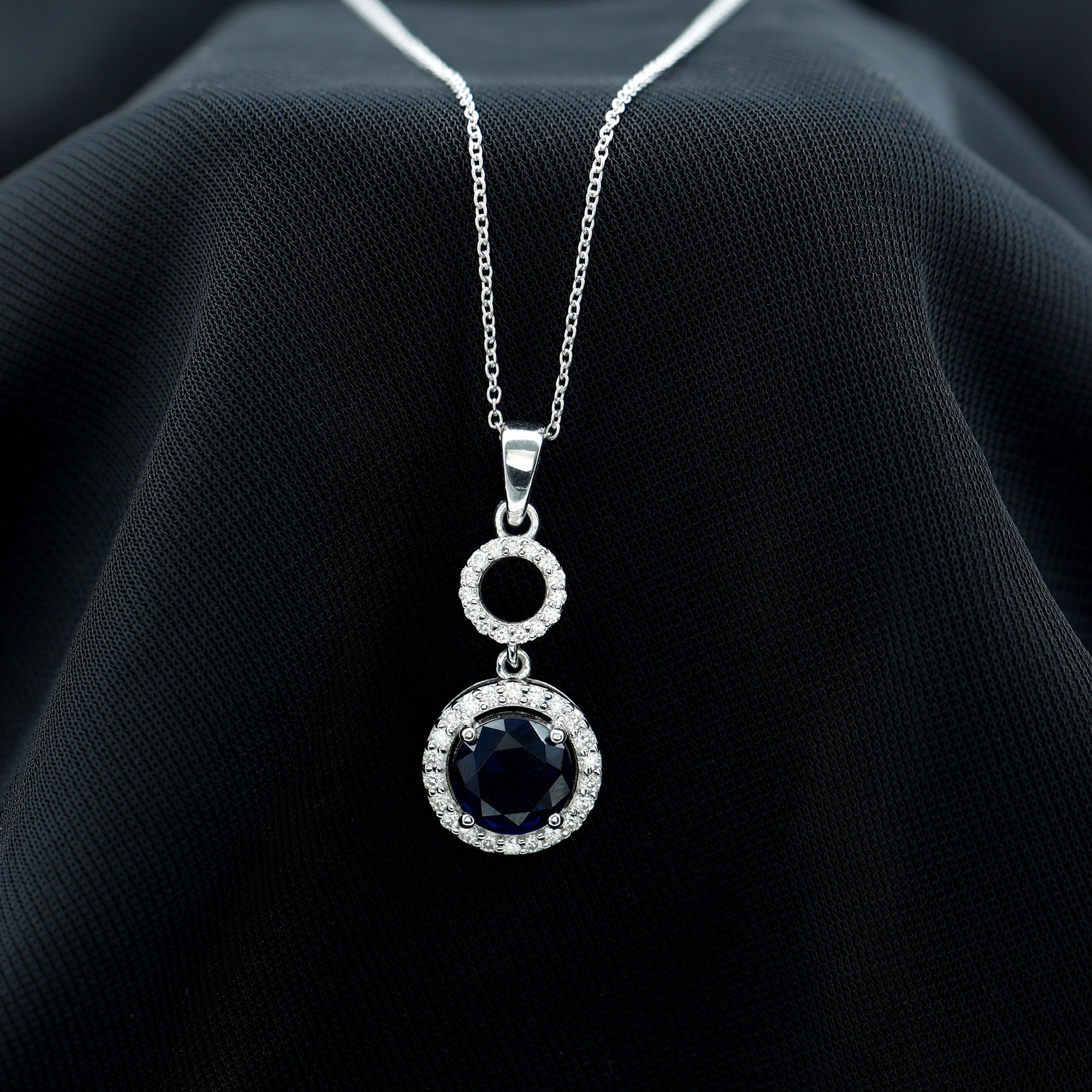 Pendentif halo de saphir bleu créé en laboratoire avec moissanite