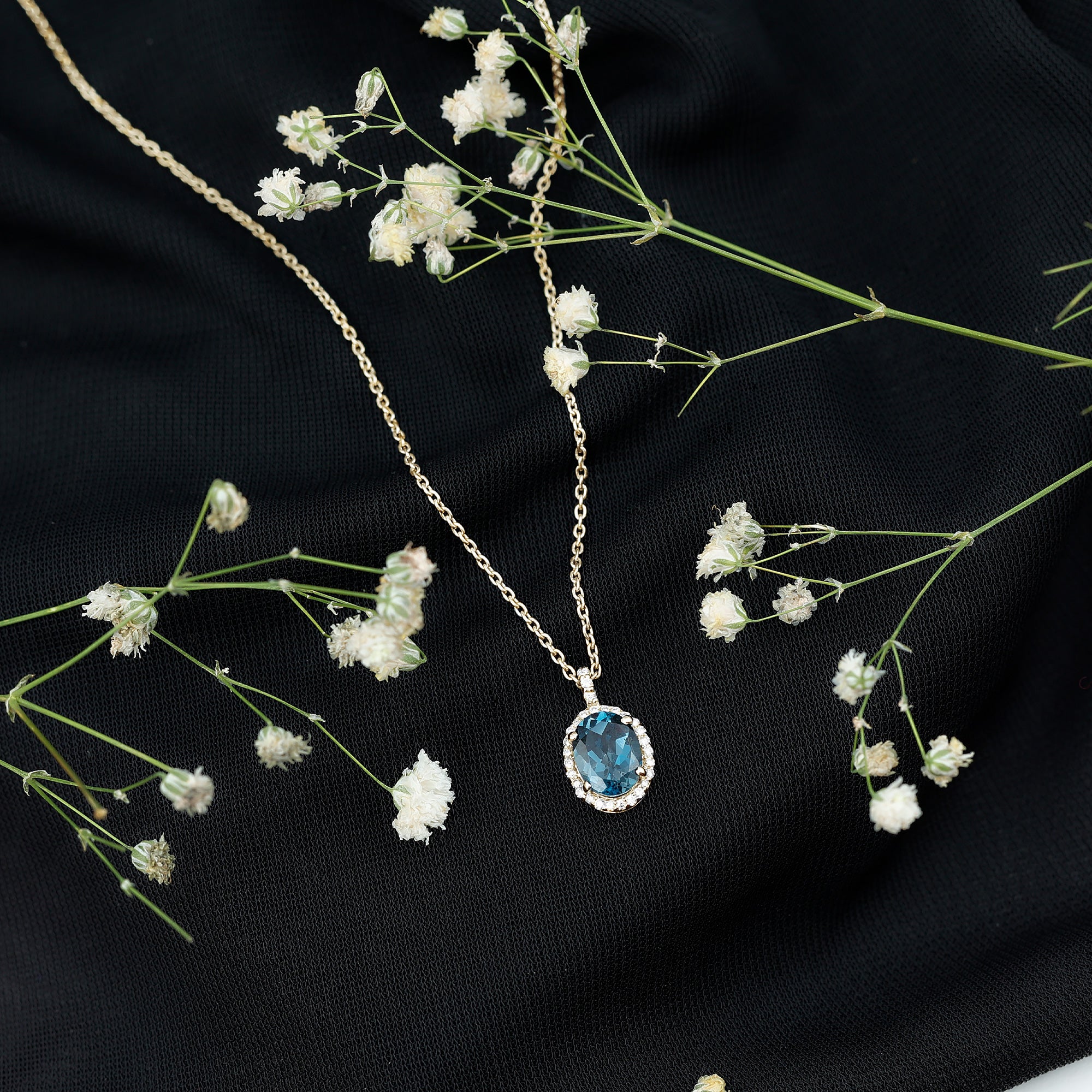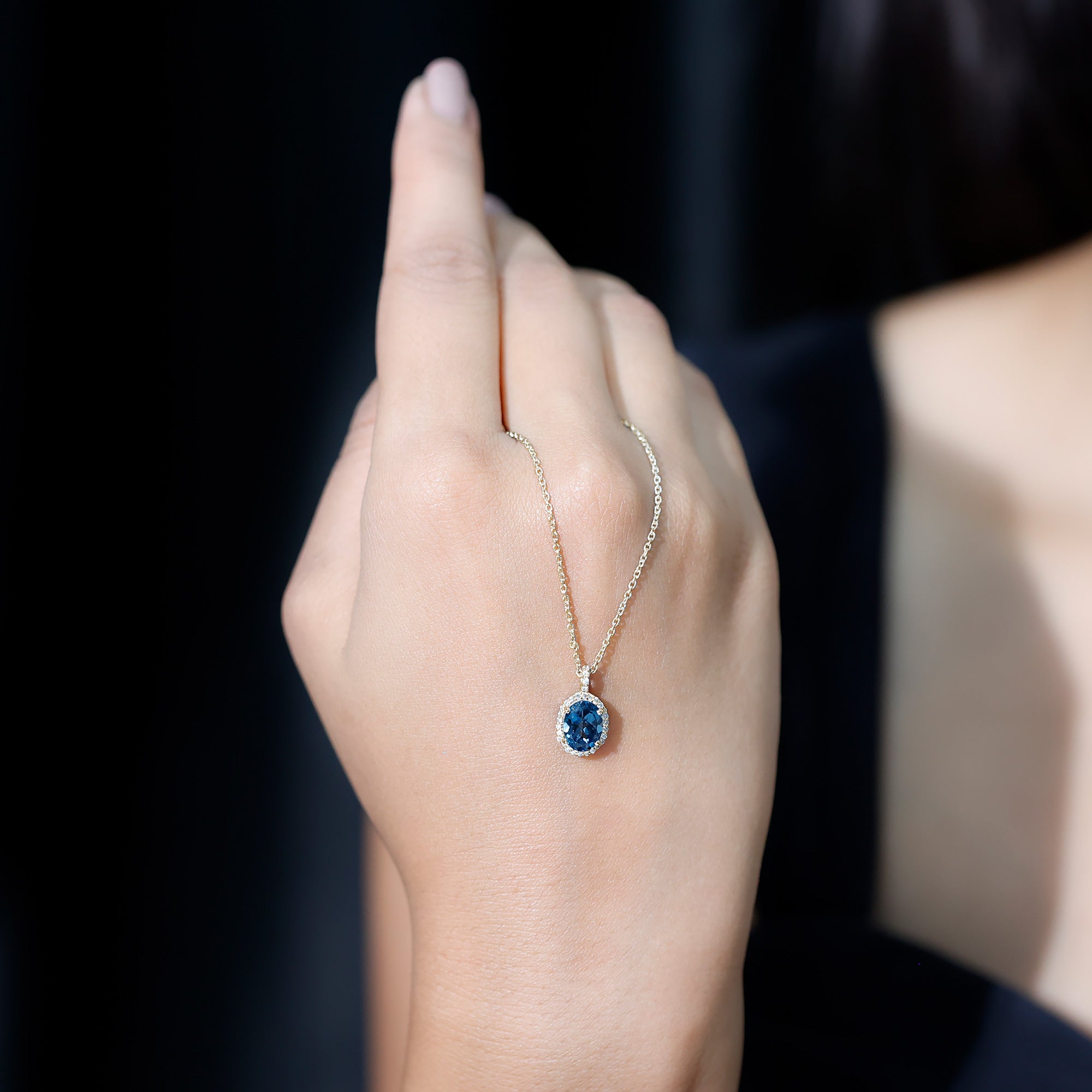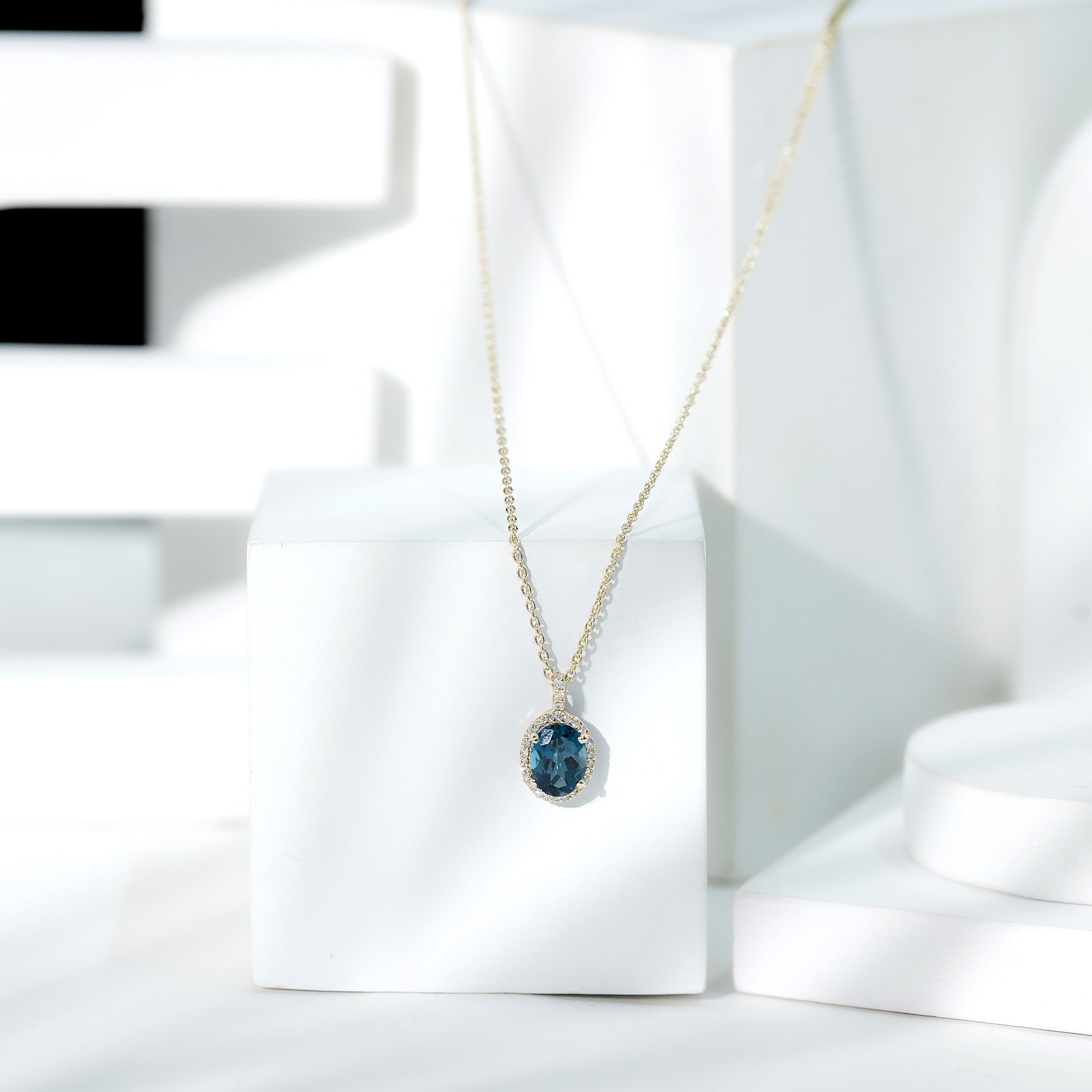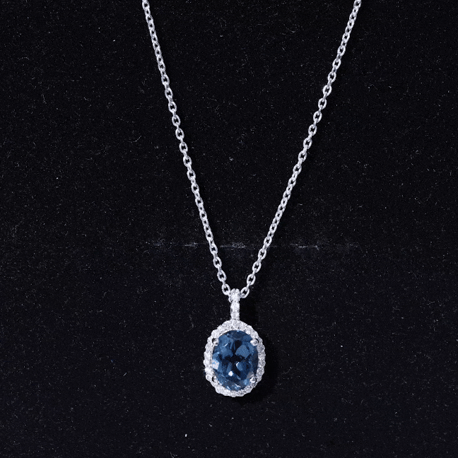 Pendentif ovale classique avec topaze bleue de Londres et halo de diamants