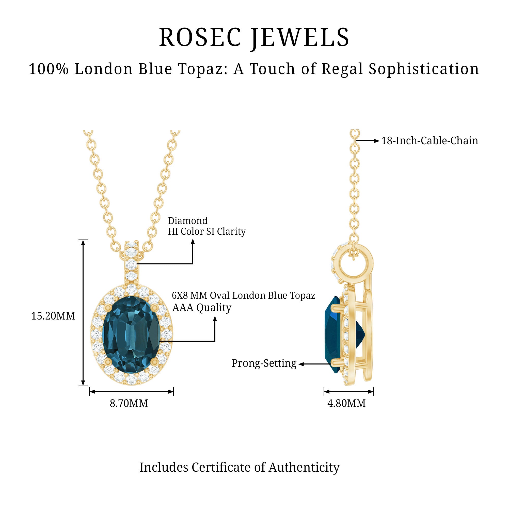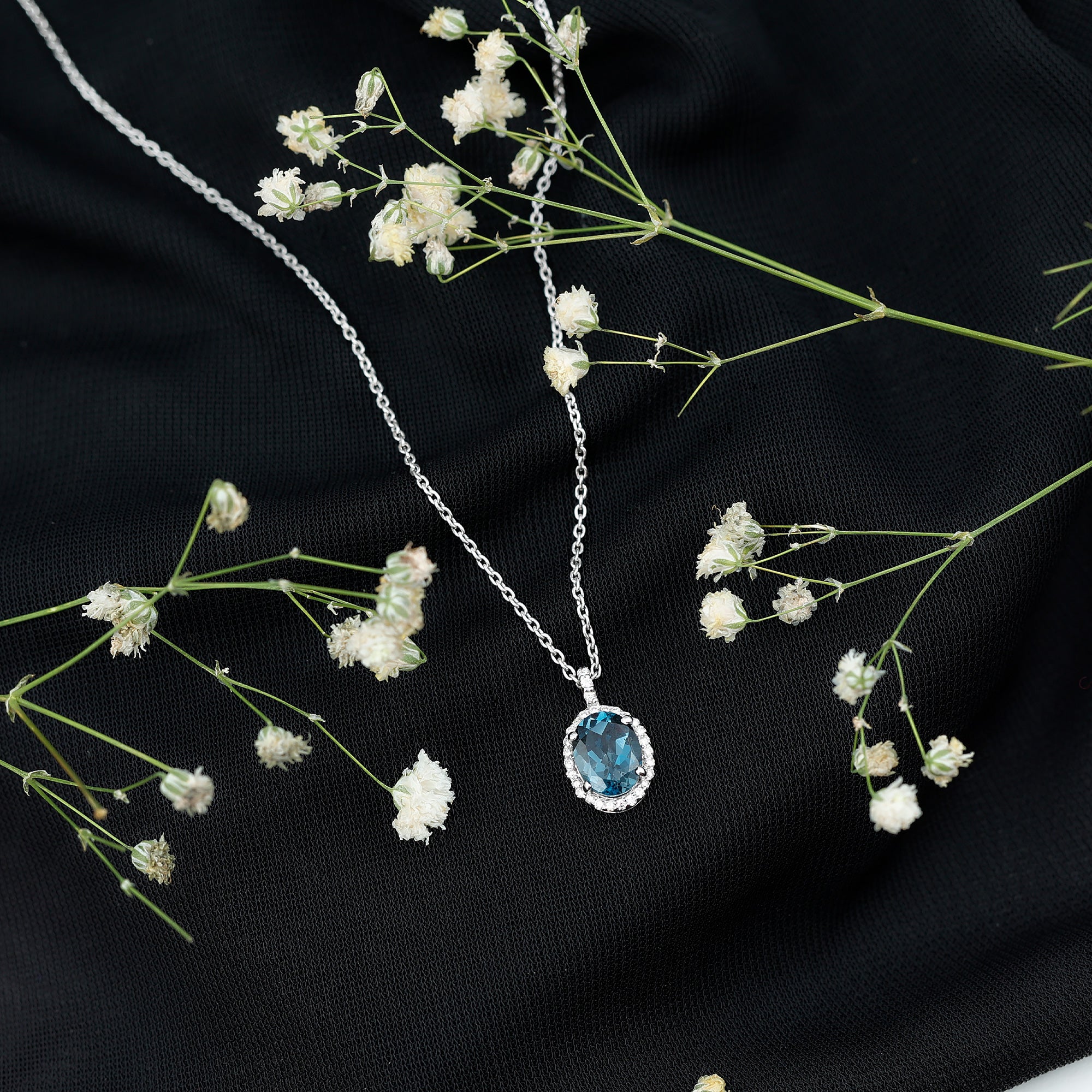 Complétez votre look de fête avec ce pendentif Halo incontournable. Il présente une topaze bleue de Londres de forme ovale sertie à griffes, entourée d'un halo de pierres de diamant de forme ronde. La combinaison de la topaze bleue vibrante et de l'éclat étincelant du diamant crée une pièce captivante et glamour. Ajoutez une touche d'élégance à n'importe quelle occasion avec ce pendentif exquis.