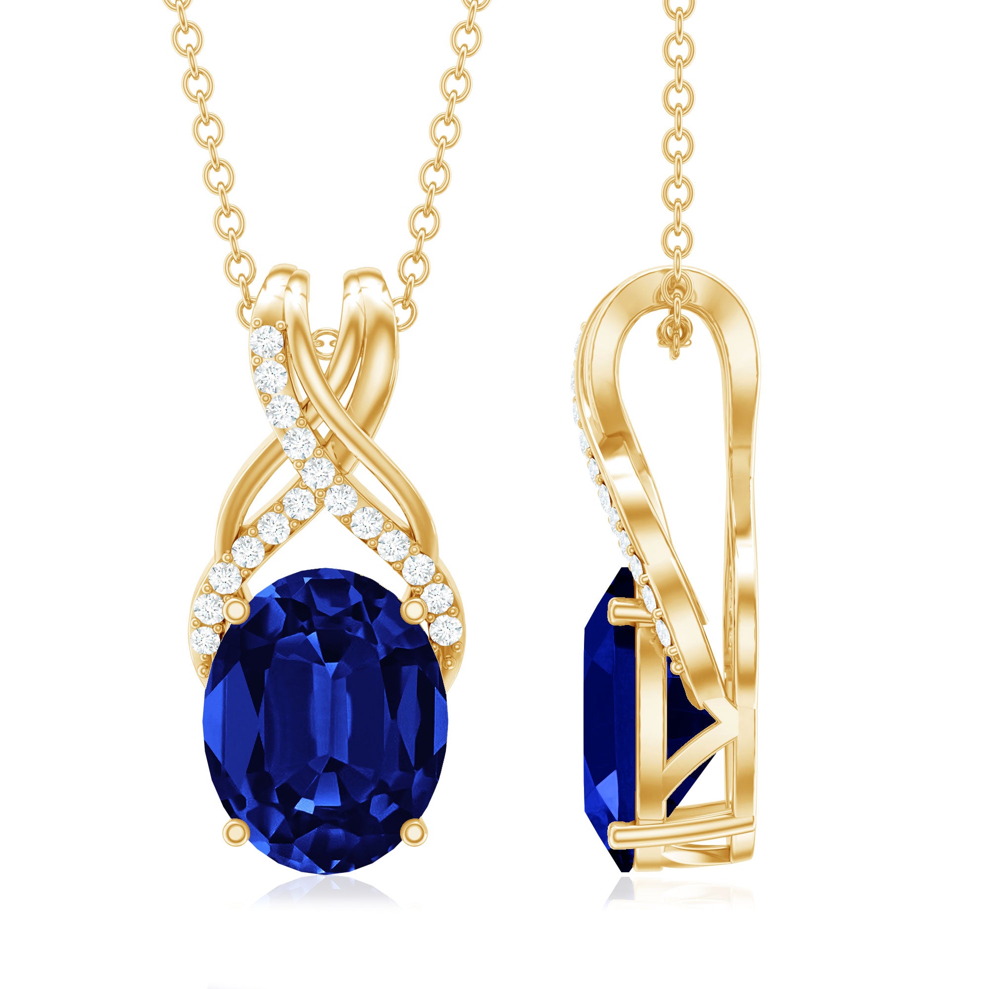 Pendentif solitaire ovale en saphir bleu créé avec bélière torsadée en diamant